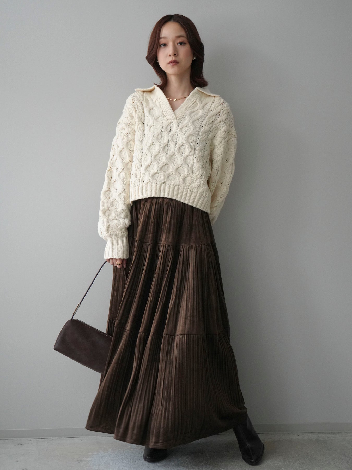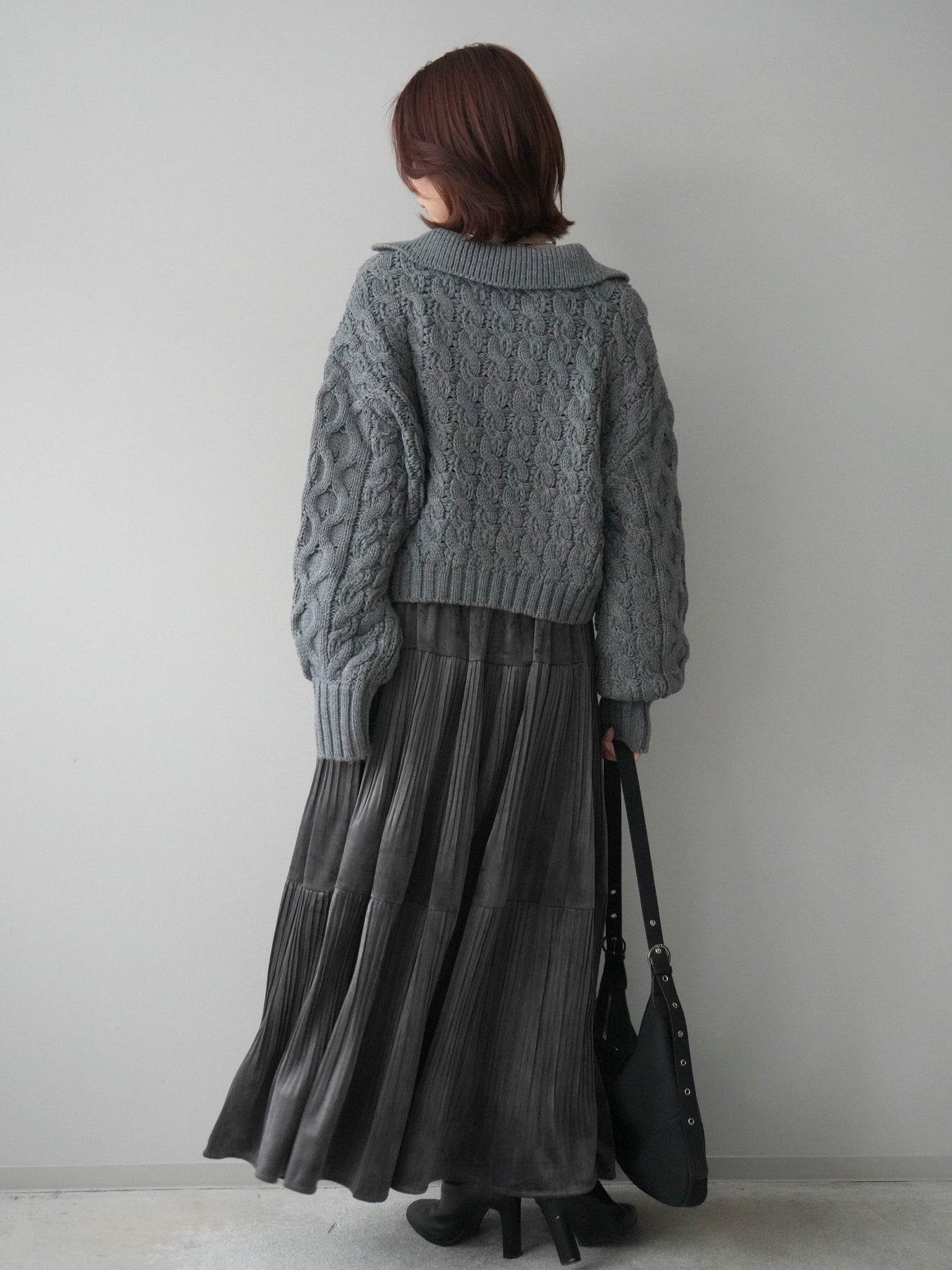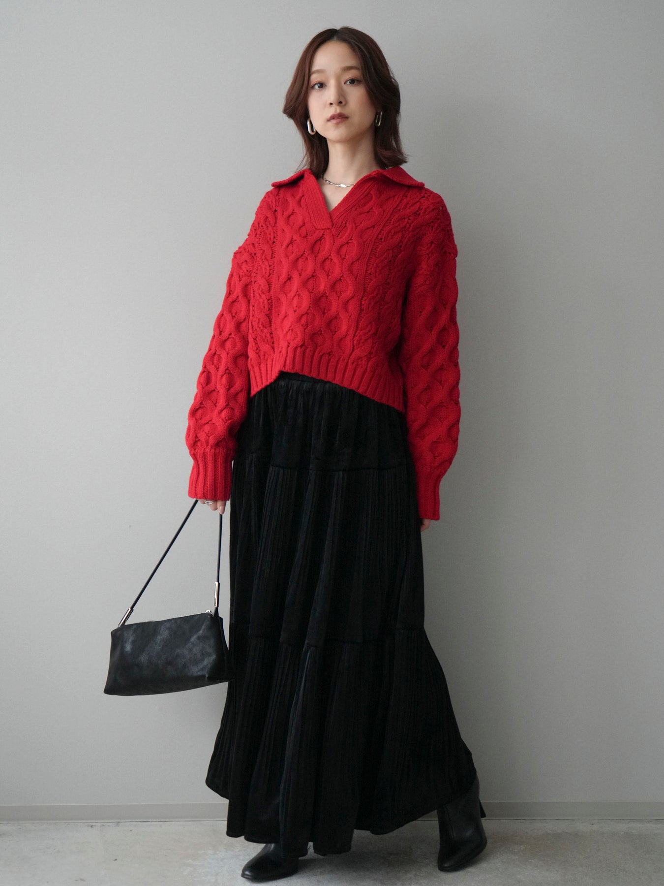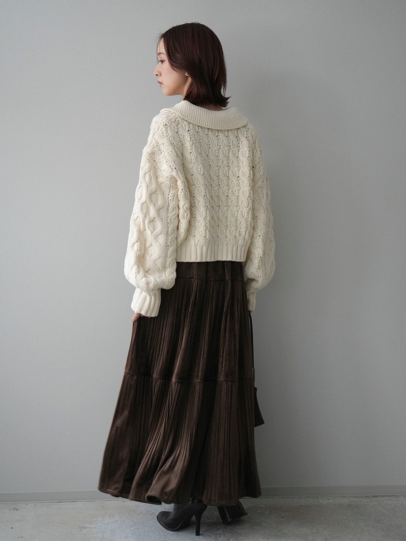 [SET]バルキーケーブルクロップド開襟プルオーバー+ベロアティアードワッシャースカート(2set)