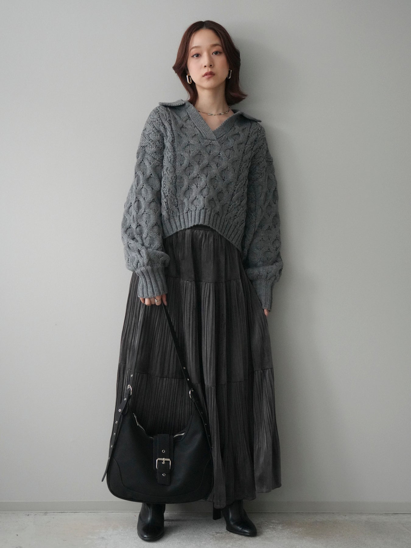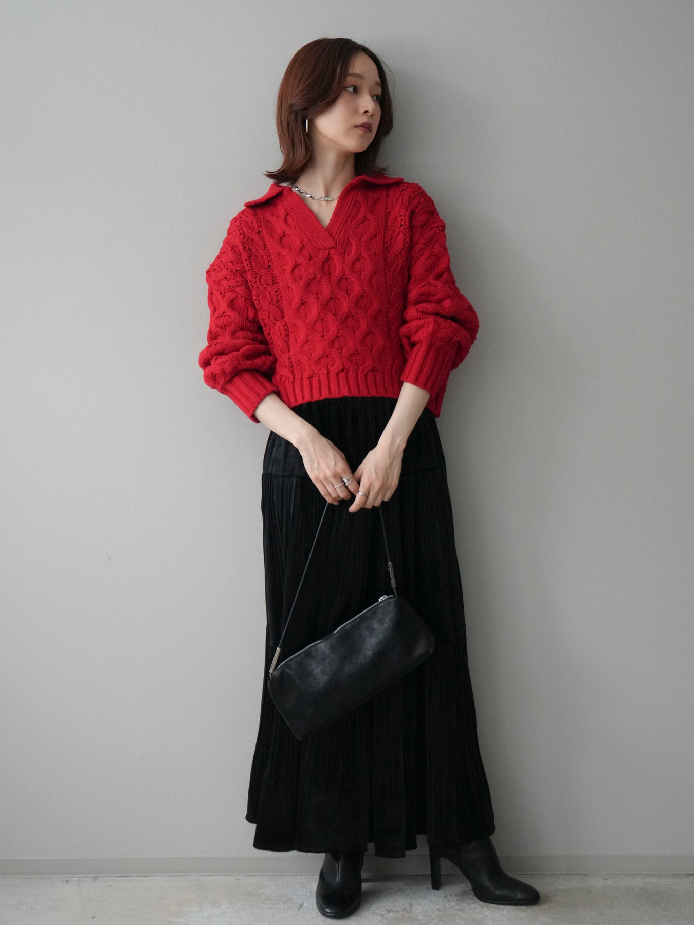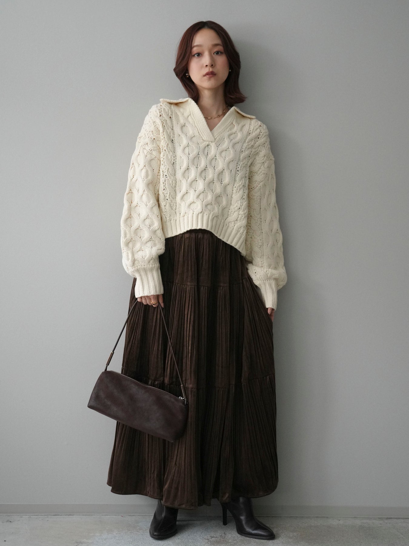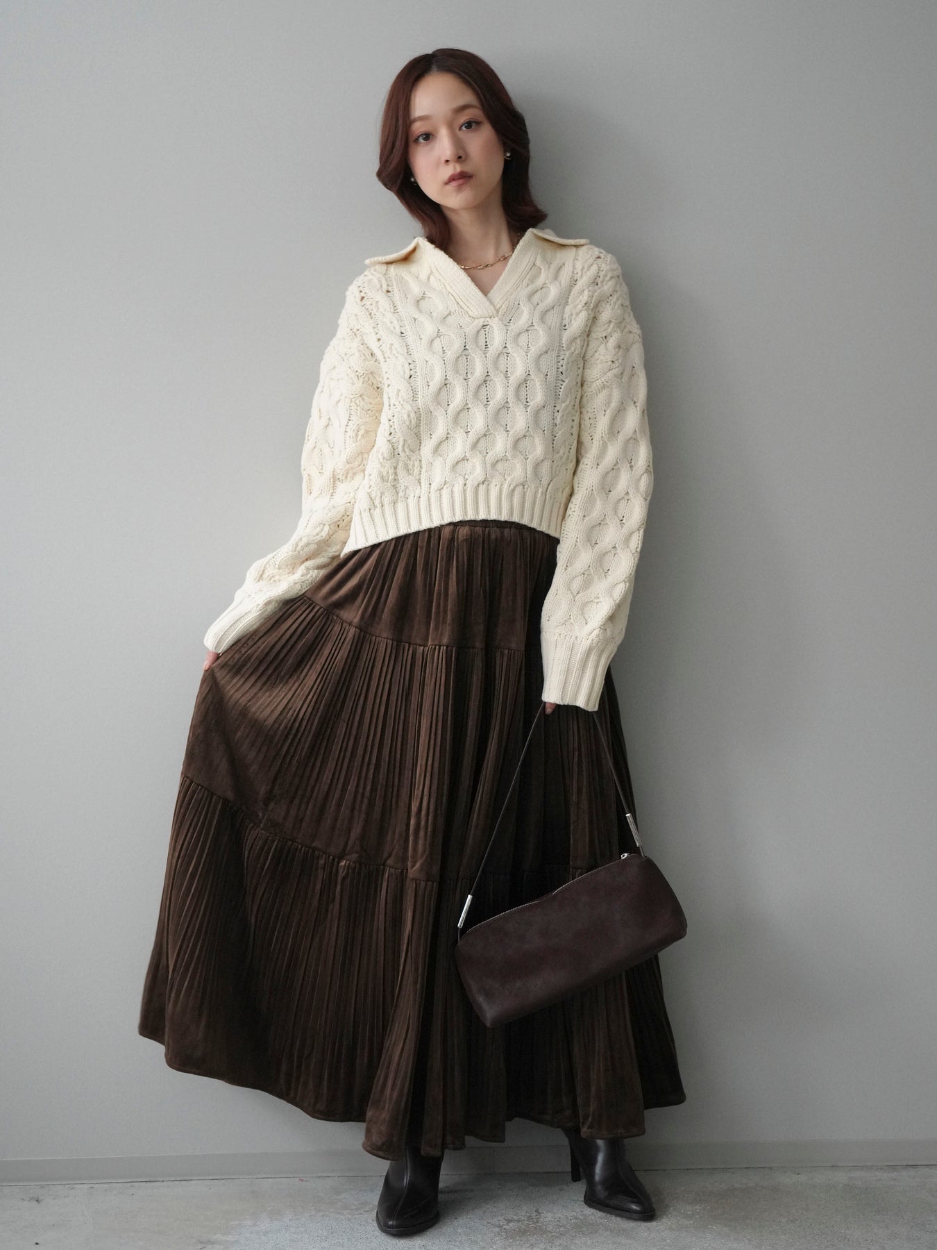 [SET]バルキーケーブルクロップド開襟プルオーバー+ベロアティアードワッシャースカート(2set)