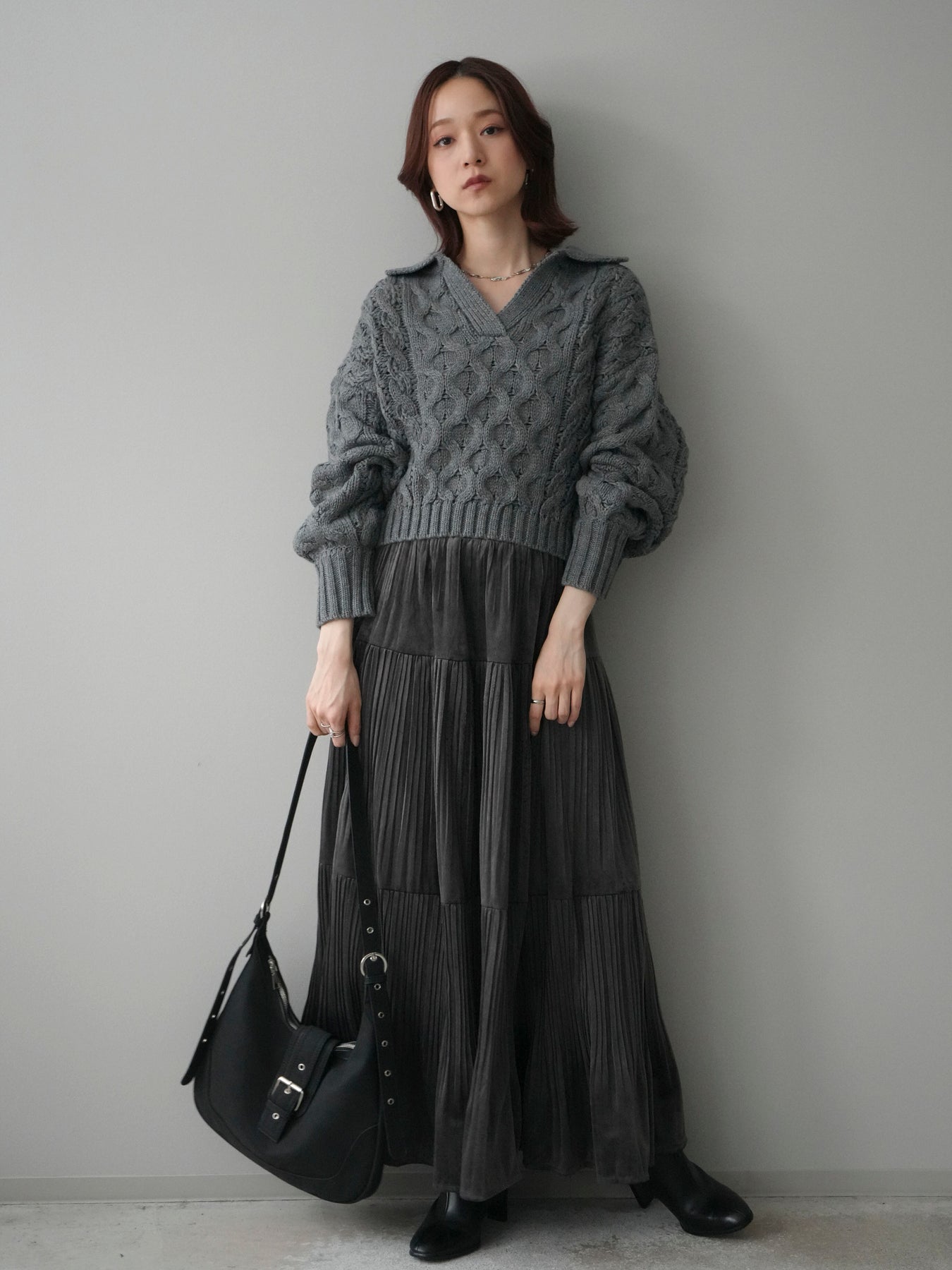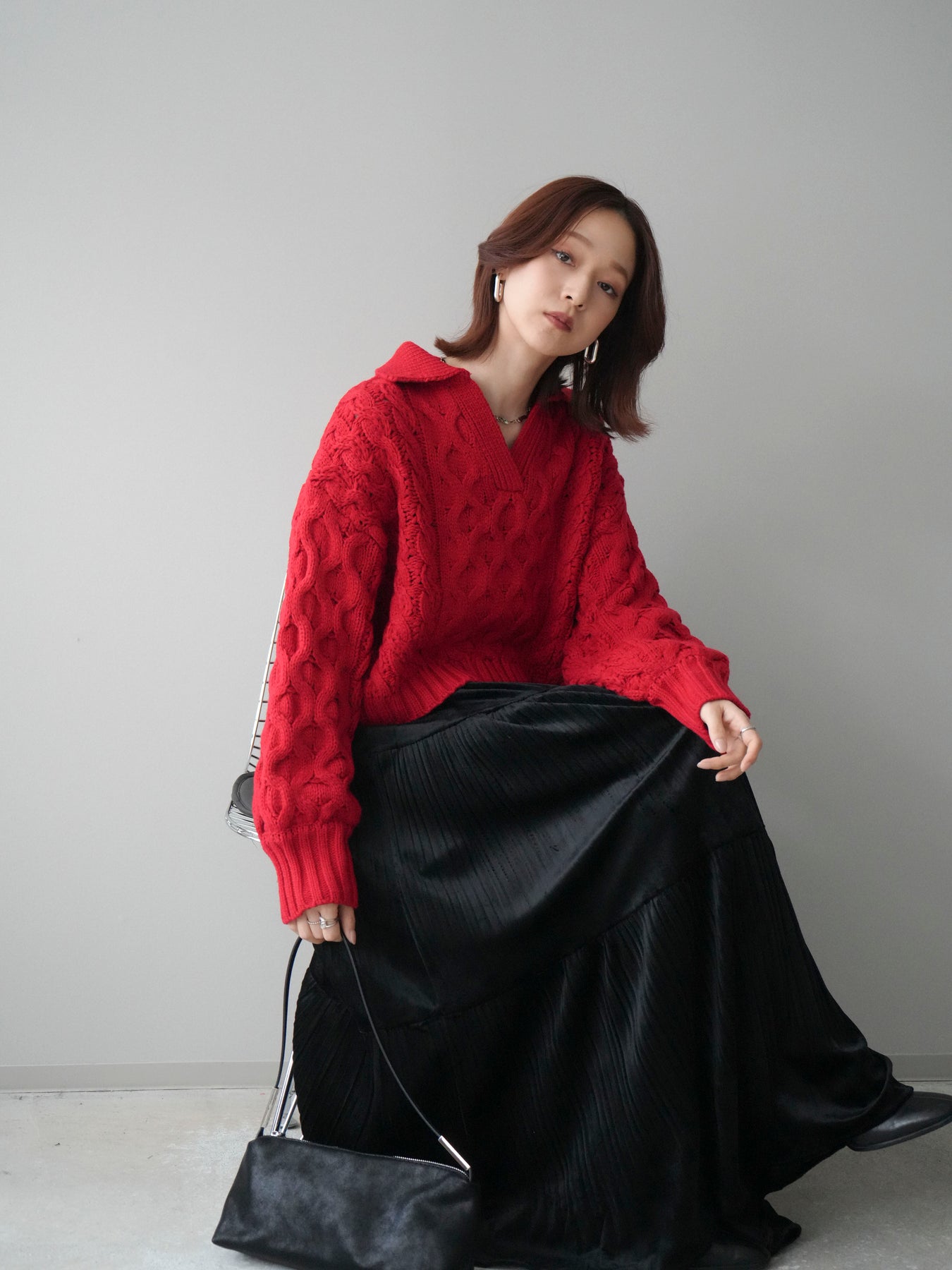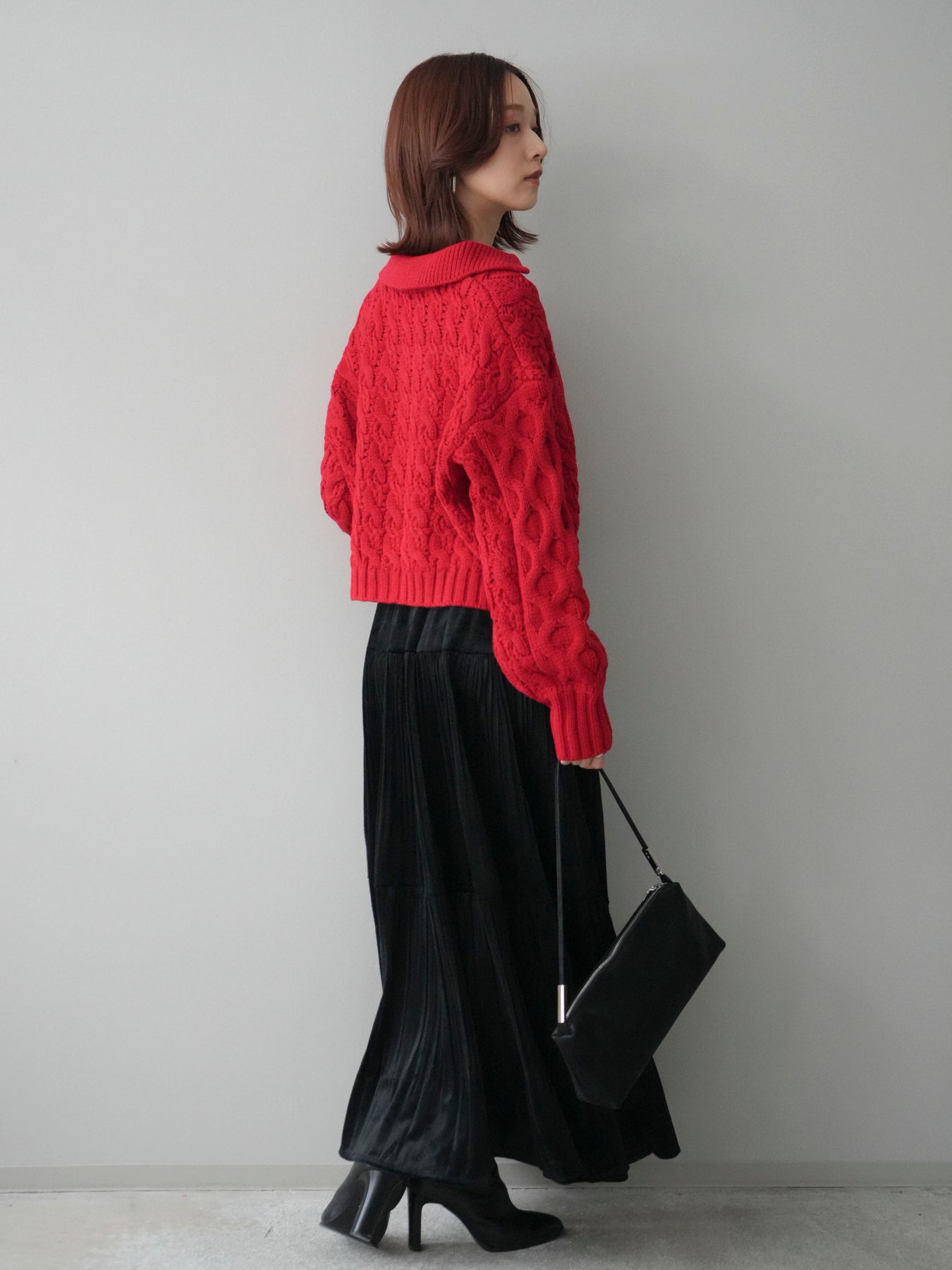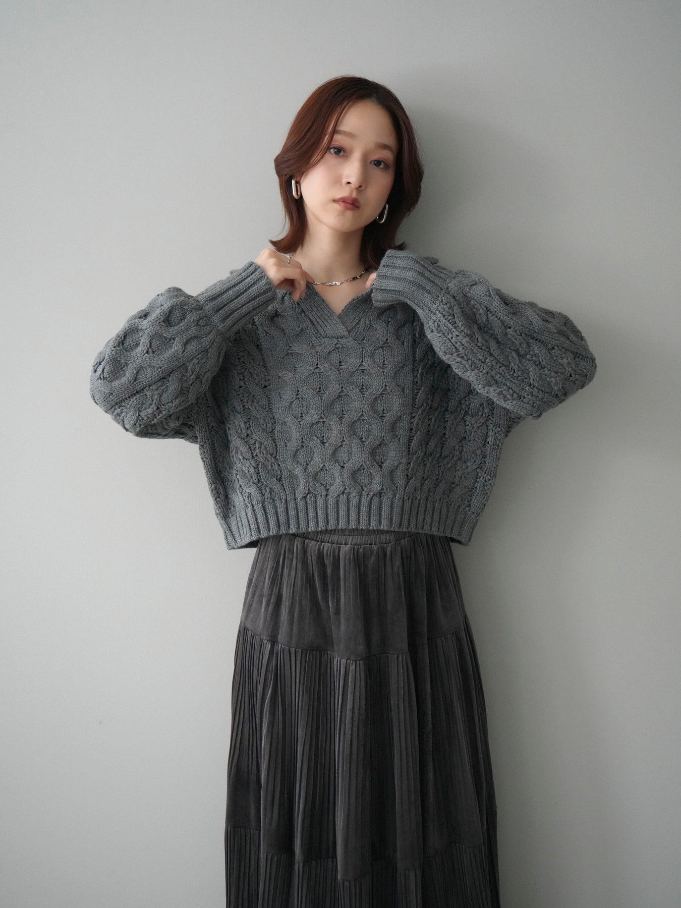 [SET]バルキーケーブルクロップド開襟プルオーバー+ベロアティアードワッシャースカート(2set)