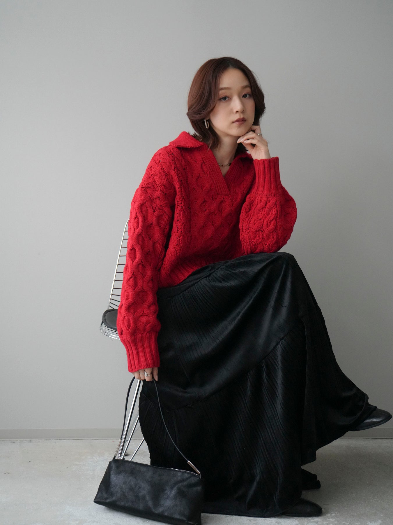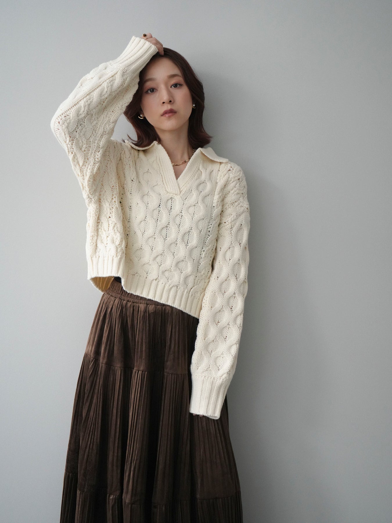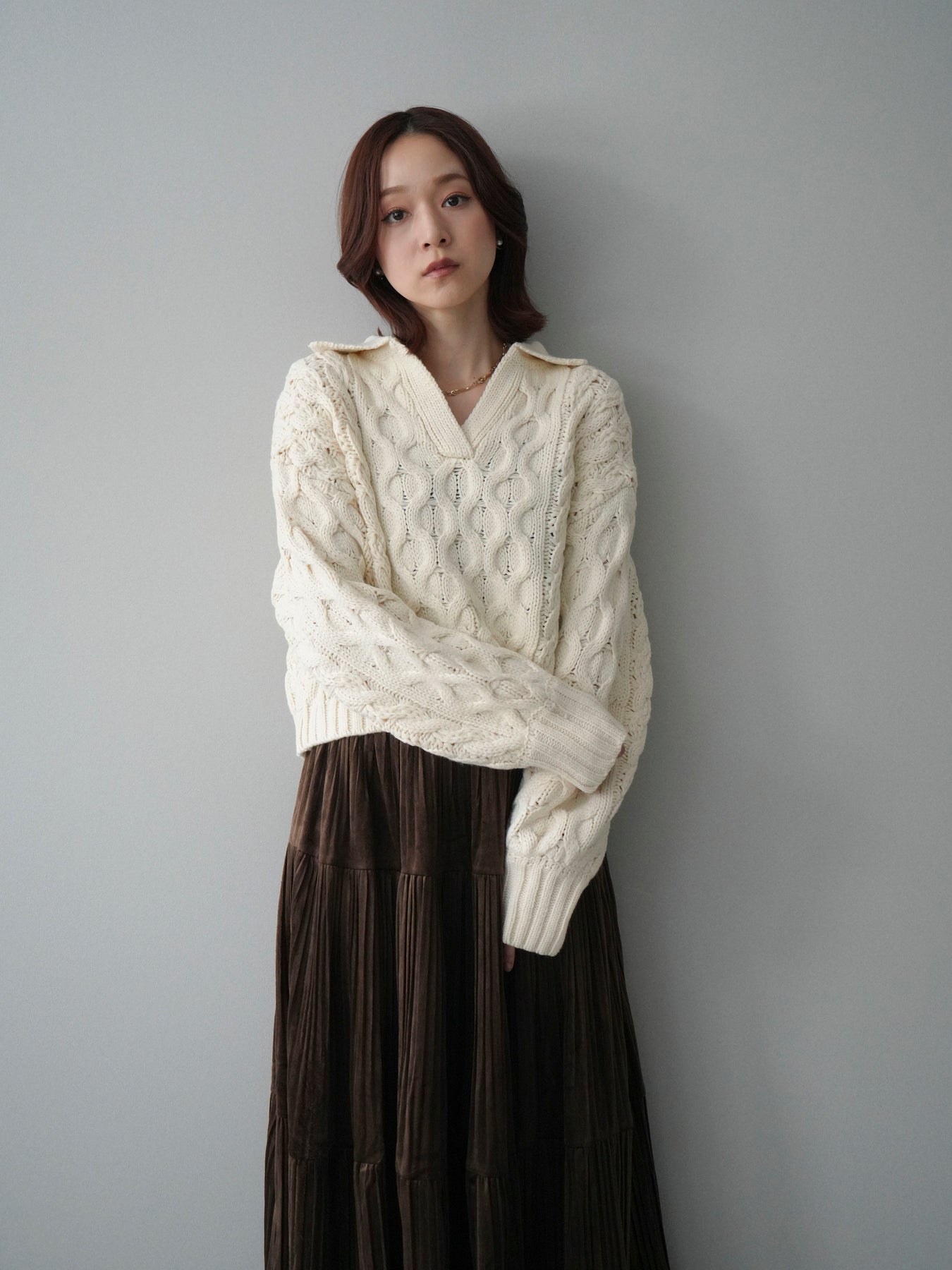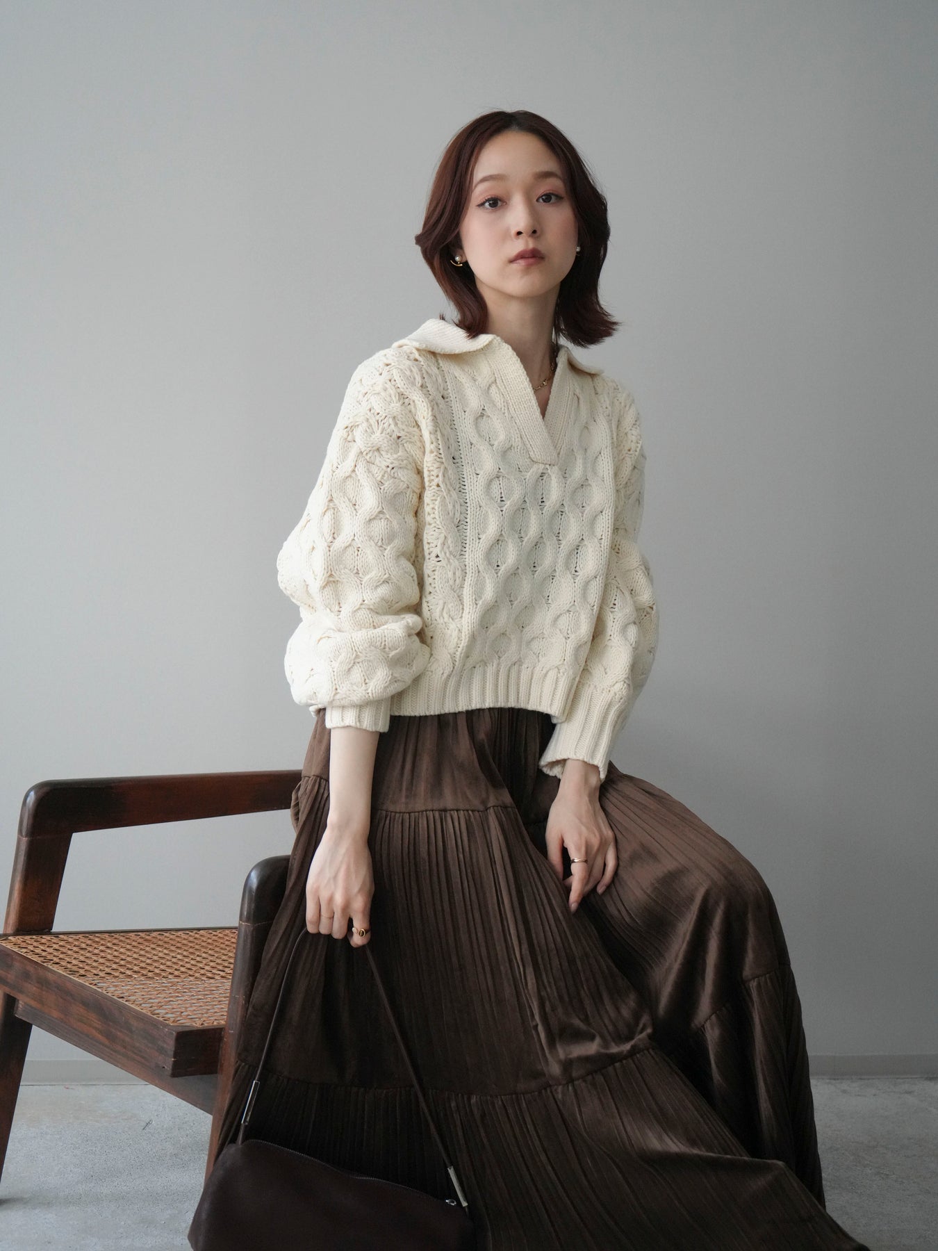 立体感のあるバルキーなケーブル編みが目を引くニットプルオーバー。 表情豊かな編み柄がスタイリングに存在感を与え、シンプルなコーディネートの主役として活躍します。 開襟デザインが程よい抜け感を演出し、重たくなりがちなケーブルニットを軽やかな印象に。 コンパクトな丈感で全体のバランスが取りやすく、パンツにもスカートにも好相性です。 季節感のある素材表情とデザイン性を兼ね備えた、コーディネートを格上げしてくれる一着です。