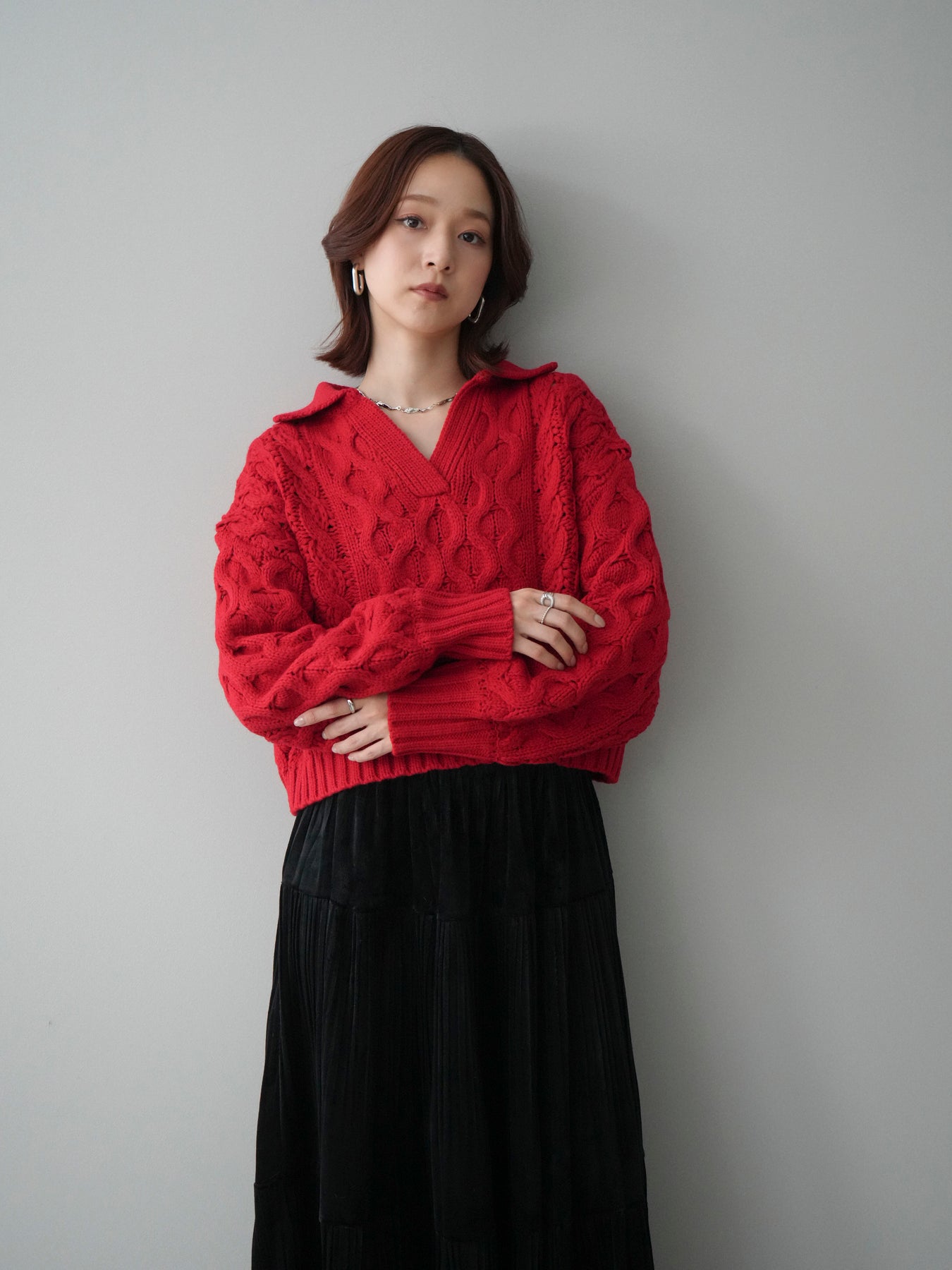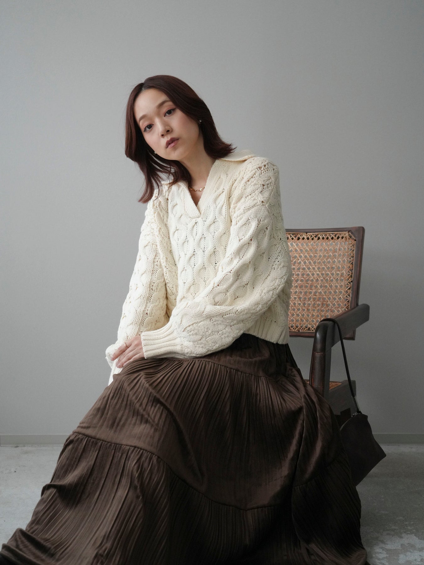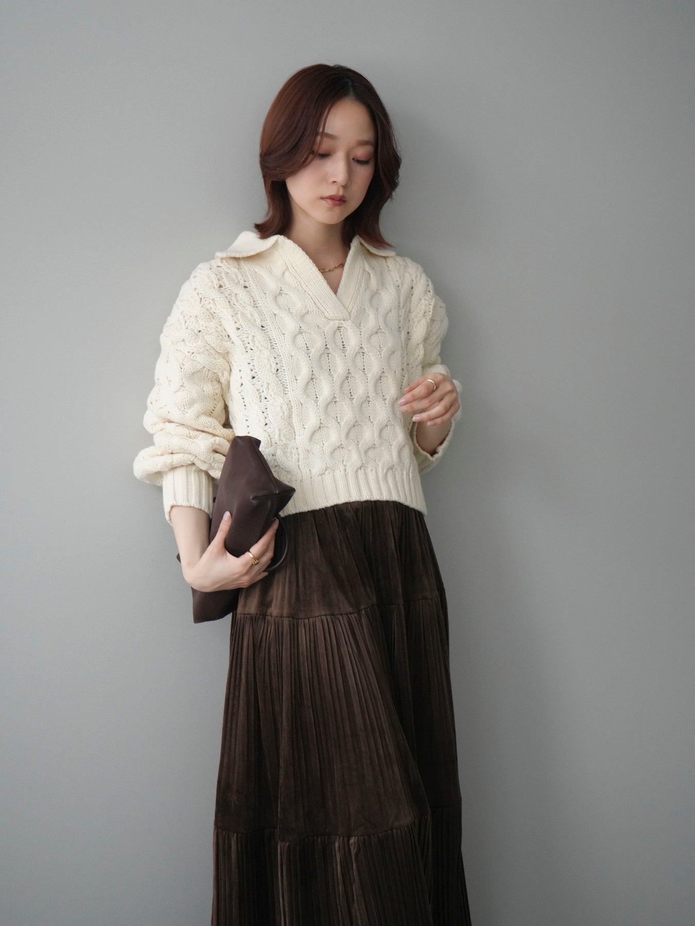 立体感のあるバルキーなケーブル編みが目を引くニットプルオーバー。 表情豊かな編み柄がスタイリングに存在感を与え、シンプルなコーディネートの主役として活躍します。 開襟デザインが程よい抜け感を演出し、重たくなりがちなケーブルニットを軽やかな印象に。 コンパクトな丈感で全体のバランスが取りやすく、パンツにもスカートにも好相性です。 季節感のある素材表情とデザイン性を兼ね備えた、コーディネートを格上げしてくれる一着です。