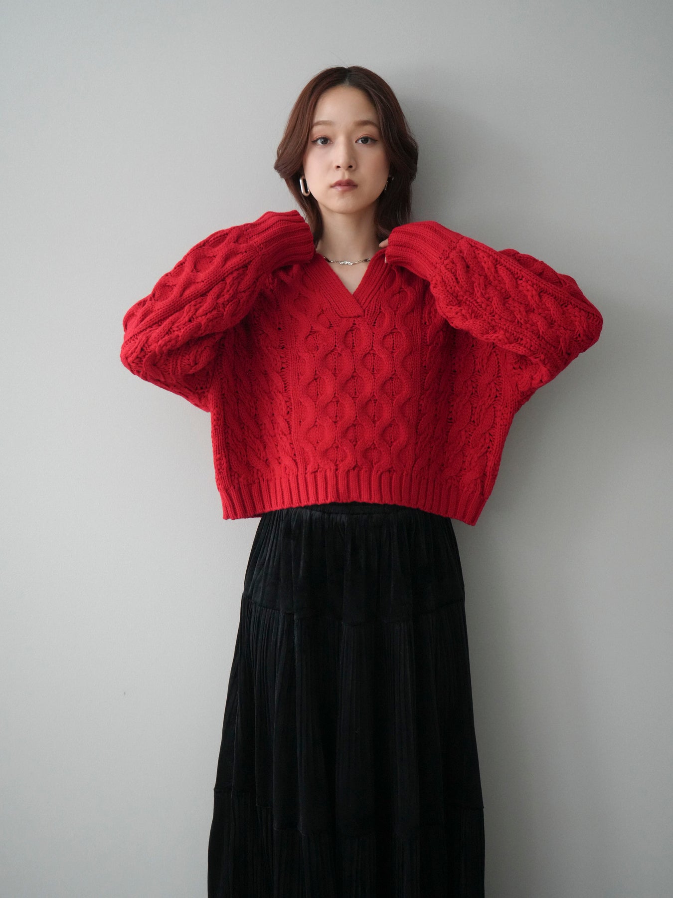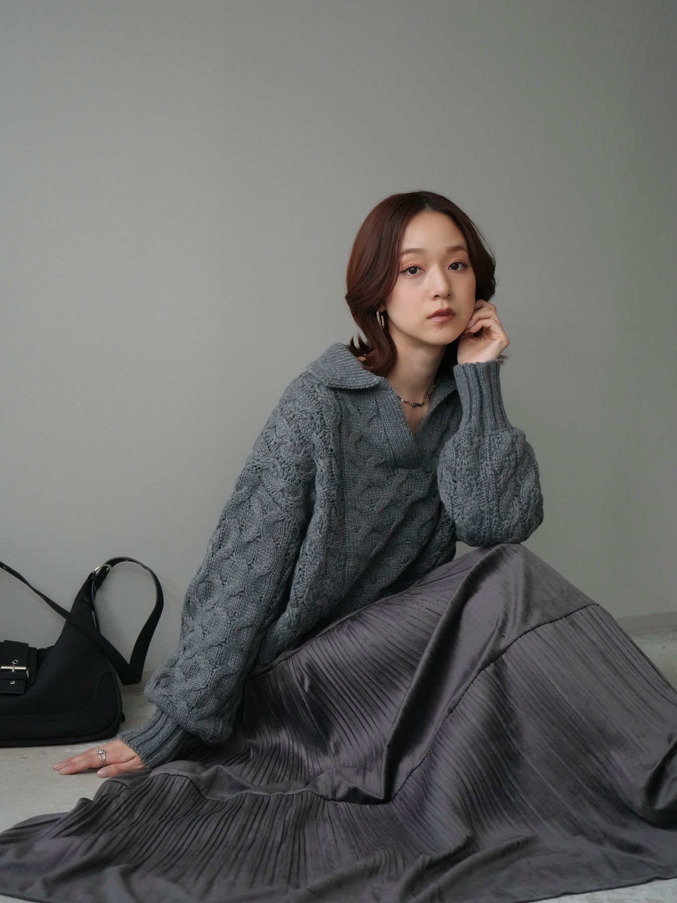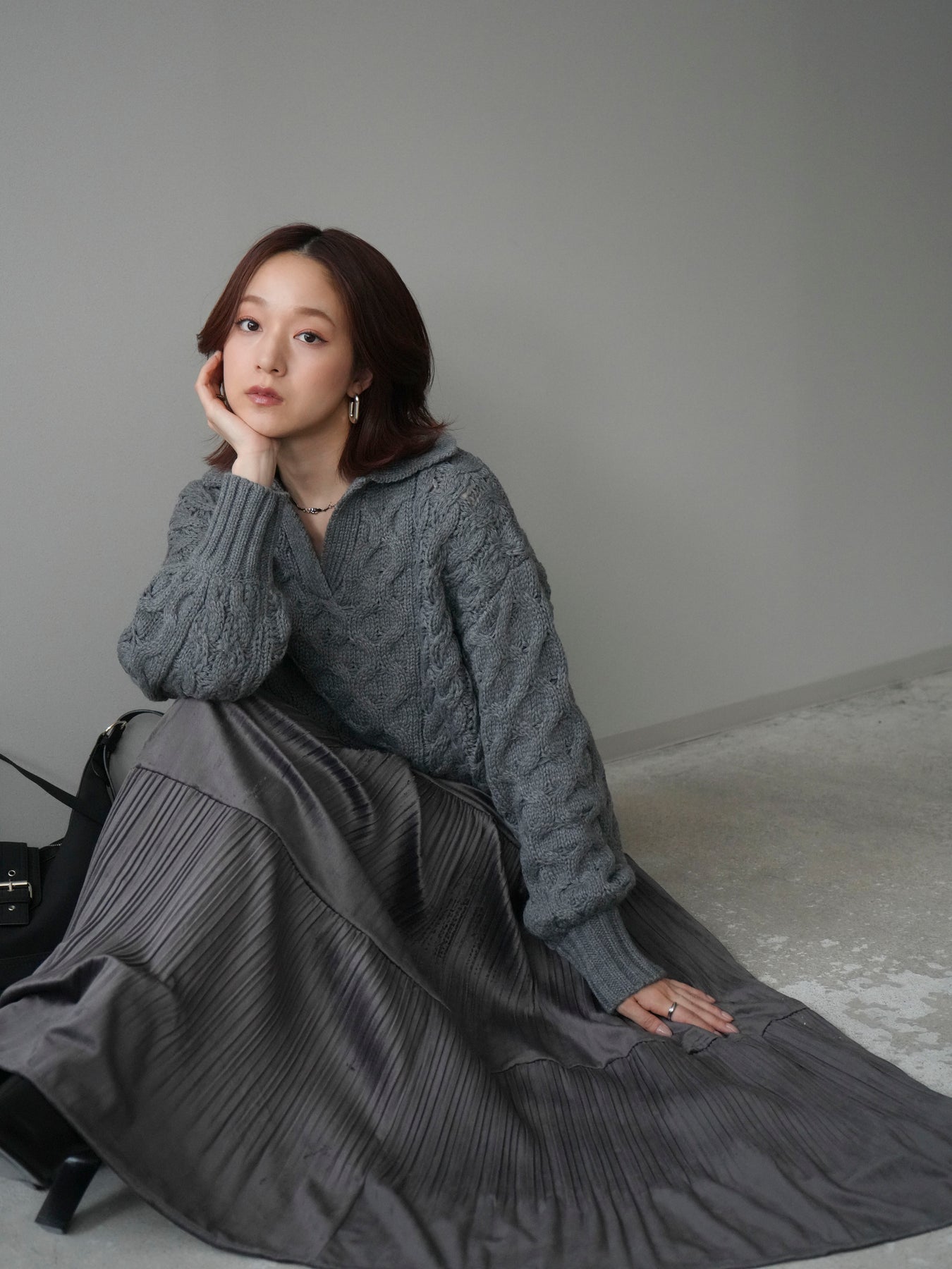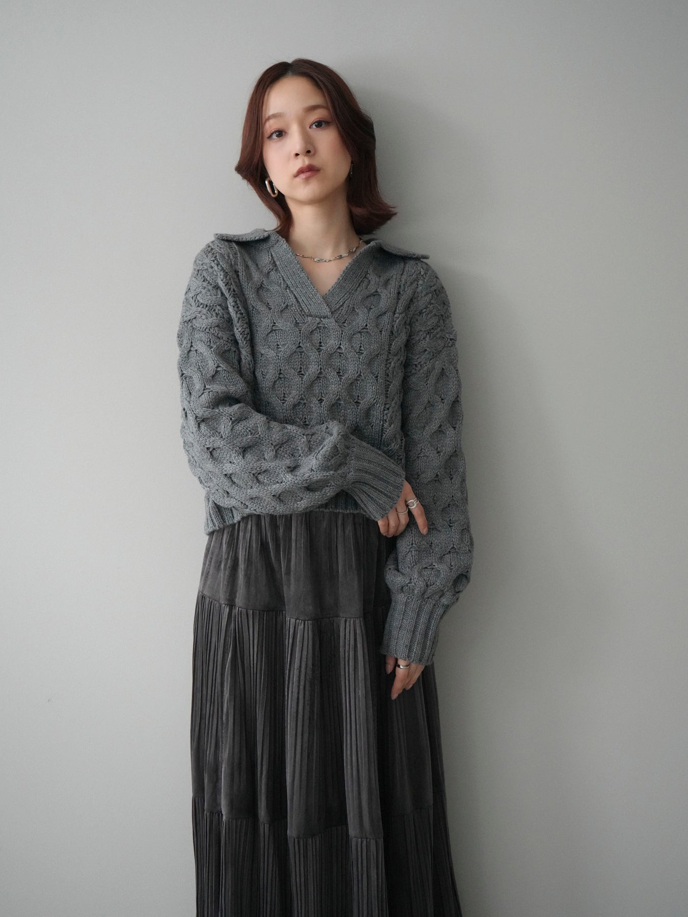 立体感のあるバルキーなケーブル編みが目を引くニットプルオーバー。 表情豊かな編み柄がスタイリングに存在感を与え、シンプルなコーディネートの主役として活躍します。 開襟デザインが程よい抜け感を演出し、重たくなりがちなケーブルニットを軽やかな印象に。 コンパクトな丈感で全体のバランスが取りやすく、パンツにもスカートにも好相性です。 季節感のある素材表情とデザイン性を兼ね備えた、コーディネートを格上げしてくれる一着です。