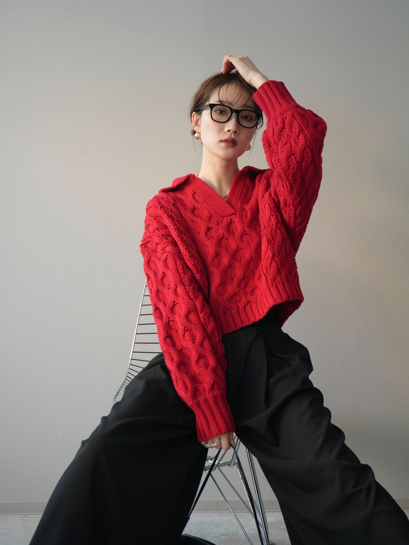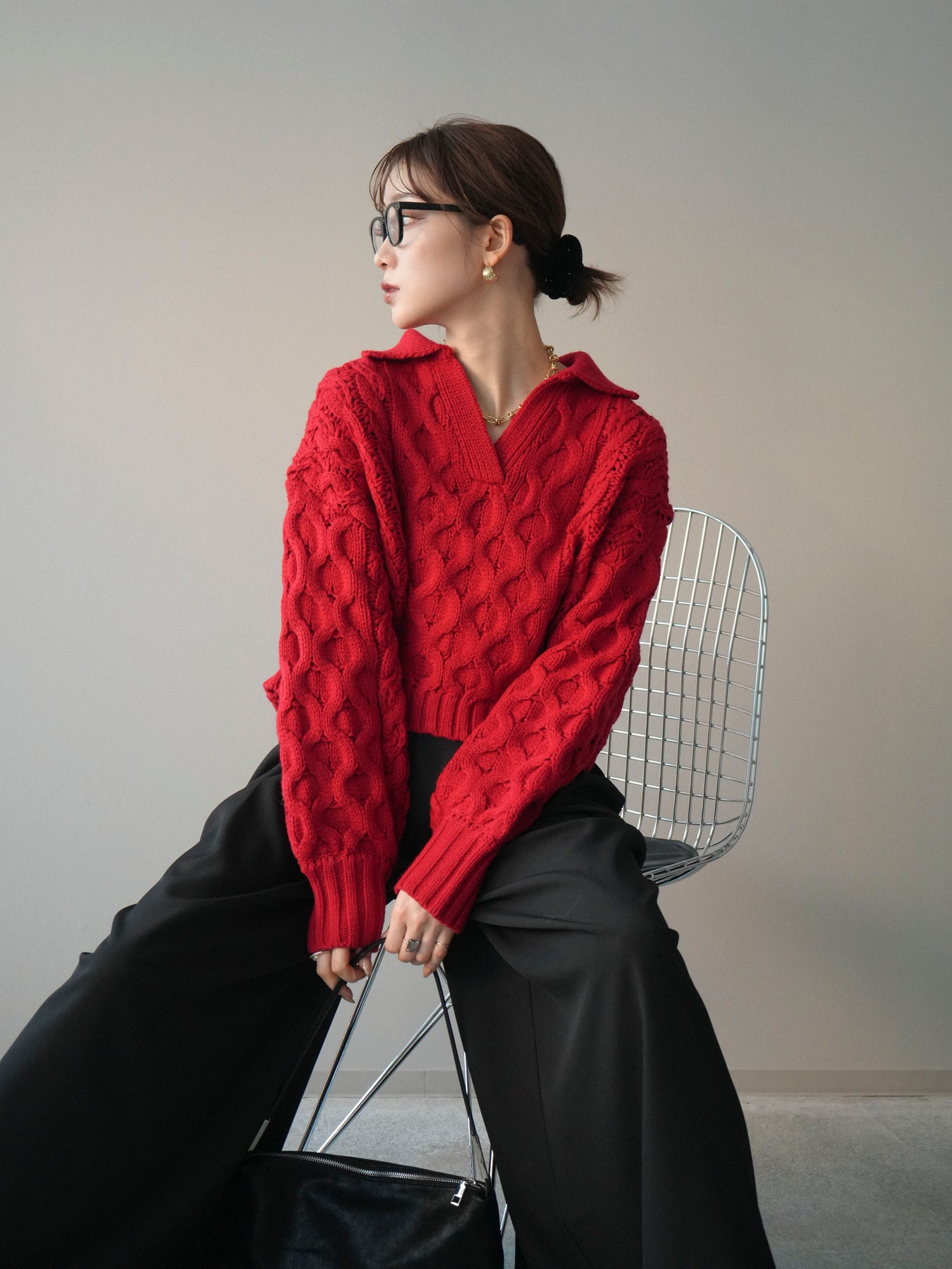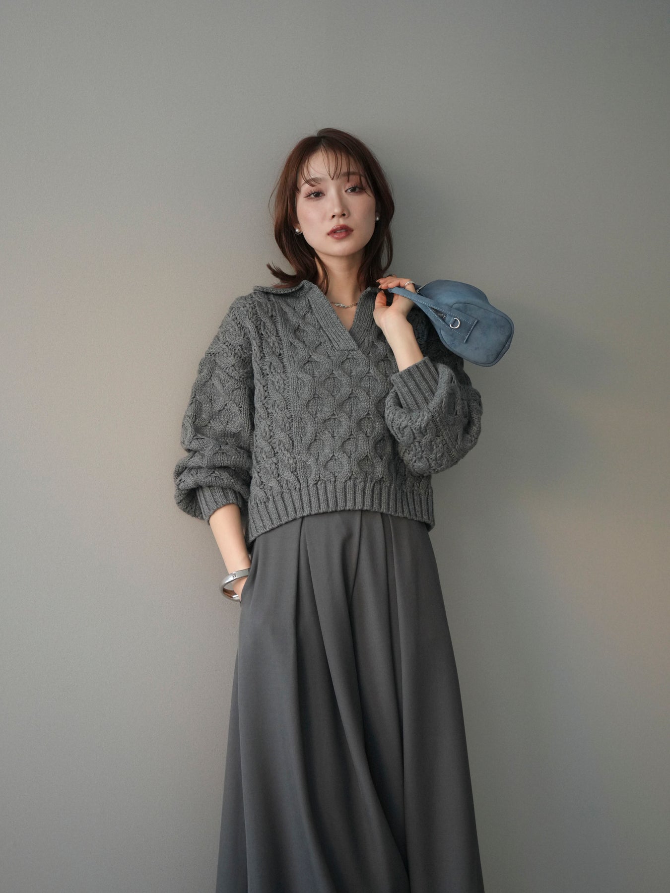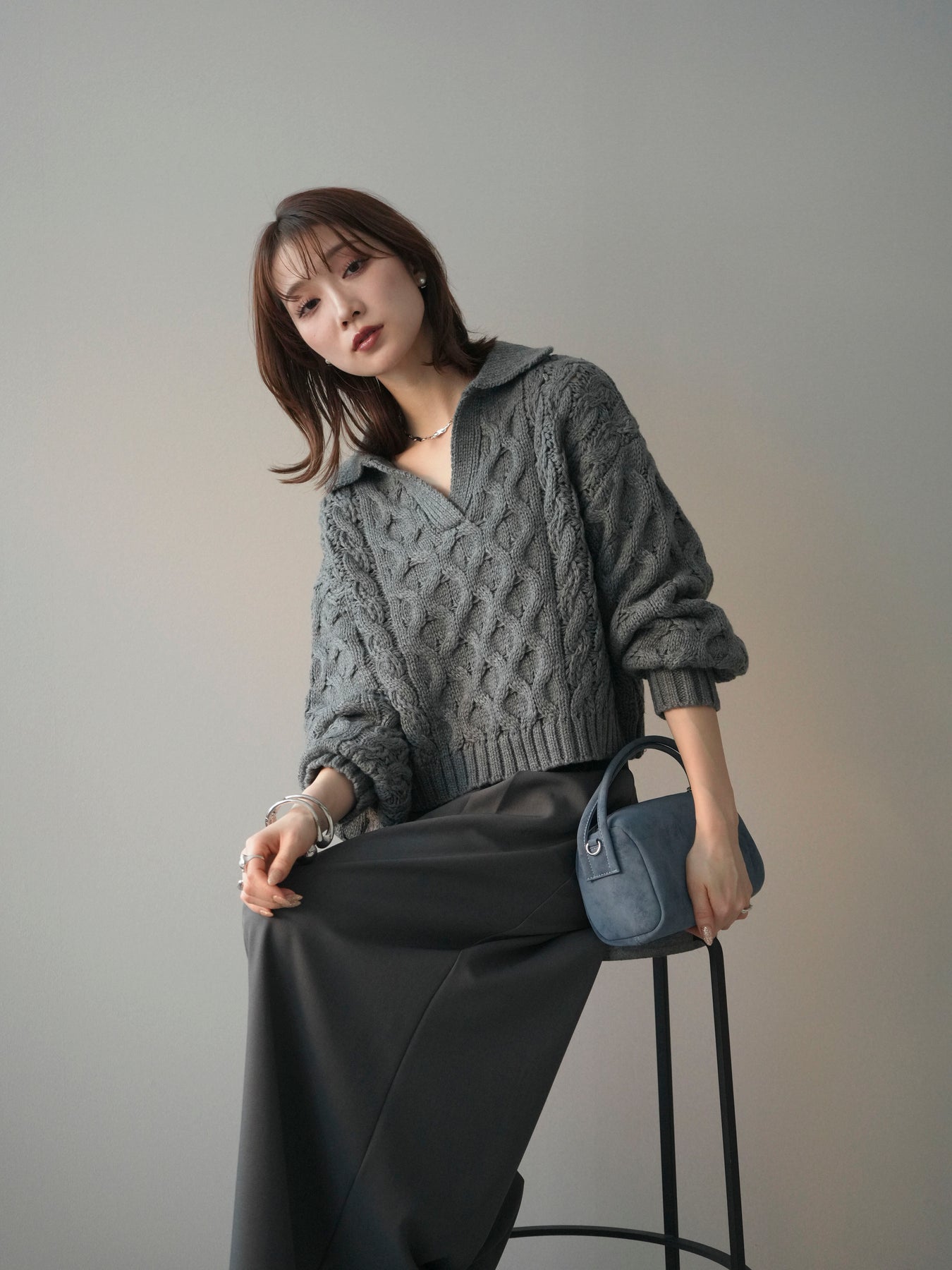 立体感のあるバルキーなケーブル編みが目を引くニットプルオーバー。 表情豊かな編み柄がスタイリングに存在感を与え、シンプルなコーディネートの主役として活躍します。 開襟デザインが程よい抜け感を演出し、重たくなりがちなケーブルニットを軽やかな印象に。 コンパクトな丈感で全体のバランスが取りやすく、パンツにもスカートにも好相性です。 季節感のある素材表情とデザイン性を兼ね備えた、コーディネートを格上げしてくれる一着です。