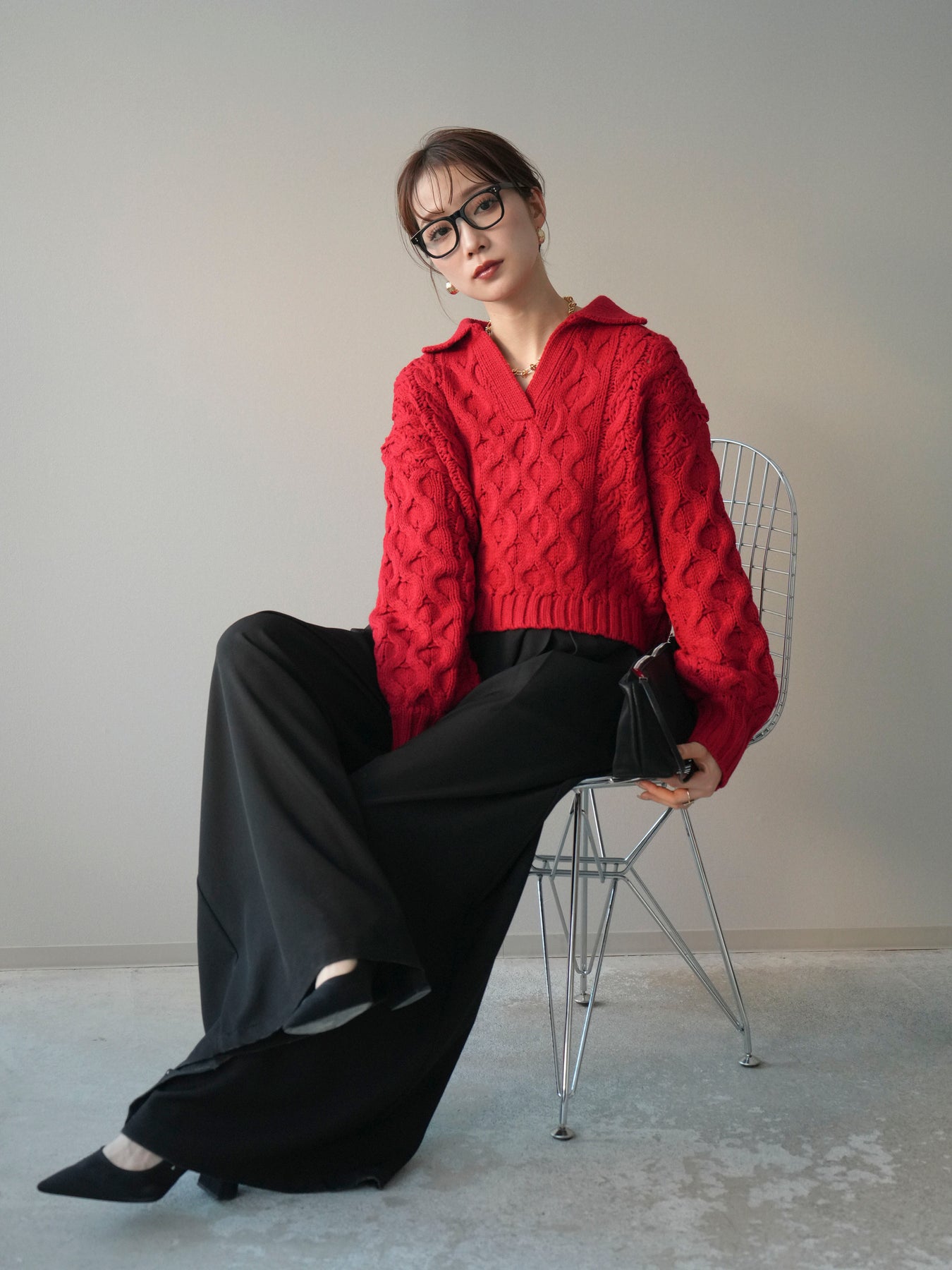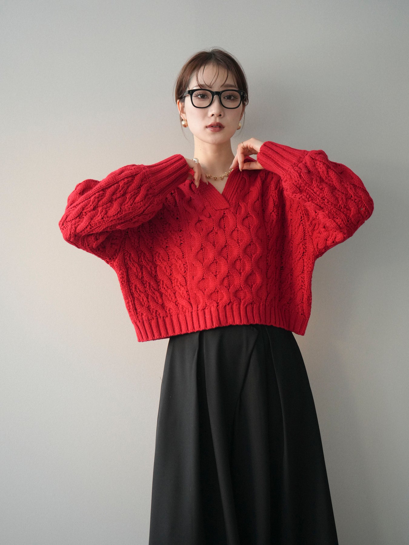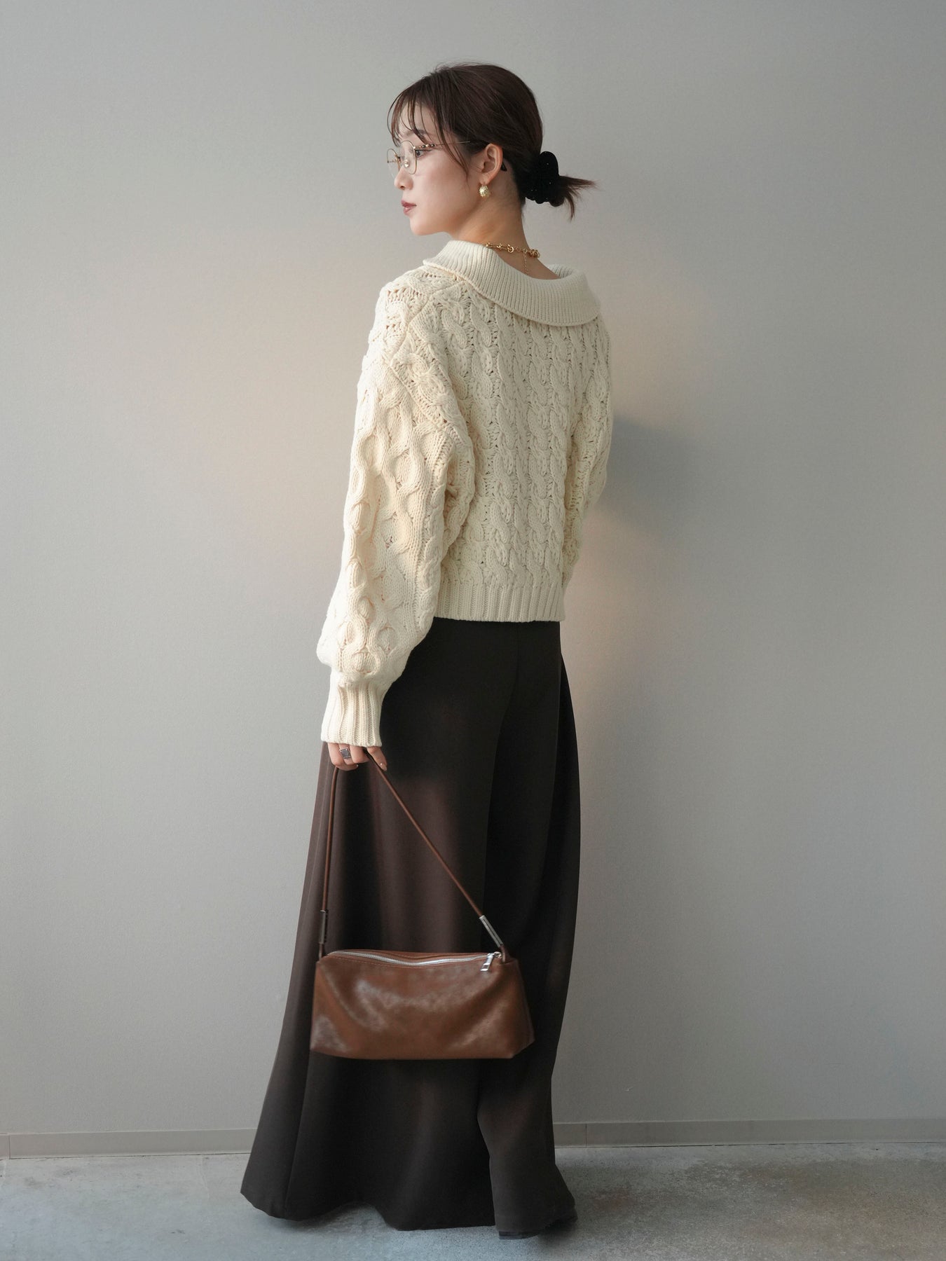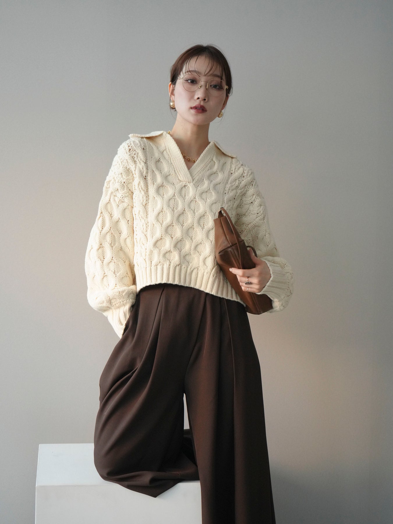 立体感のあるバルキーなケーブル編みが目を引くニットプルオーバー。 表情豊かな編み柄がスタイリングに存在感を与え、シンプルなコーディネートの主役として活躍します。 開襟デザインが程よい抜け感を演出し、重たくなりがちなケーブルニットを軽やかな印象に。 コンパクトな丈感で全体のバランスが取りやすく、パンツにもスカートにも好相性です。 季節感のある素材表情とデザイン性を兼ね備えた、コーディネートを格上げしてくれる一着です。