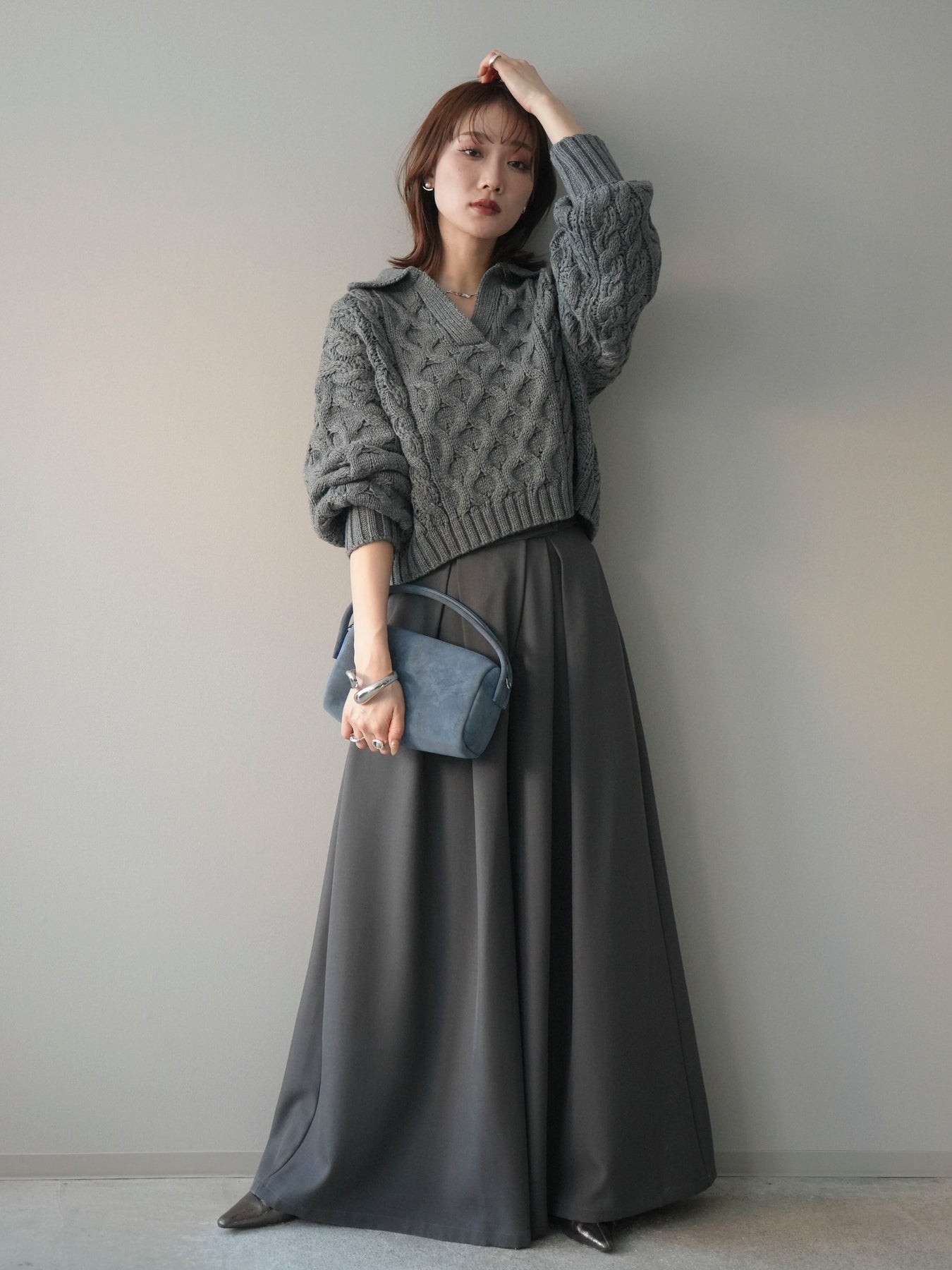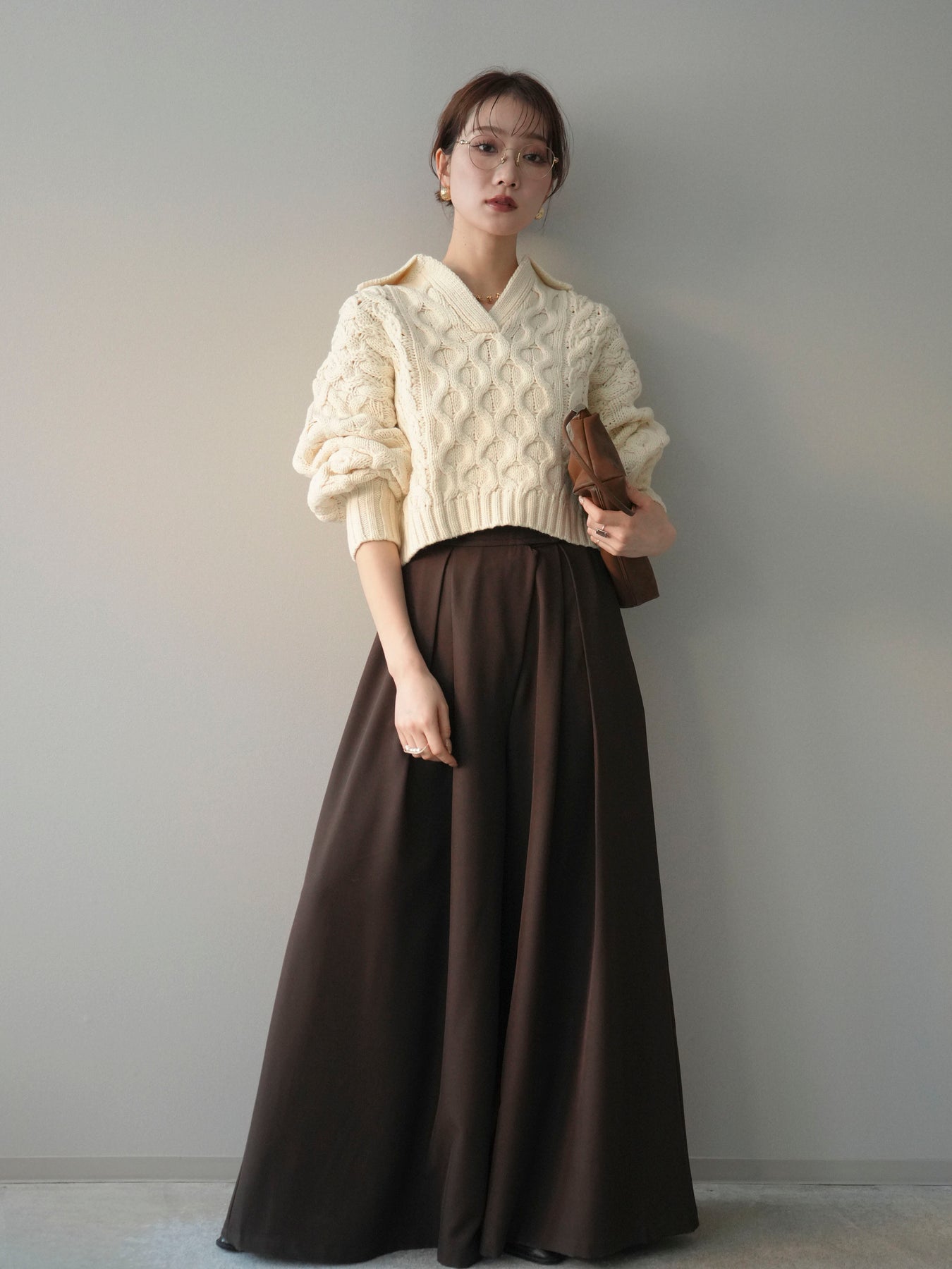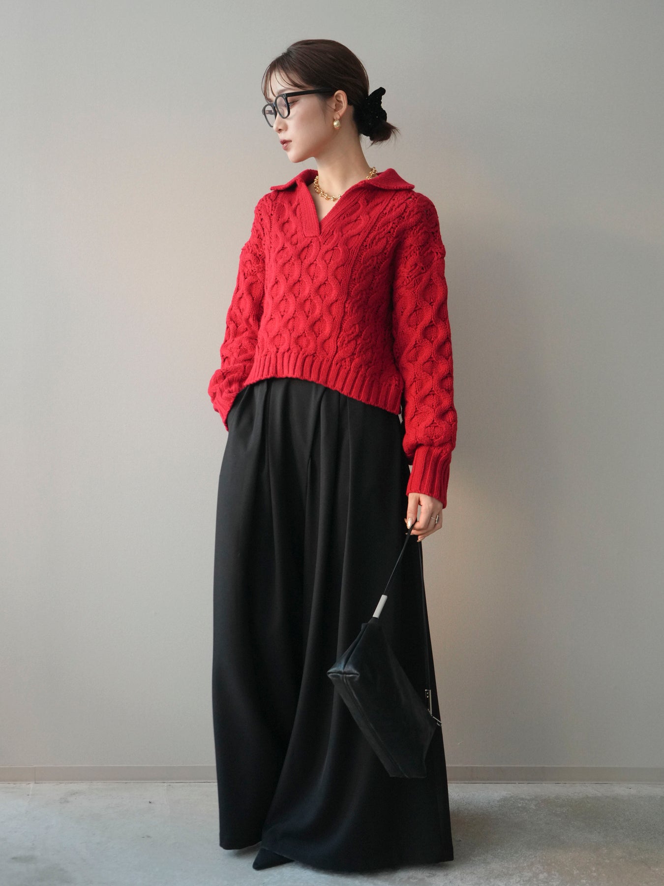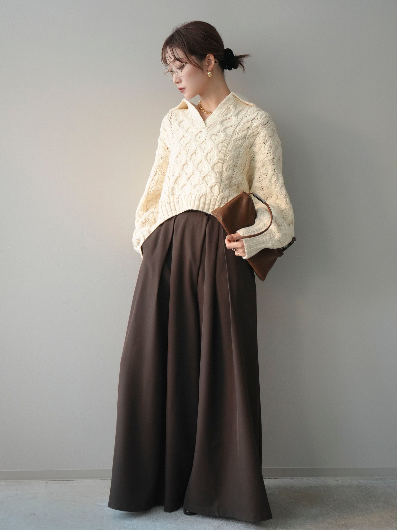 立体感のあるバルキーなケーブル編みが目を引くニットプルオーバー。 表情豊かな編み柄がスタイリングに存在感を与え、シンプルなコーディネートの主役として活躍します。 開襟デザインが程よい抜け感を演出し、重たくなりがちなケーブルニットを軽やかな印象に。 コンパクトな丈感で全体のバランスが取りやすく、パンツにもスカートにも好相性です。 季節感のある素材表情とデザイン性を兼ね備えた、コーディネートを格上げしてくれる一着です。