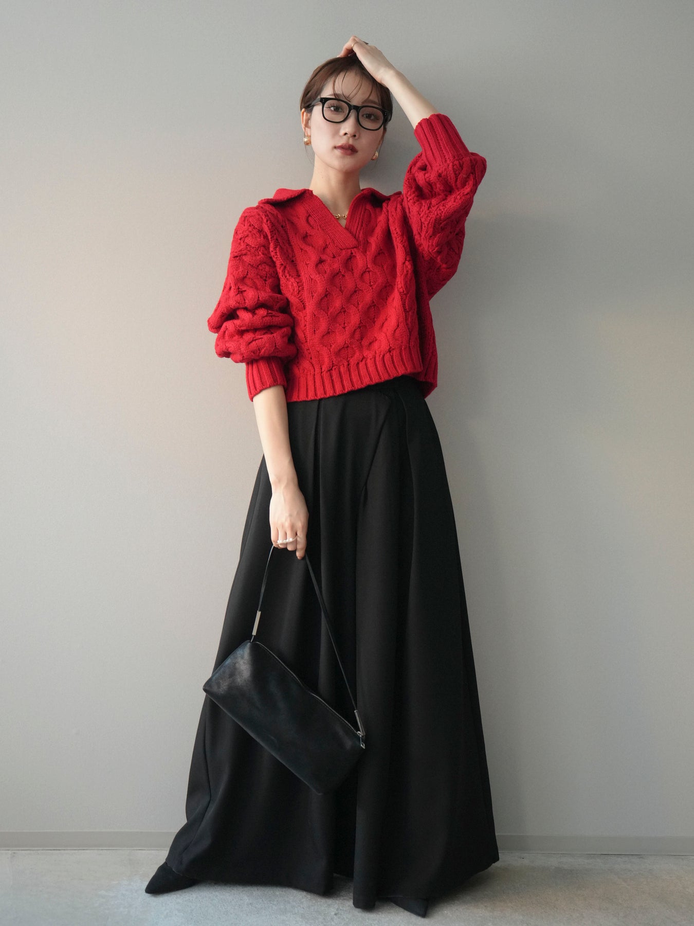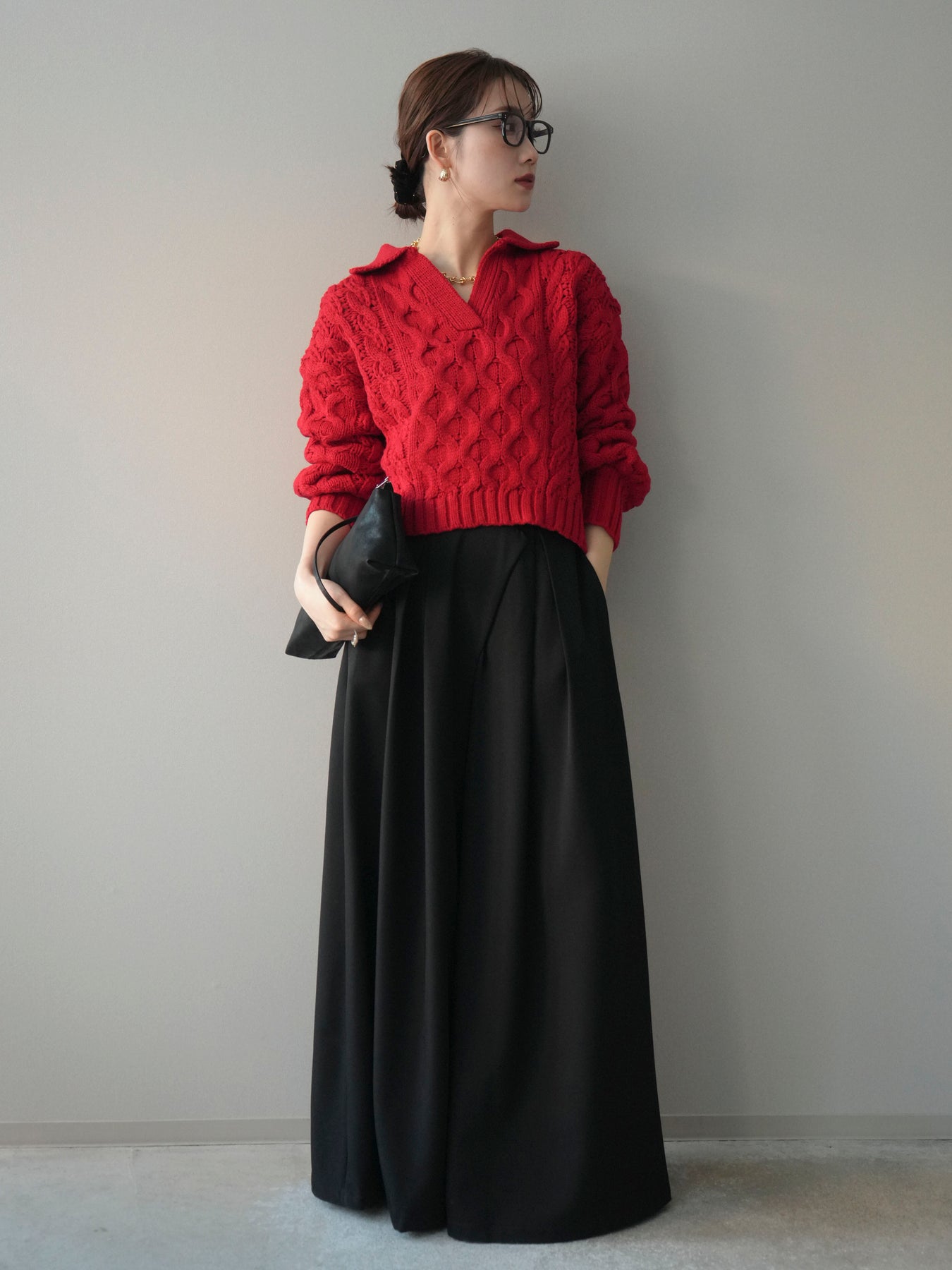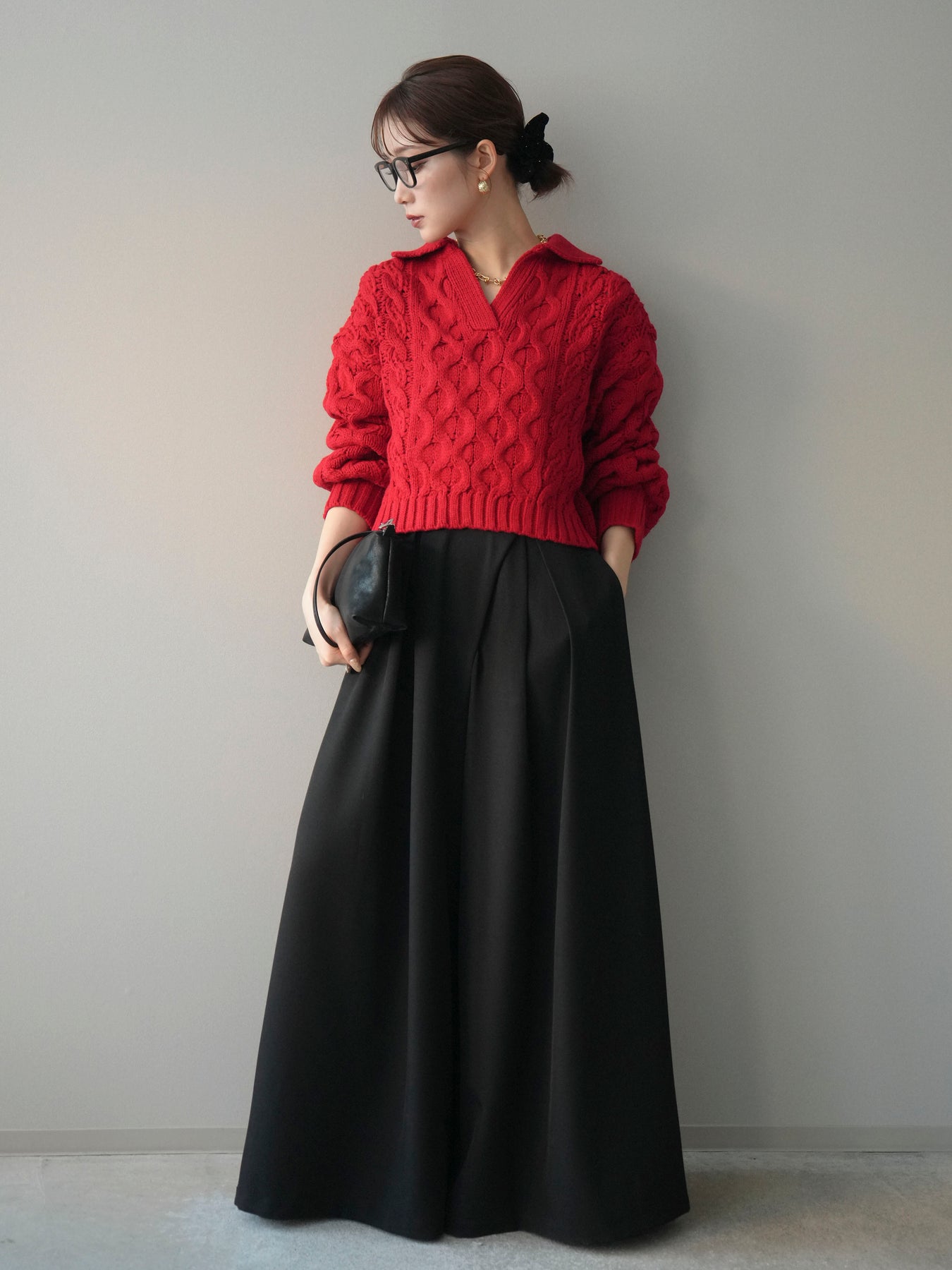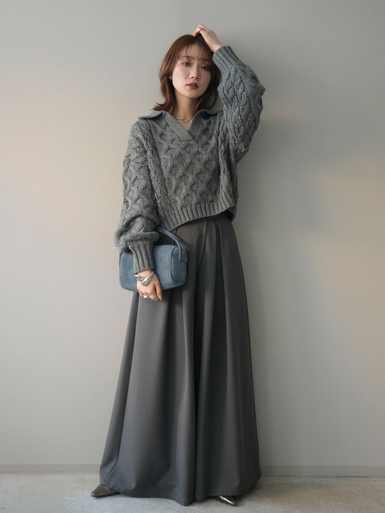 立体感のあるバルキーなケーブル編みが目を引くニットプルオーバー。 表情豊かな編み柄がスタイリングに存在感を与え、シンプルなコーディネートの主役として活躍します。 開襟デザインが程よい抜け感を演出し、重たくなりがちなケーブルニットを軽やかな印象に。 コンパクトな丈感で全体のバランスが取りやすく、パンツにもスカートにも好相性です。 季節感のある素材表情とデザイン性を兼ね備えた、コーディネートを格上げしてくれる一着です。