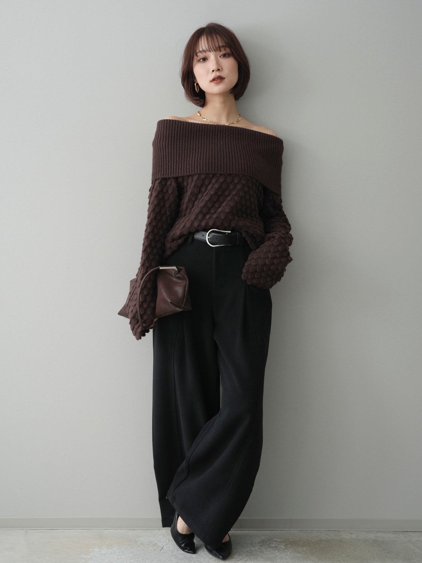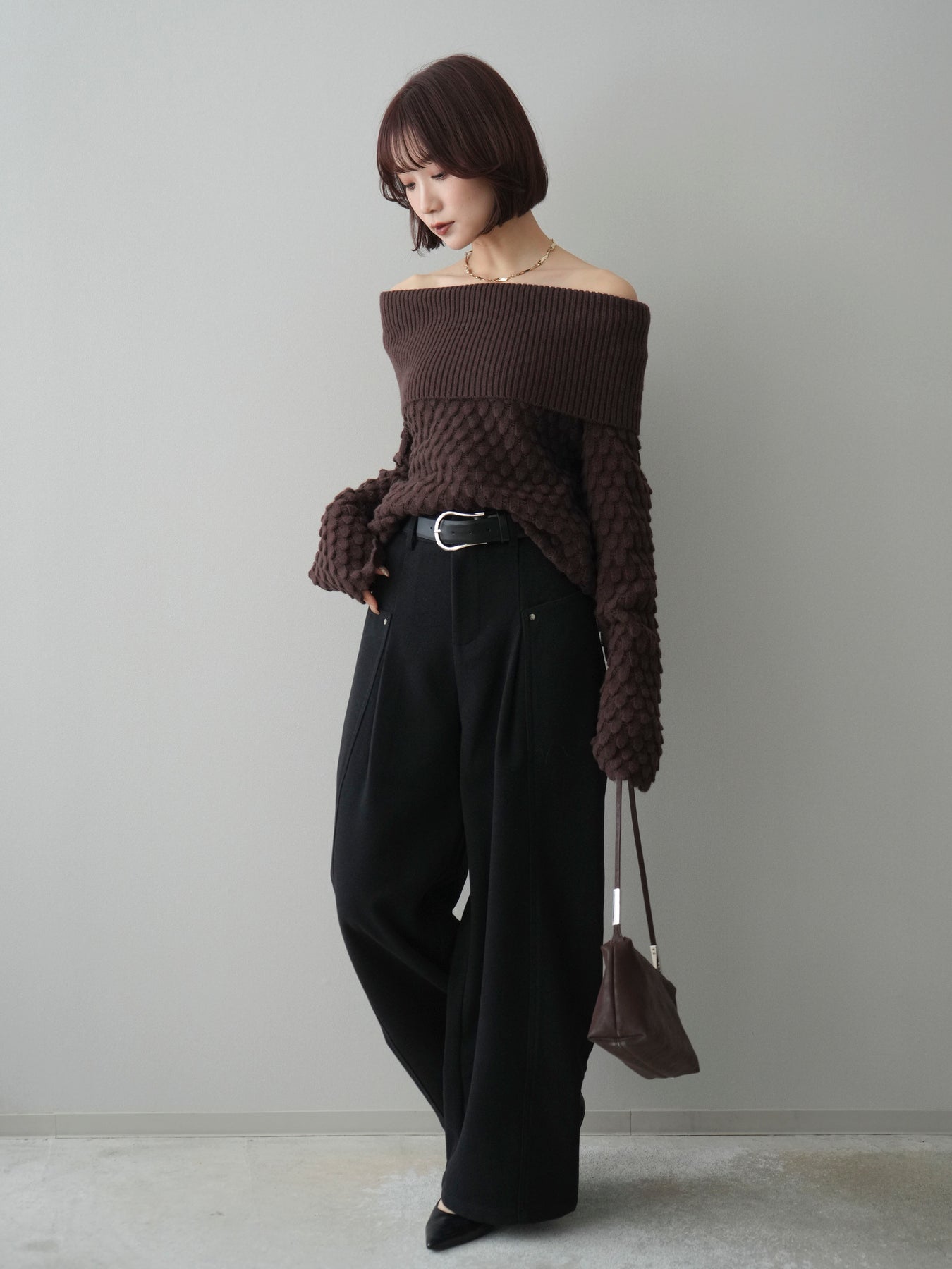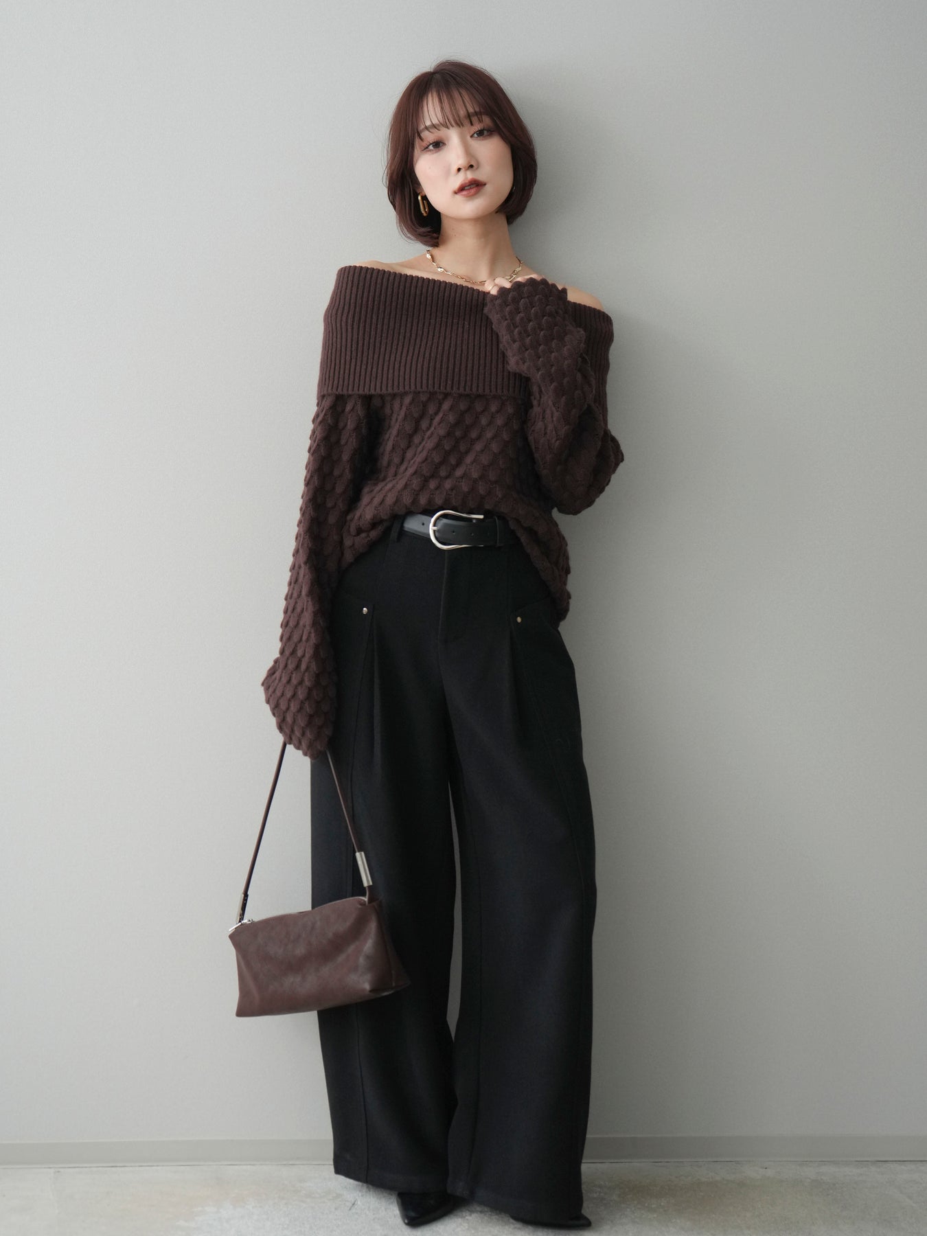 [SET]ポコポコ編みオフショルニットプルオーバー+ベルト付起毛コクーンパンツ(2set)