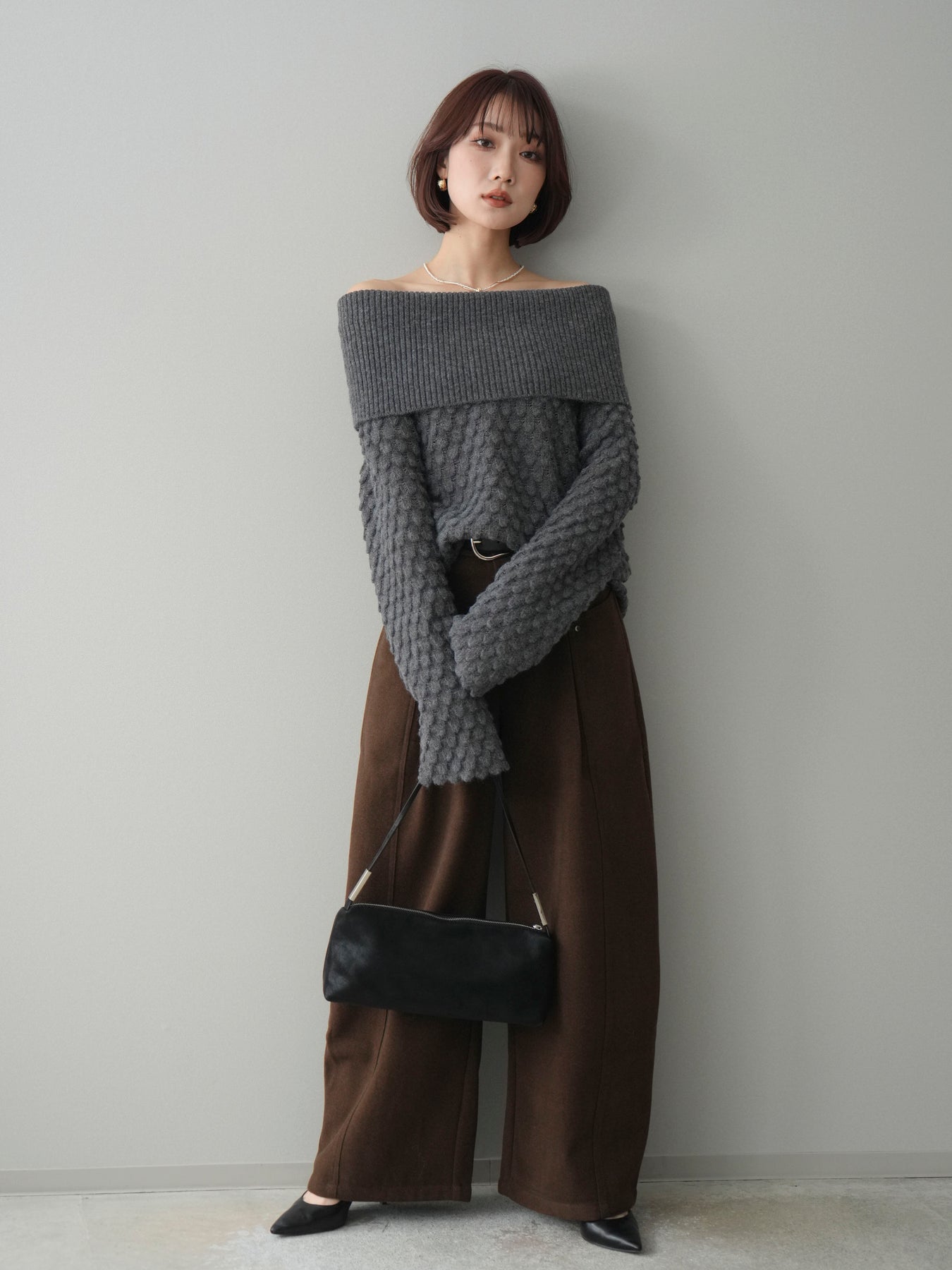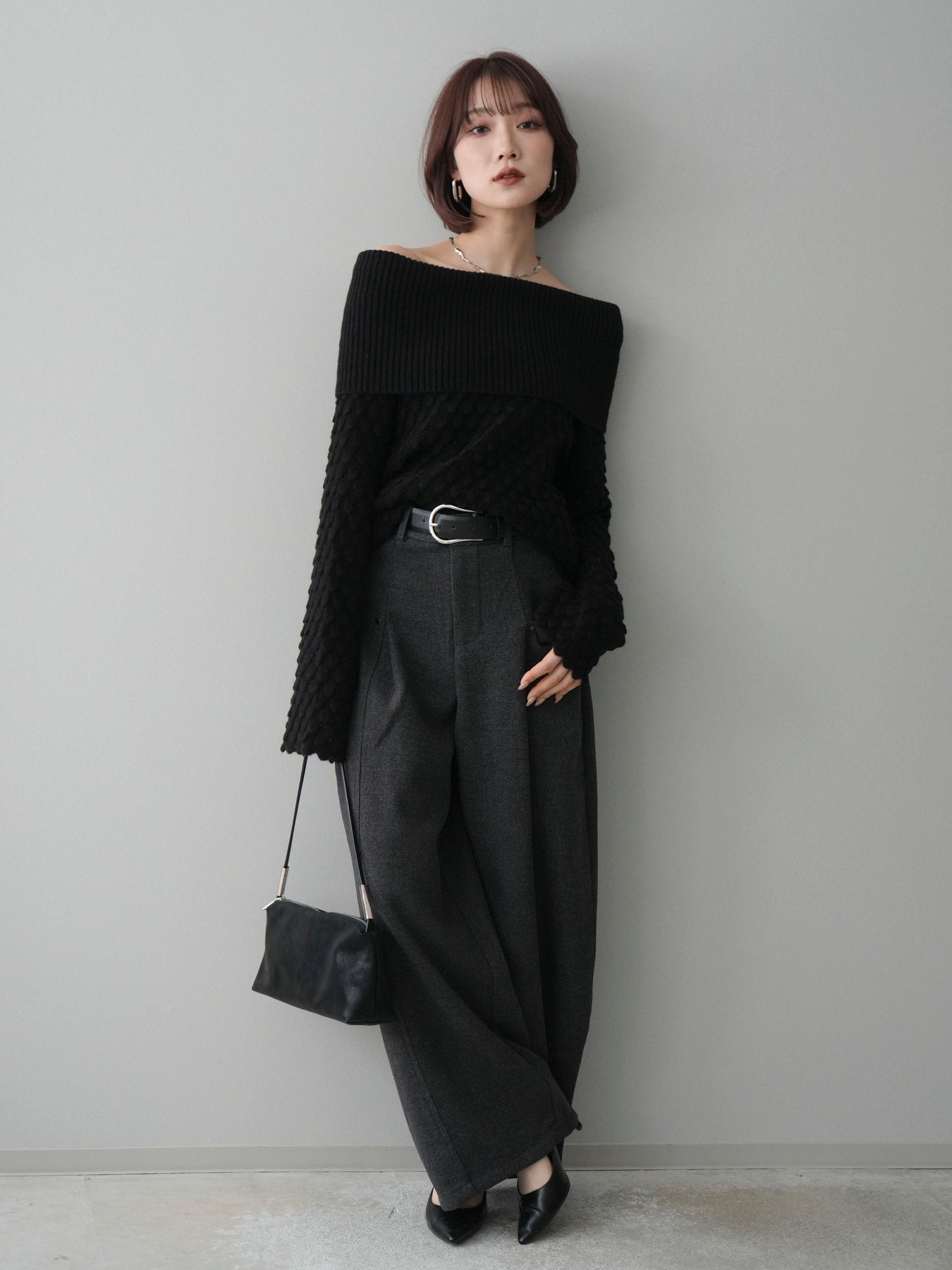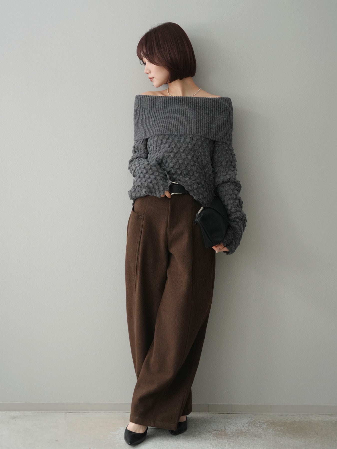 [SET]ポコポコ編みオフショルニットプルオーバー+ベルト付起毛コクーンパンツ(2set)
