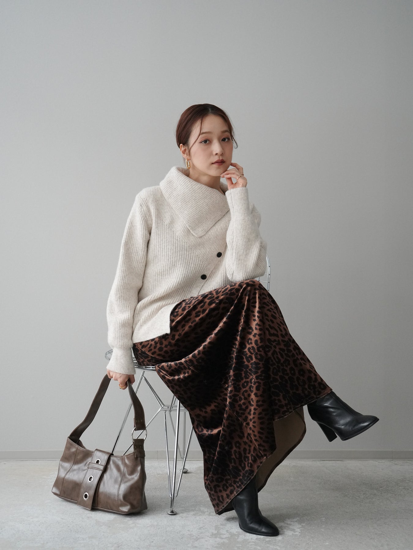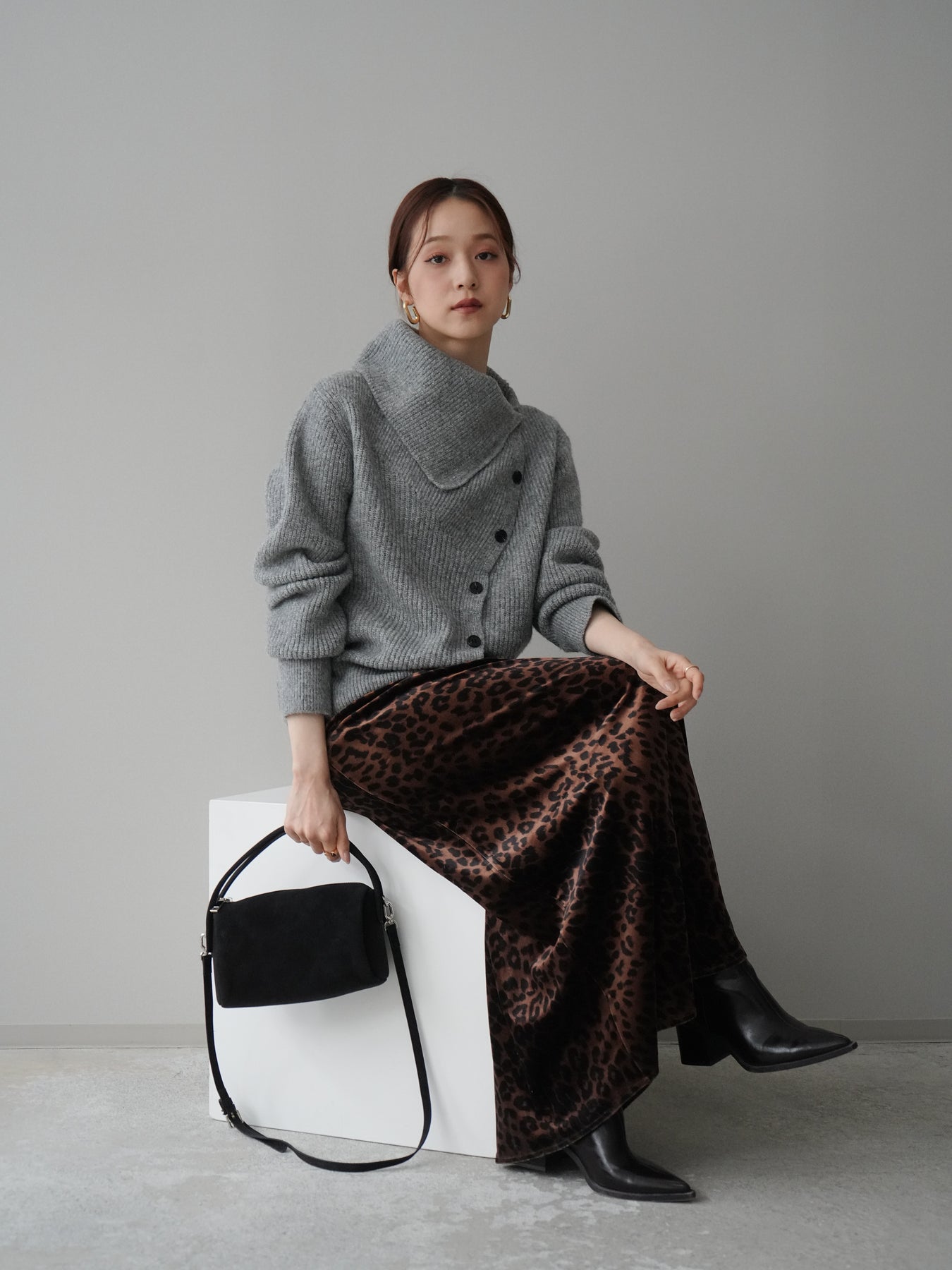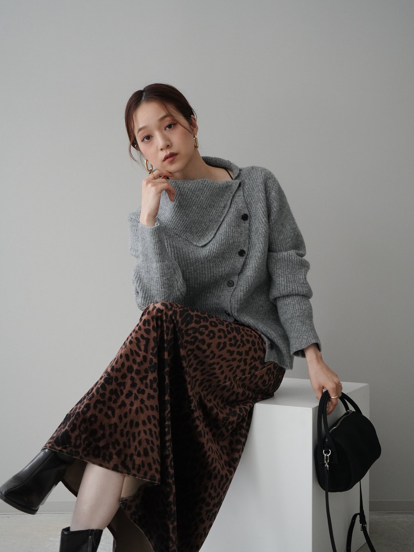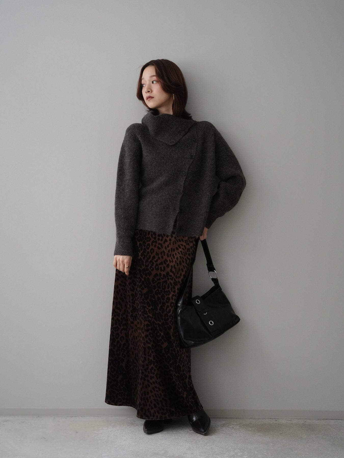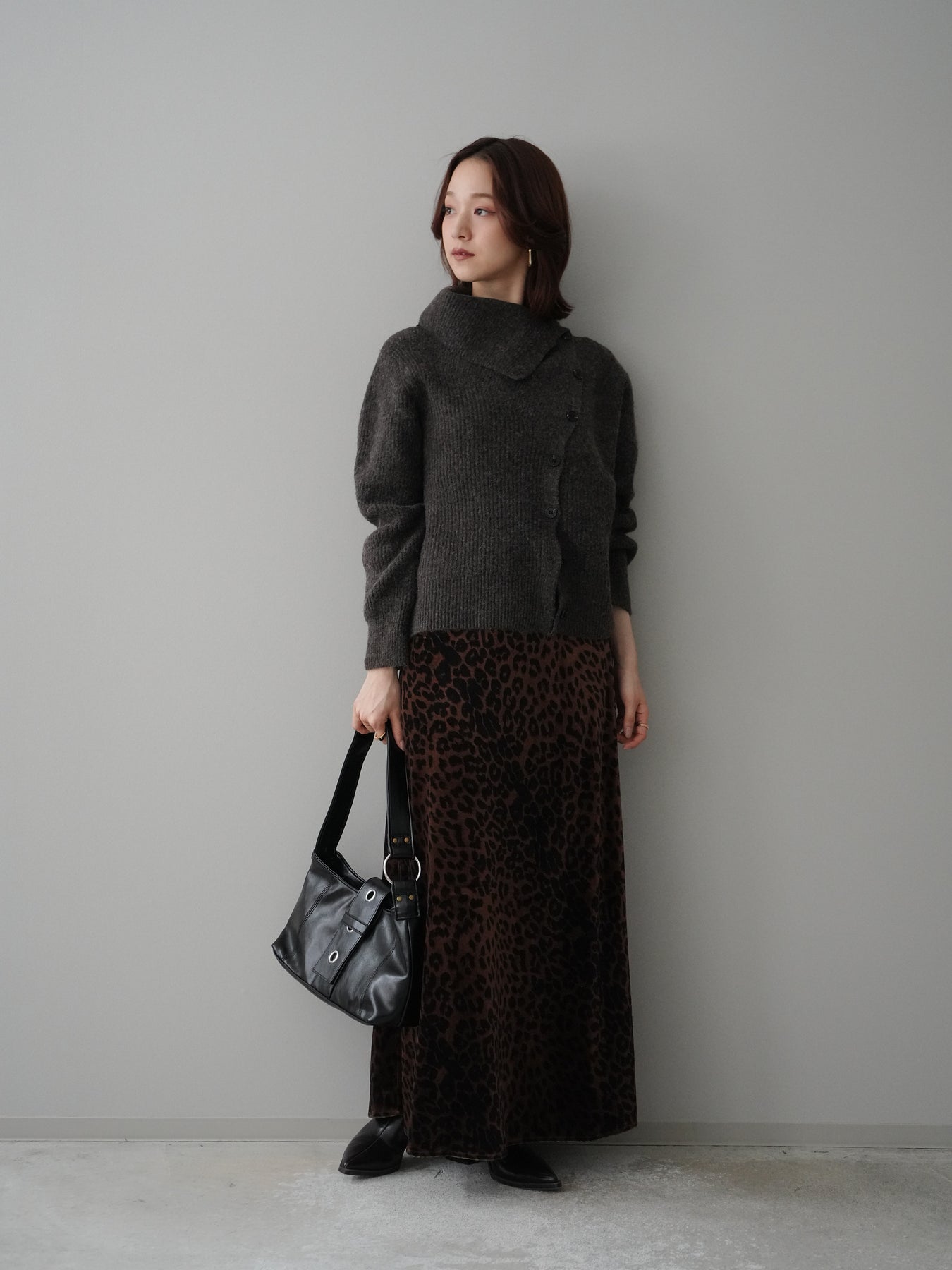[SET]ハイネックデザインボタンニットカーディガン+レオパードベロアナロースカート(2set)