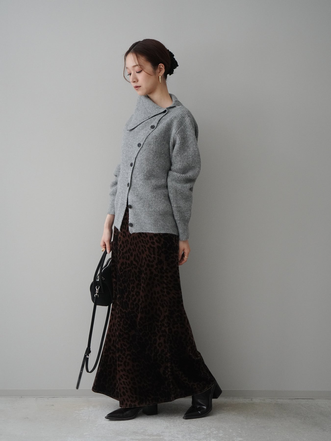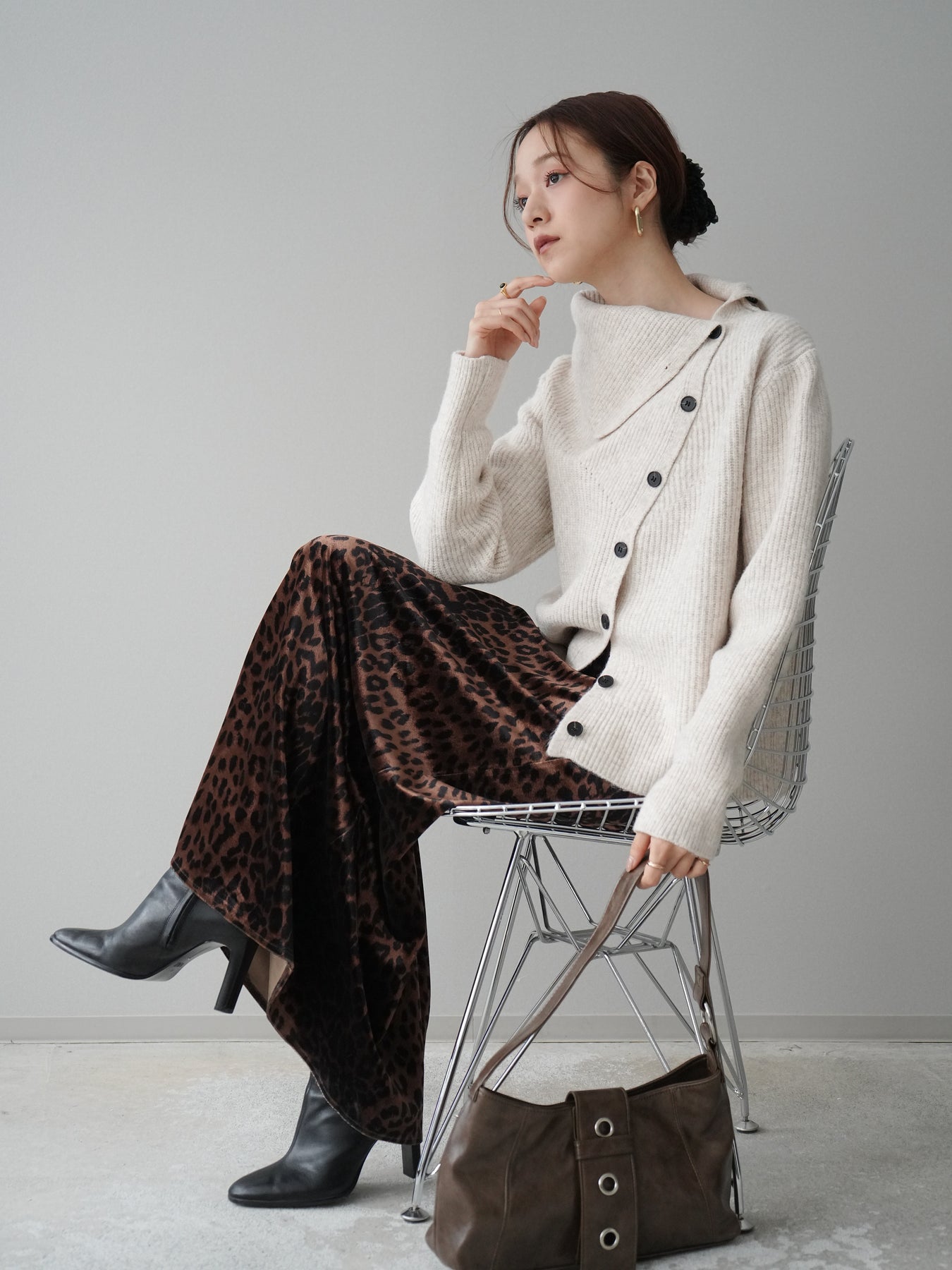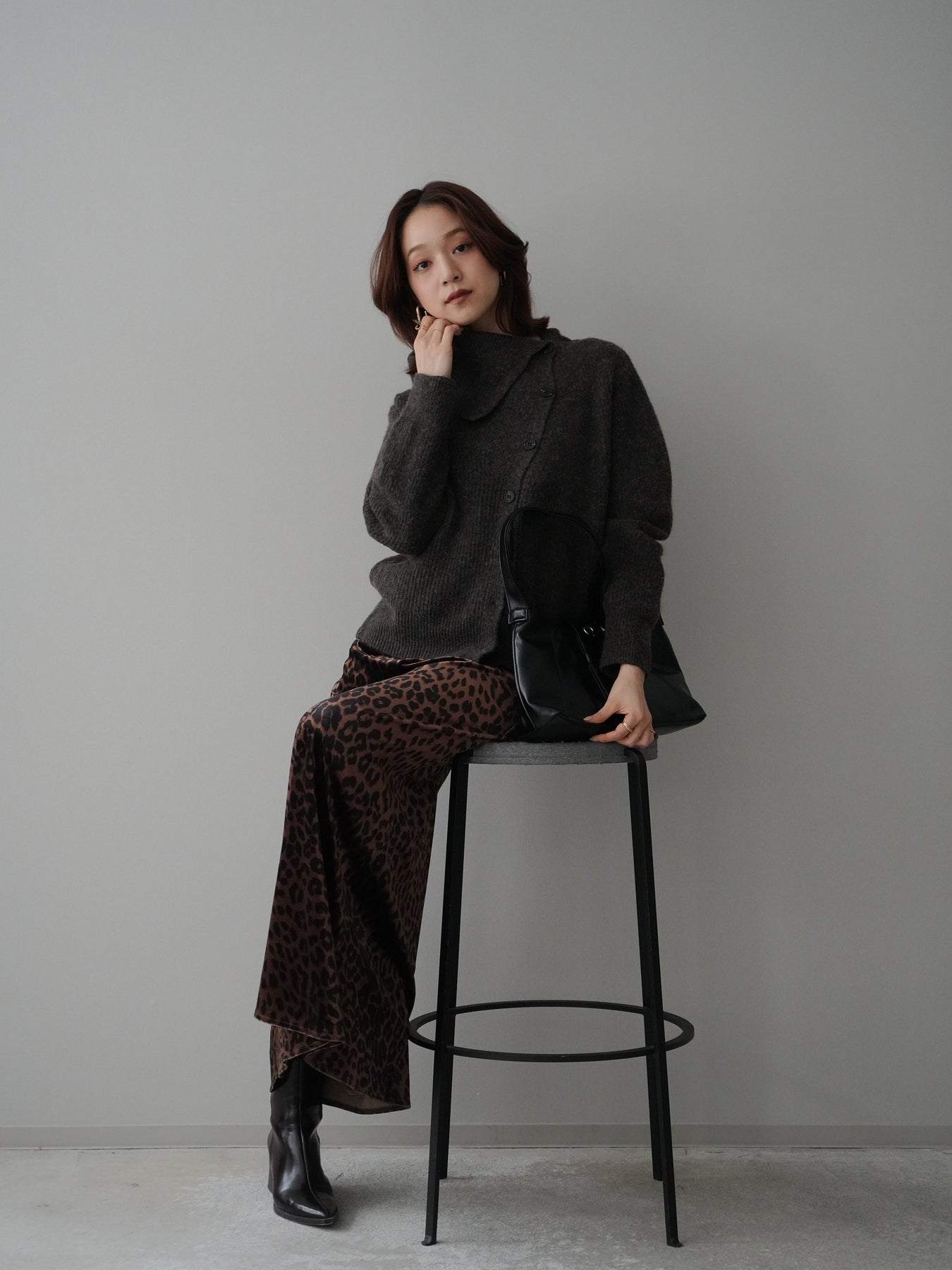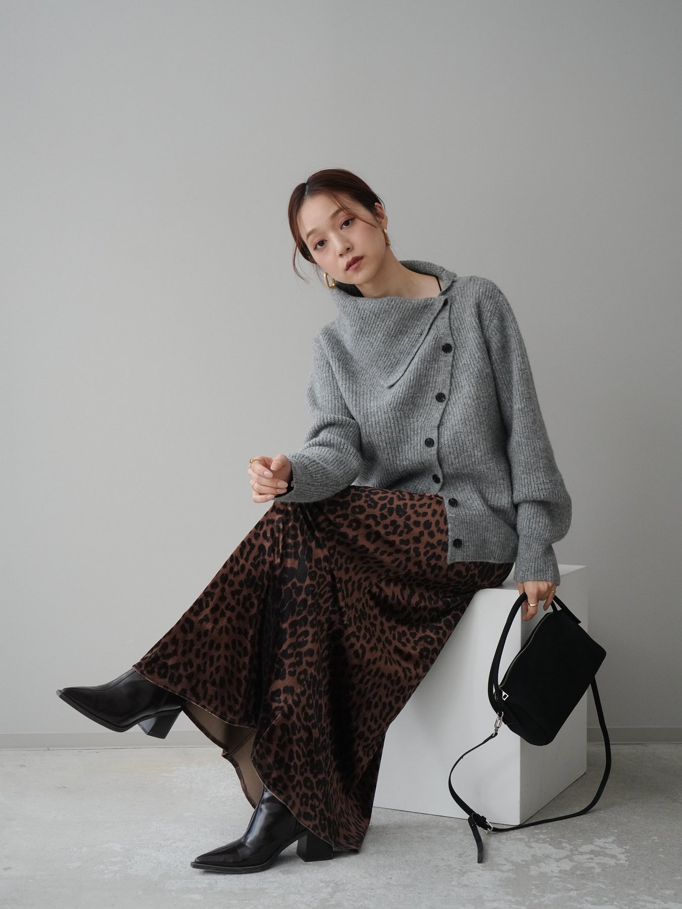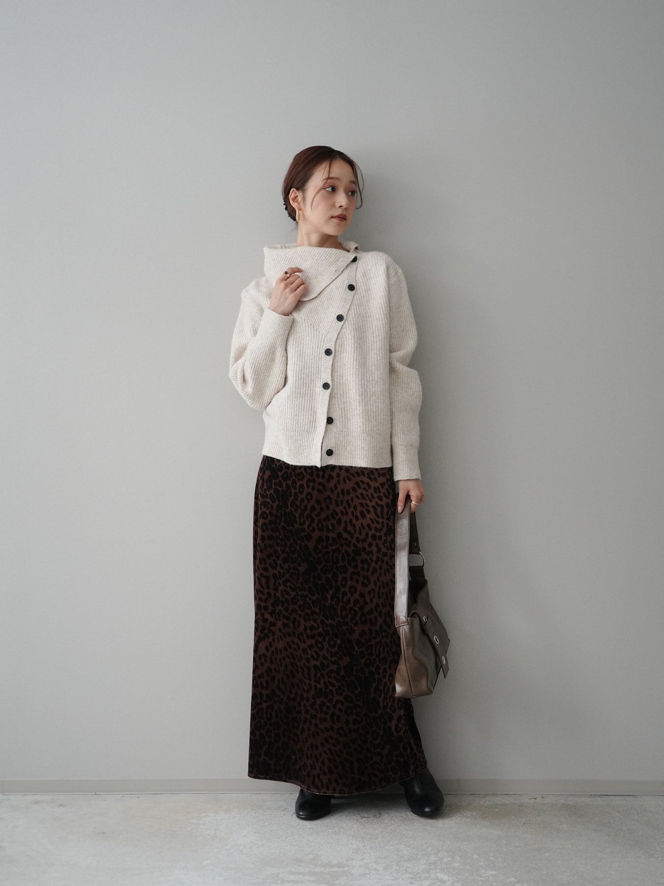 [SET]ハイネックデザインボタンニットカーディガン+レオパードベロアナロースカート(2set)