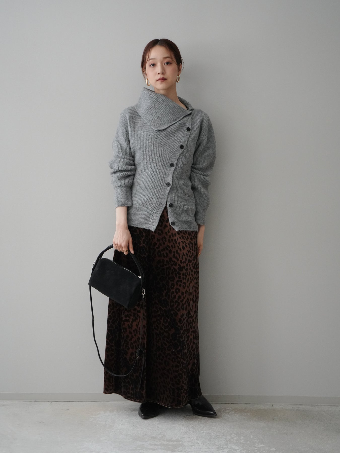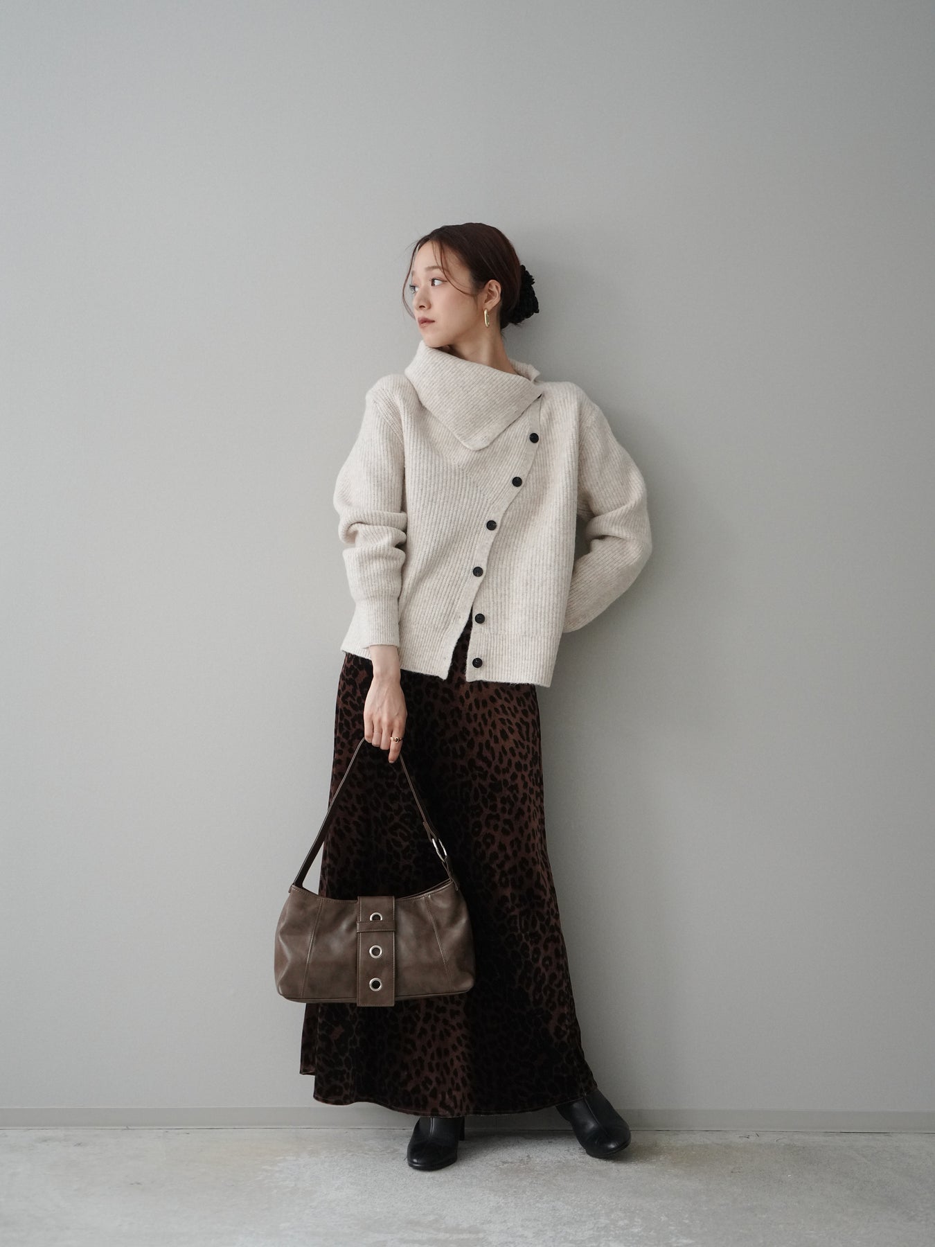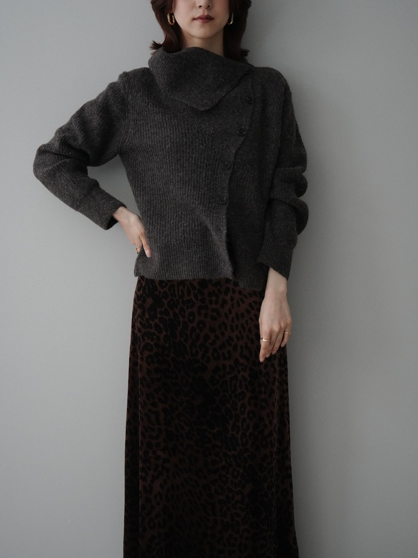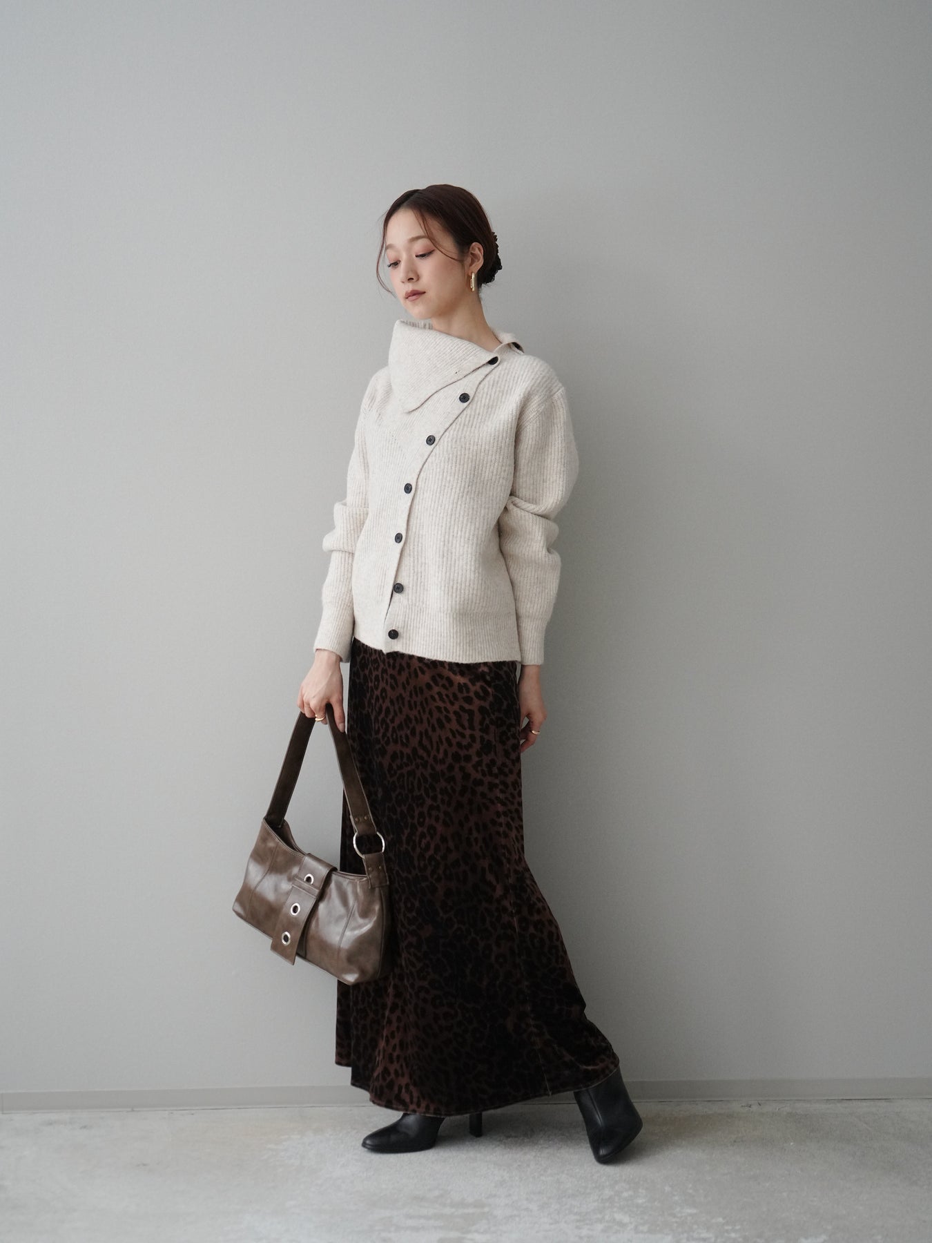 [SET]ハイネックデザインボタンニットカーディガン+レオパードベロアナロースカート(2set)