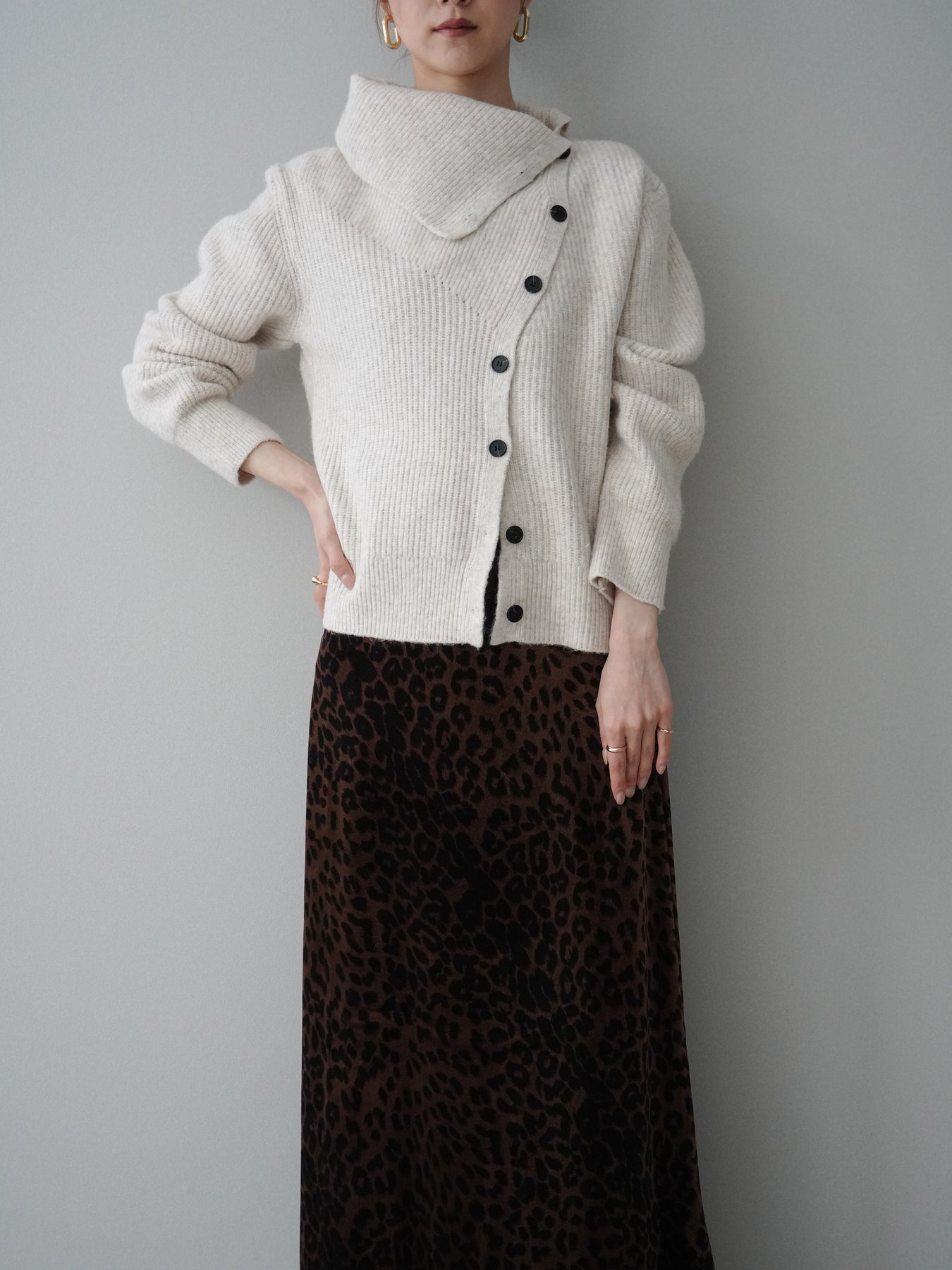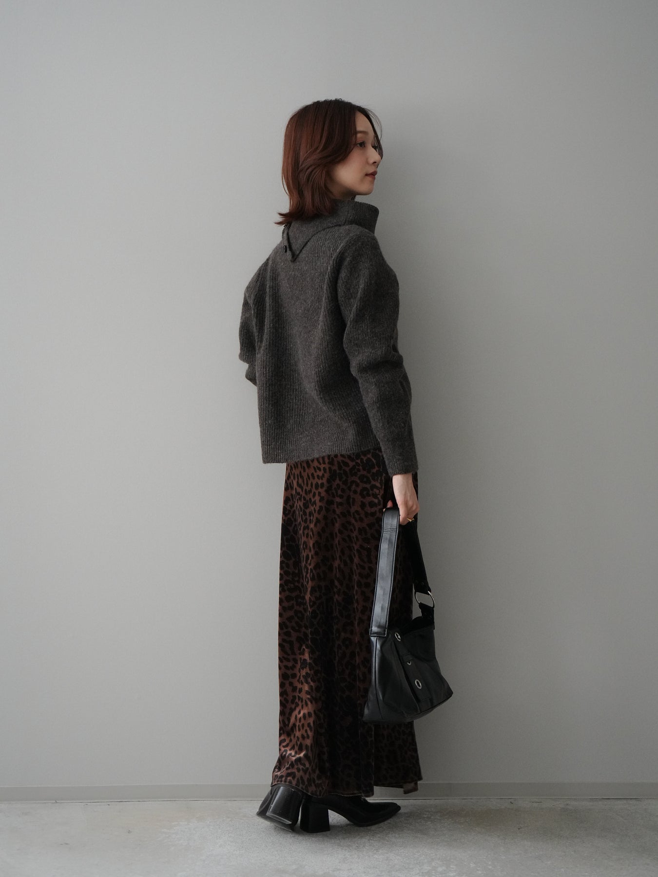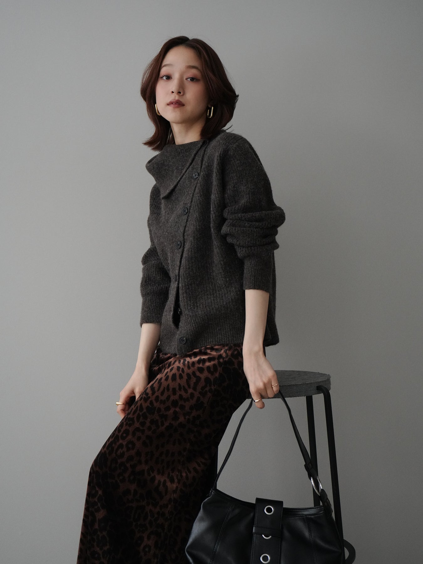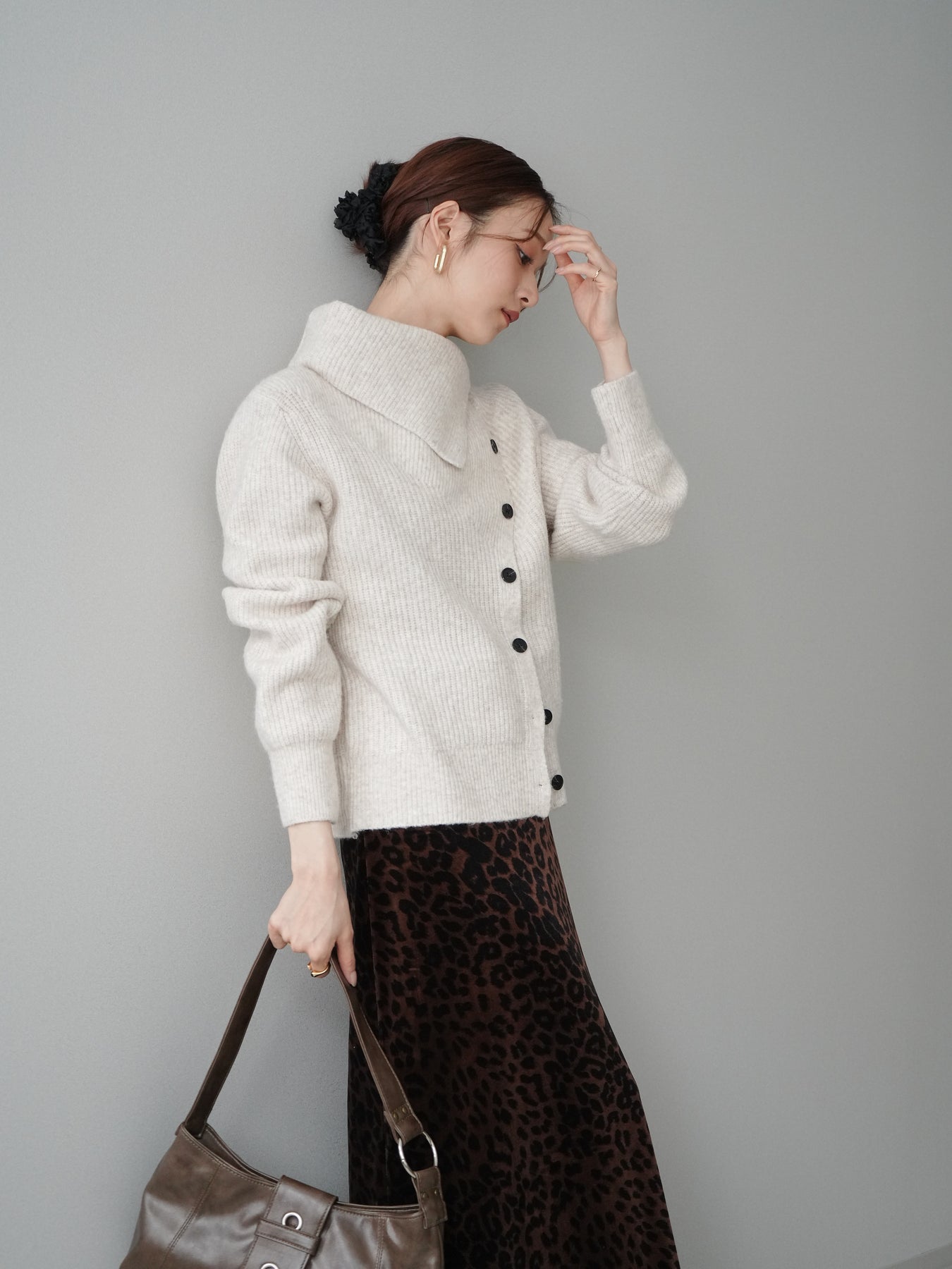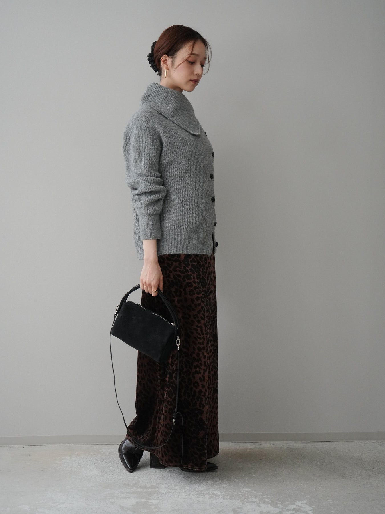 [SET]ハイネックデザインボタンニットカーディガン+レオパードベロアナロースカート(2set)