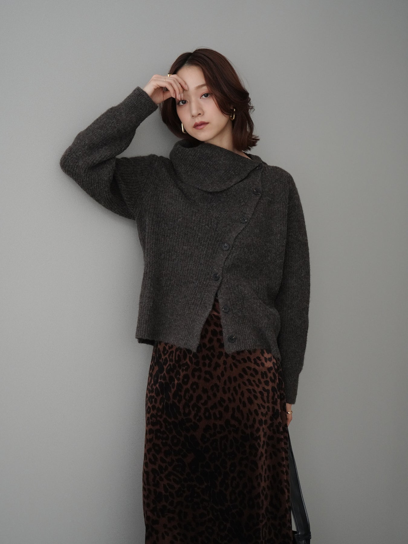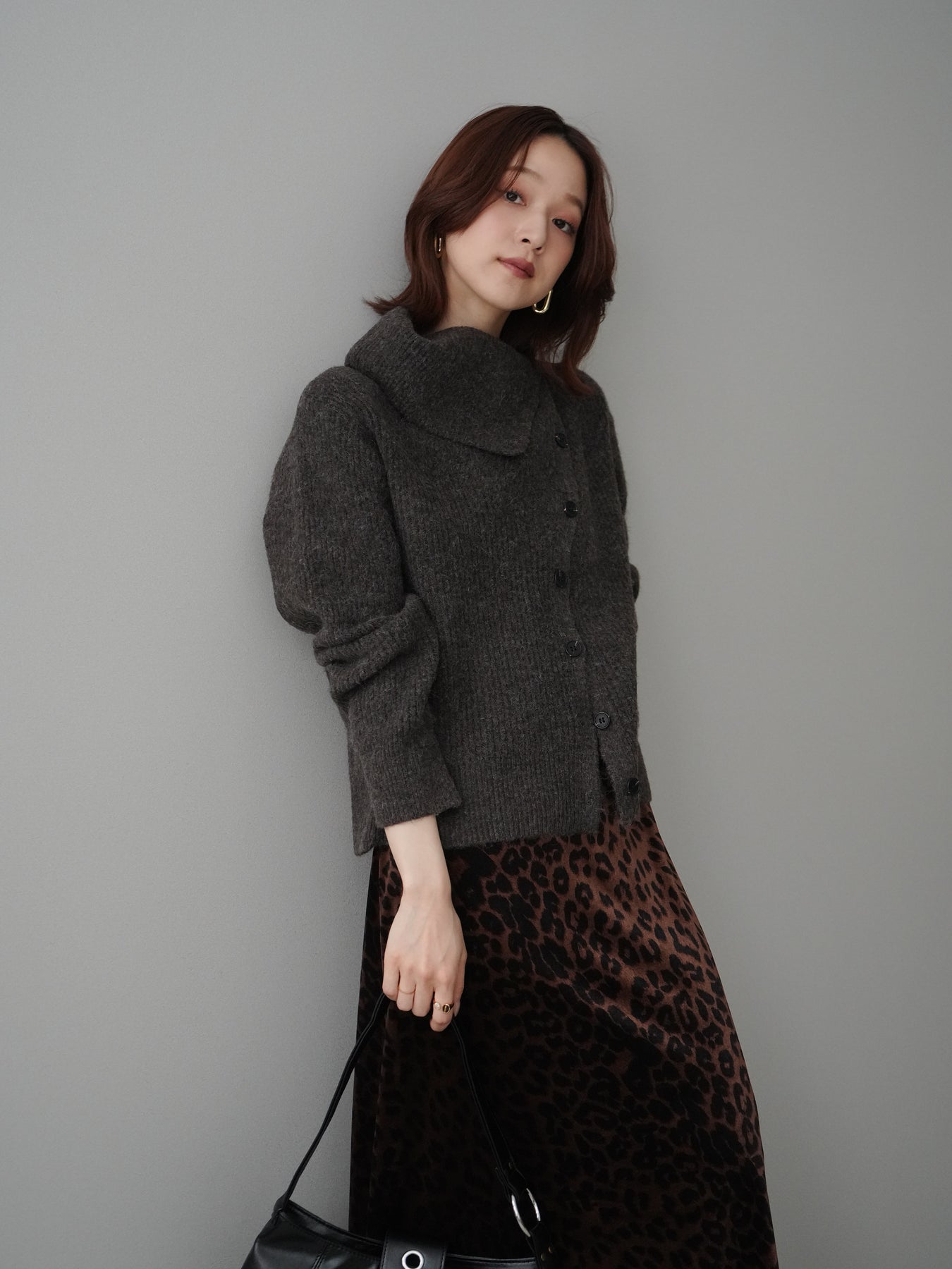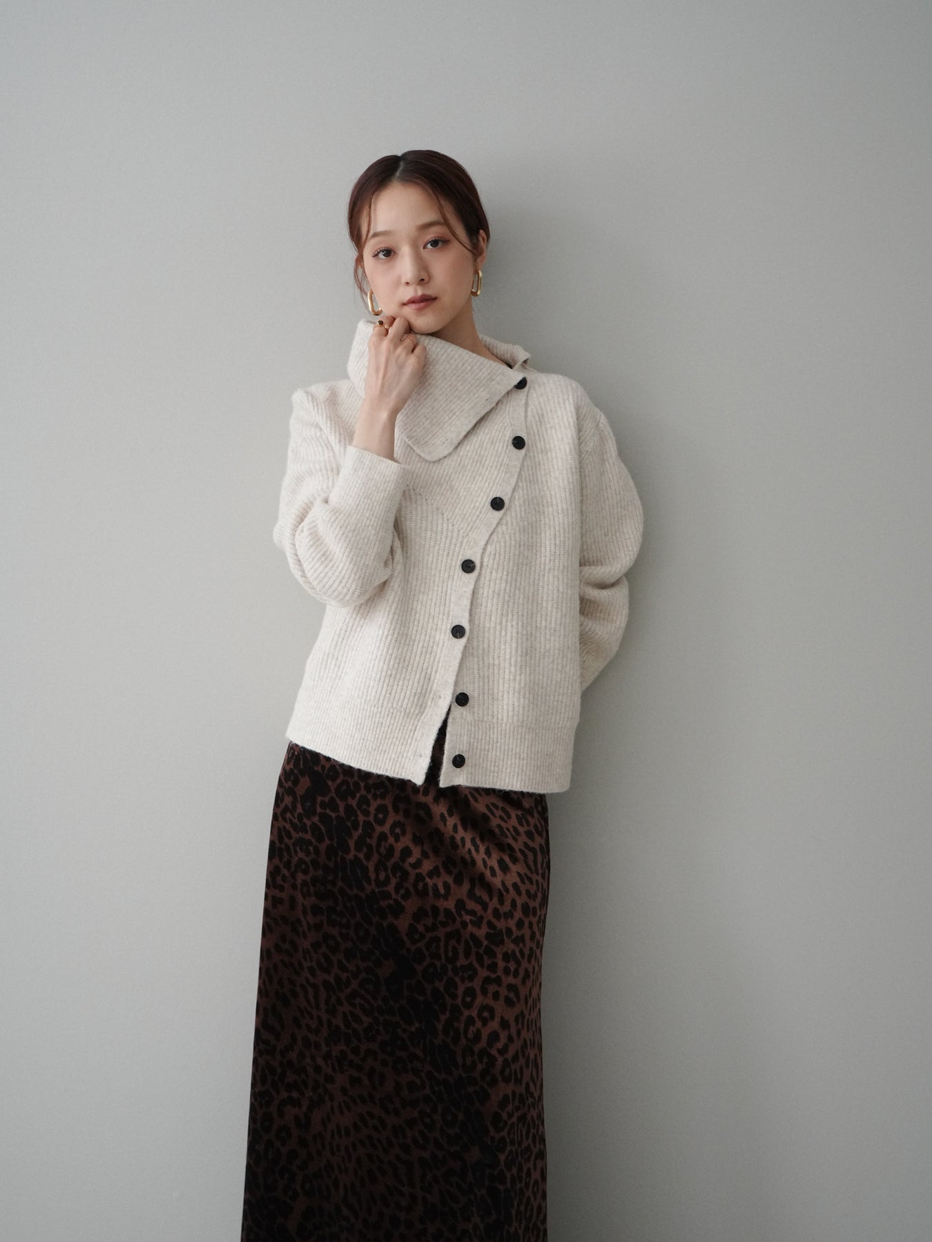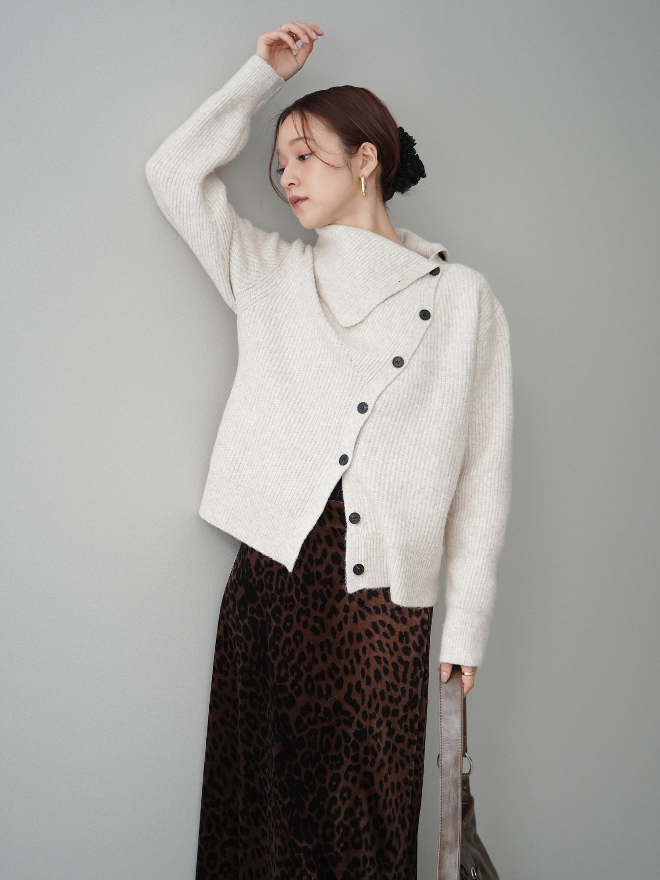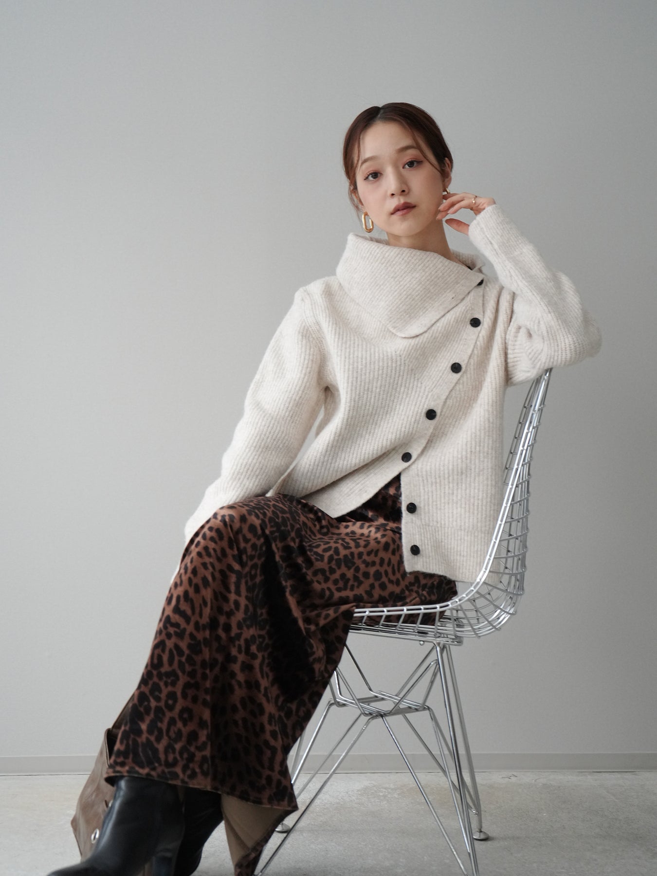 [SET]ハイネックデザインボタンニットカーディガン+レオパードベロアナロースカート(2set)