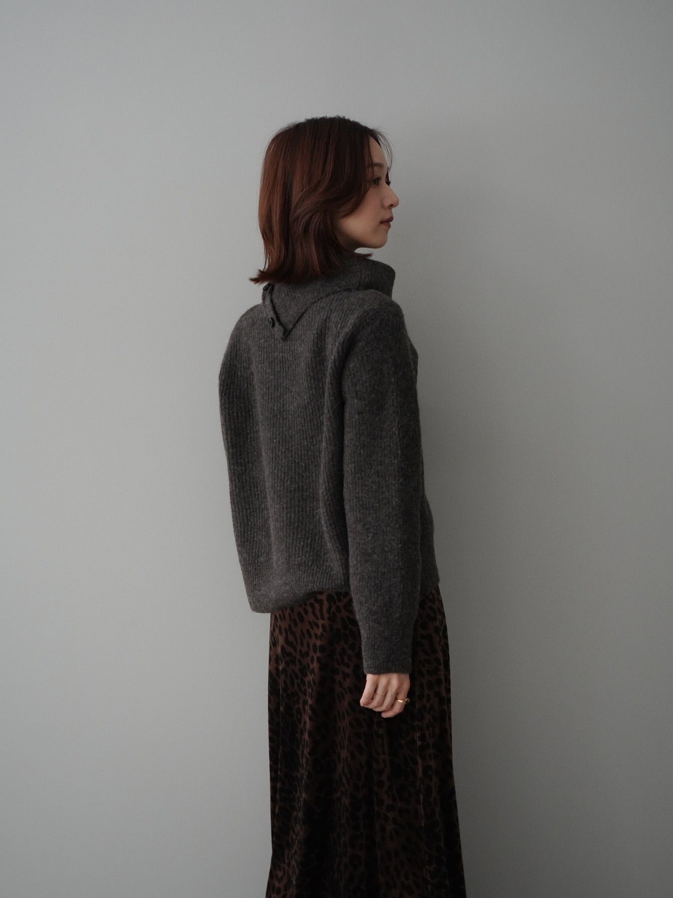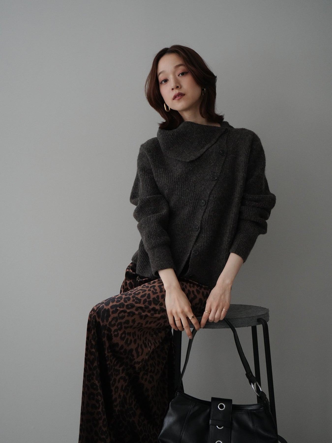 ハイネックデザインとフロントのボタンディテールが印象的なニットカーディガン。程よくゆとりのあるシルエットで、羽織としてもトップスとしても着用でき、着こなしの幅が広がります。シンプルながらも存在感があり、コーディネートの主役になる一着です。