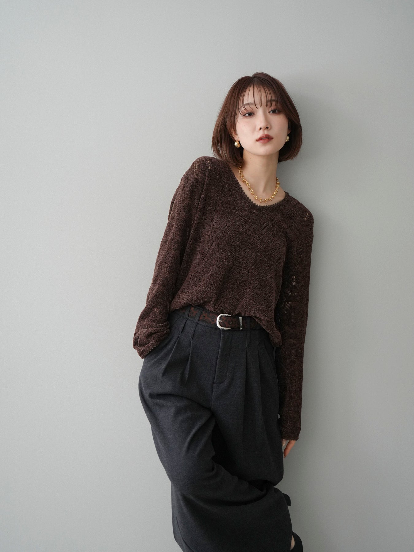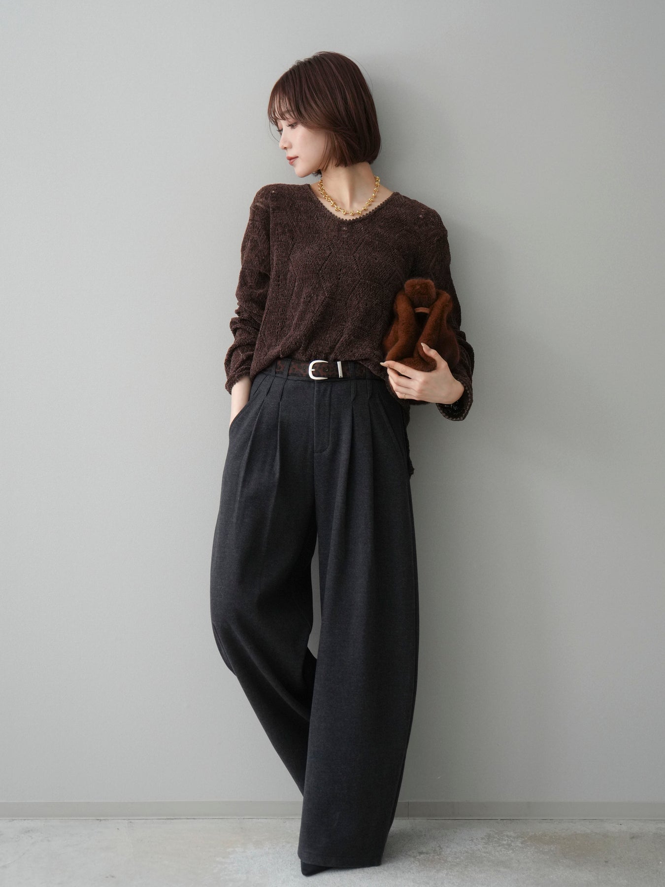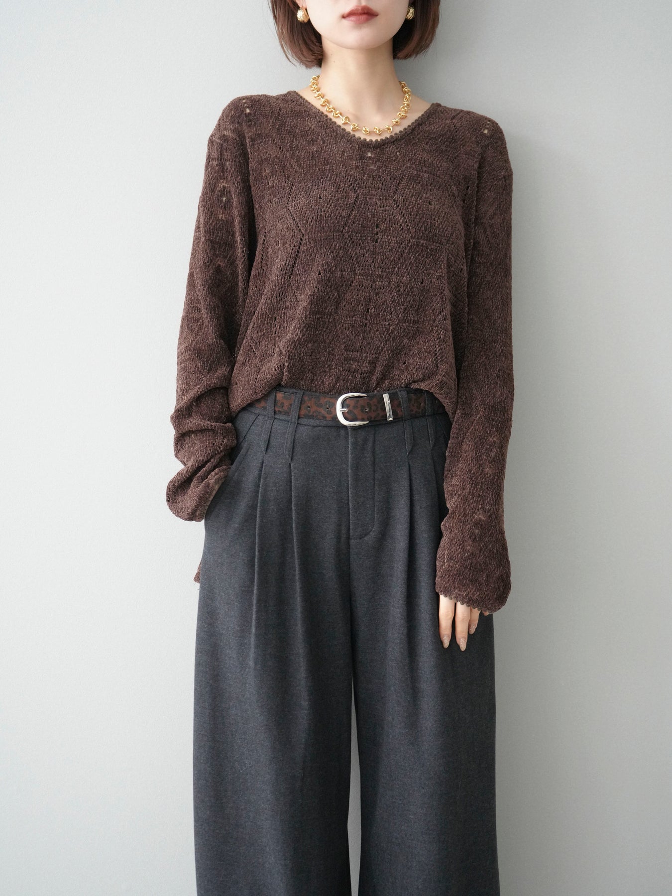 [SET]モール透かし編みニットトップス+アニマル柄ベルト付きウールタッチワイドパンツ(2set)