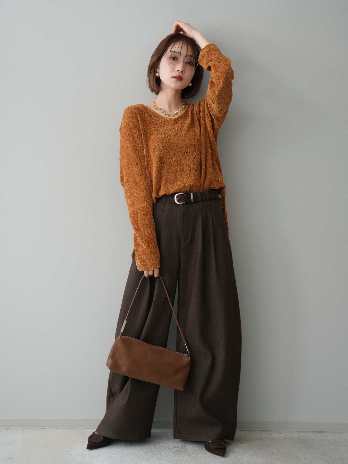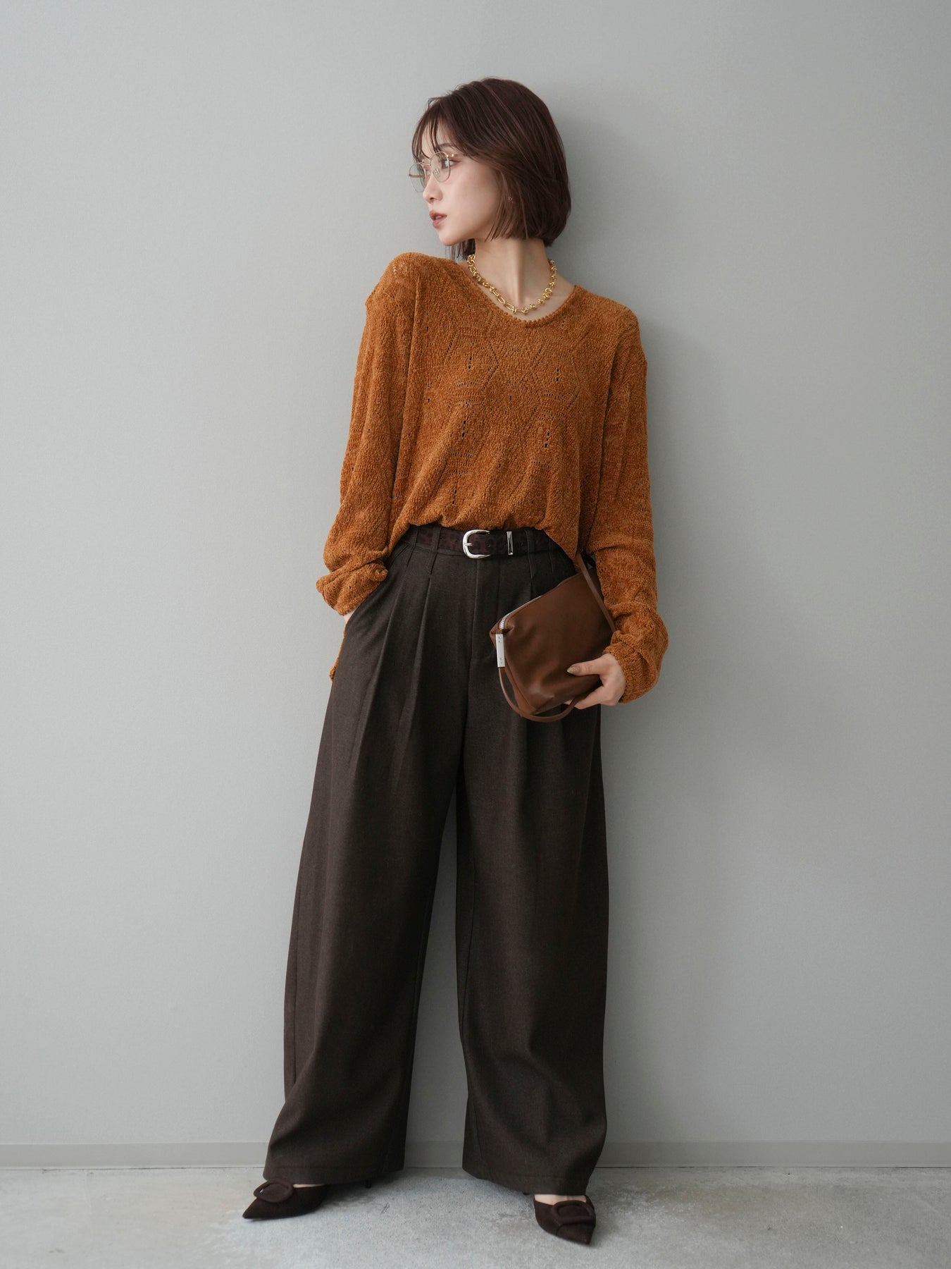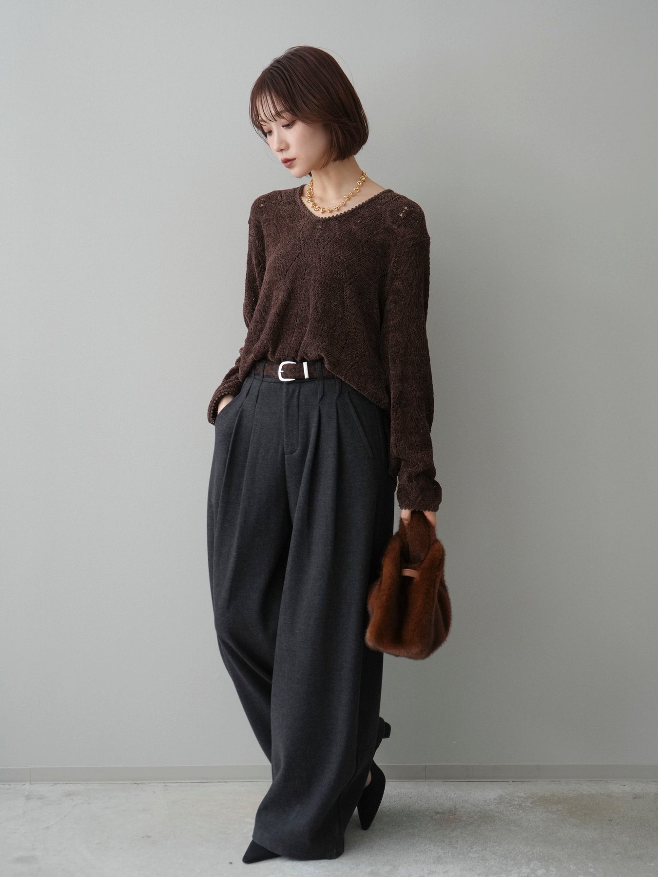 [SET]モール透かし編みニットトップス+アニマル柄ベルト付きウールタッチワイドパンツ(2set)