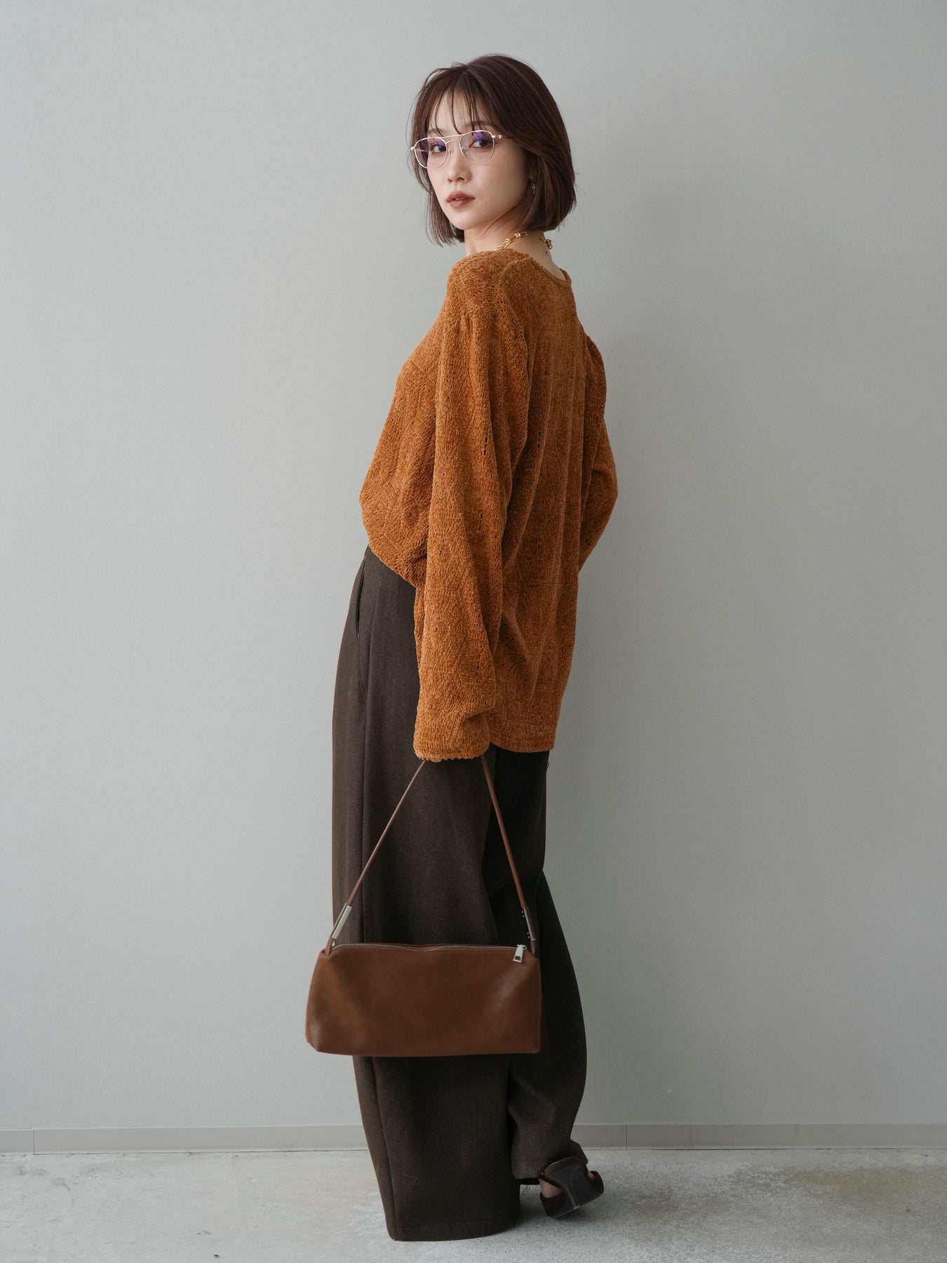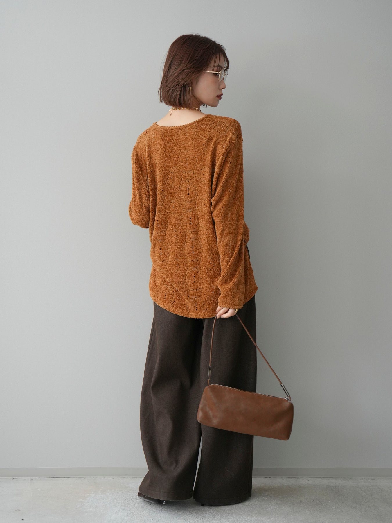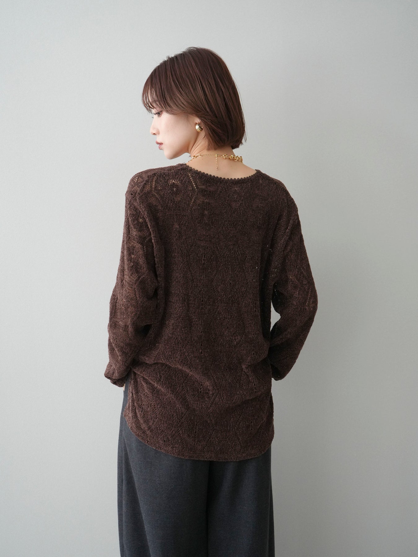 モール糸を使用した透かし編みデザインが印象的なニットトップス。程よい透け感と柔らかな風合いで、軽やかさのある着こなしが楽しめます。一枚ではもちろん、レイヤードスタイルにも取り入れやすく、季節感のあるコーディネートが完成する一着です。