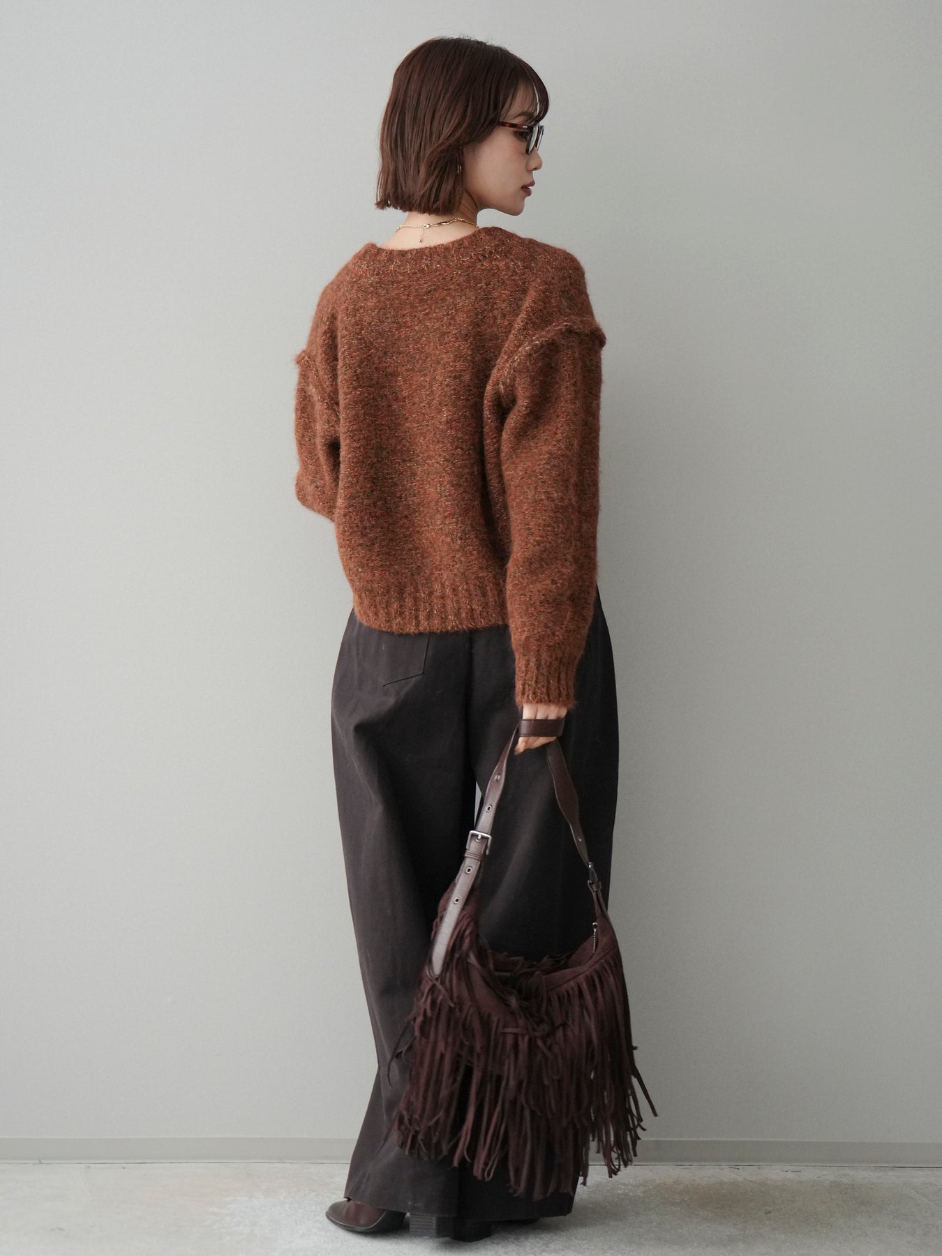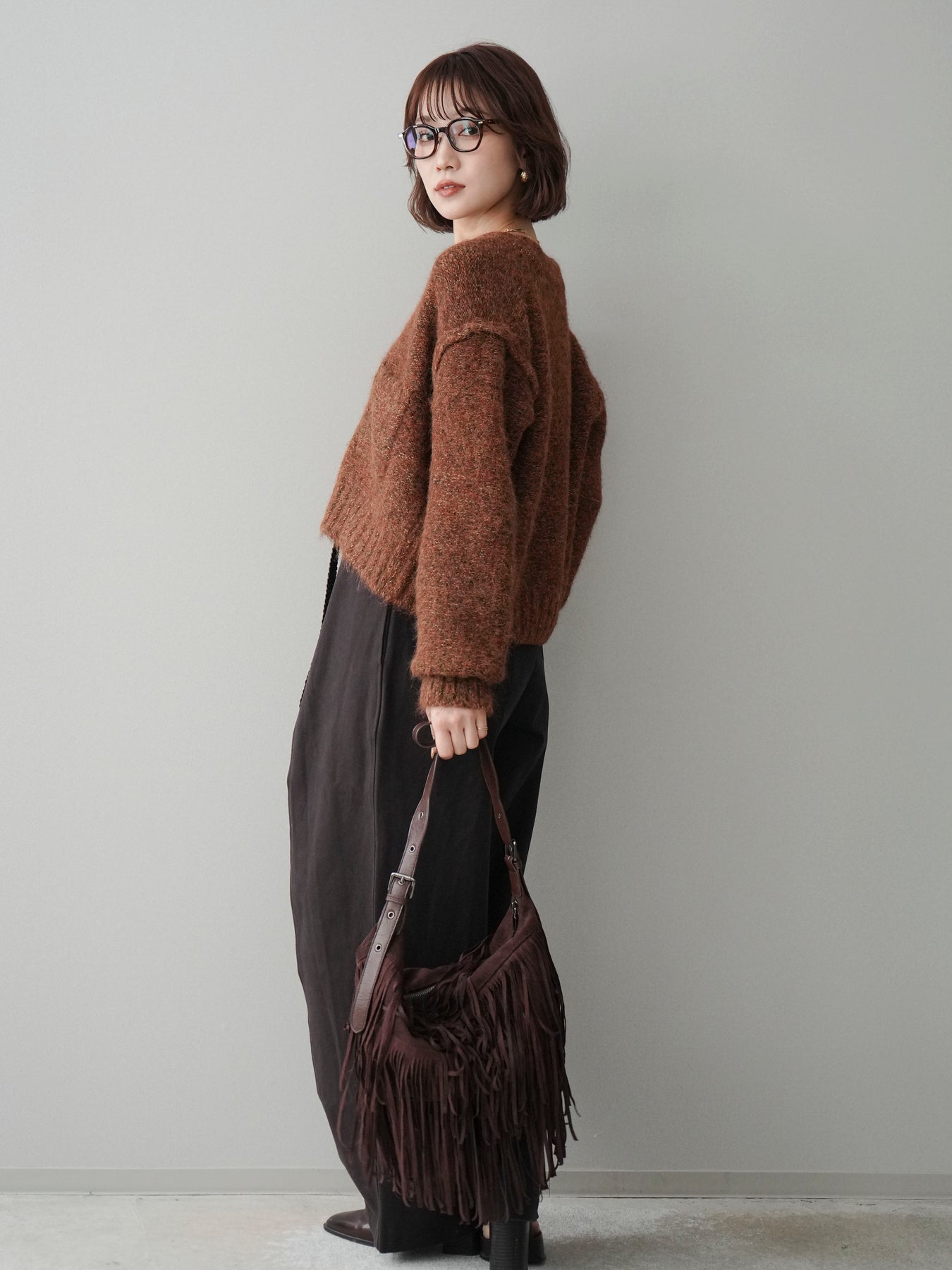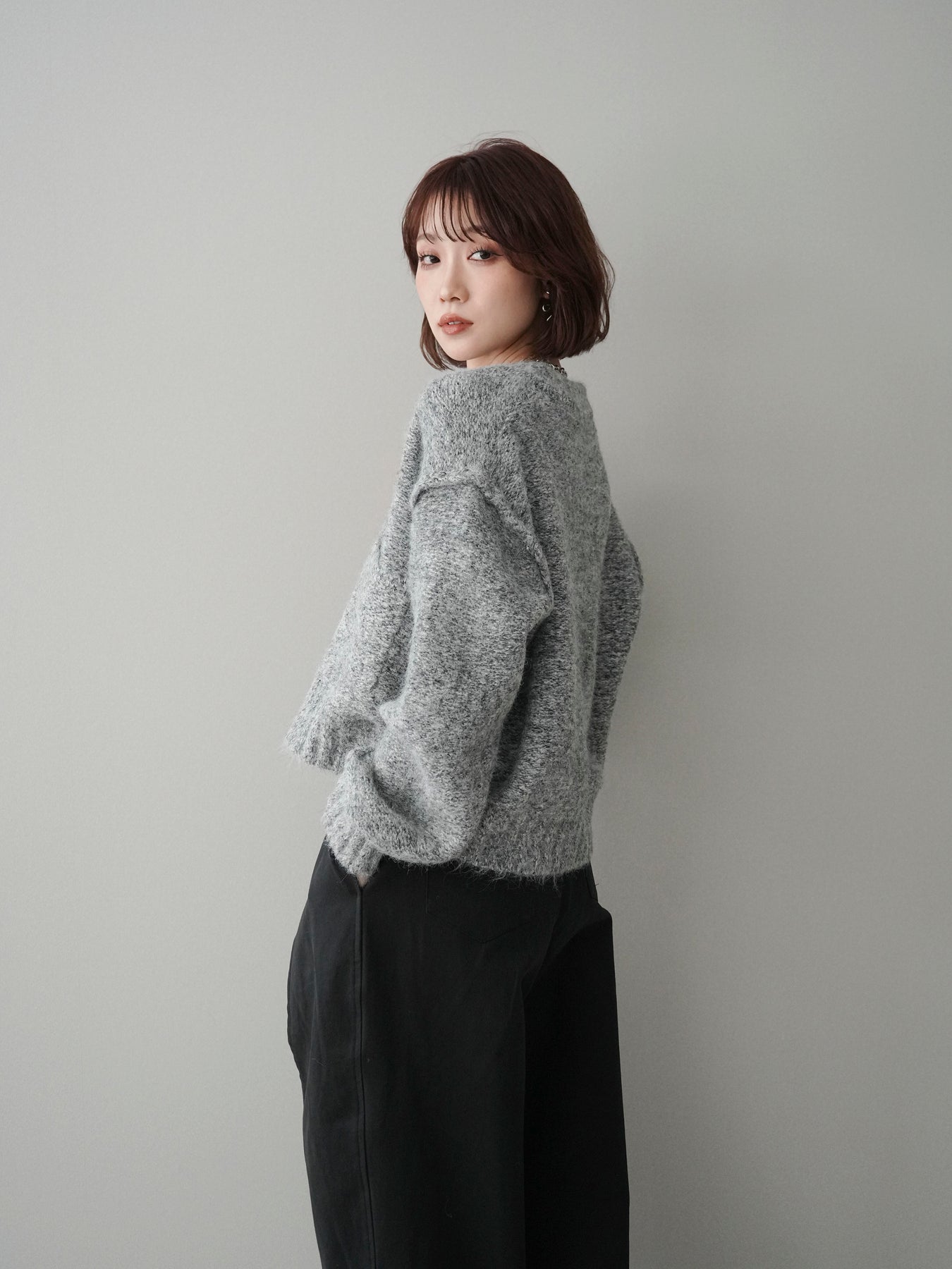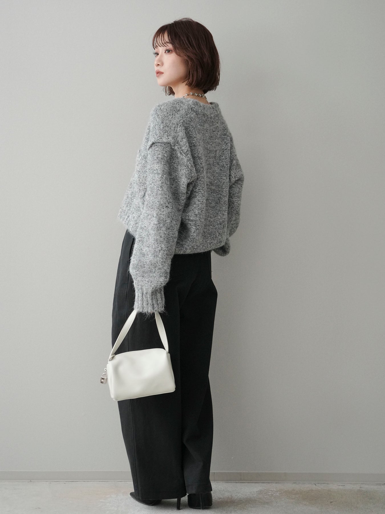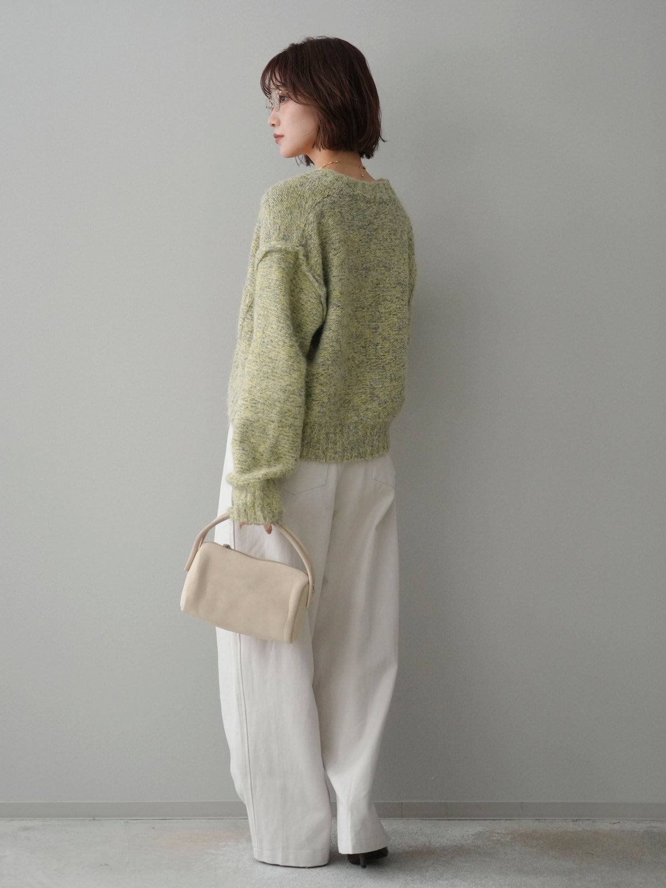 ・お手入れ方法:水温30℃以下手洗い優しく押し洗いでのお洗濯をお薦めします。素材の特性上、洗濯の際に毛抜け・色落ち・縮みが生じる恐れがありますので単独で・短時間でのお洗濯をお薦めします。裏返してネットに入れ手洗いコースで洗濯、洗濯後は形を整えてから干してください。※タンブラー乾燥は控えてください。 濡れたままの状態で擦れると、色落ち色移りすることがあります。つけ置き洗いや雨や汗で濡れたまま放置は避け、速やかに処理してください。着用中の摩擦や汗、水濡れ、濃淡差があるものとの重ね着にご注意ください。 また、素材の特性上伸びやすい為ハンガーの使用はお控えいただき畳んで保管ください。