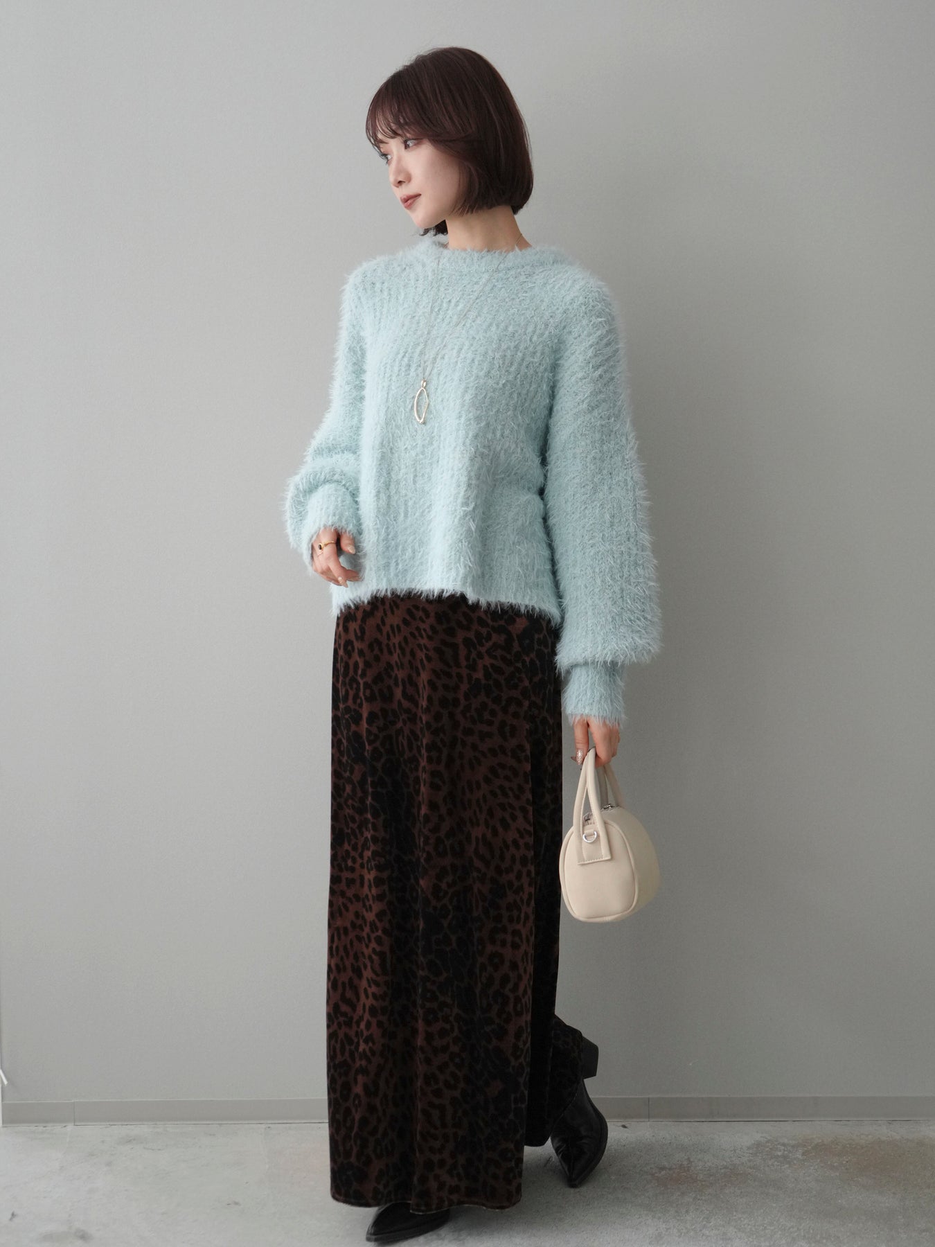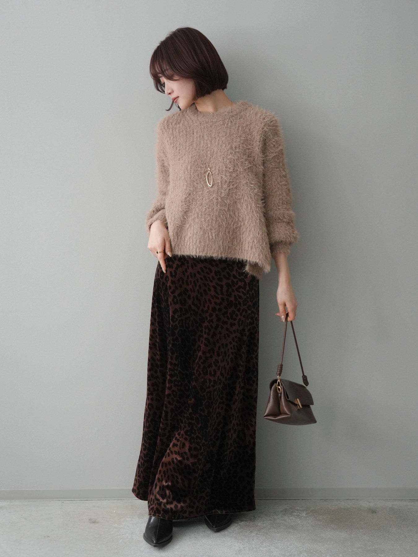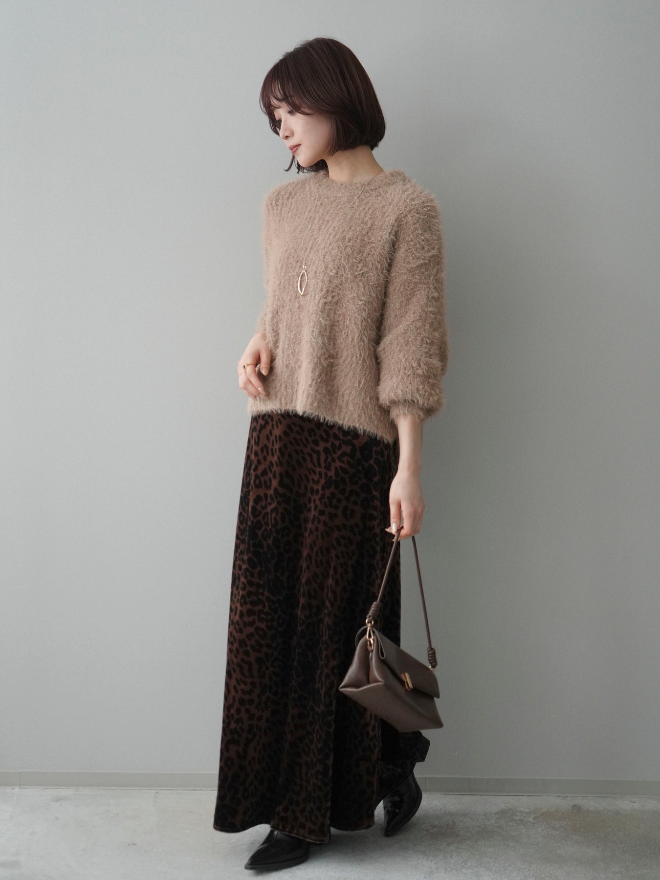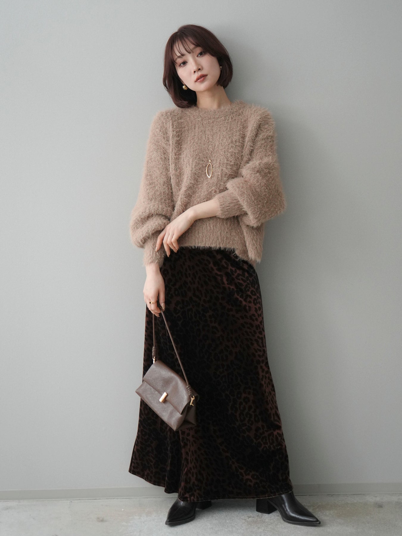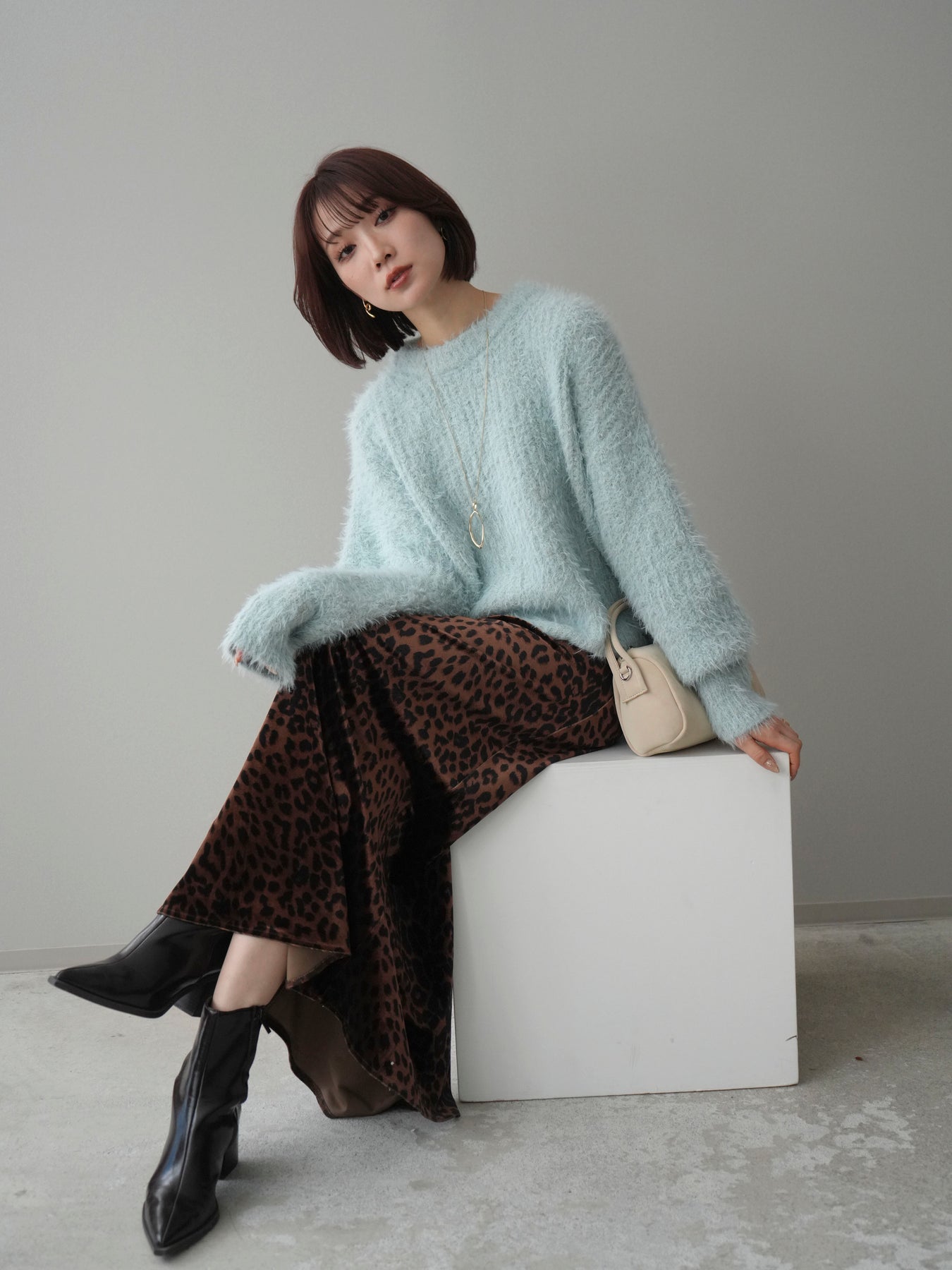 [SET]ボリュームスリーブシャギー MIXニットプルオーバー+レオパードベロアナロースカート(2set)