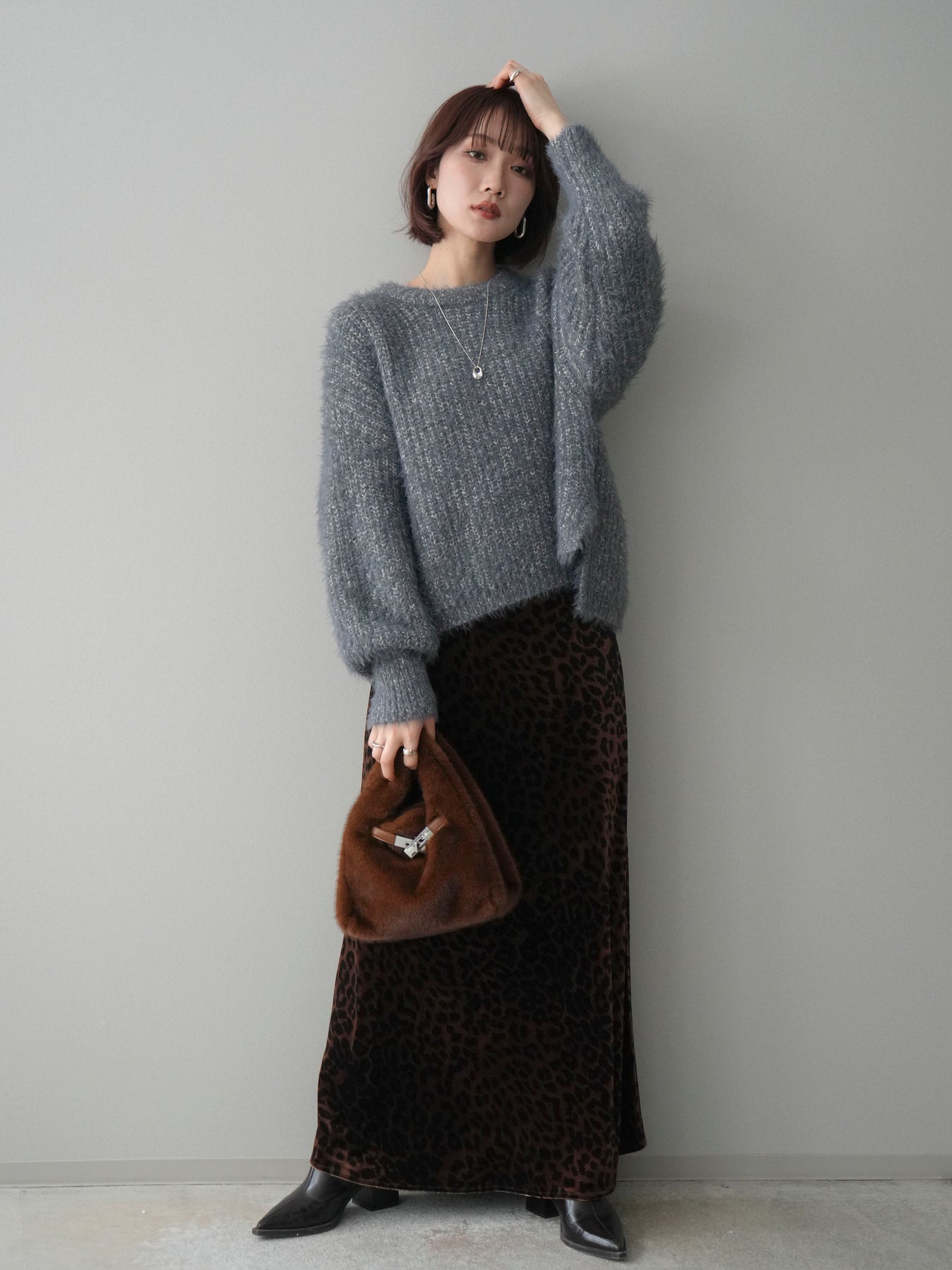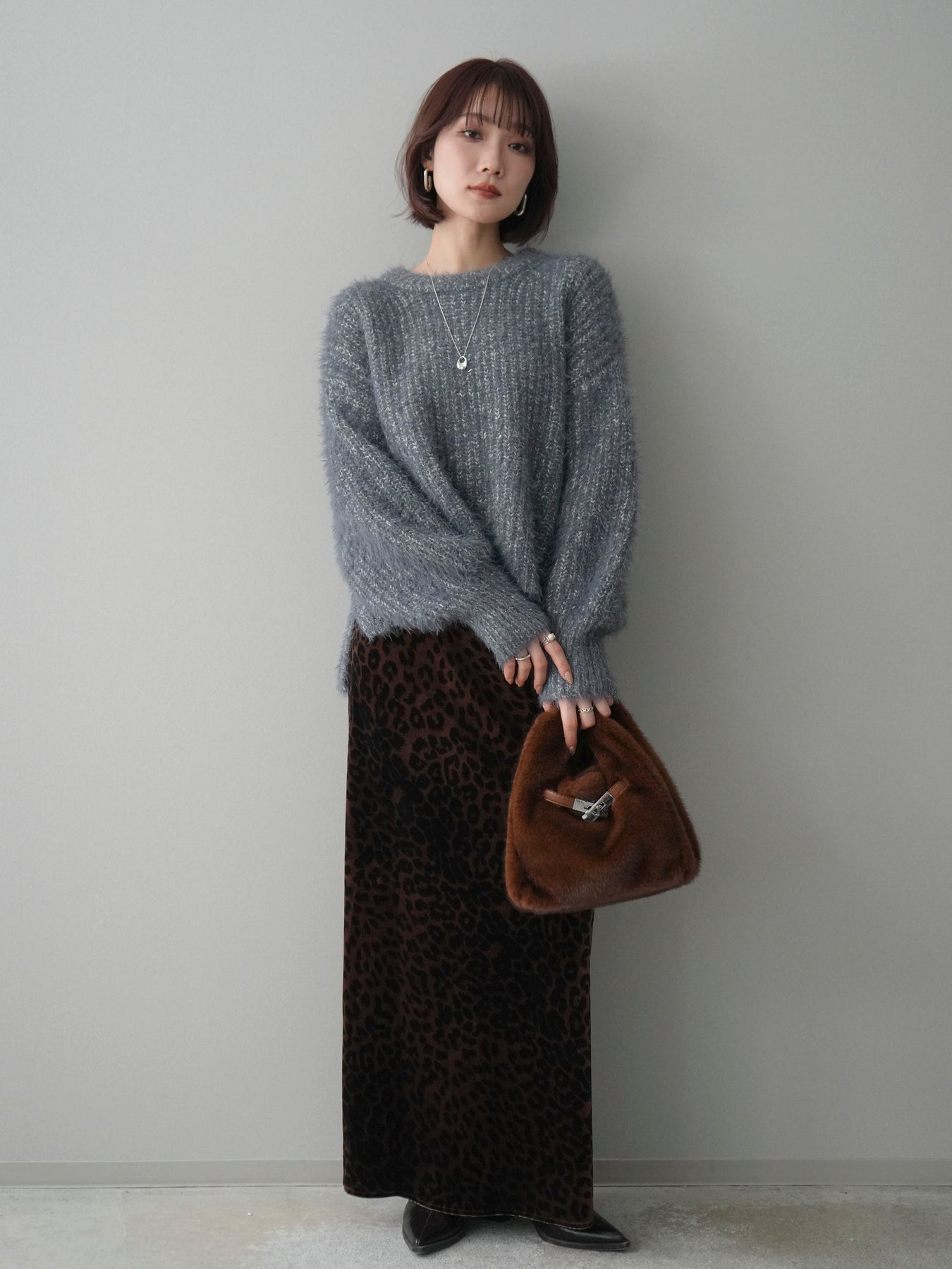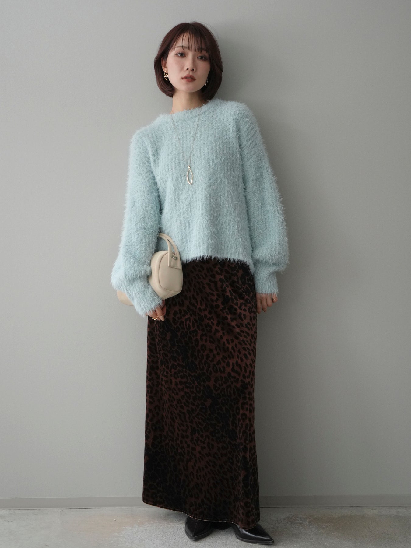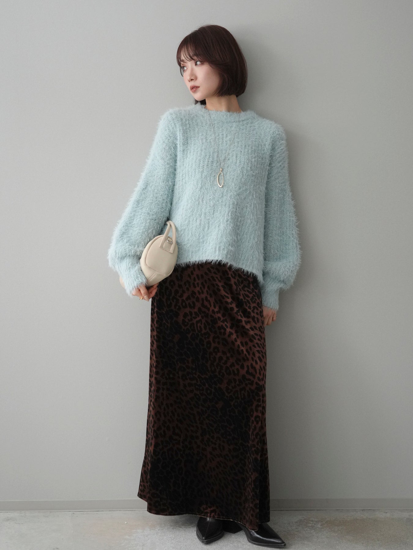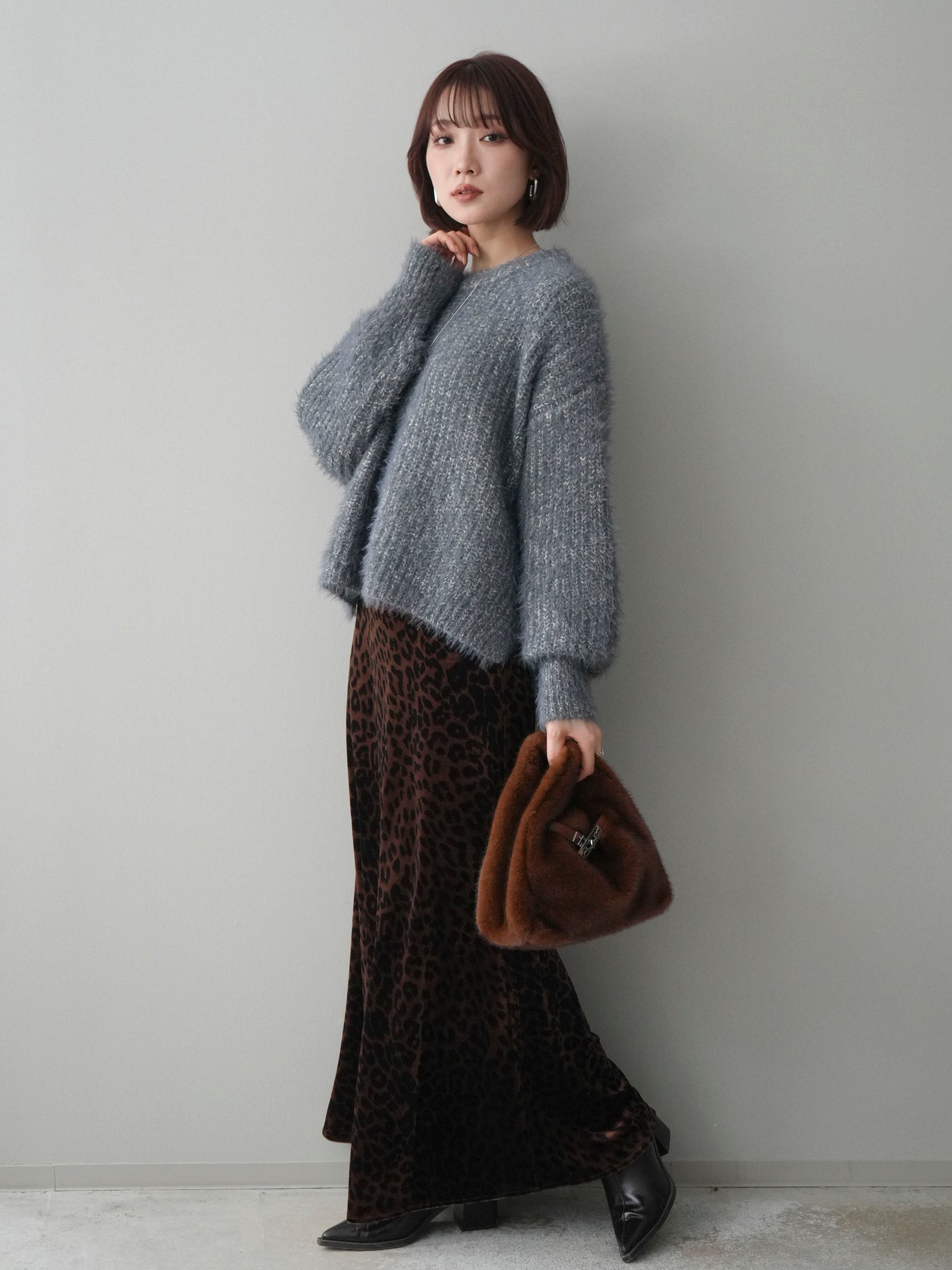 [SET]ボリュームスリーブシャギー MIXニットプルオーバー+レオパードベロアナロースカート(2set)