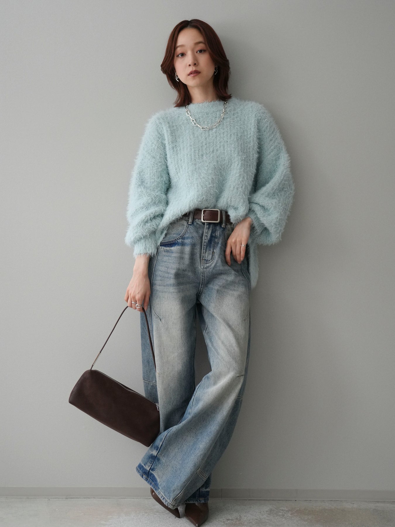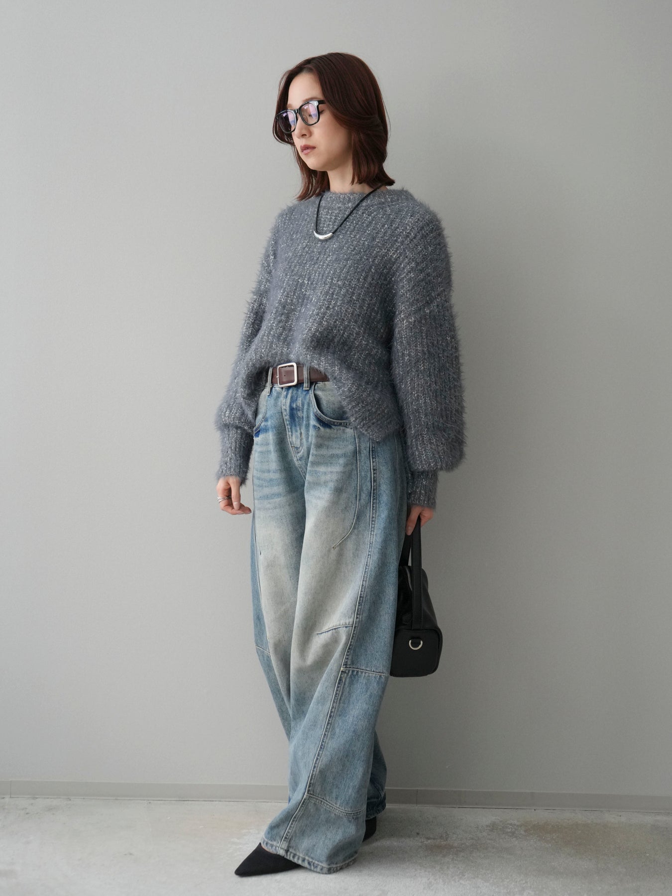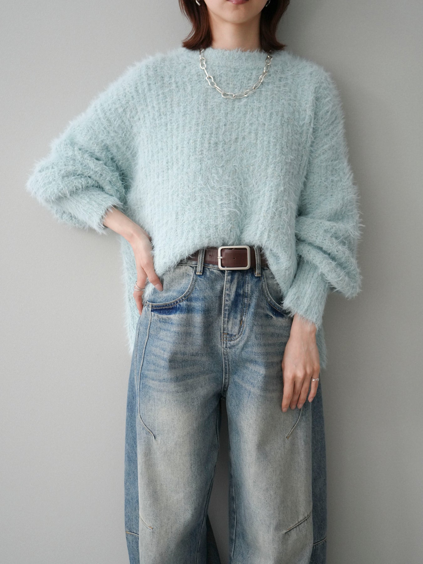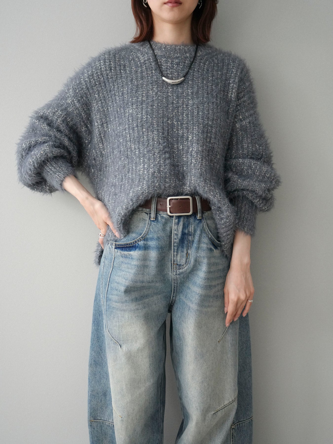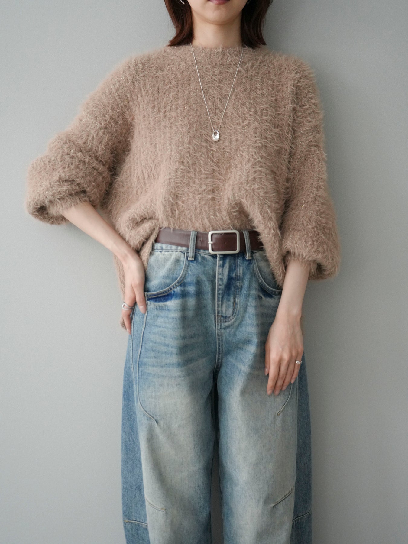 [SET]ボリュームスリーブシャギー MIXニットプルオーバー+ベルト付カーブデニムパンツ(2set)