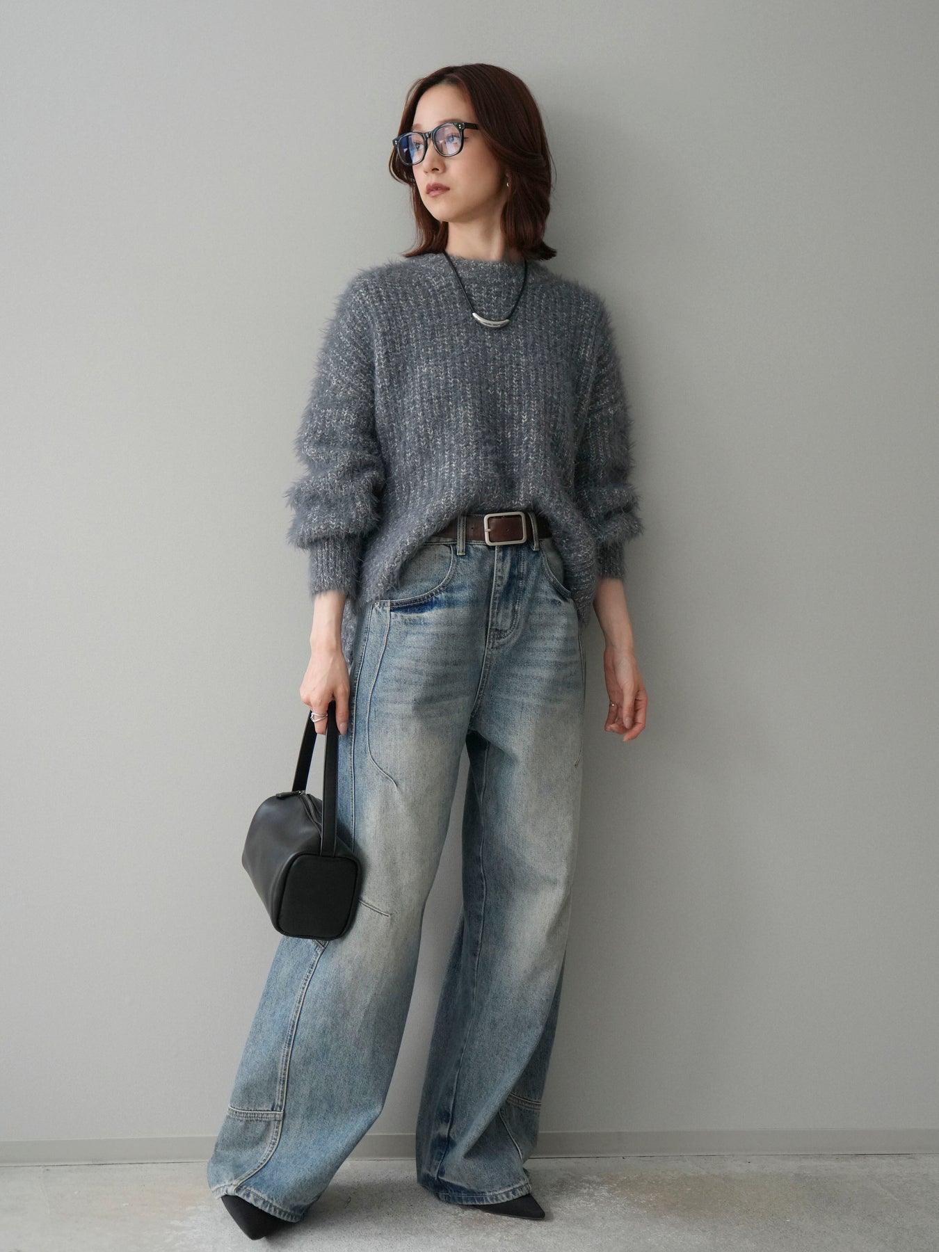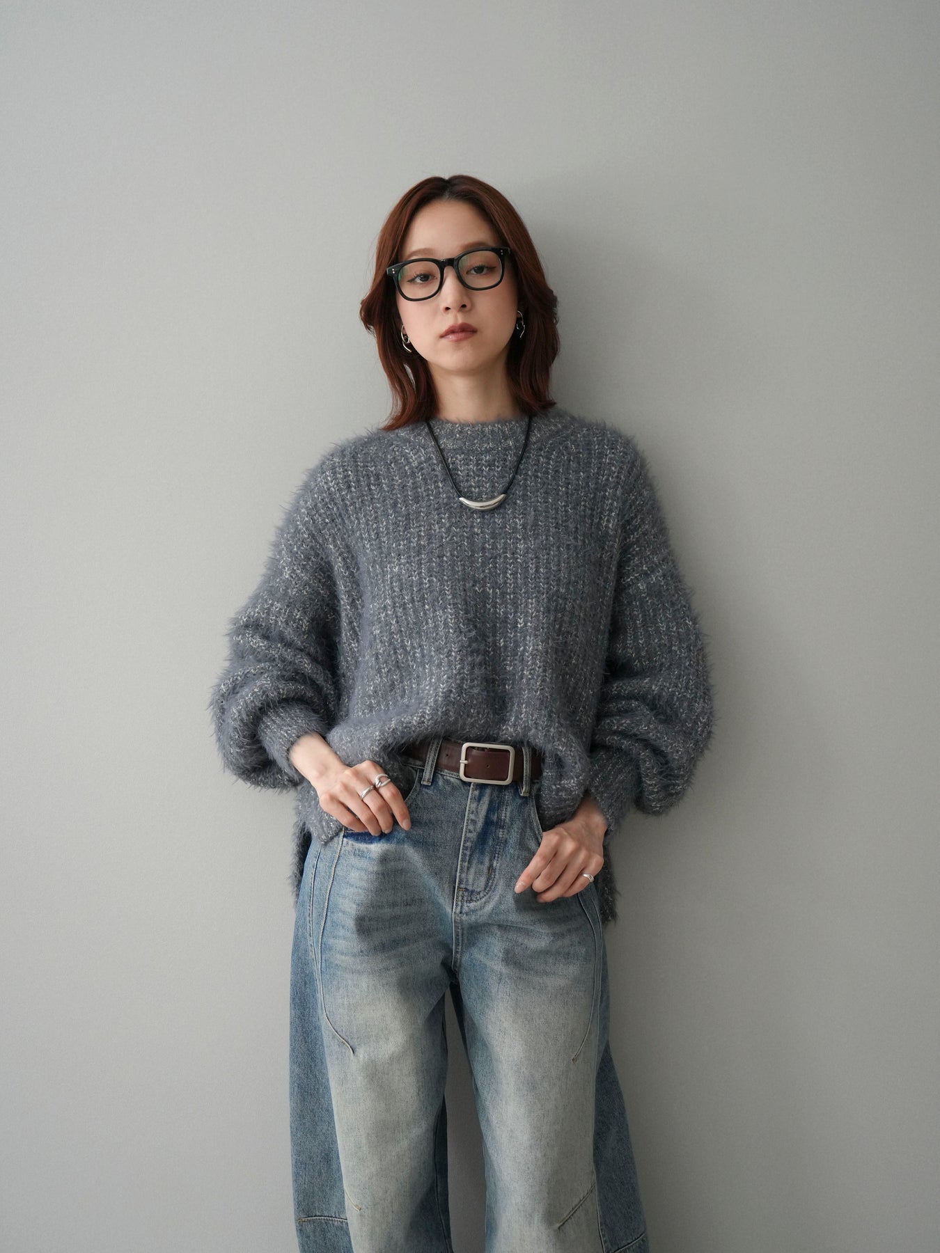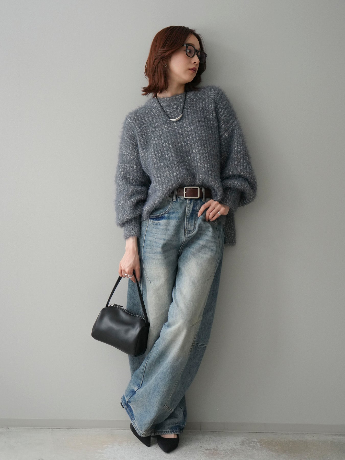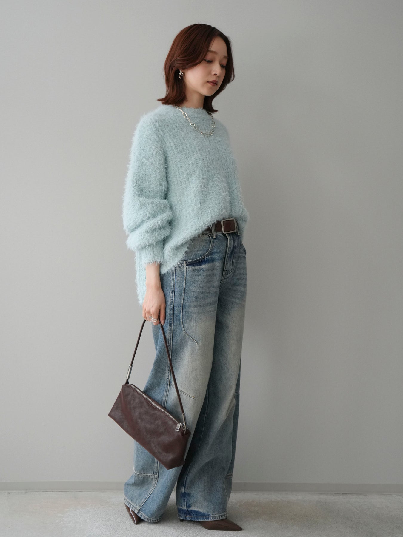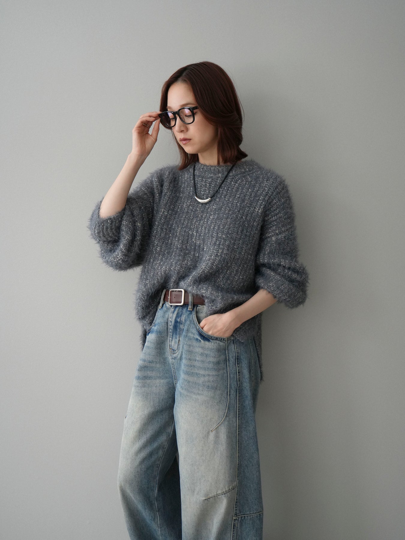 [SET]ボリュームスリーブシャギー MIXニットプルオーバー+ベルト付カーブデニムパンツ(2set)