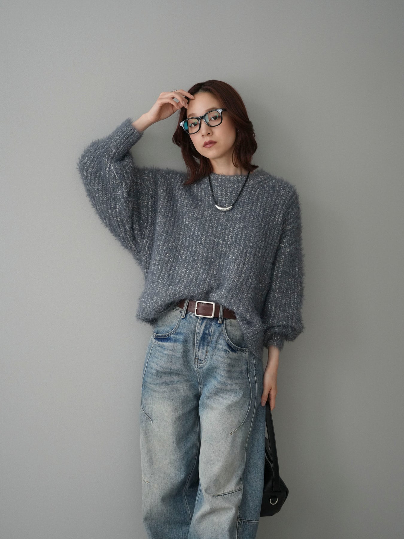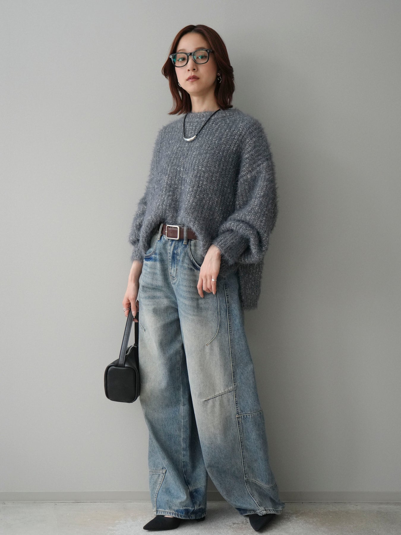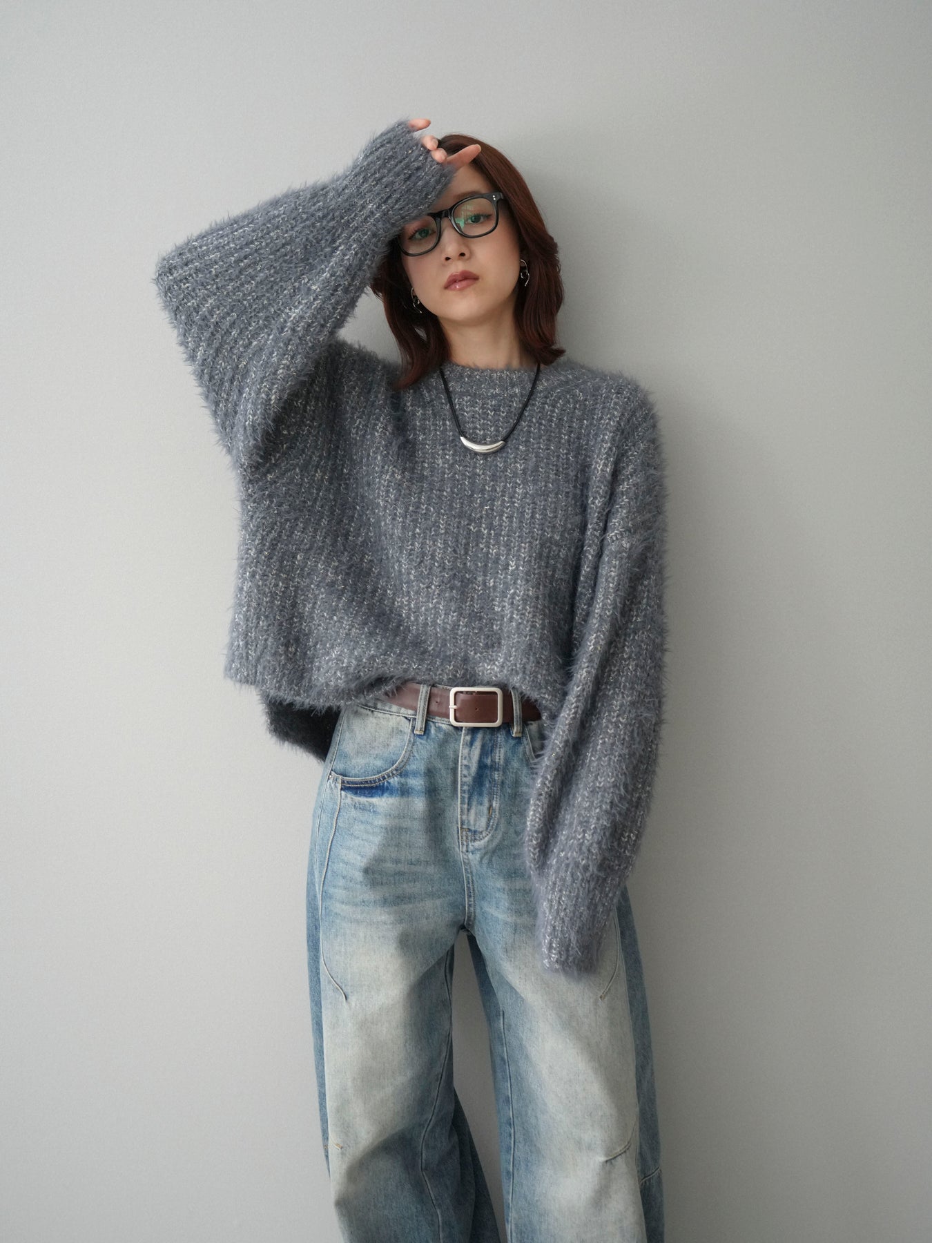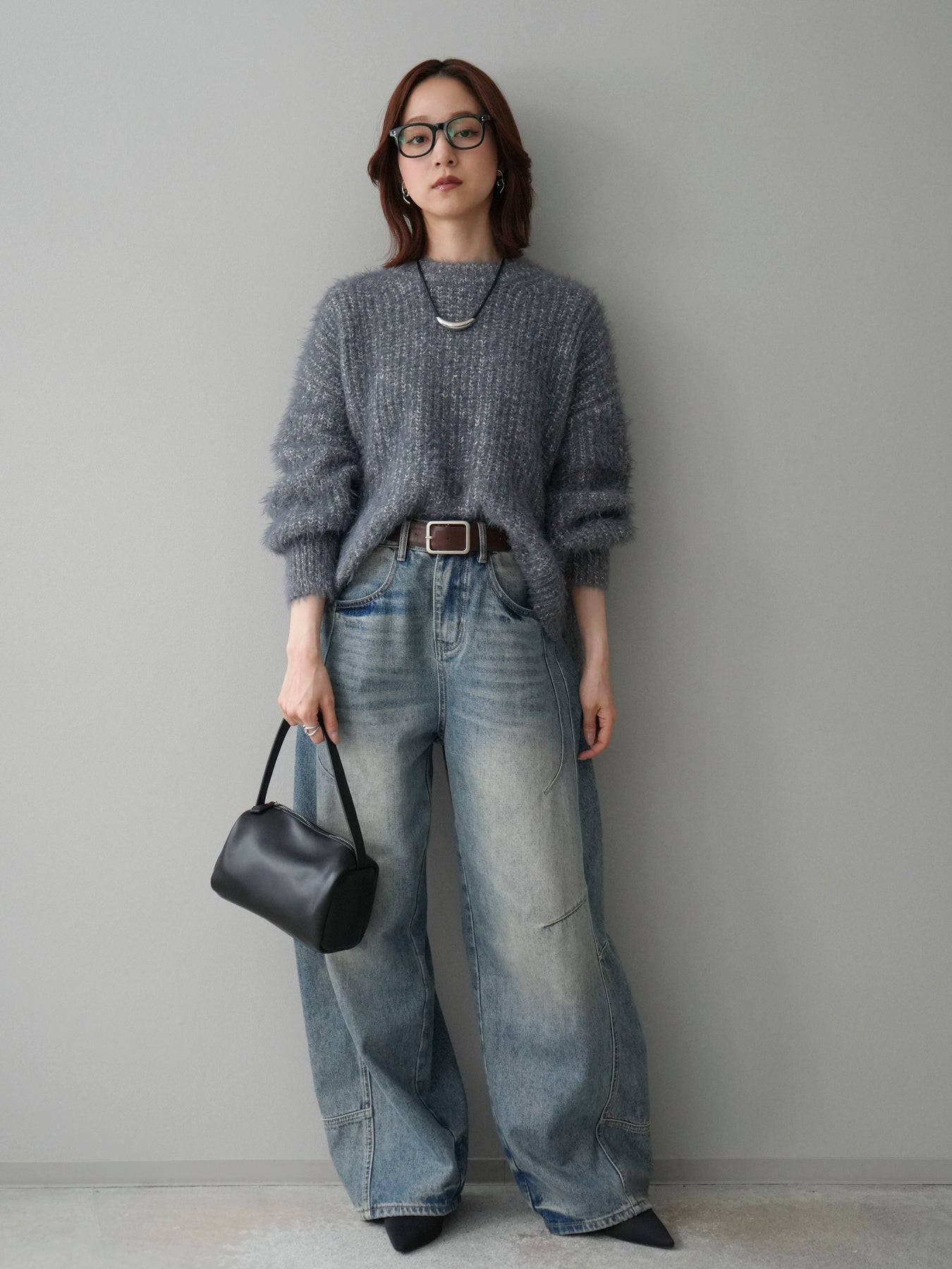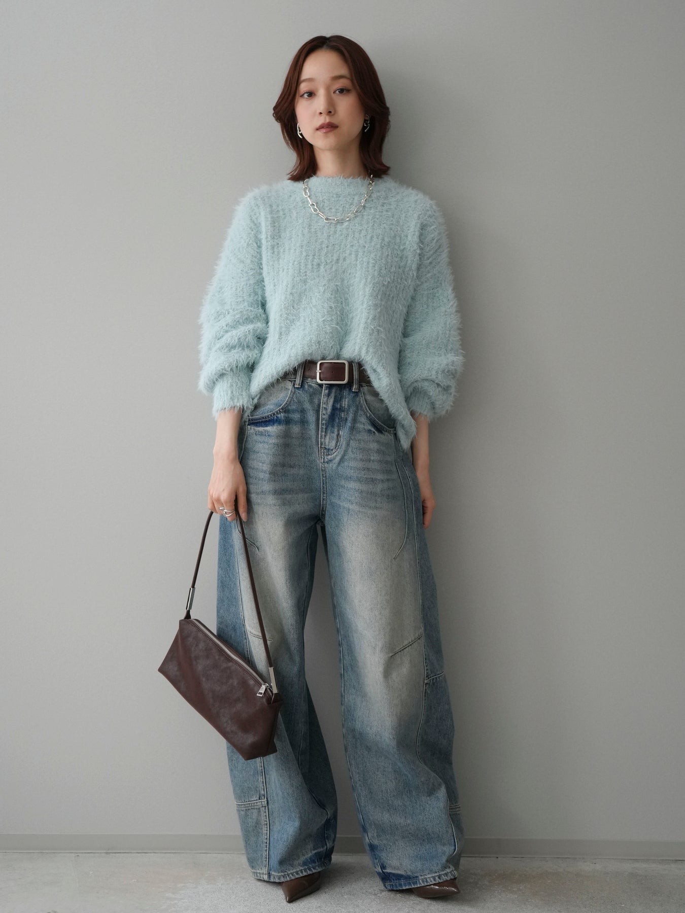 [SET]ボリュームスリーブシャギー MIXニットプルオーバー+ベルト付カーブデニムパンツ(2set)