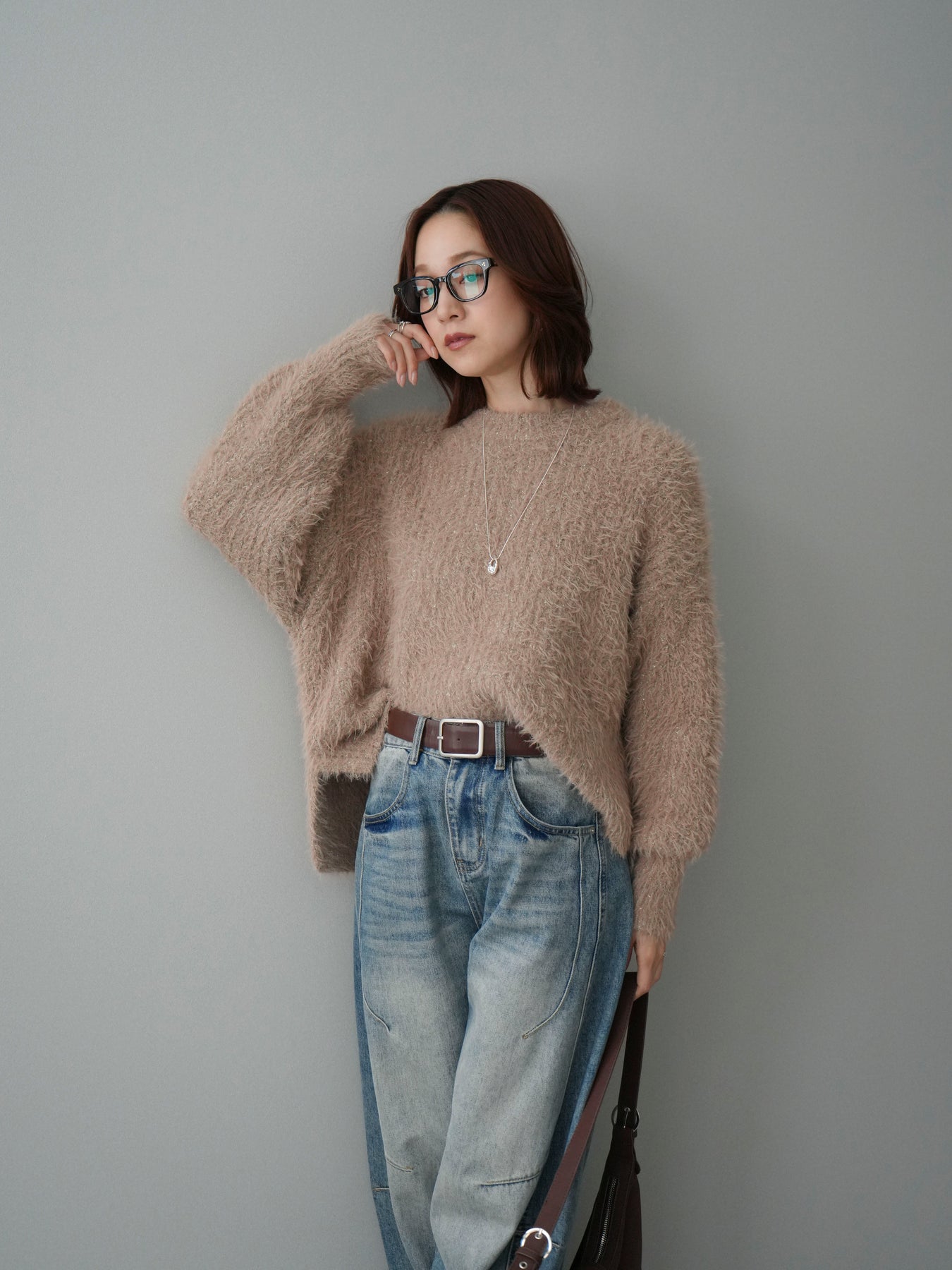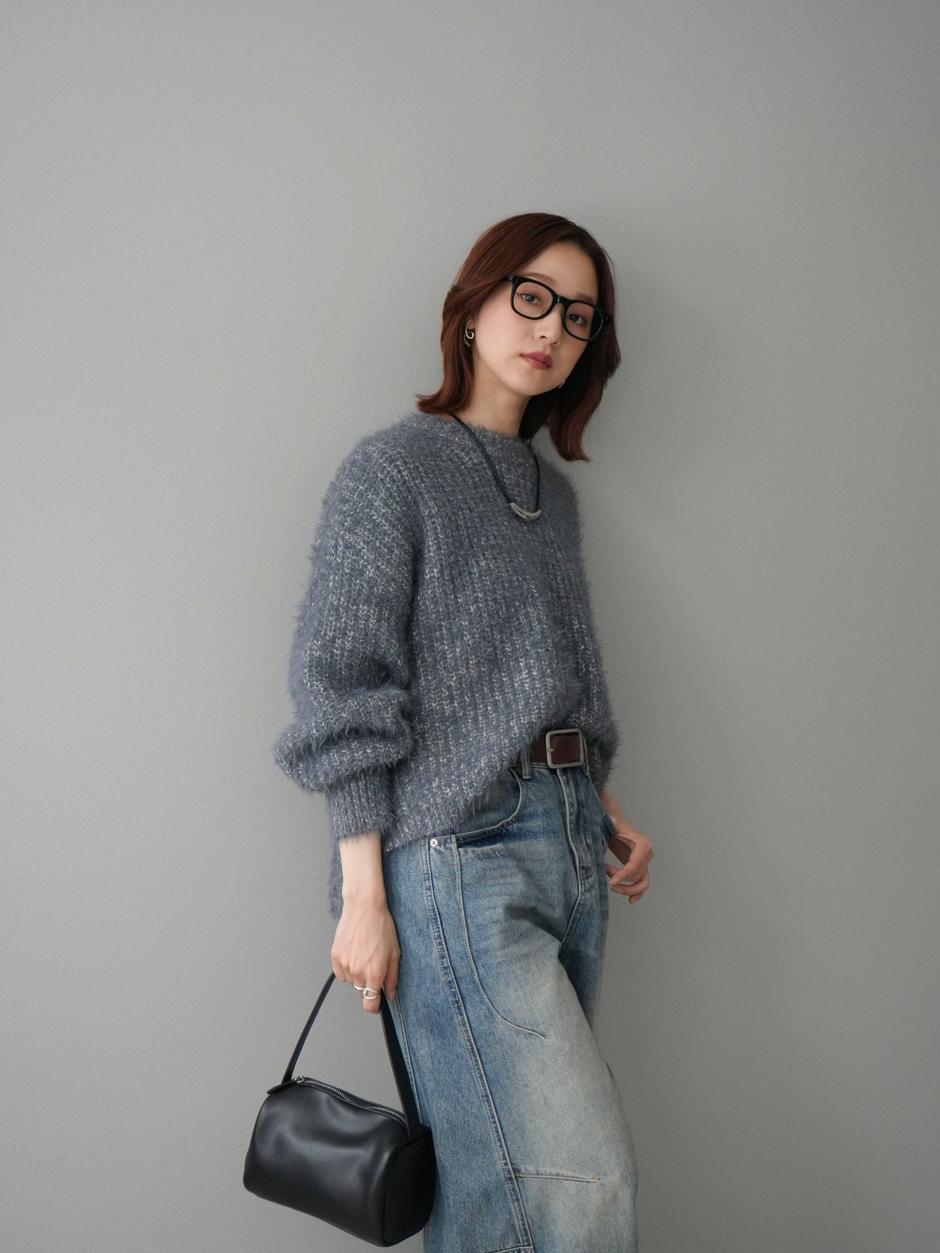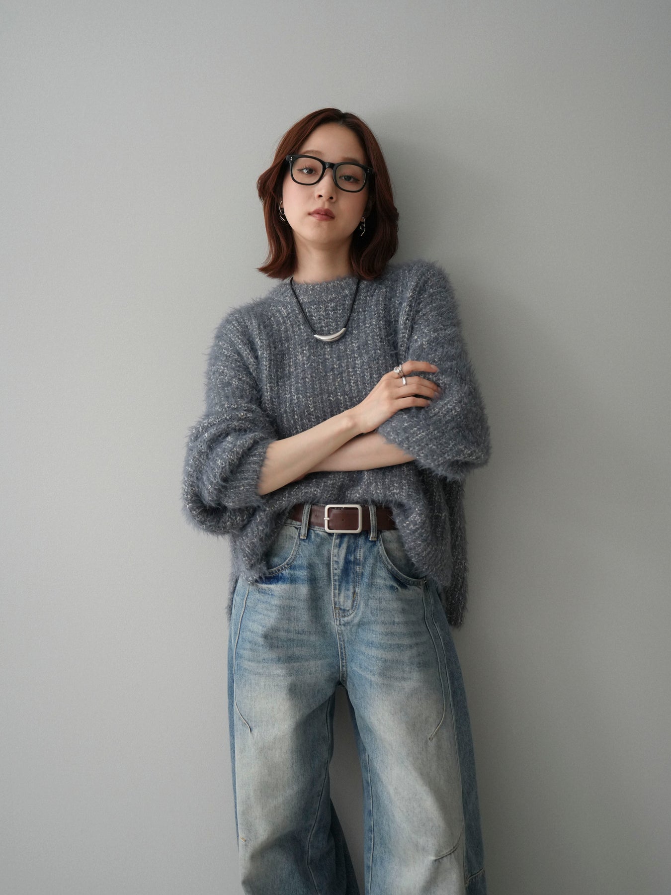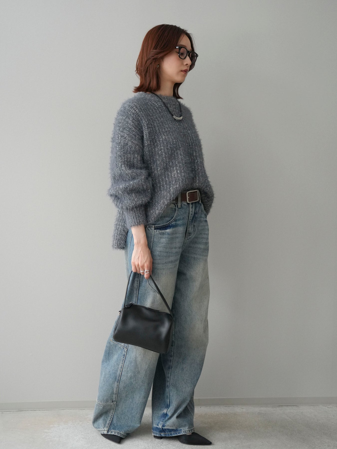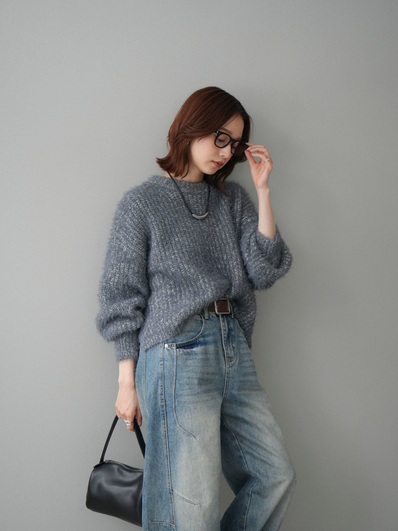 [SET]ボリュームスリーブシャギー MIXニットプルオーバー+ベルト付カーブデニムパンツ(2set)