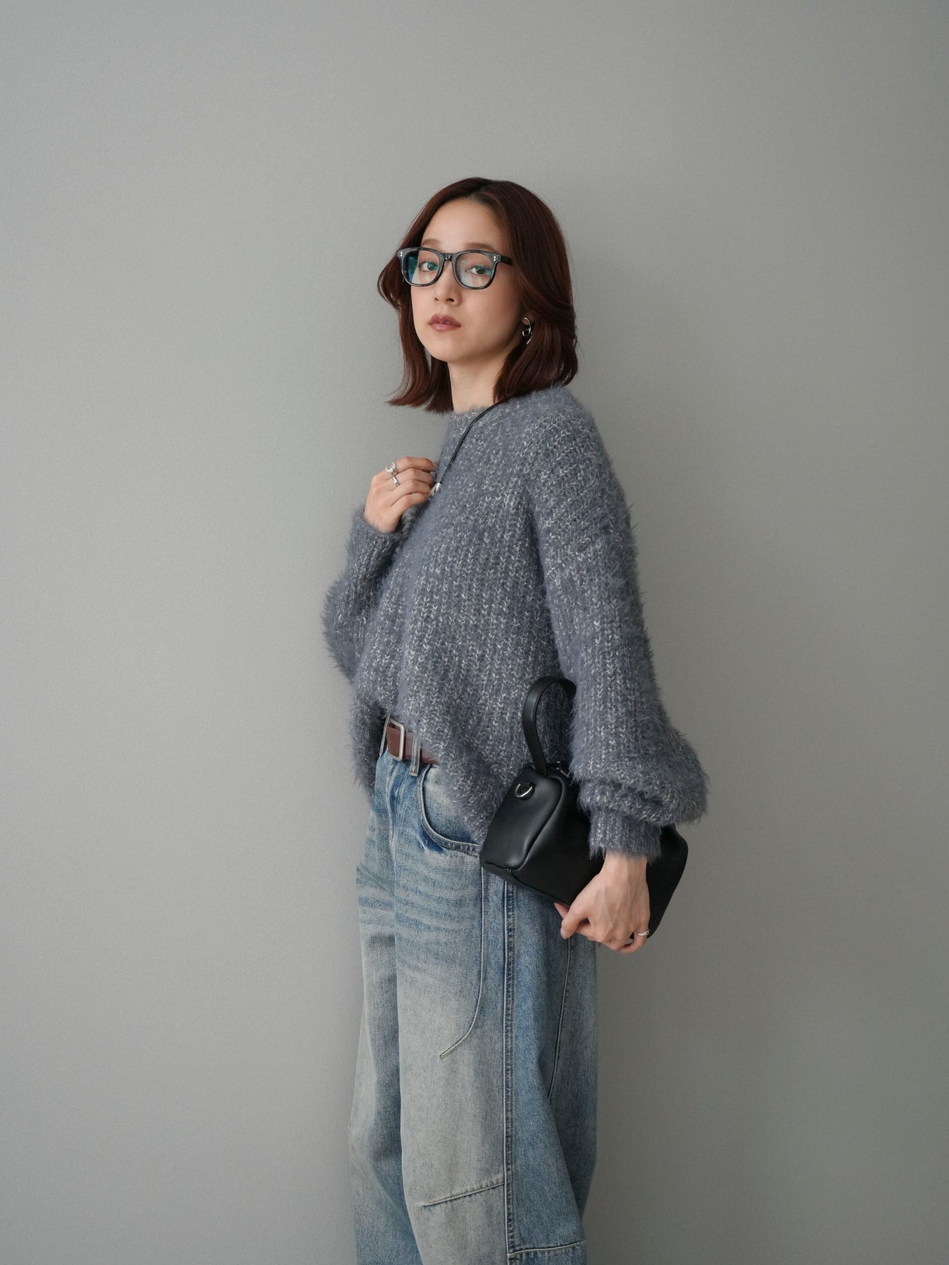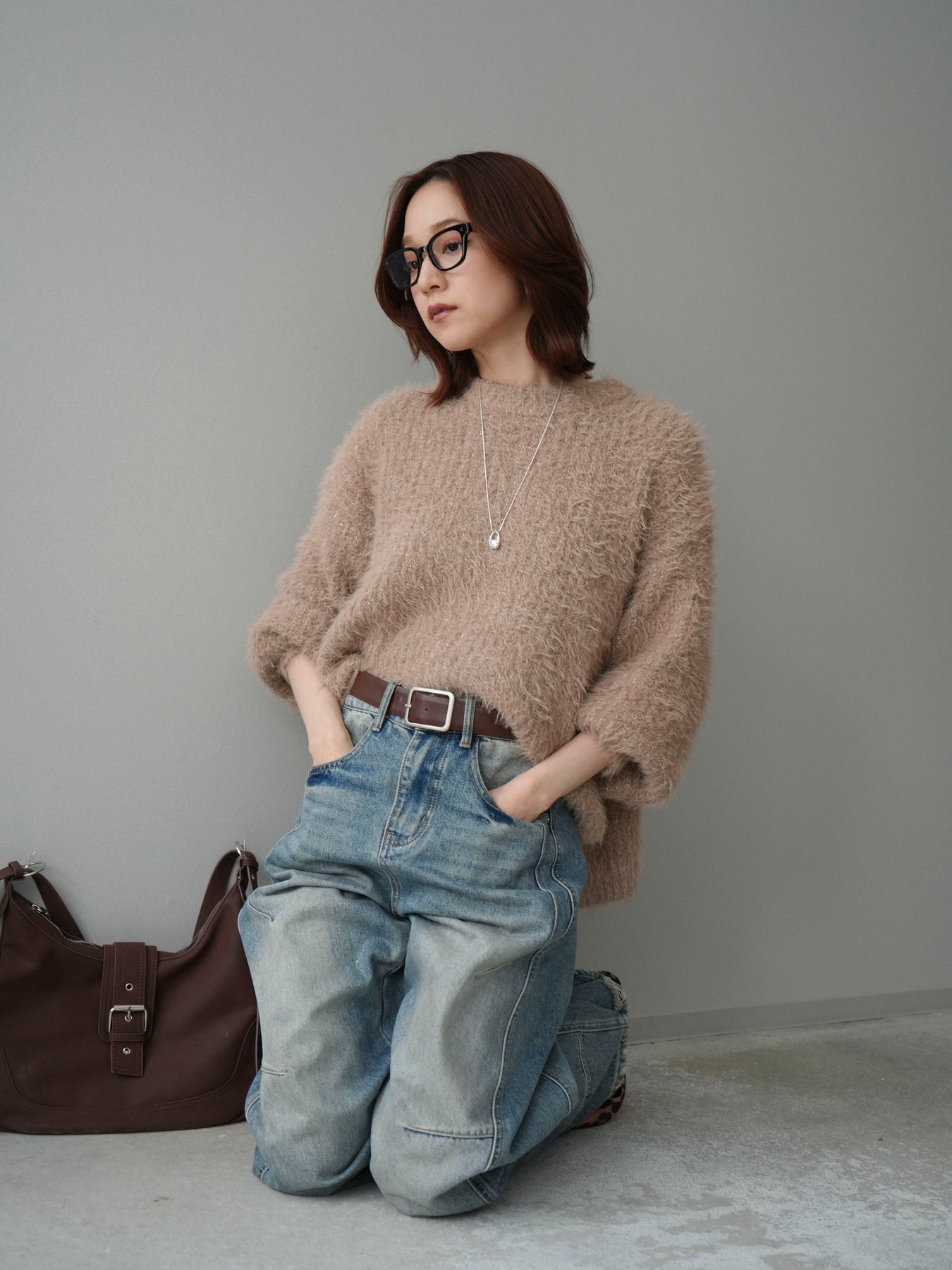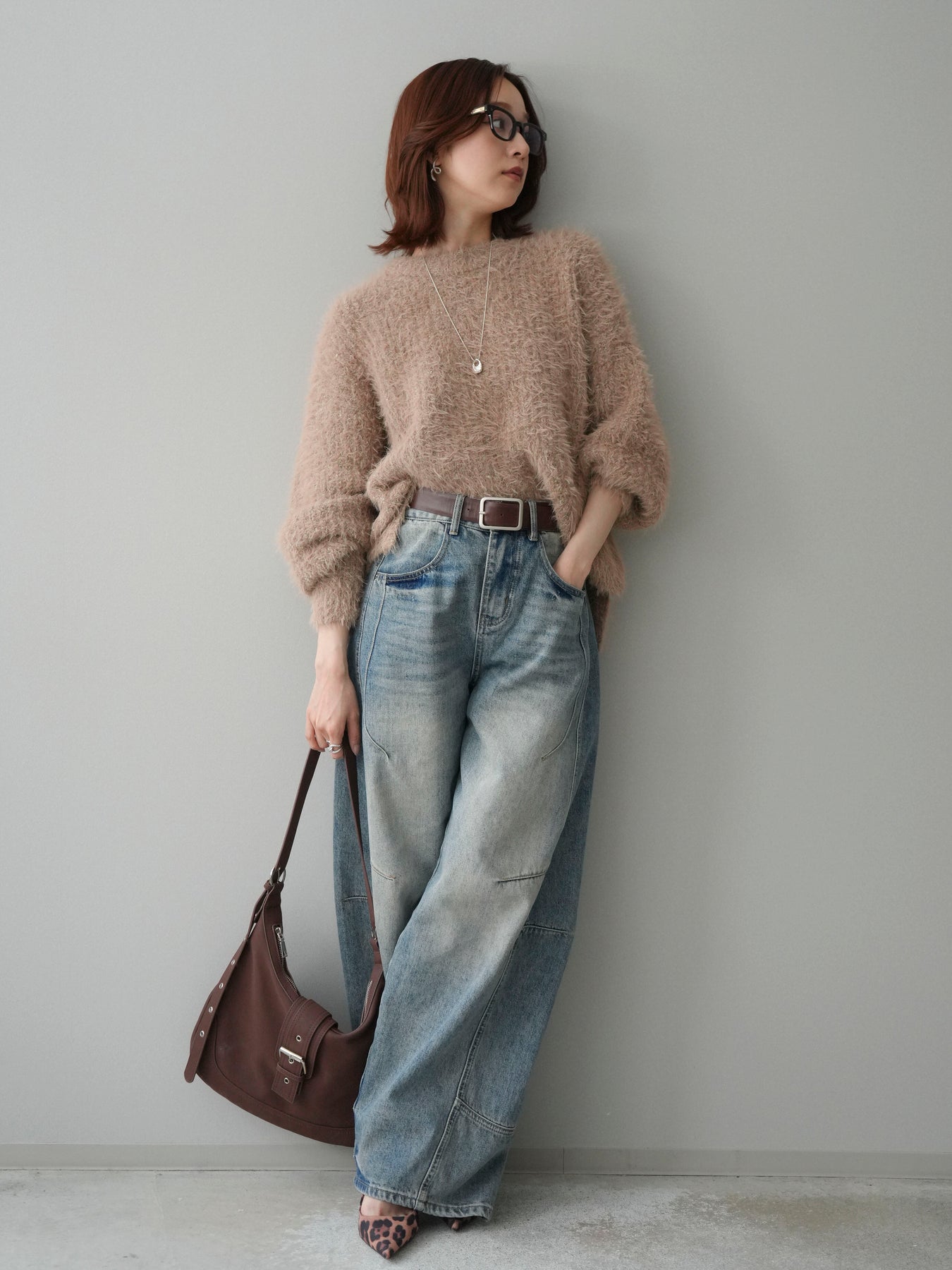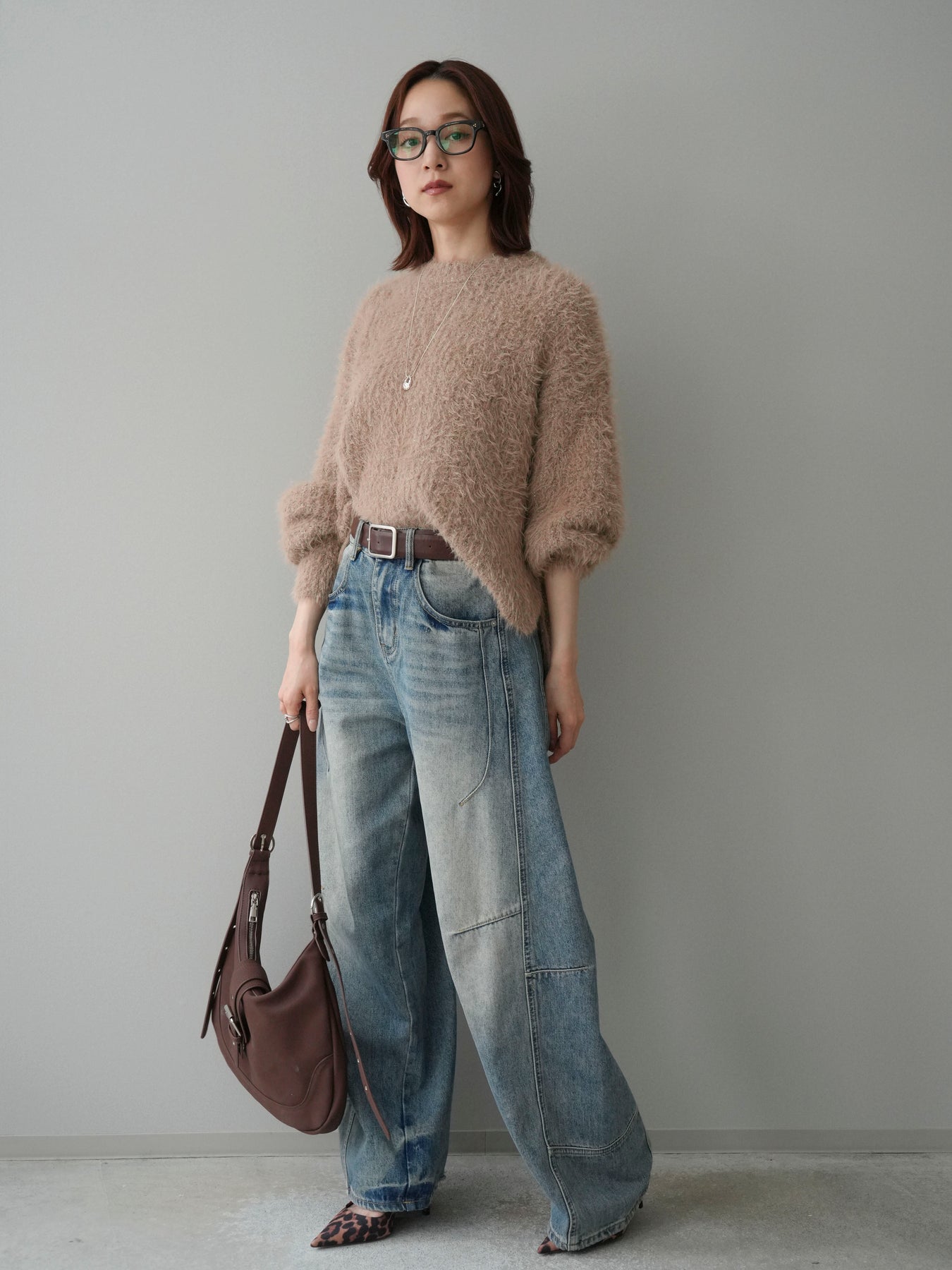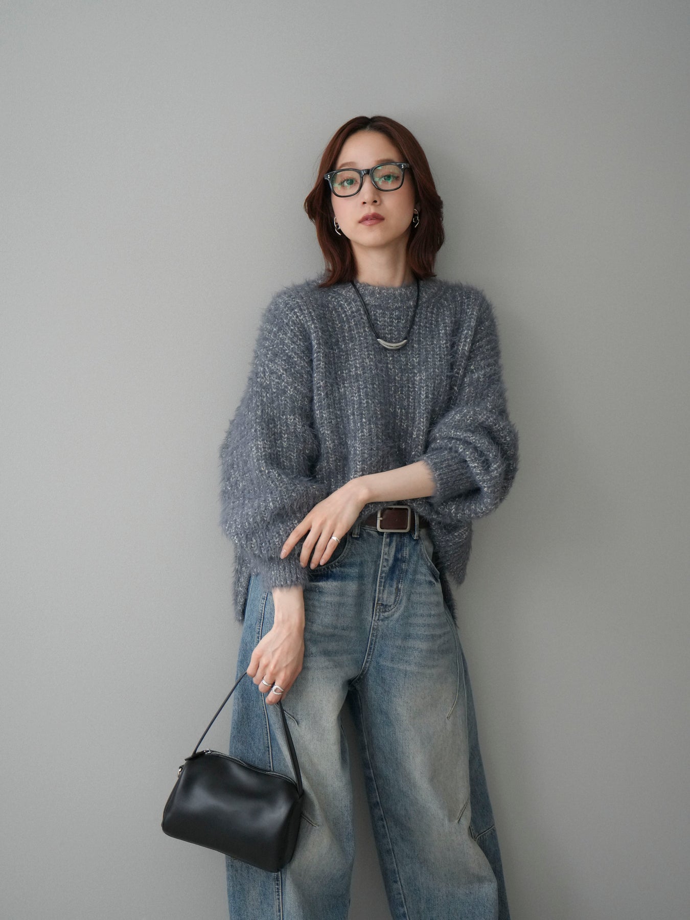 [SET]ボリュームスリーブシャギー MIXニットプルオーバー+ベルト付カーブデニムパンツ(2set)