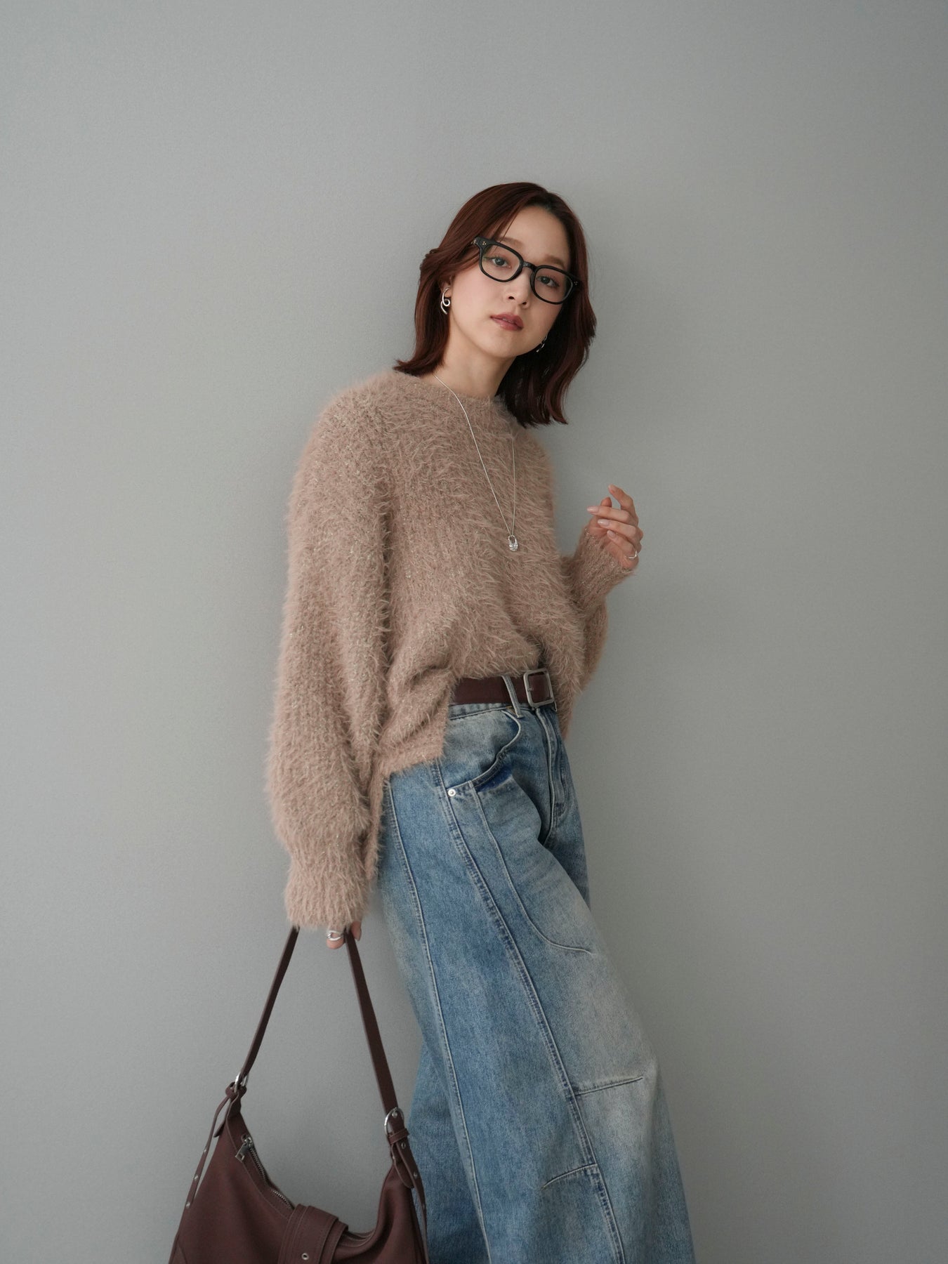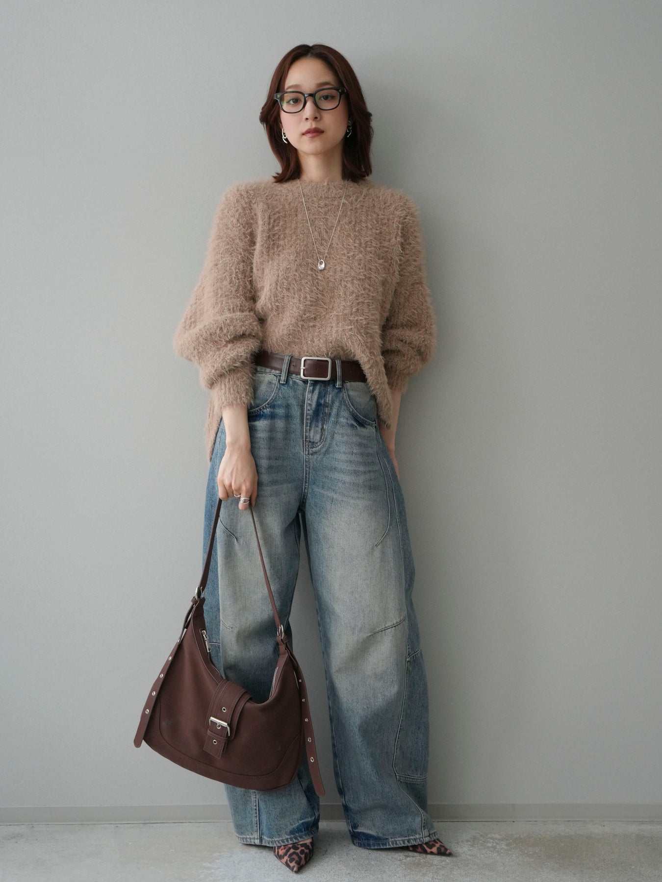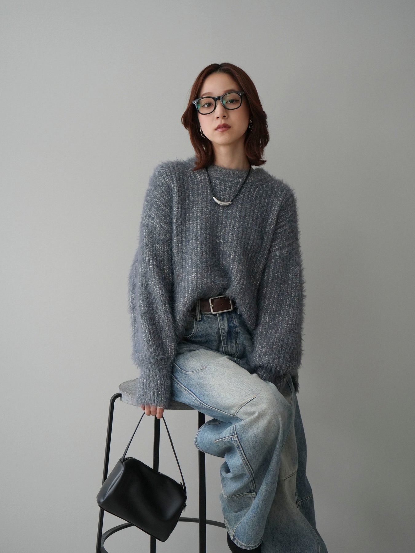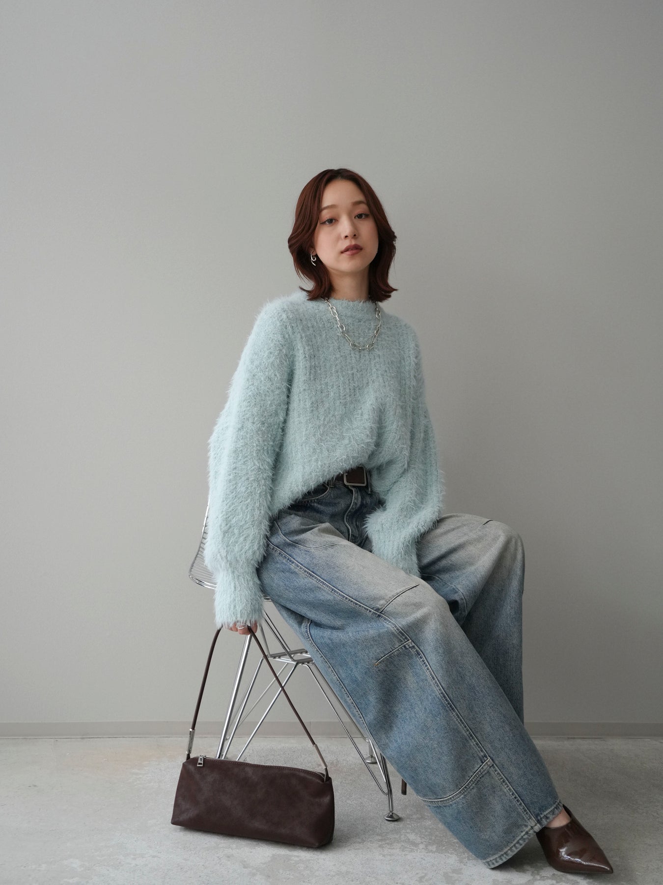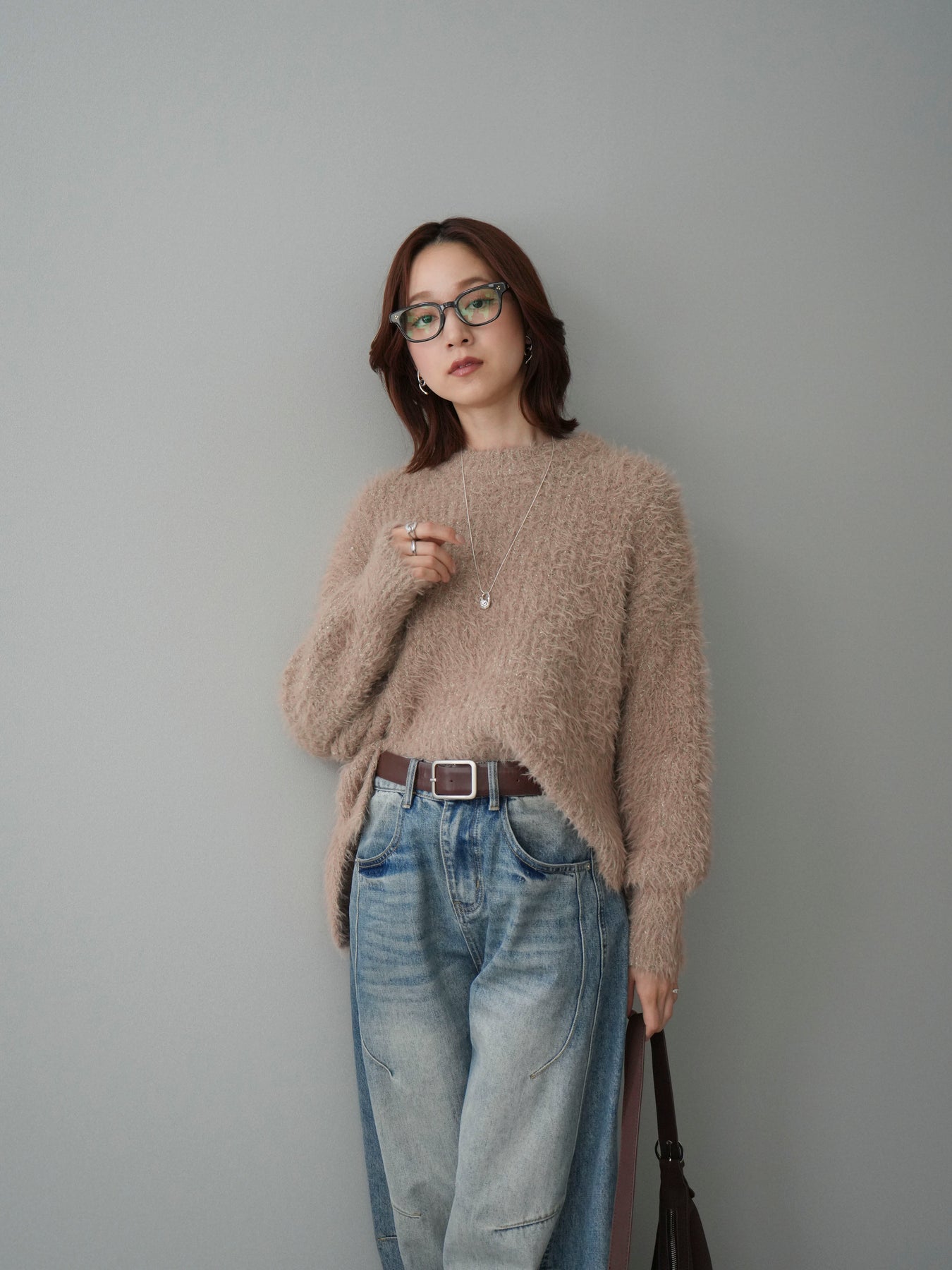 [SET]ボリュームスリーブシャギー MIXニットプルオーバー+ベルト付カーブデニムパンツ(2set)