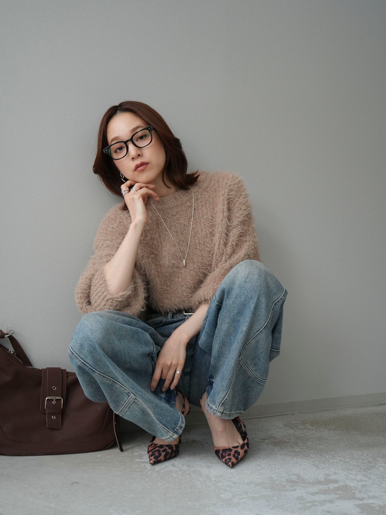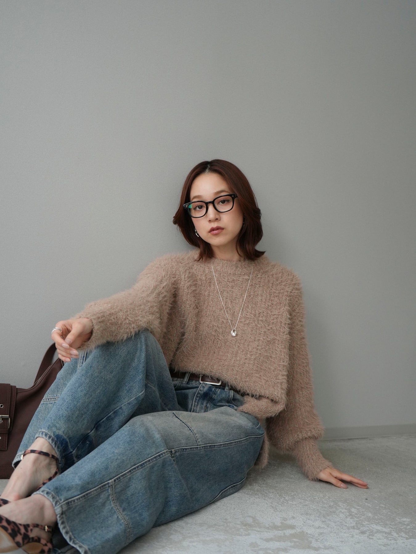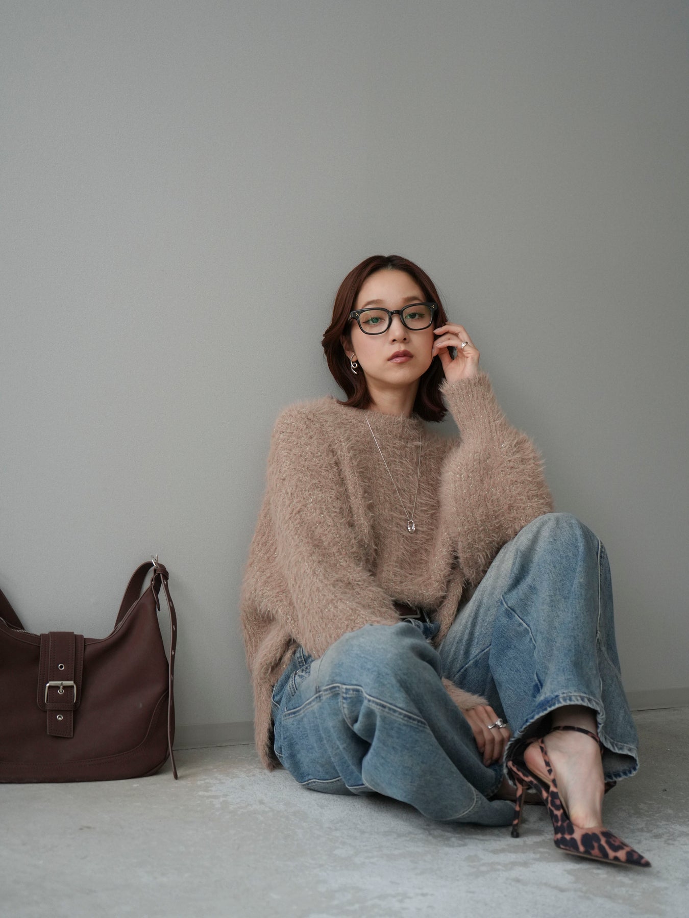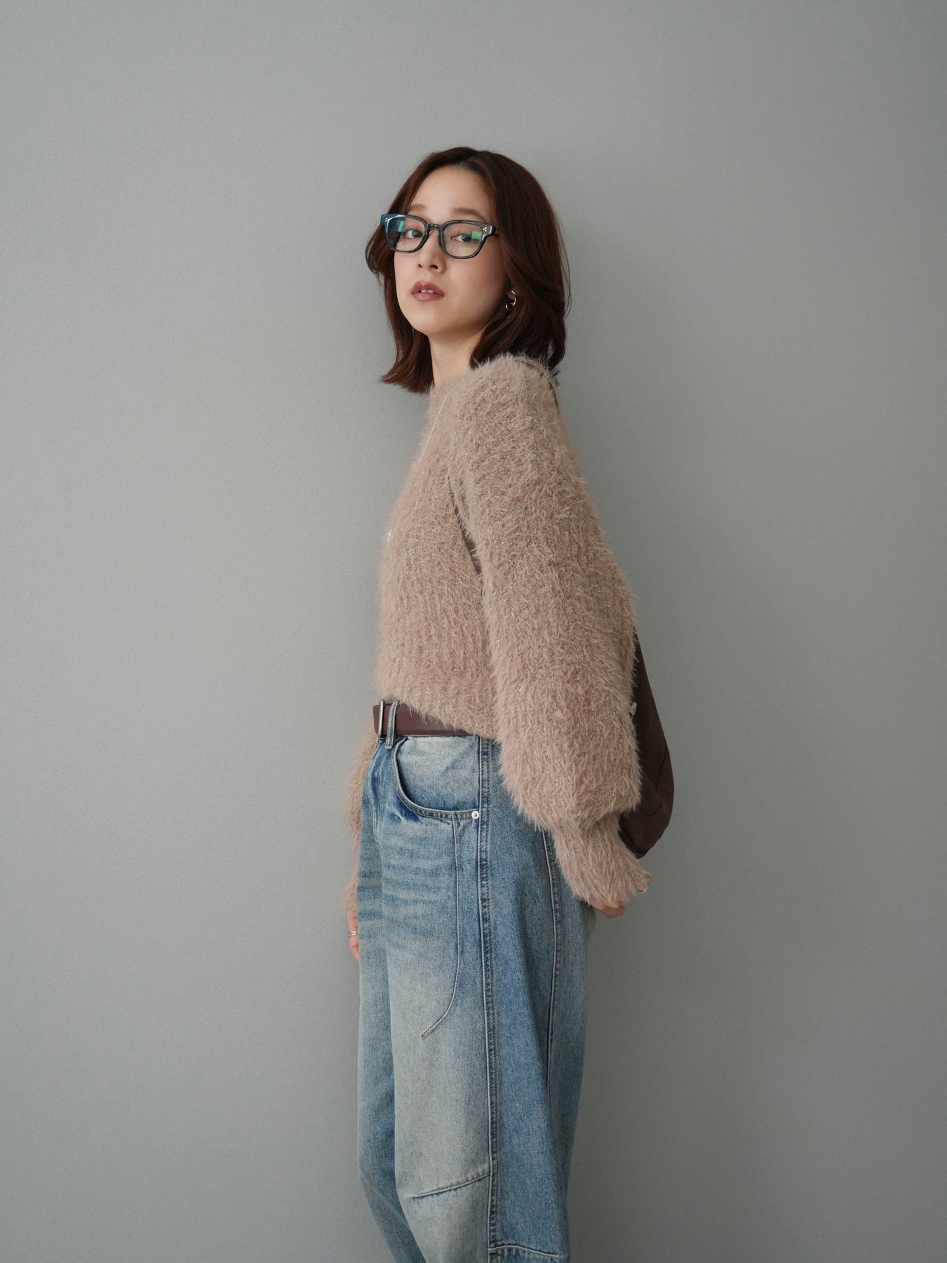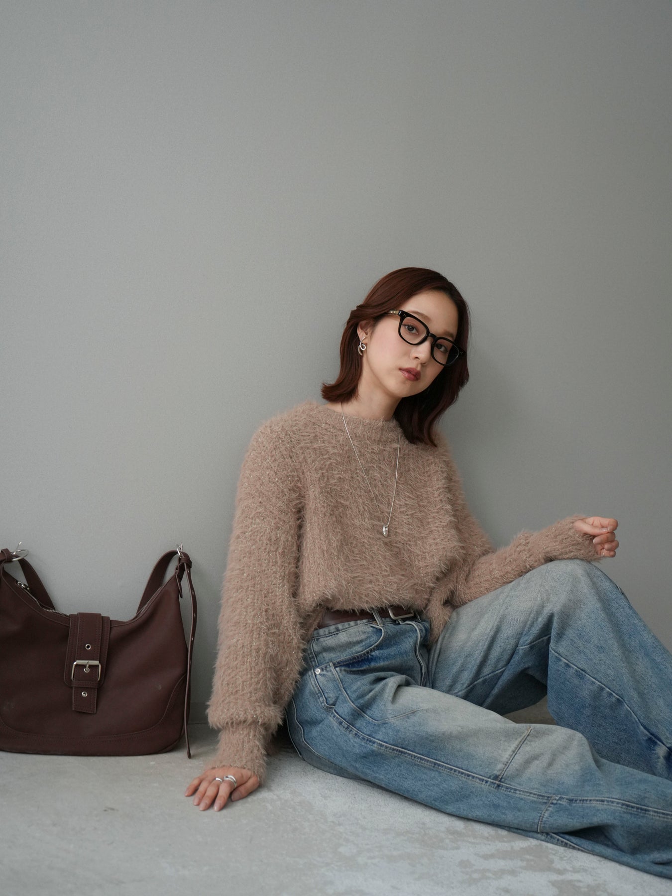[SET]ボリュームスリーブシャギー MIXニットプルオーバー+ベルト付カーブデニムパンツ(2set)