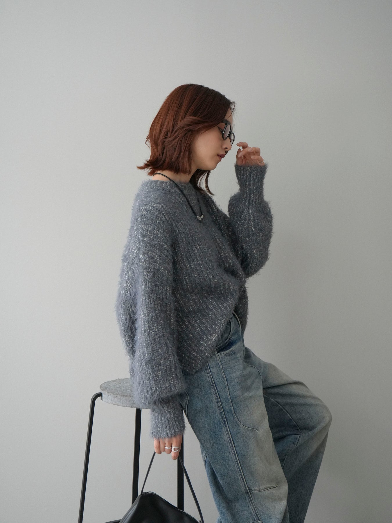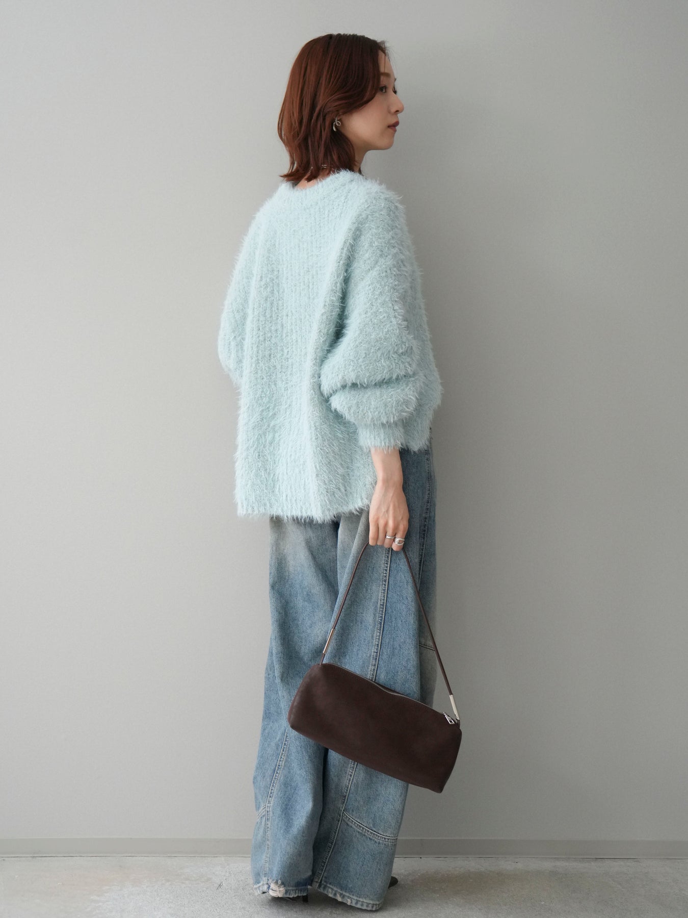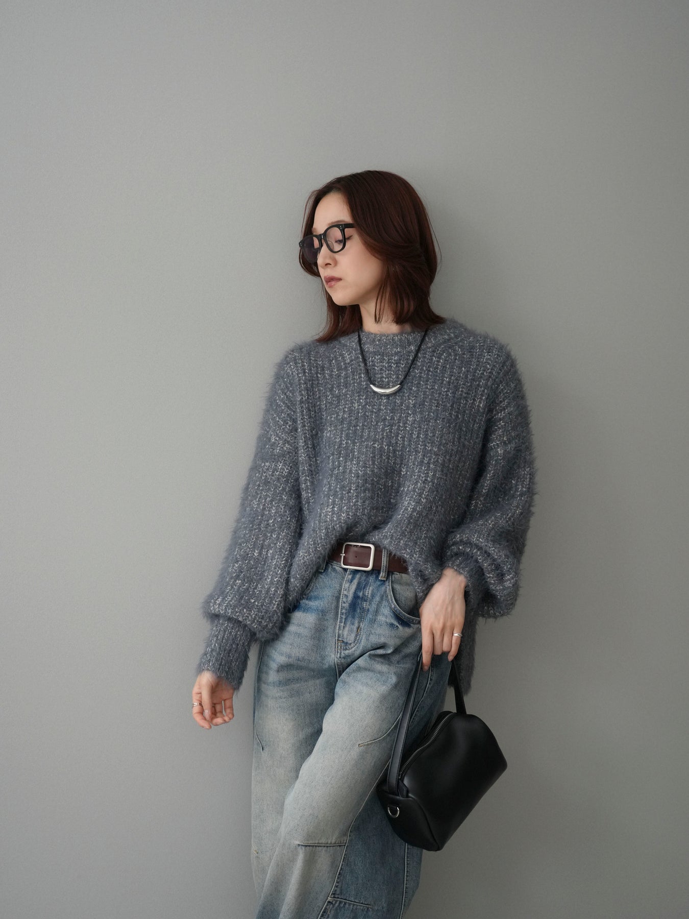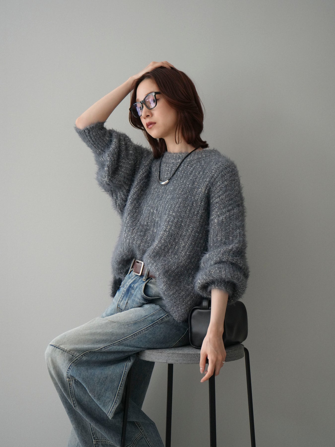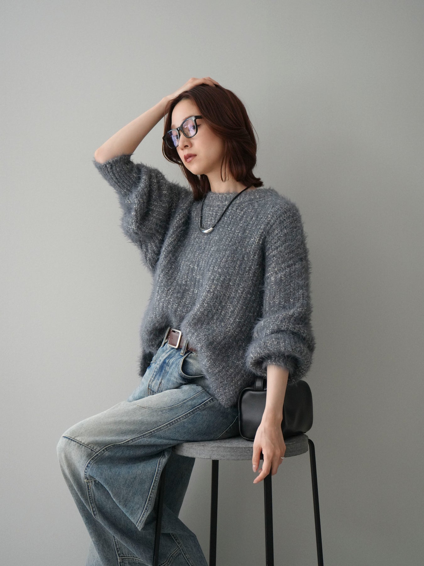 シャギー感のあるミックスニット素材を使用したプルオーバー。ふんわりとしたボリュームスリーブが程よい存在感を演出し、シンプルながらも着映えするデザインに仕上げています。一枚でコーディネートが決まり、デイリーに取り入れやすい一着です。