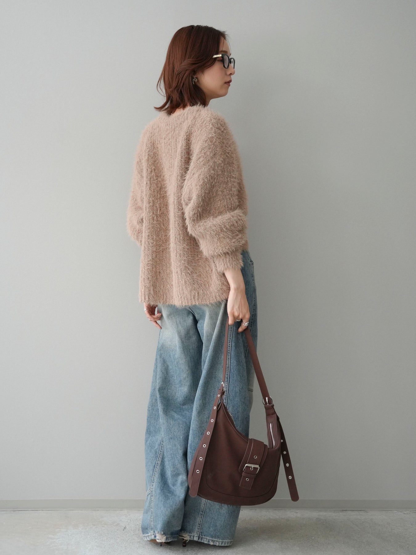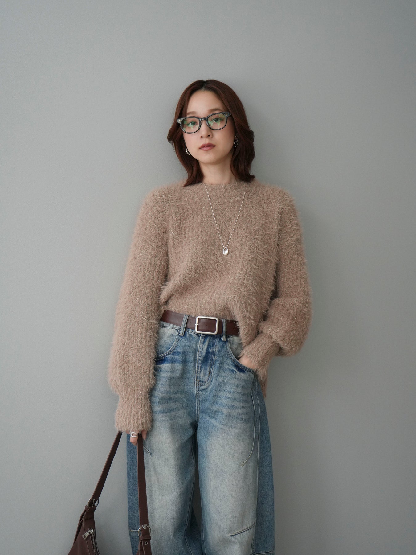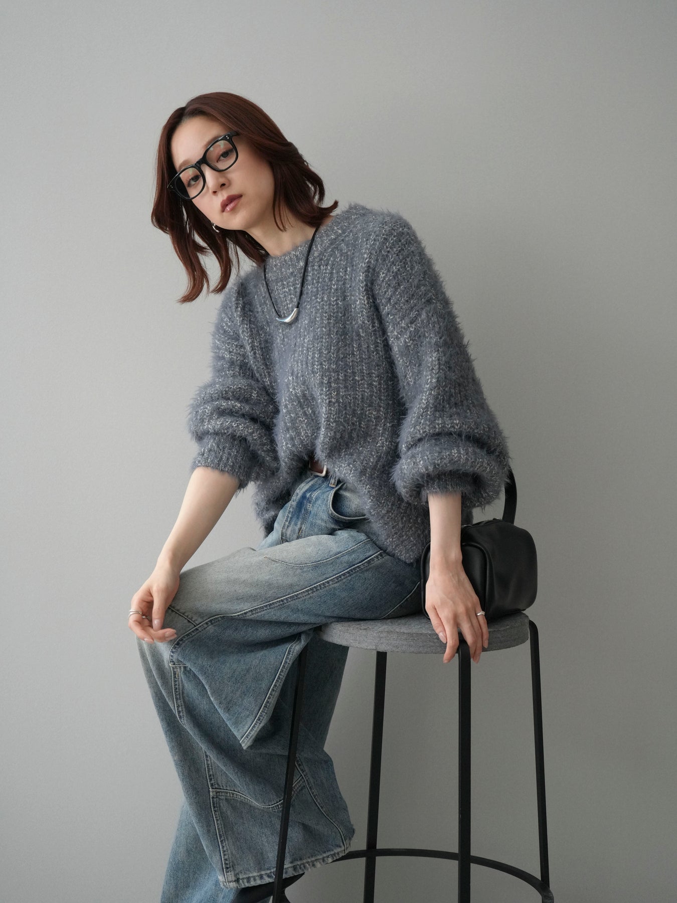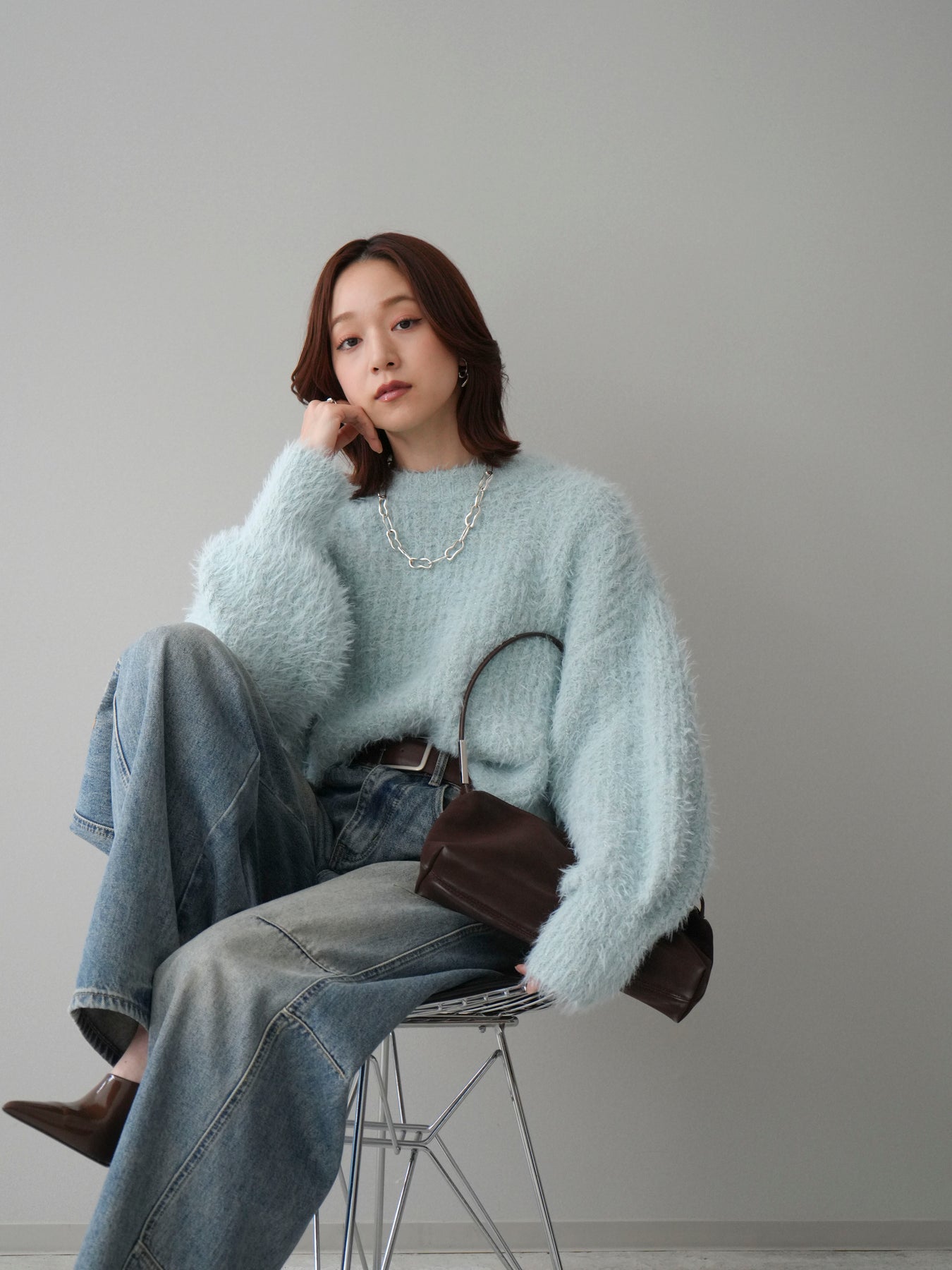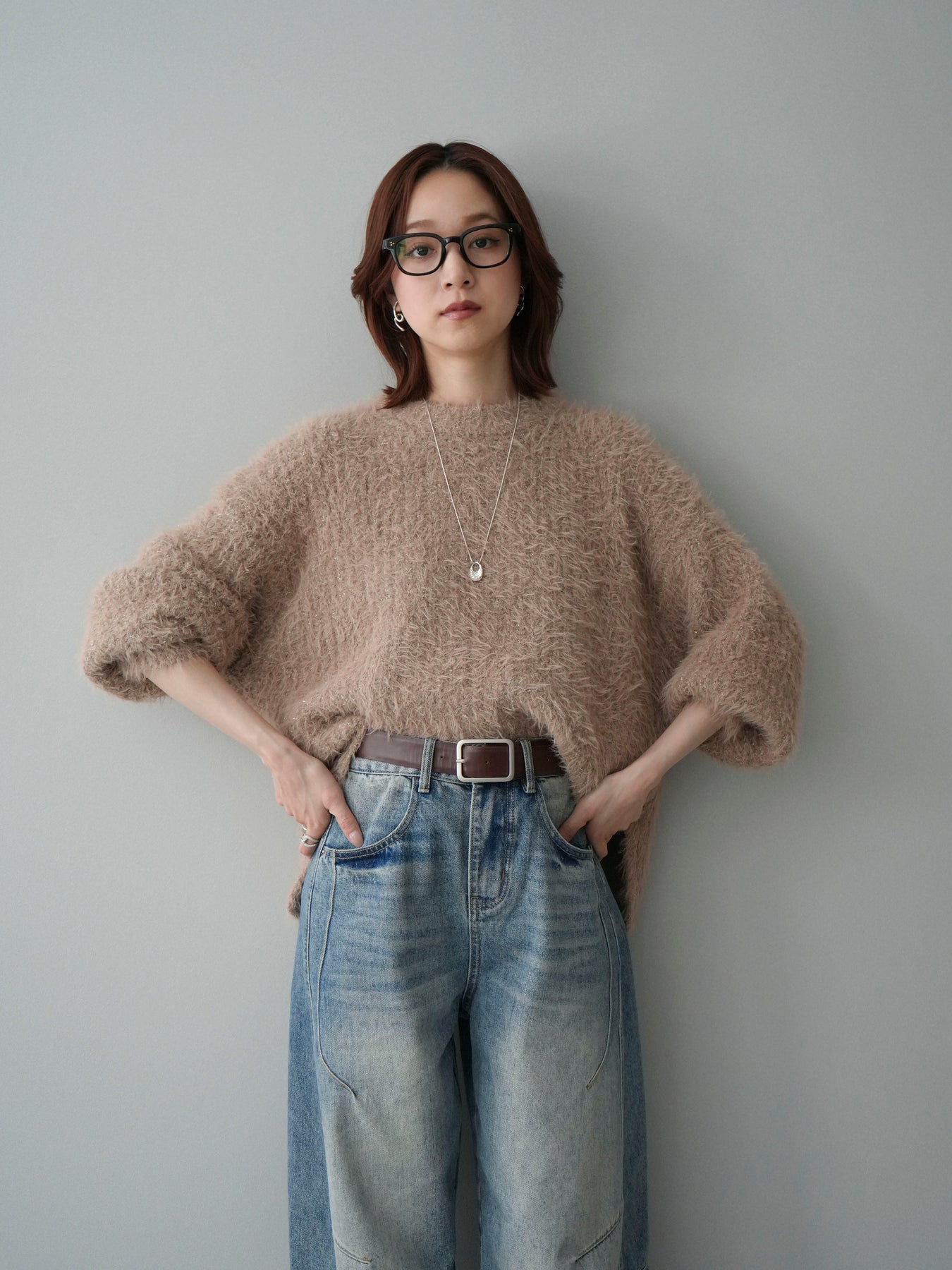 シャギー感のあるミックスニット素材を使用したプルオーバー。ふんわりとしたボリュームスリーブが程よい存在感を演出し、シンプルながらも着映えするデザインに仕上げています。一枚でコーディネートが決まり、デイリーに取り入れやすい一着です。