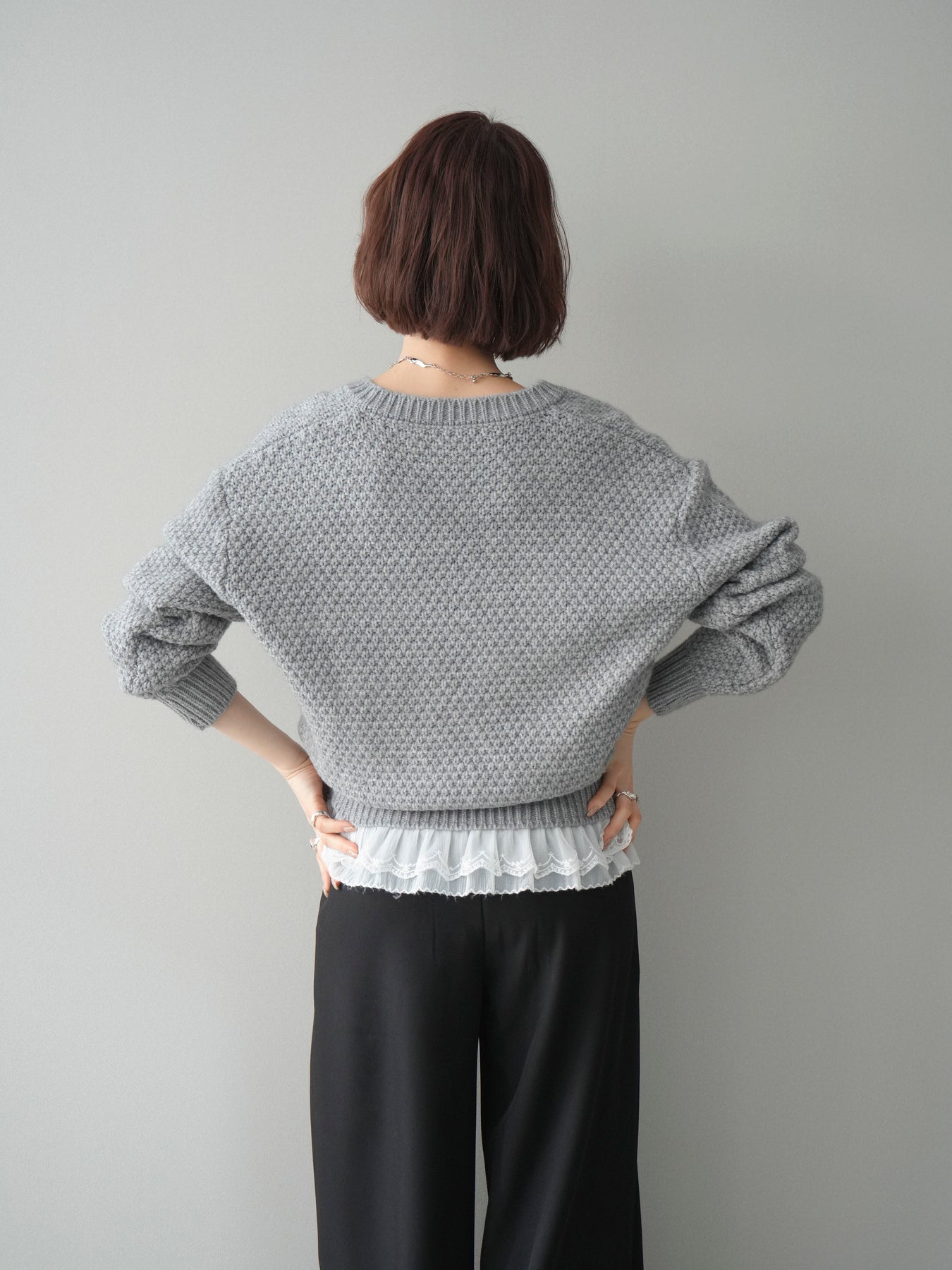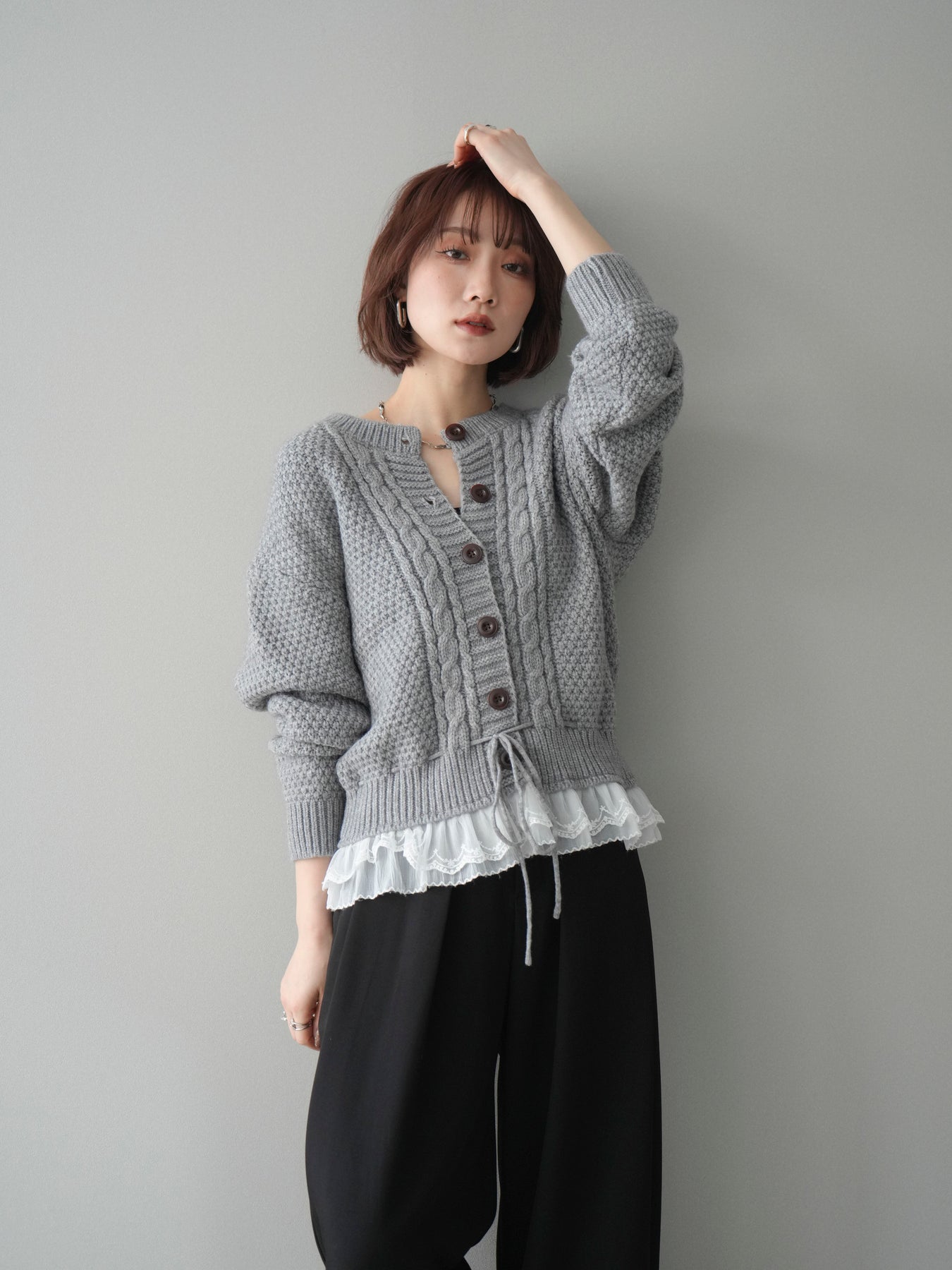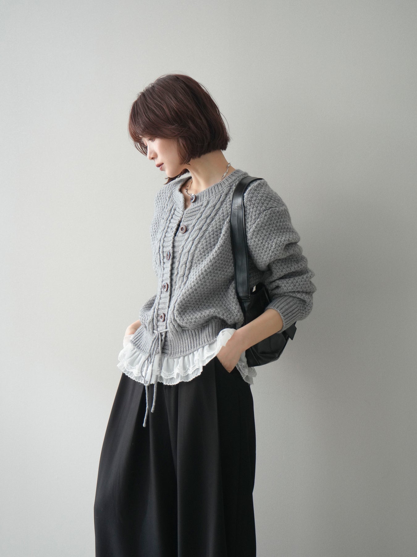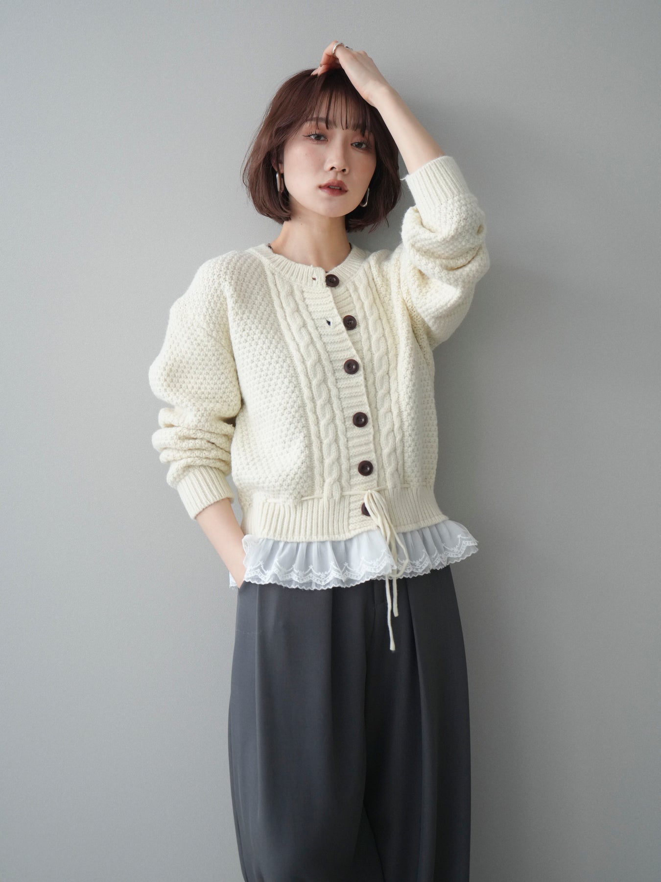 ざっくりとしたケーブル編みがシーズンムードを高めるニットカーディガン。裾にさりげなくあしらわれたレースデザインが、フェミニンなニュアンスをプラスし、シンプルなスタイリングにひとさじの甘さを添えます。程よくゆとりのあるシルエットとドロップショルダーで、抜け感のある着こなしに。フロントは大きめのボタンがアクセントになり、前開きでも閉じても着映える1枚です。カジュアルからレディライクなスタイルまで、幅広く活躍してくれます。