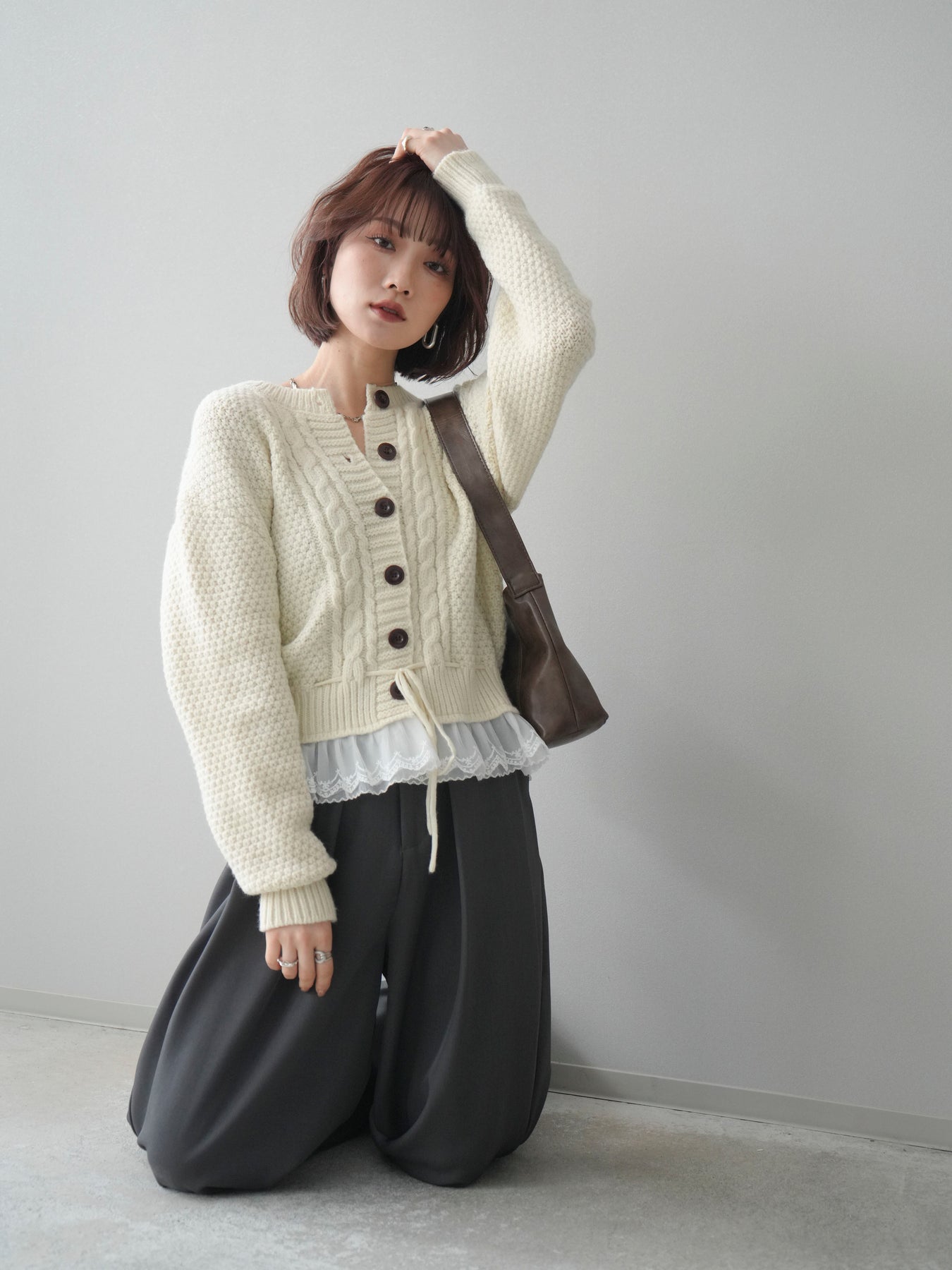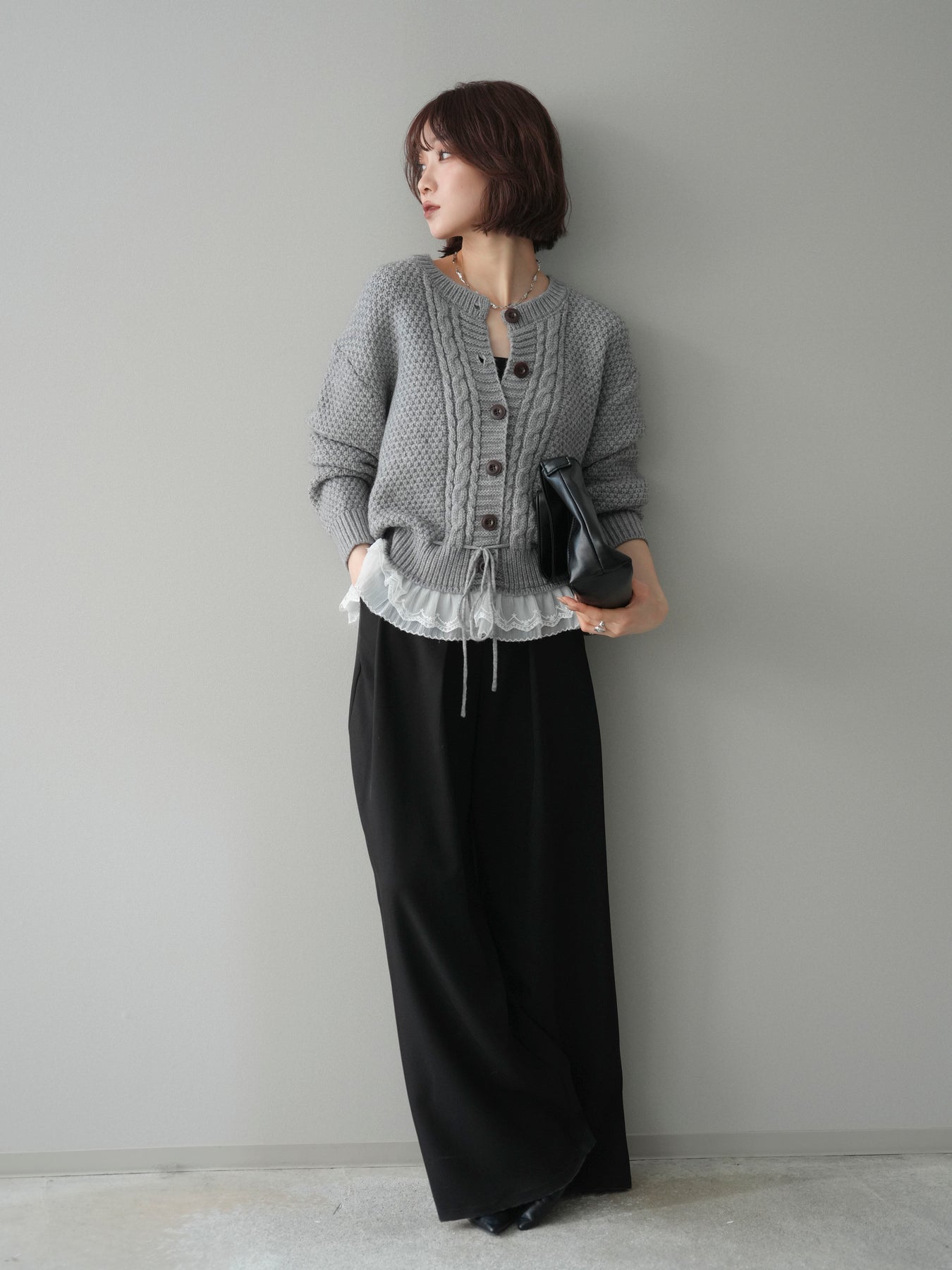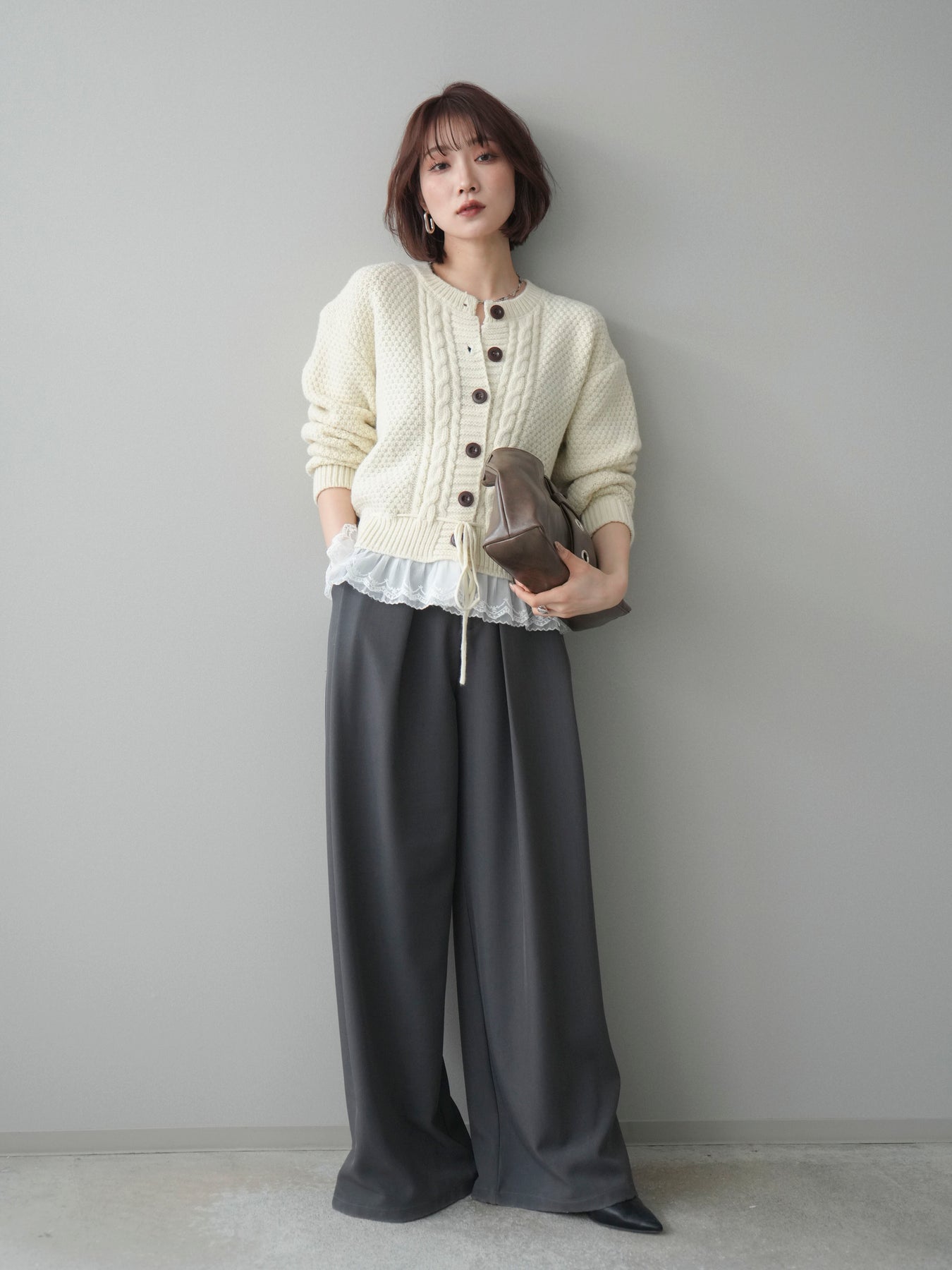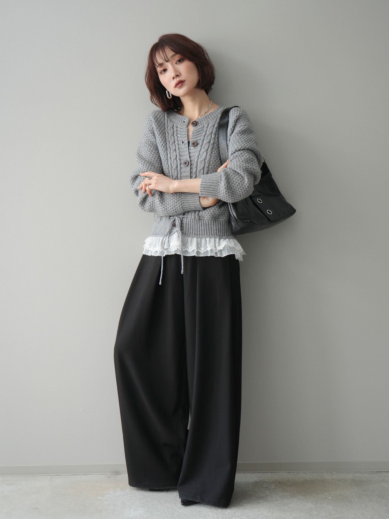 [SET]裾レースケーブルニットカーディガン+ベルトループデザインワイドパンツ(2set)