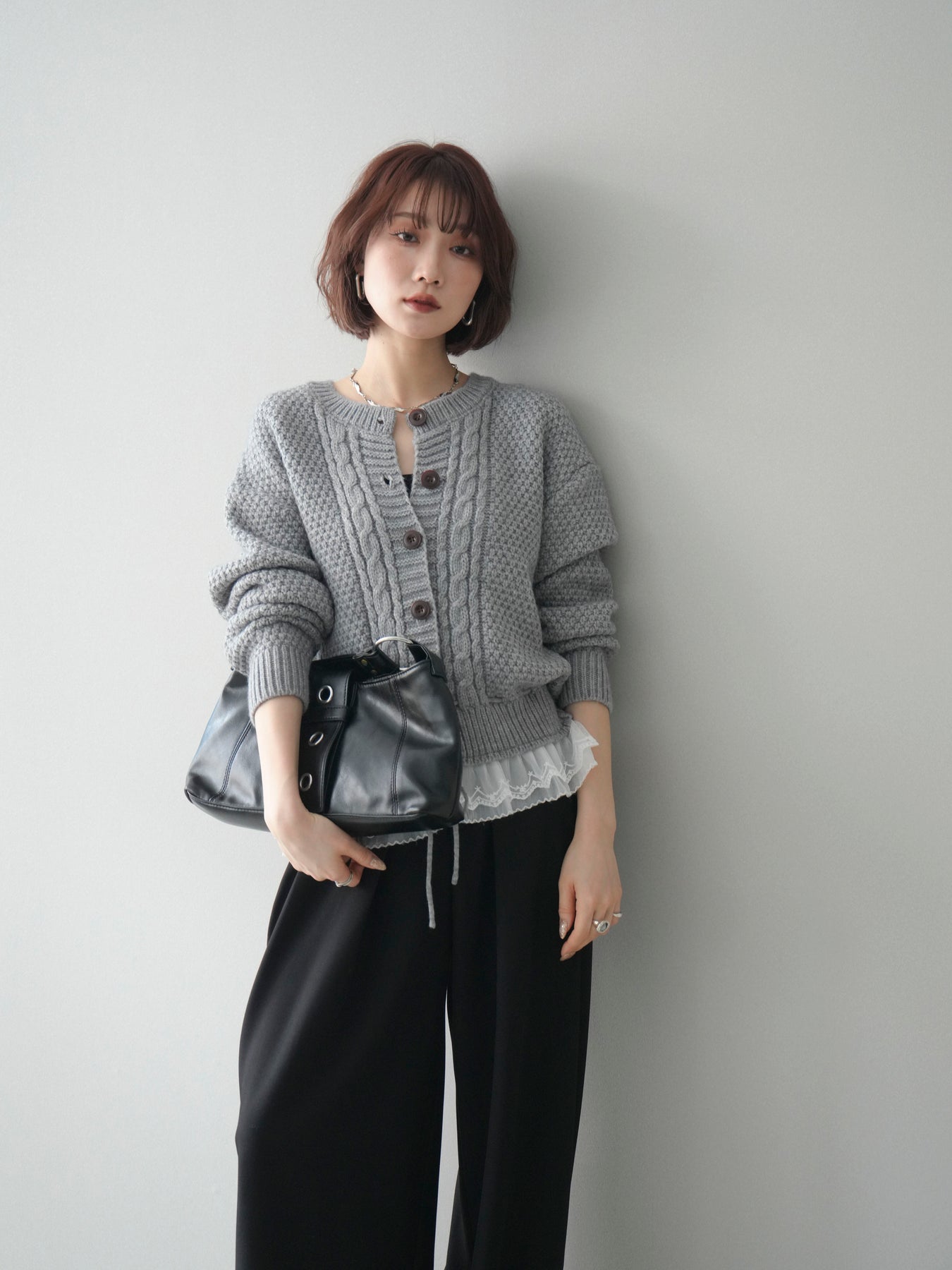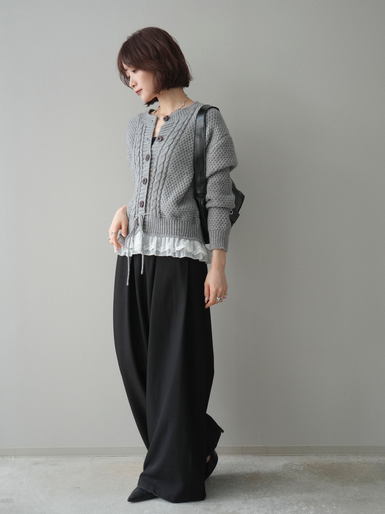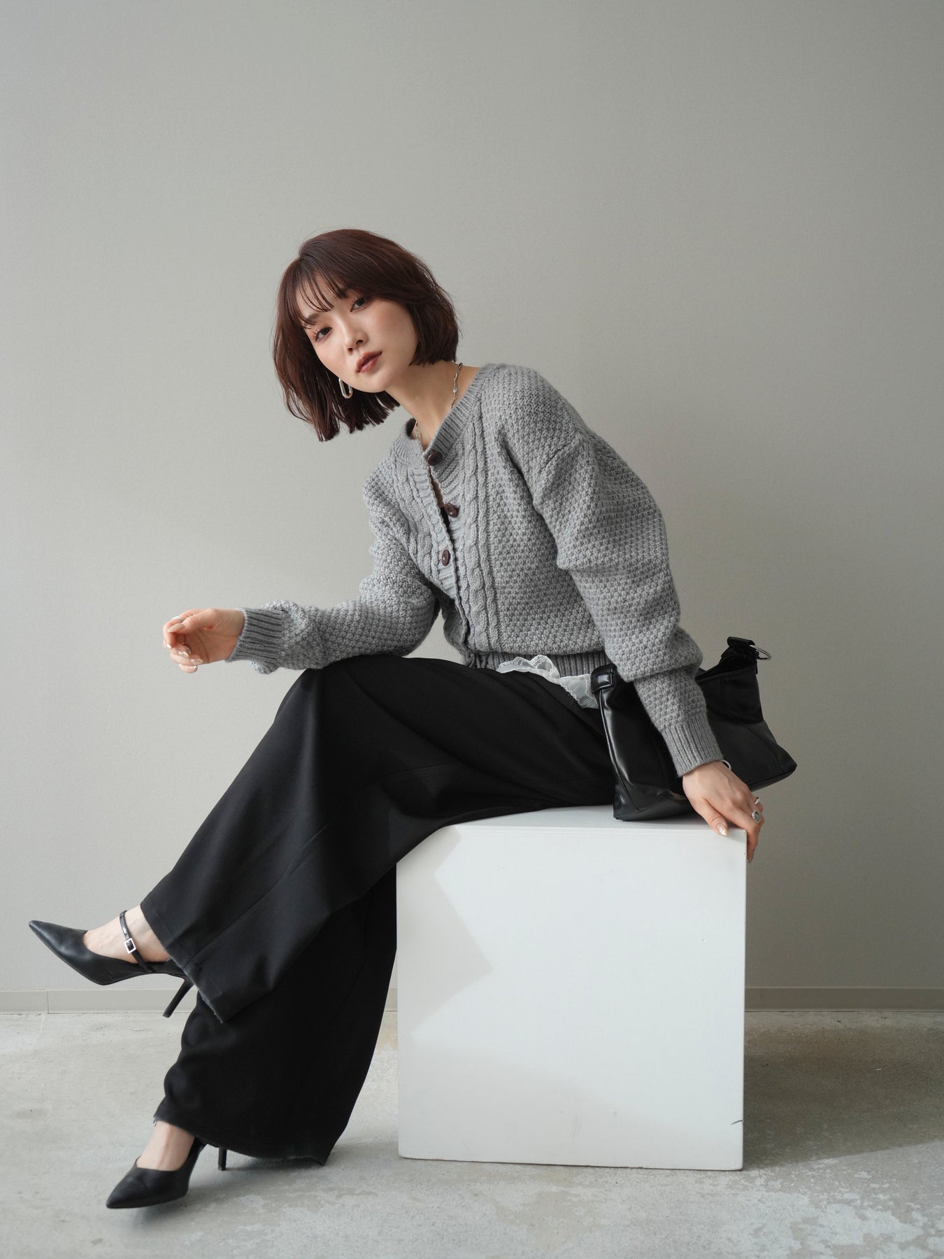 [SET]裾レースケーブルニットカーディガン+ベルトループデザインワイドパンツ(2set)