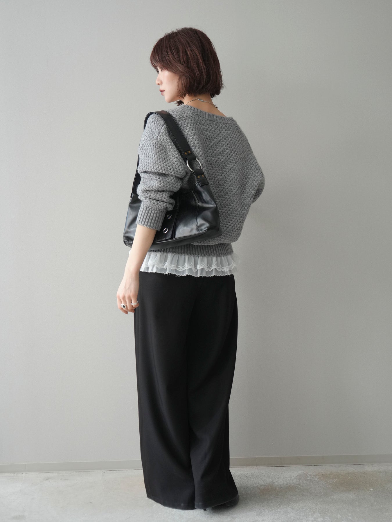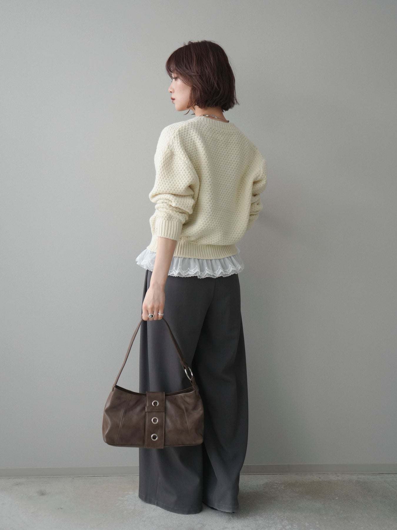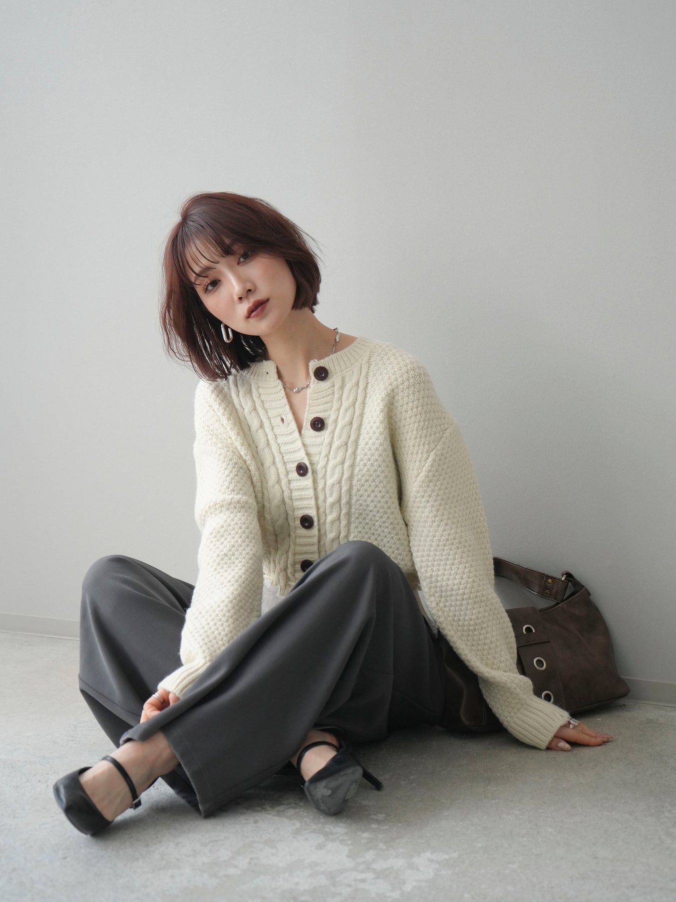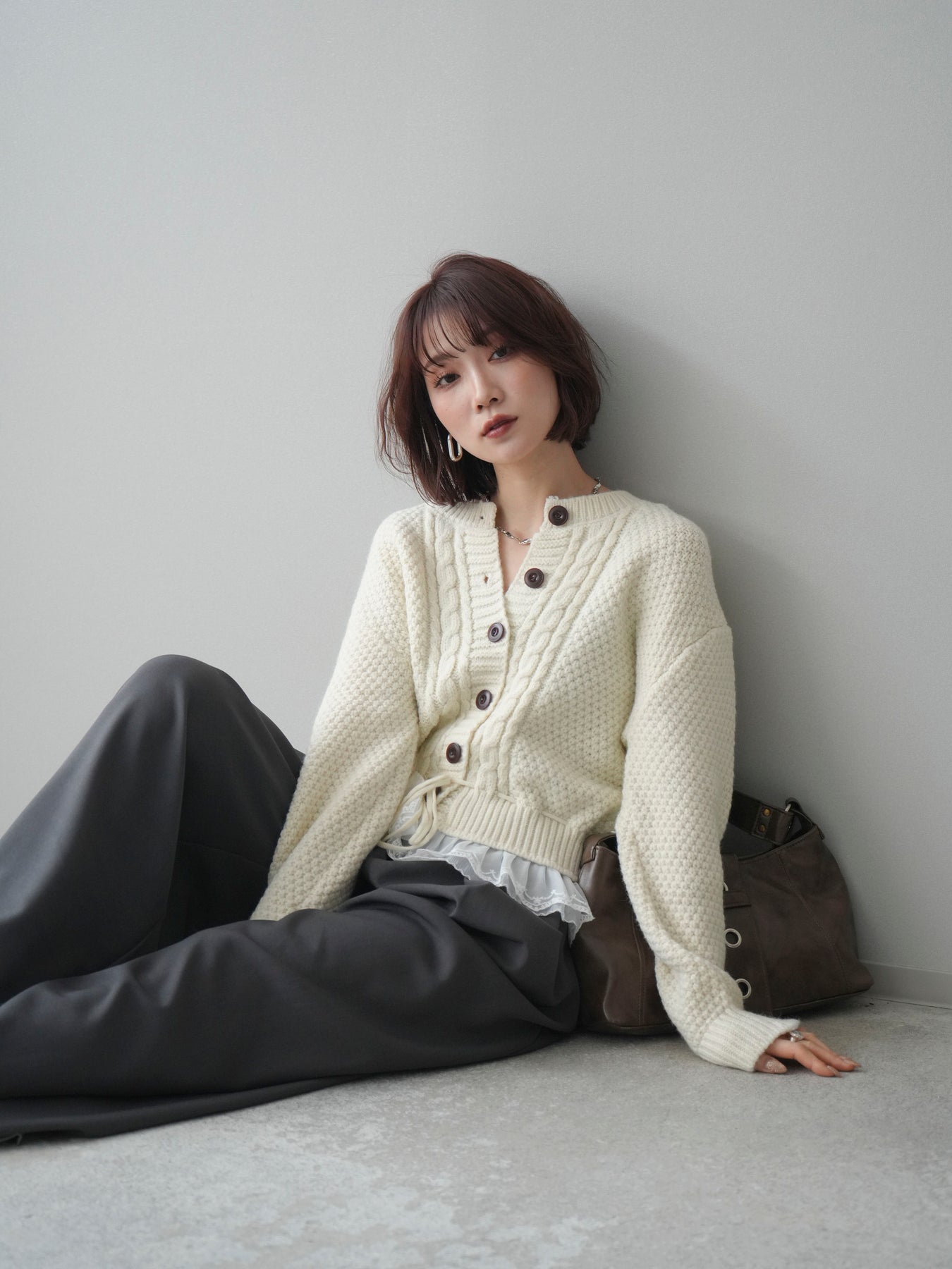 [SET]裾レースケーブルニットカーディガン+ベルトループデザインワイドパンツ(2set)