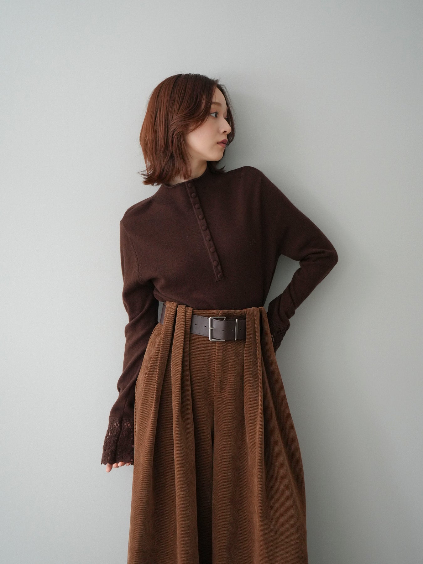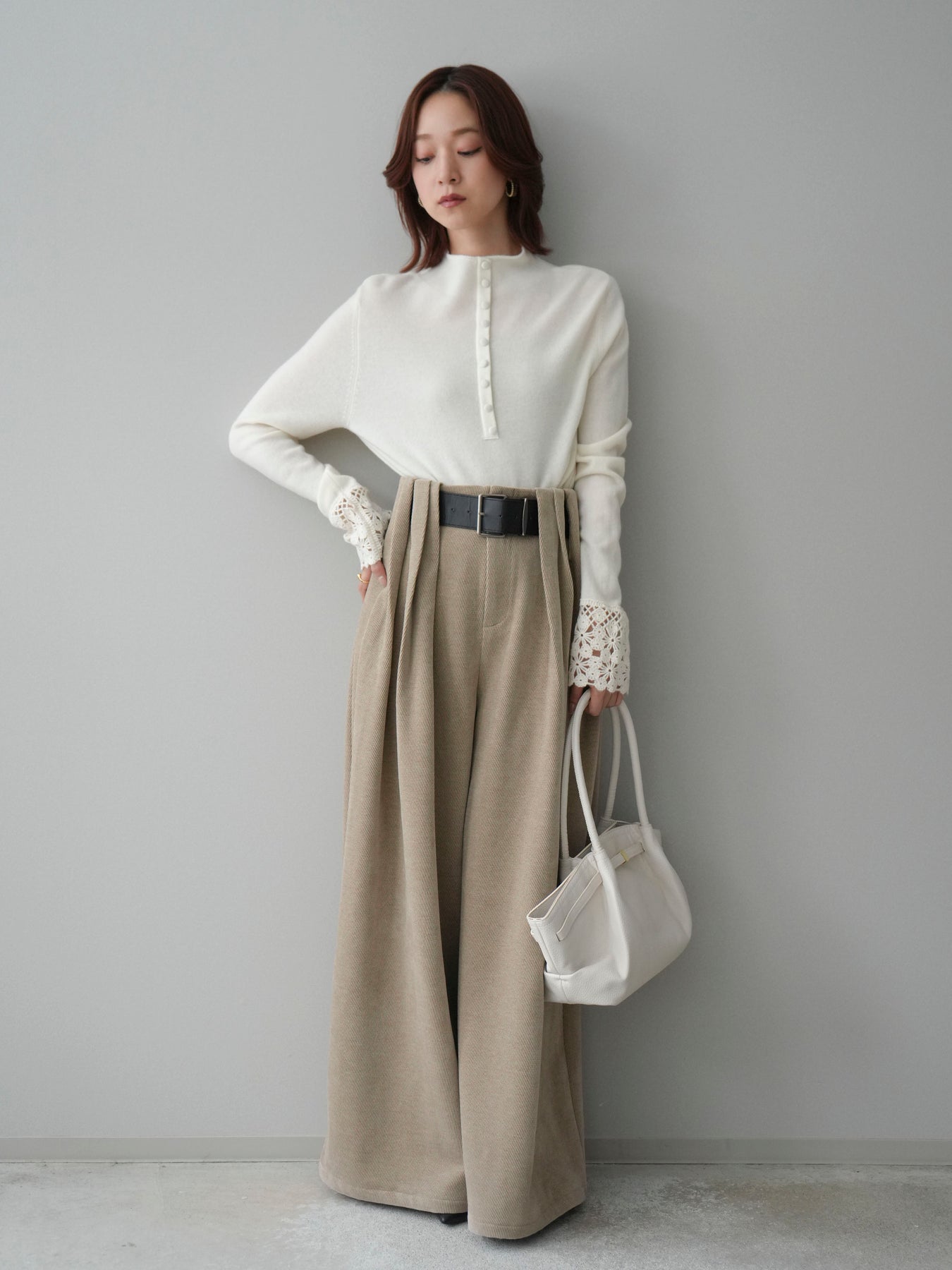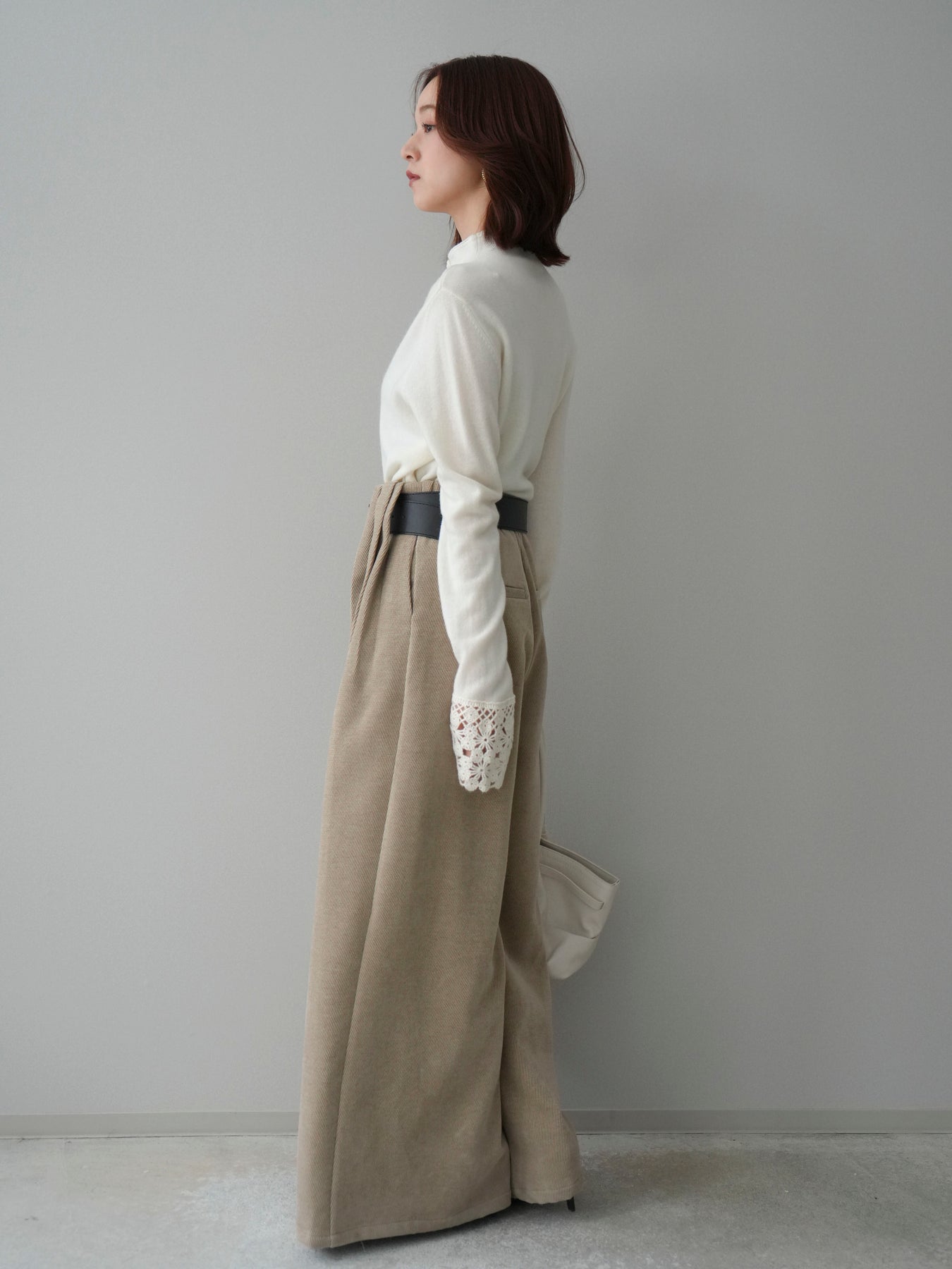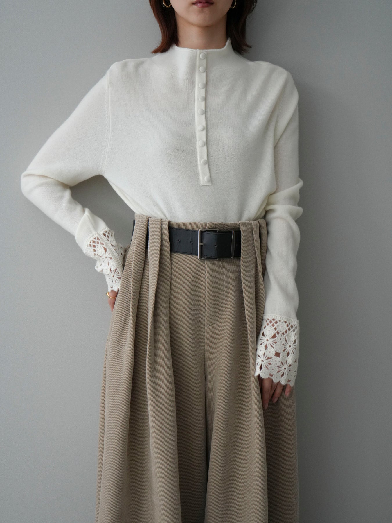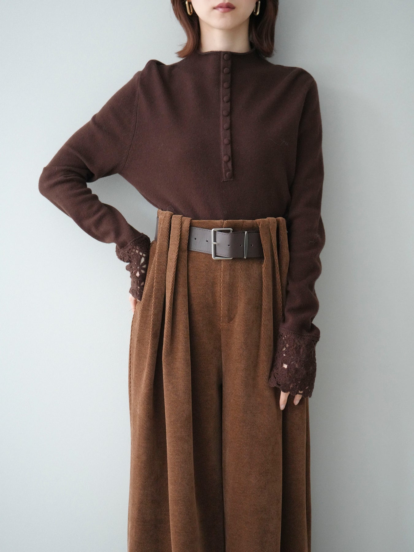 [SET]袖スカラップレースフロントボタンウールニットトップス+ベルトデザインループコールテンワイドパンツ(ベルト付き)(2set)