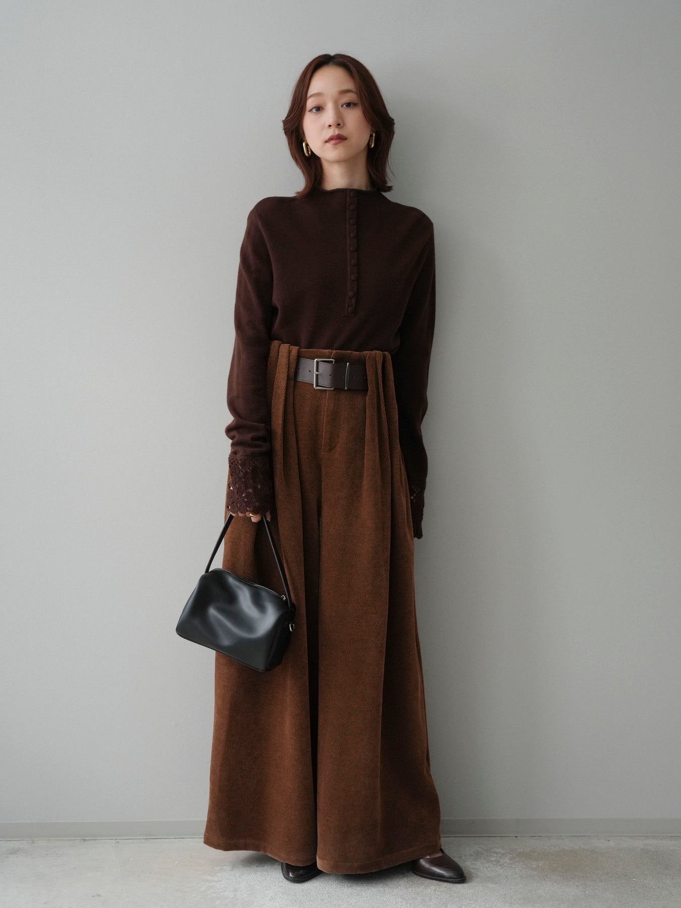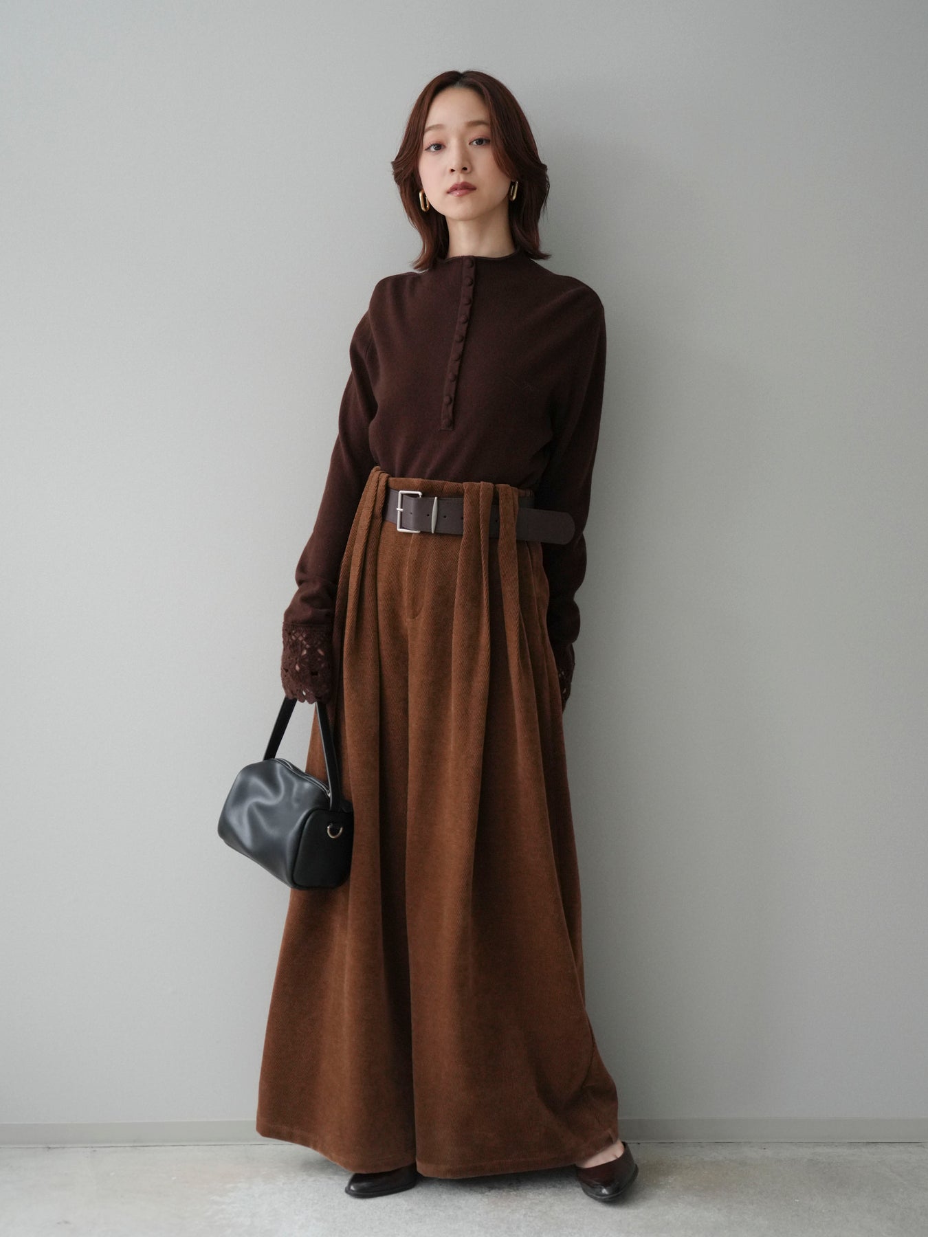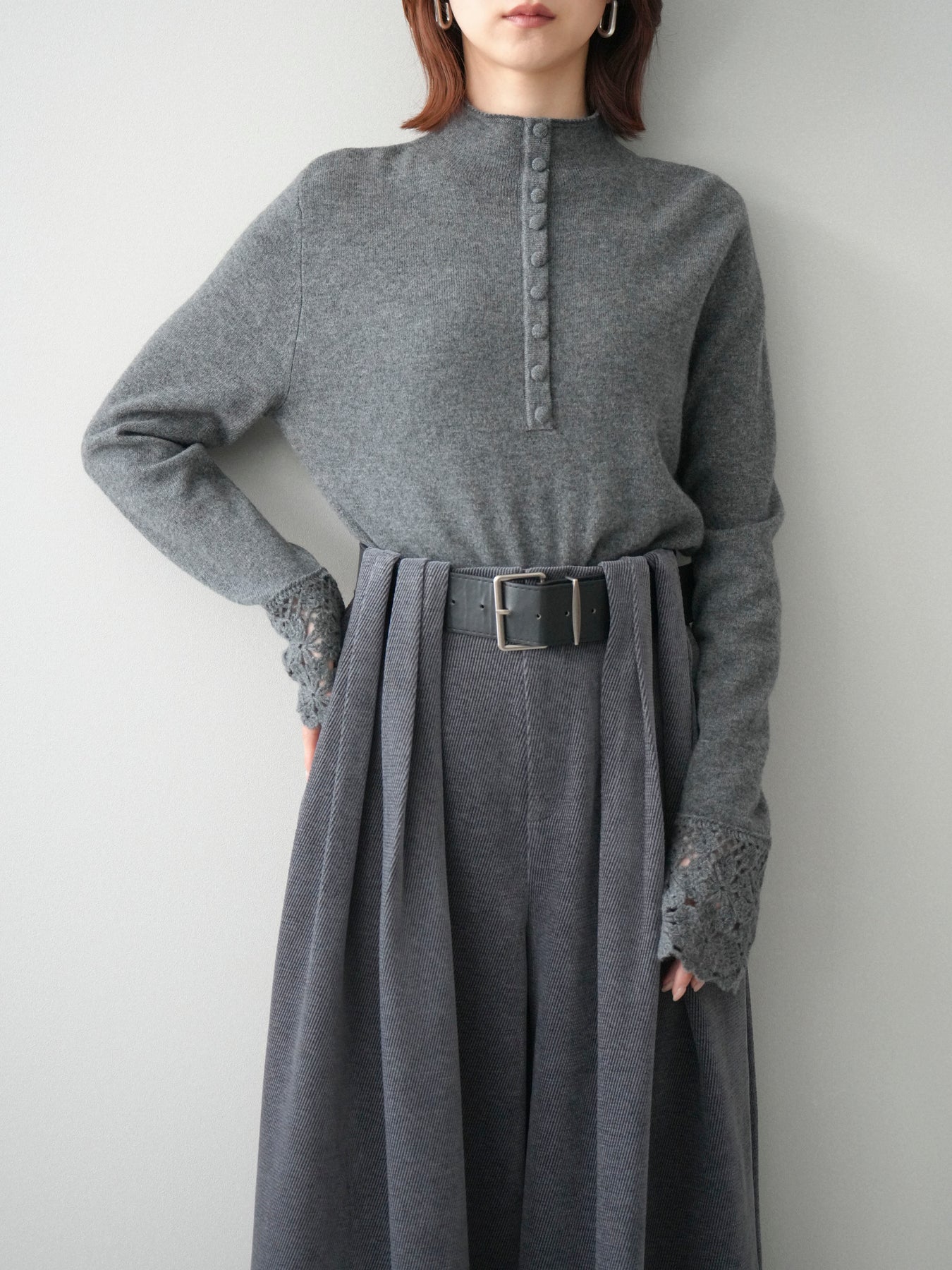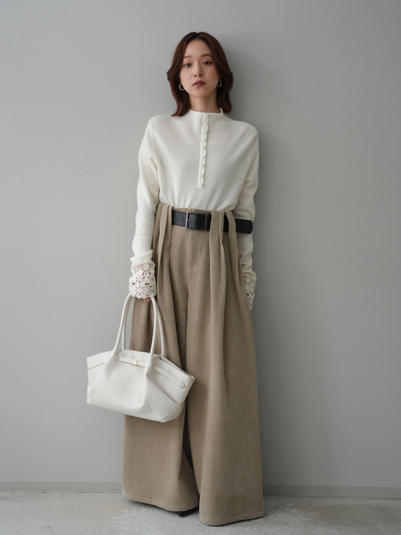 [SET]袖スカラップレースフロントボタンウールニットトップス+ベルトデザインループコールテンワイドパンツ(ベルト付き)(2set)