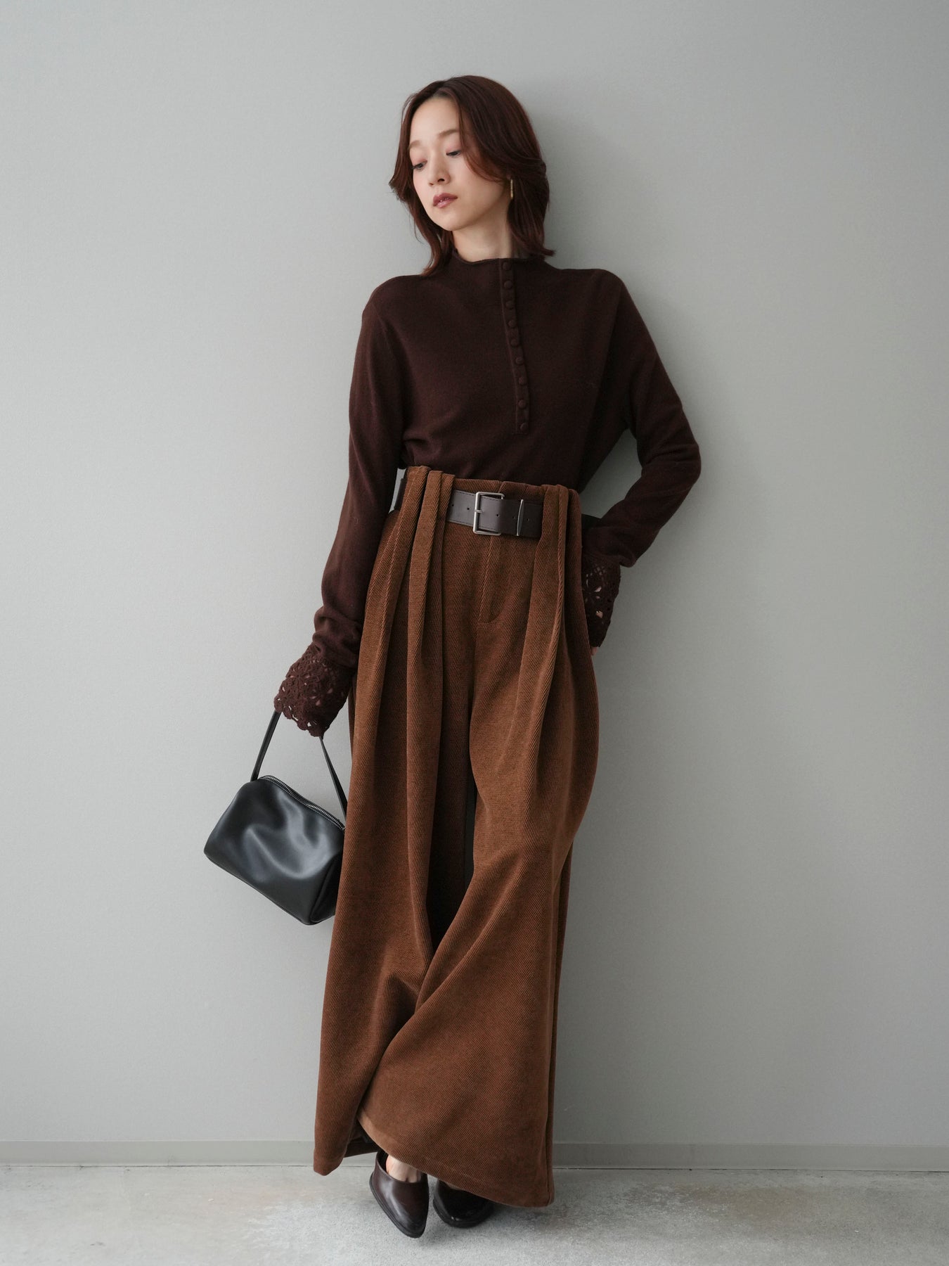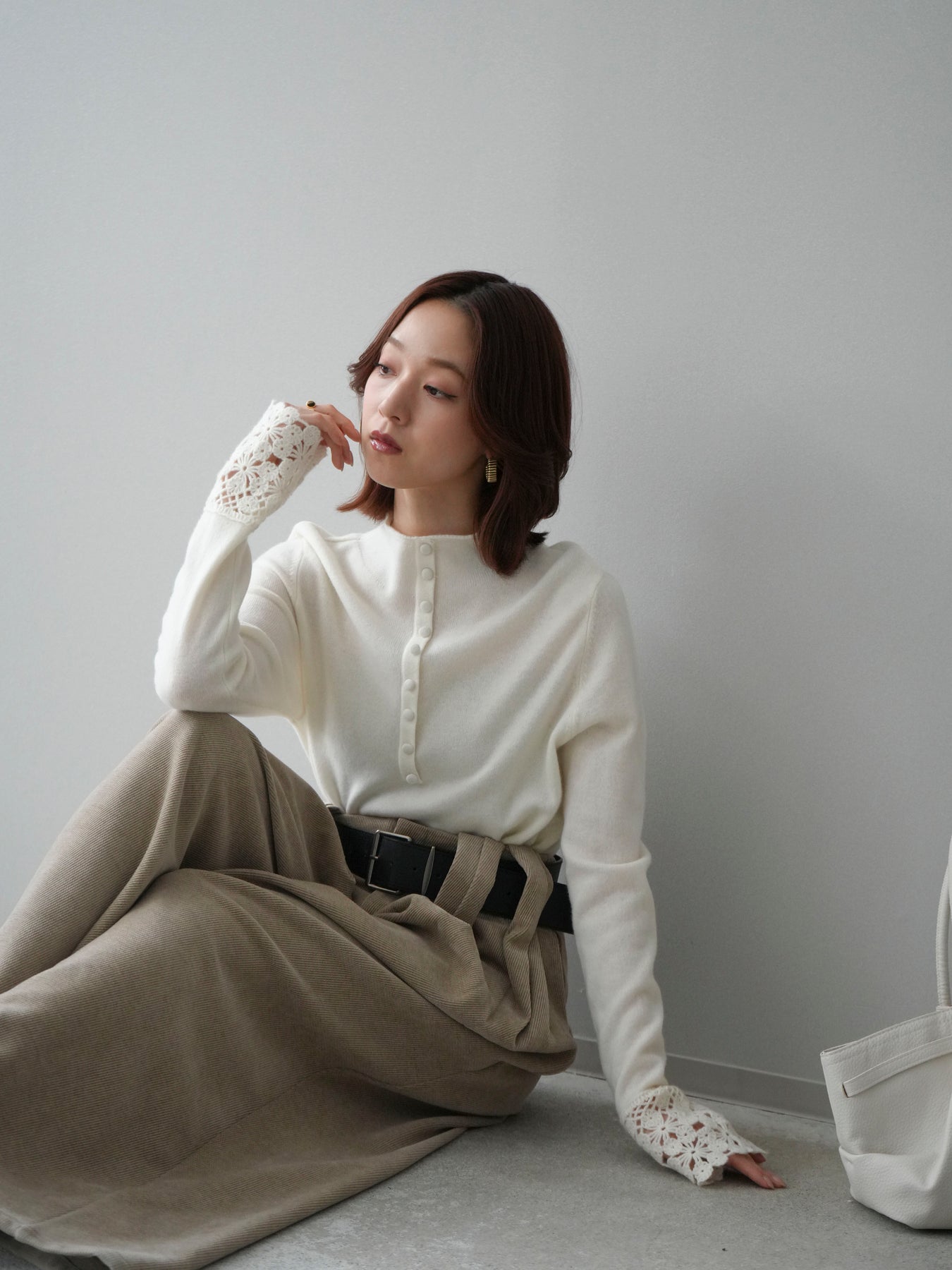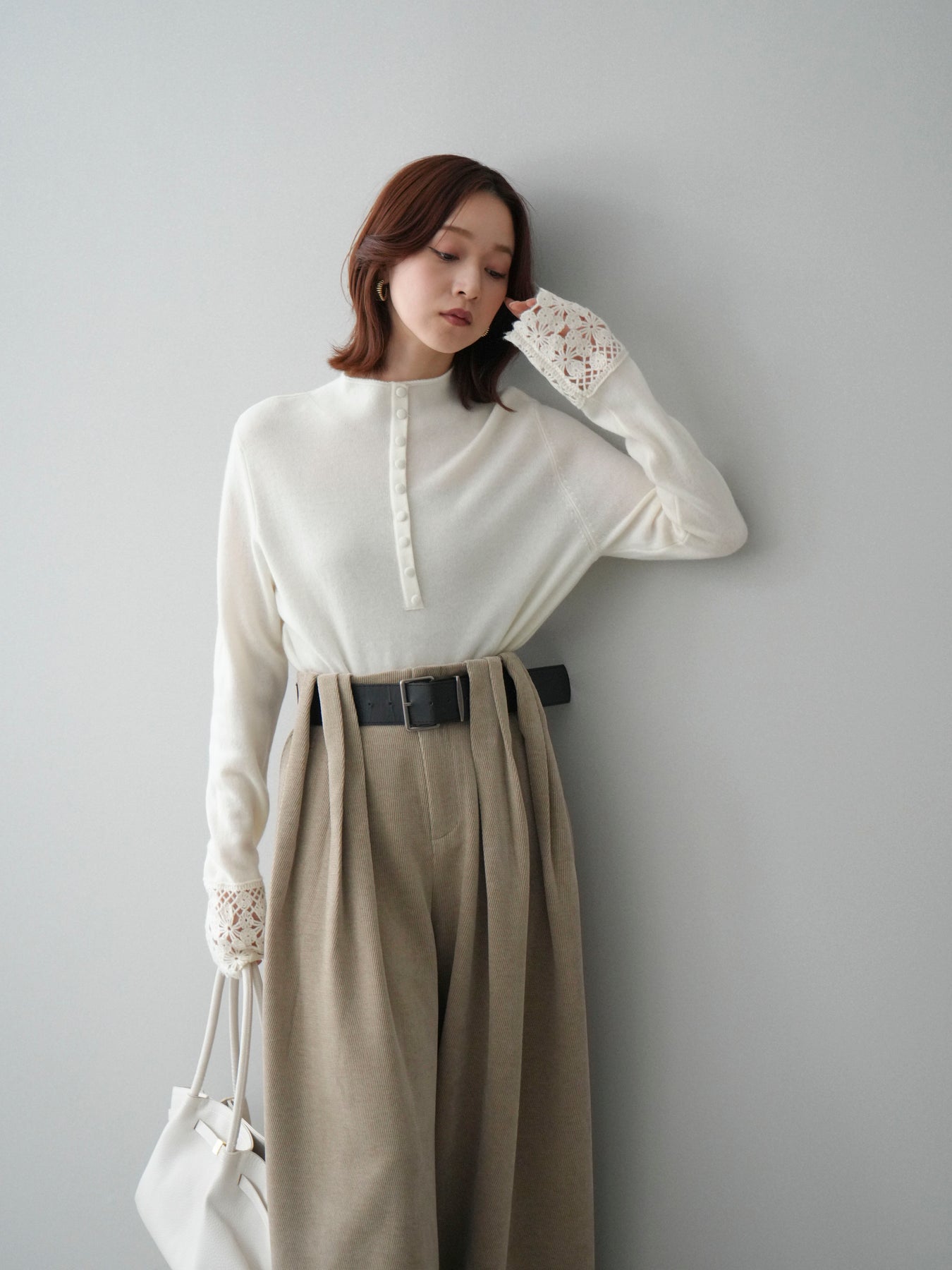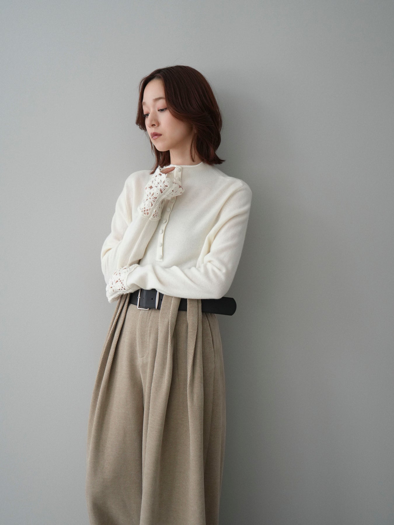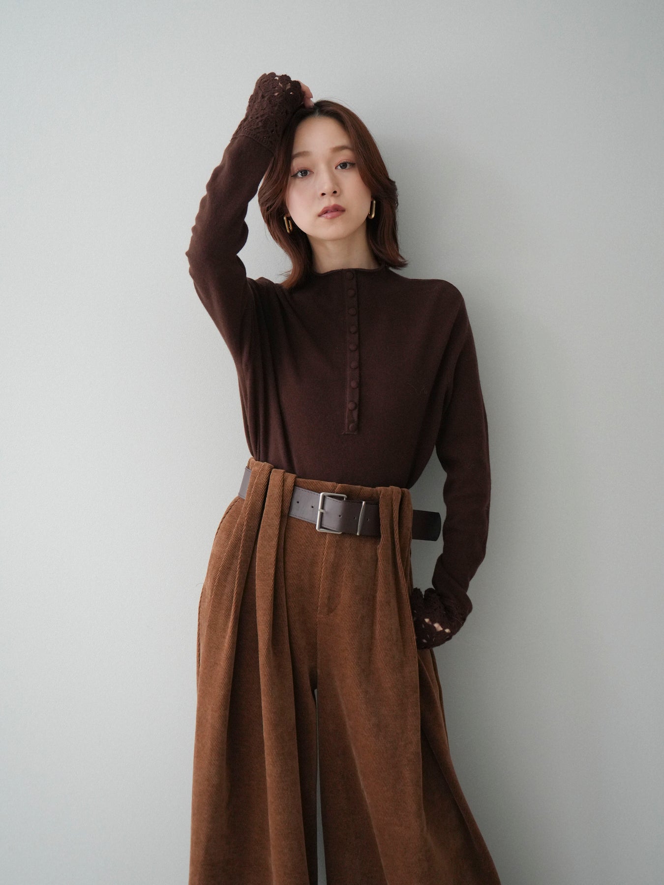 [SET]袖スカラップレースフロントボタンウールニットトップス+ベルトデザインループコールテンワイドパンツ(ベルト付き)(2set)