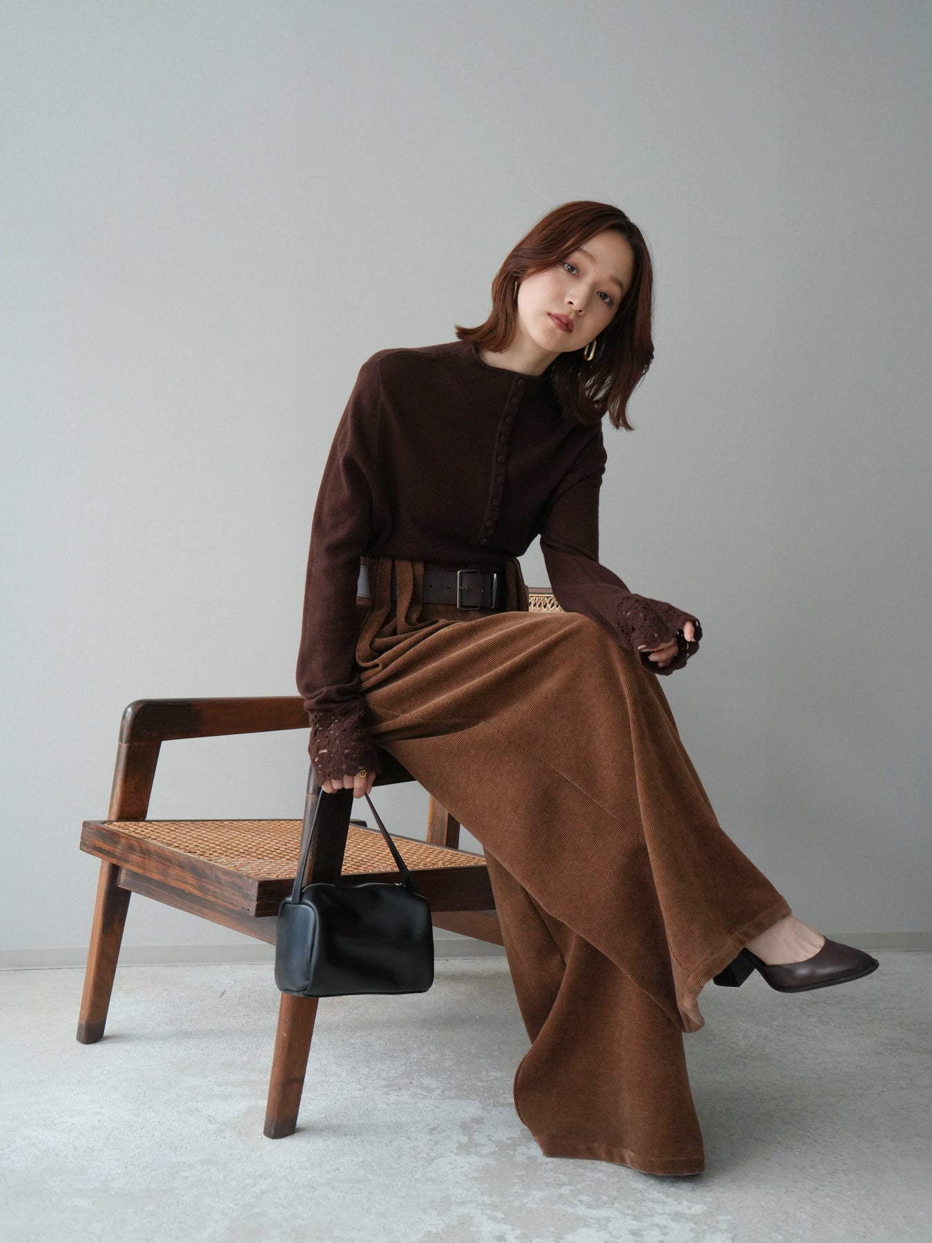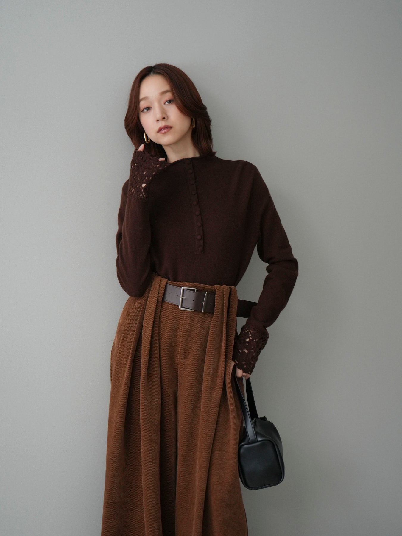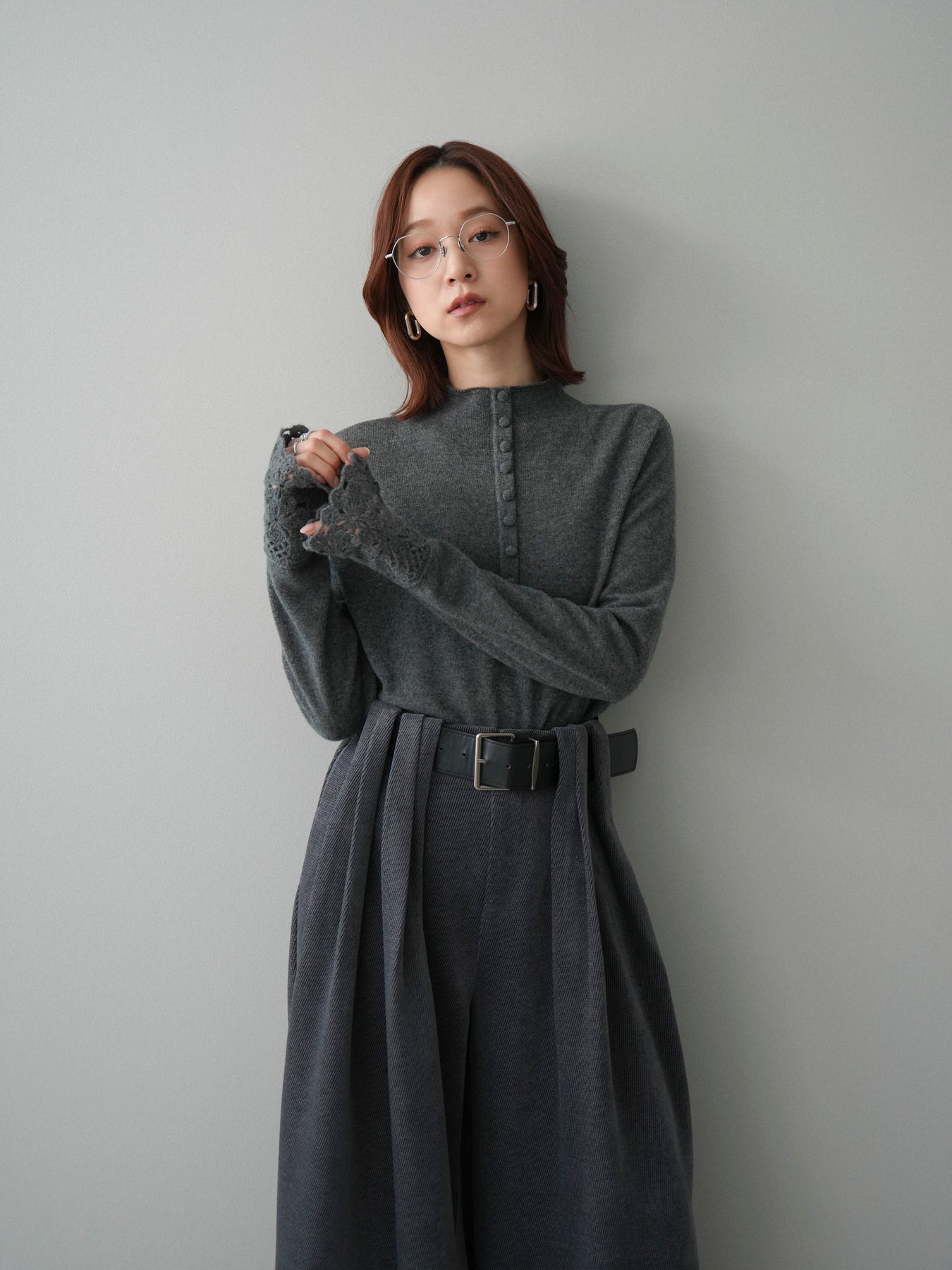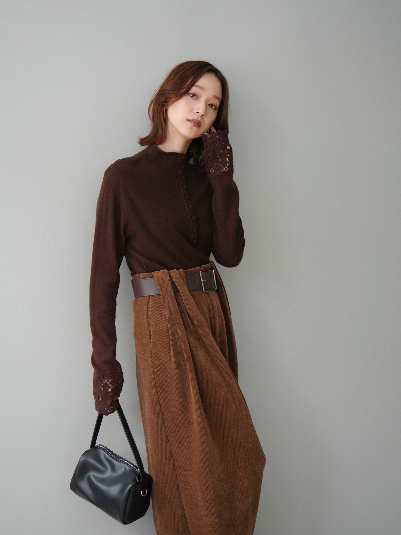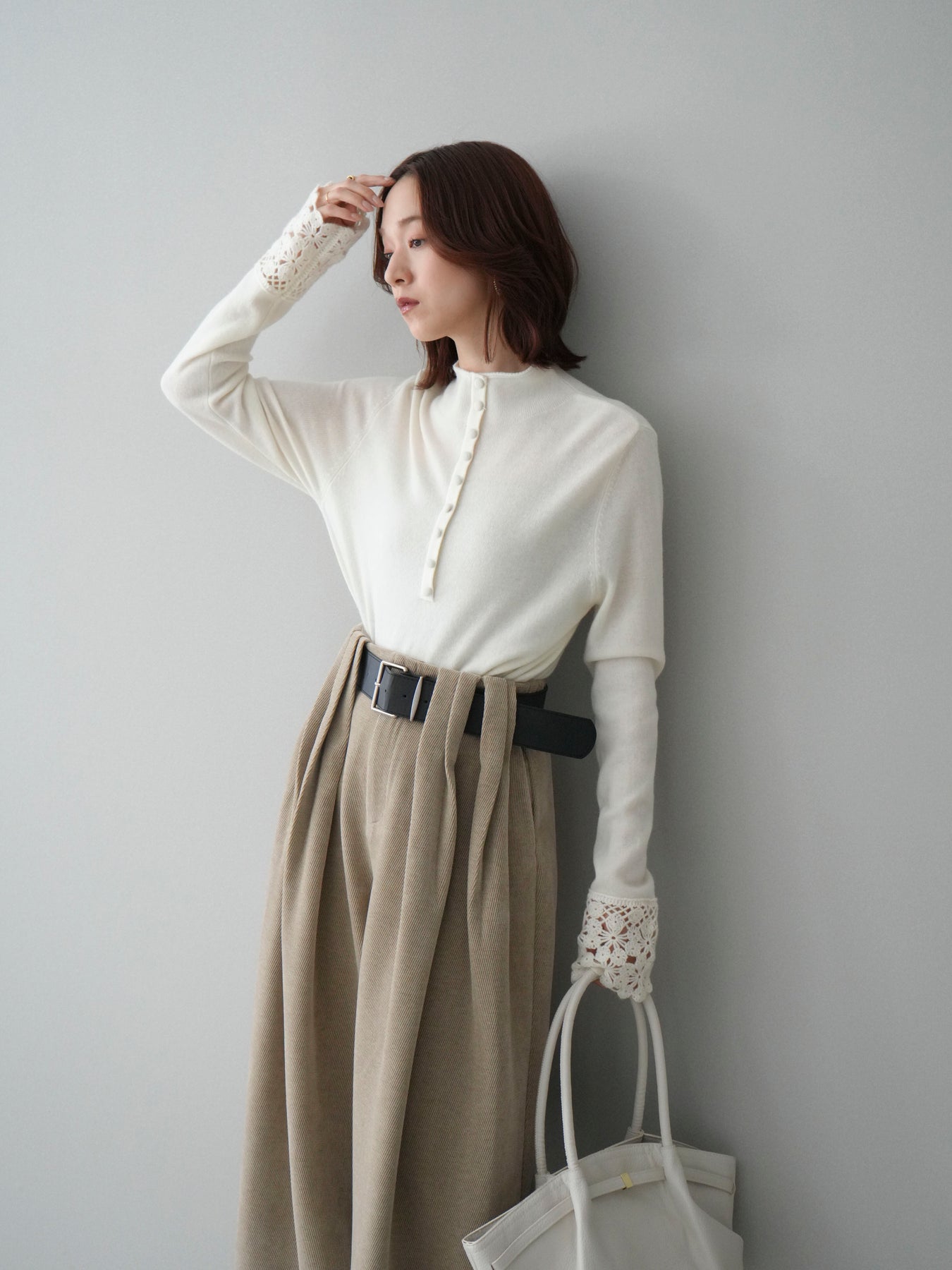 [SET]袖スカラップレースフロントボタンウールニットトップス+ベルトデザインループコールテンワイドパンツ(ベルト付き)(2set)