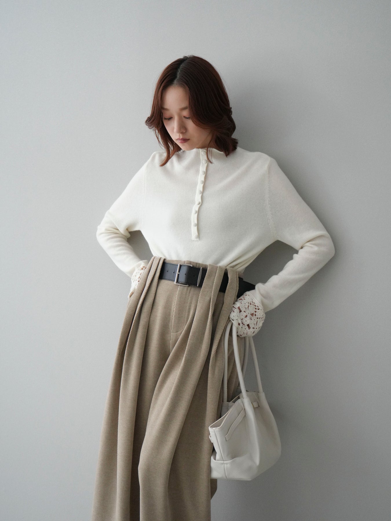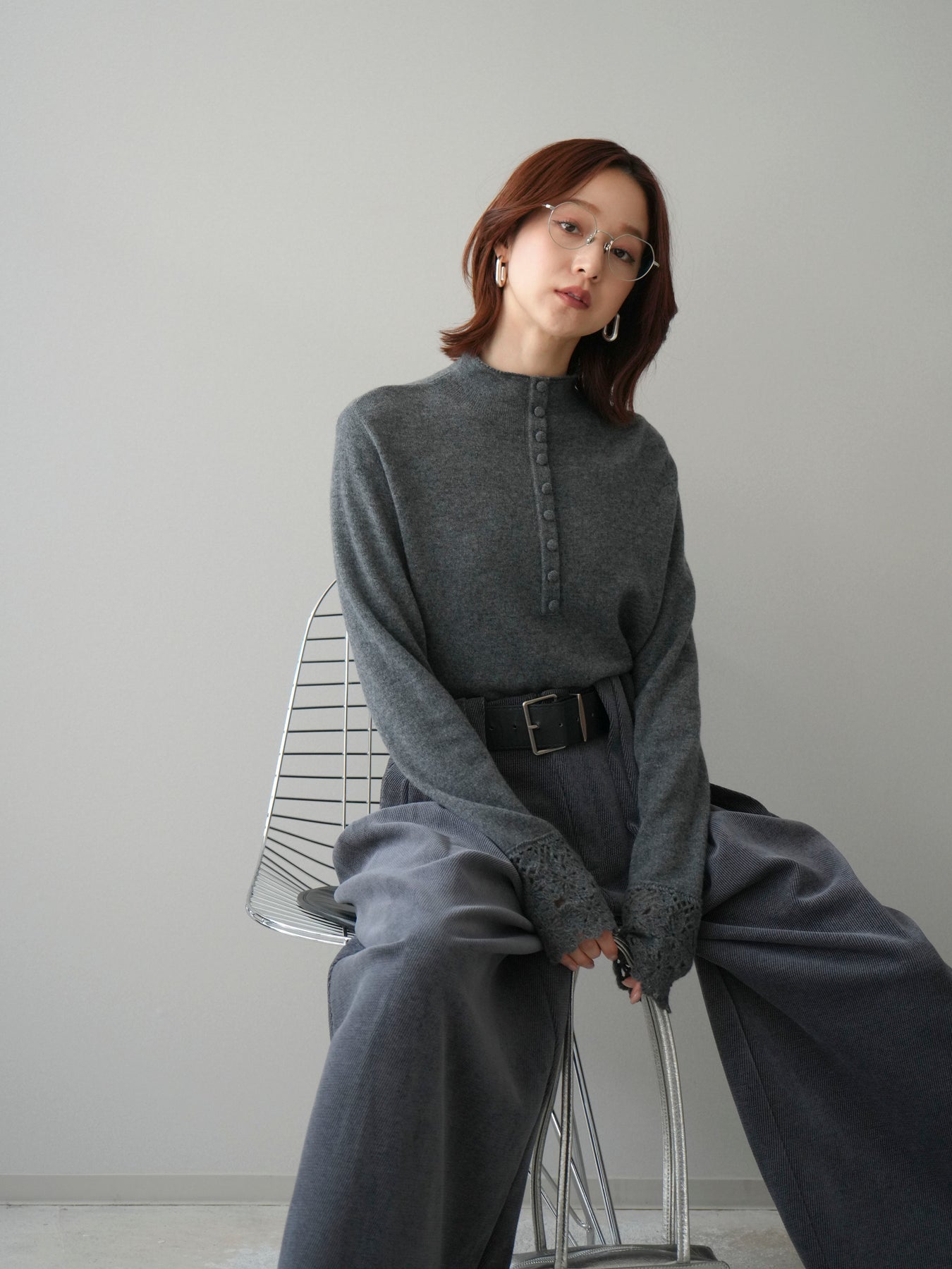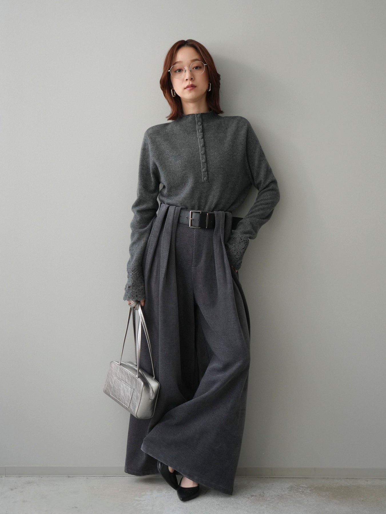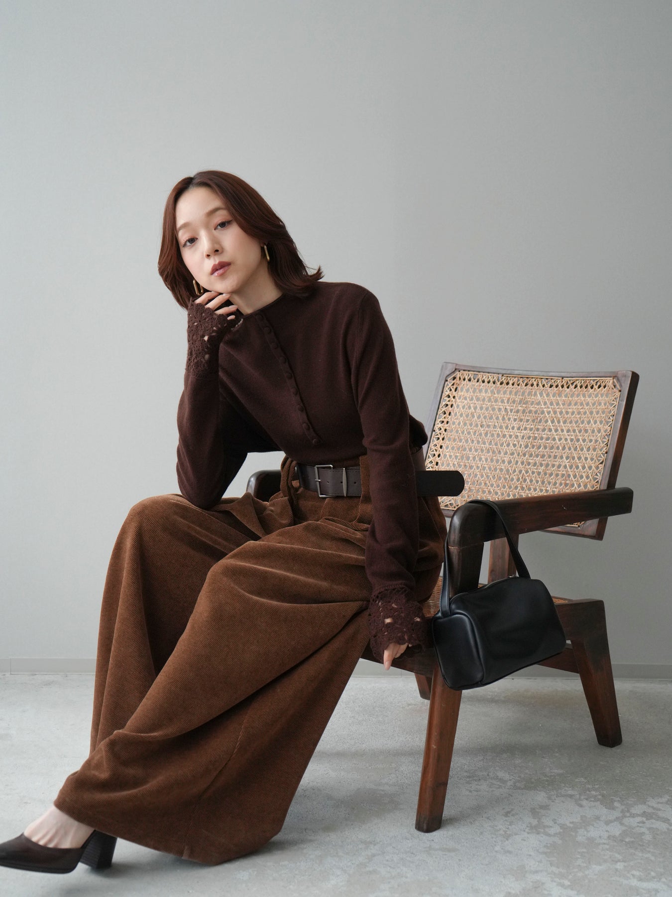 [SET]袖スカラップレースフロントボタンウールニットトップス+ベルトデザインループコールテンワイドパンツ(ベルト付き)(2set)