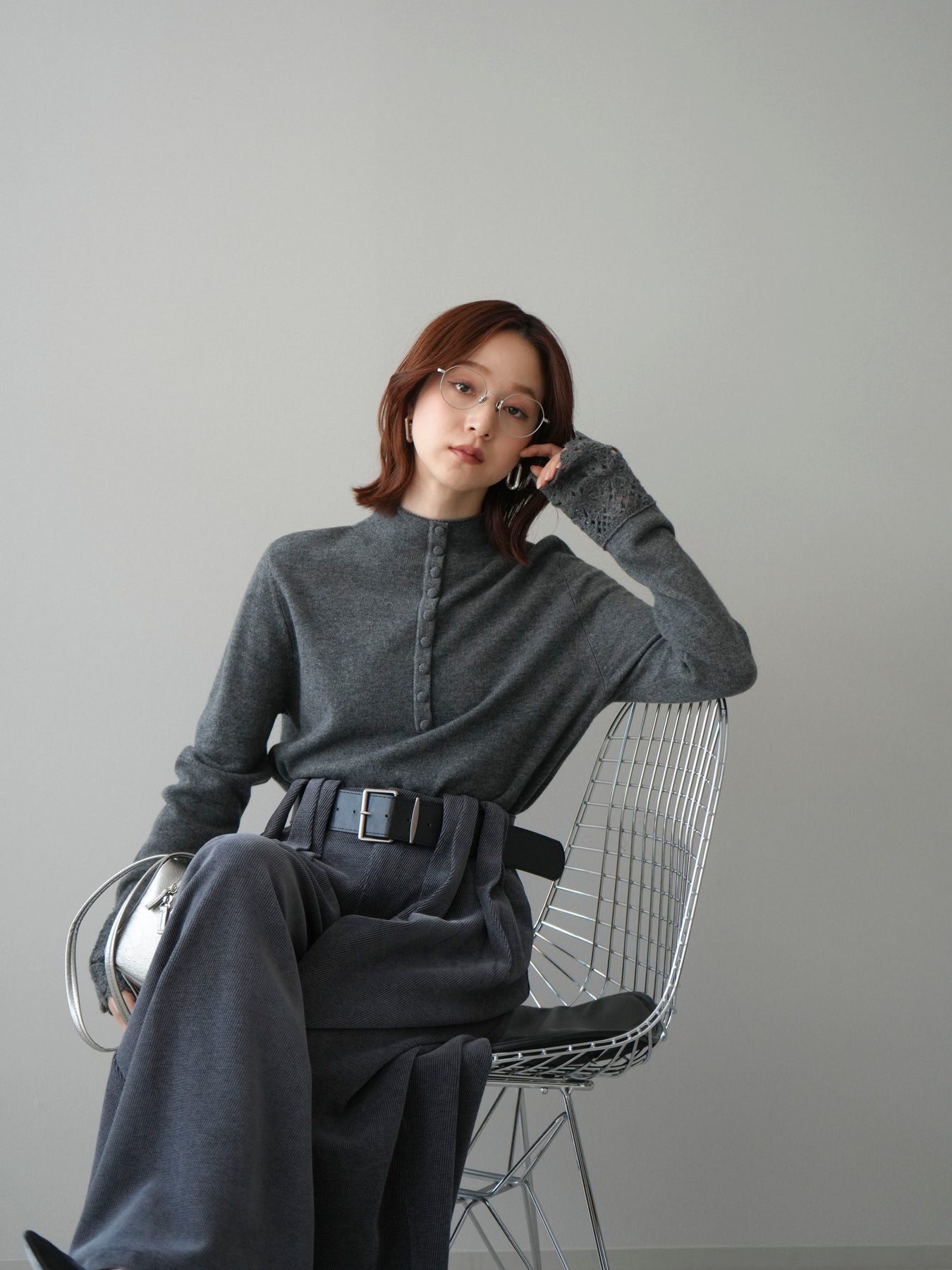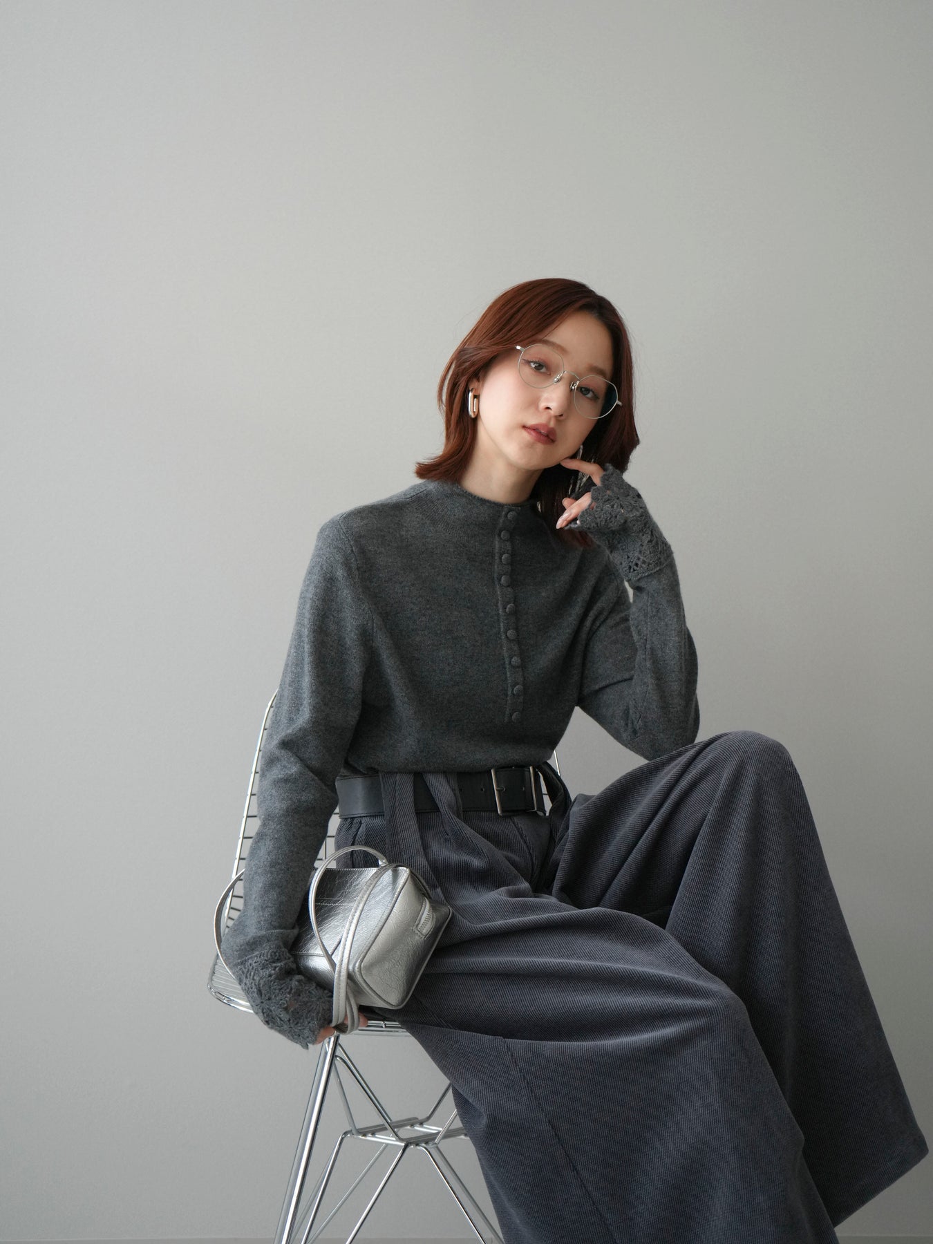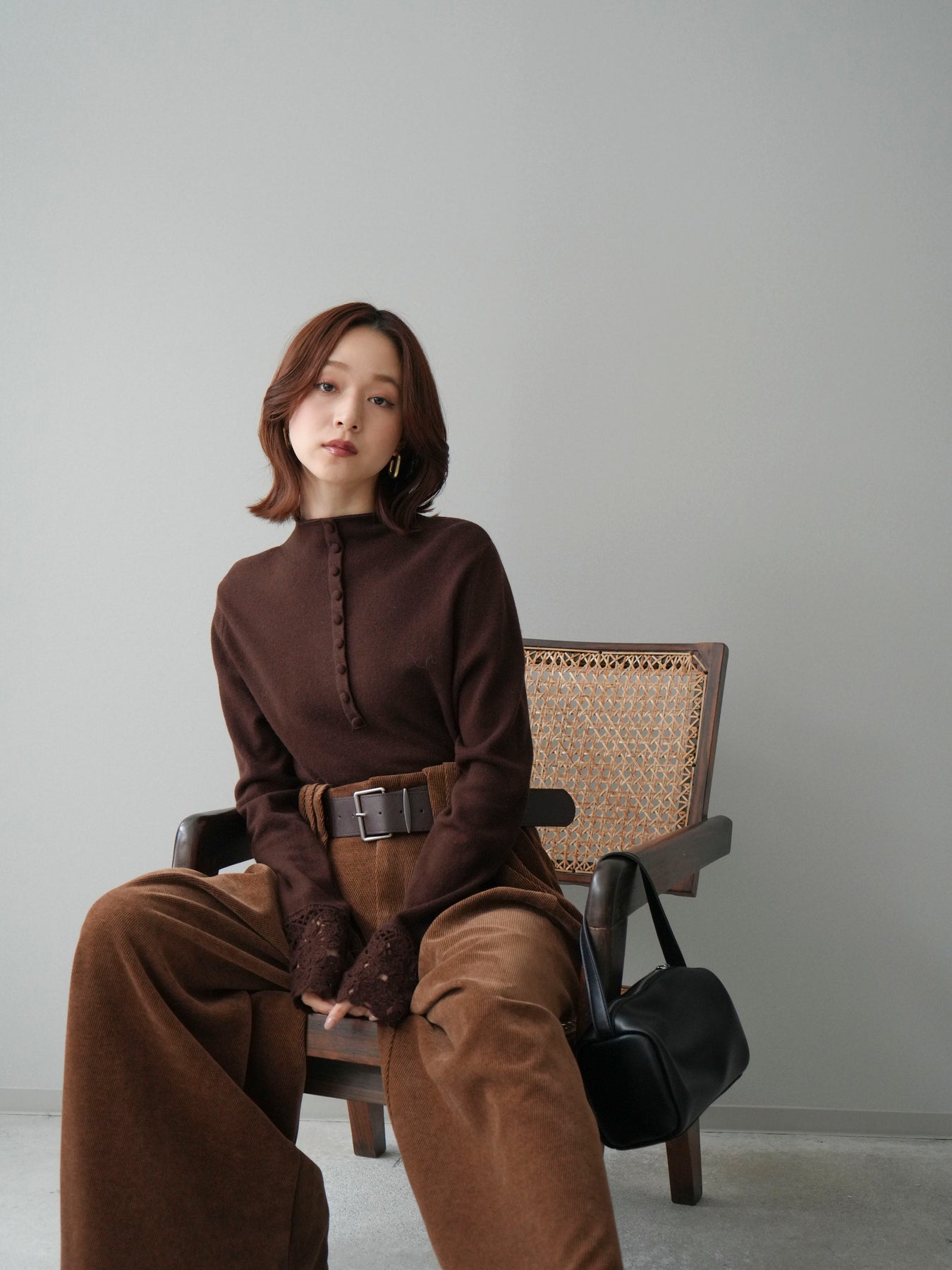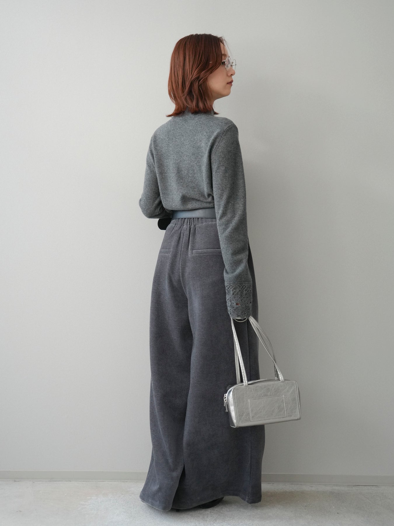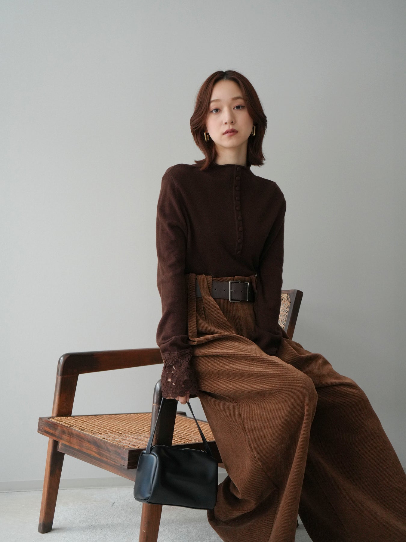 [SET]袖スカラップレースフロントボタンウールニットトップス+ベルトデザインループコールテンワイドパンツ(ベルト付き)(2set)