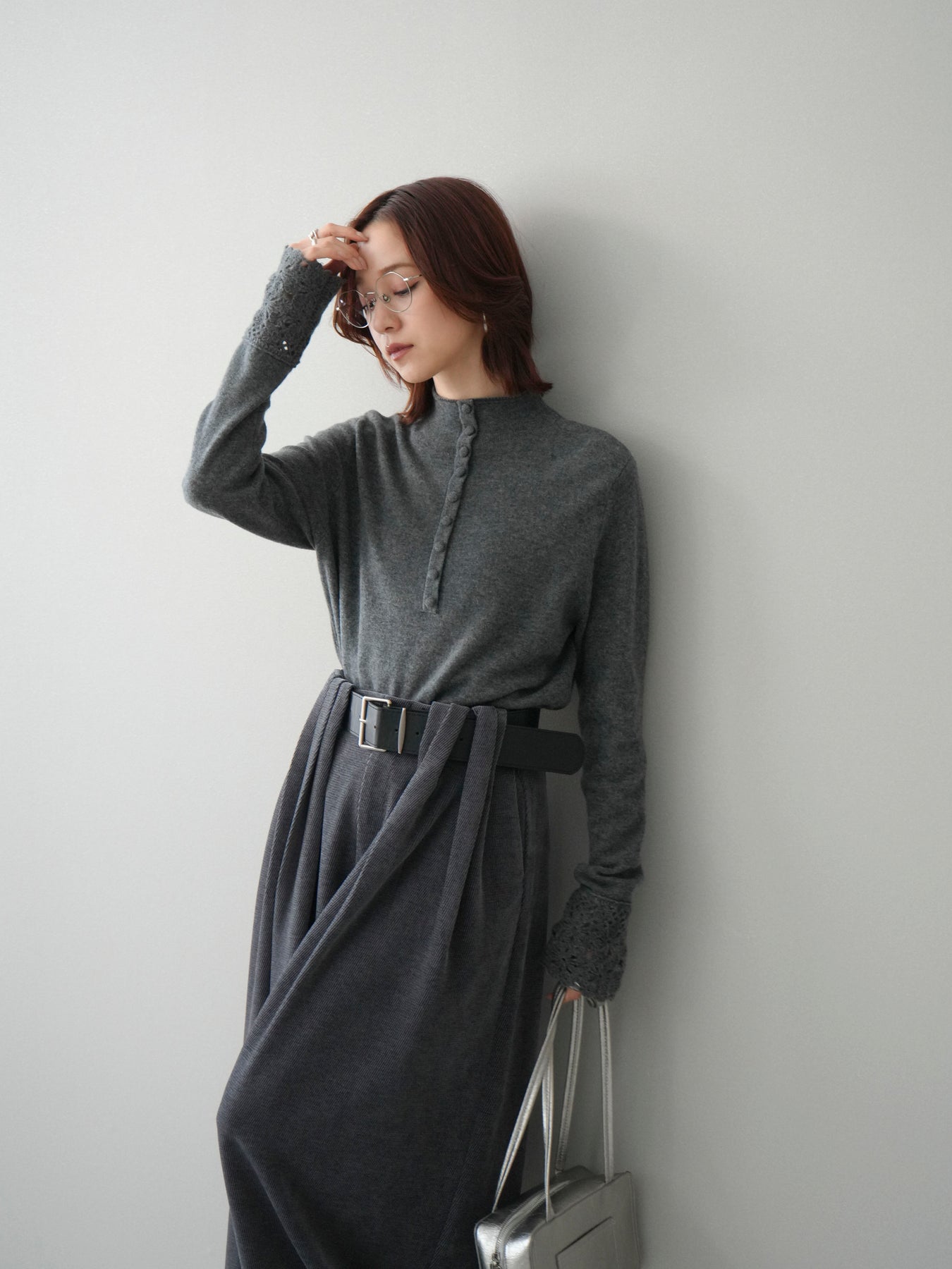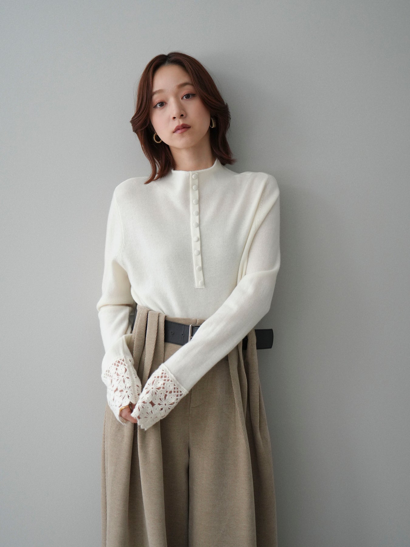 ふんわりとした質感と女性らしさを兼ね備えたウール混ニットトップス。 袖口に施されたスカラップレースが、さりげなく華やかな印象をプラスします。 フロントのくるみボタンデザインがアクセントになり、クラシカルな雰囲気に。 一枚で着映えするアイテムながら、ジャケットやコートのインナーとしても映える万能デザイン。 デイリーはもちろん、ちょっとしたお出かけやオケージョンシーンにもおすすめです。