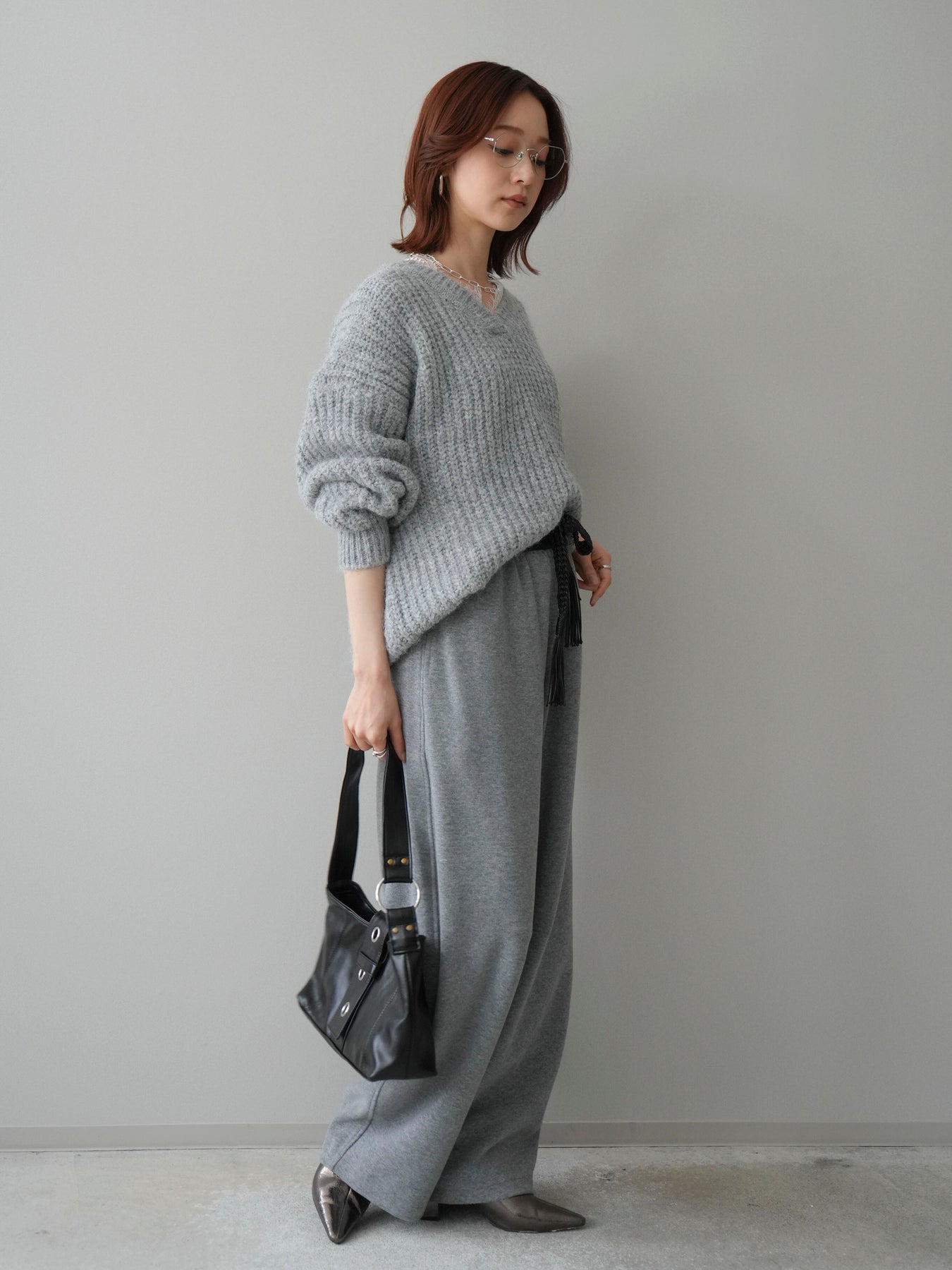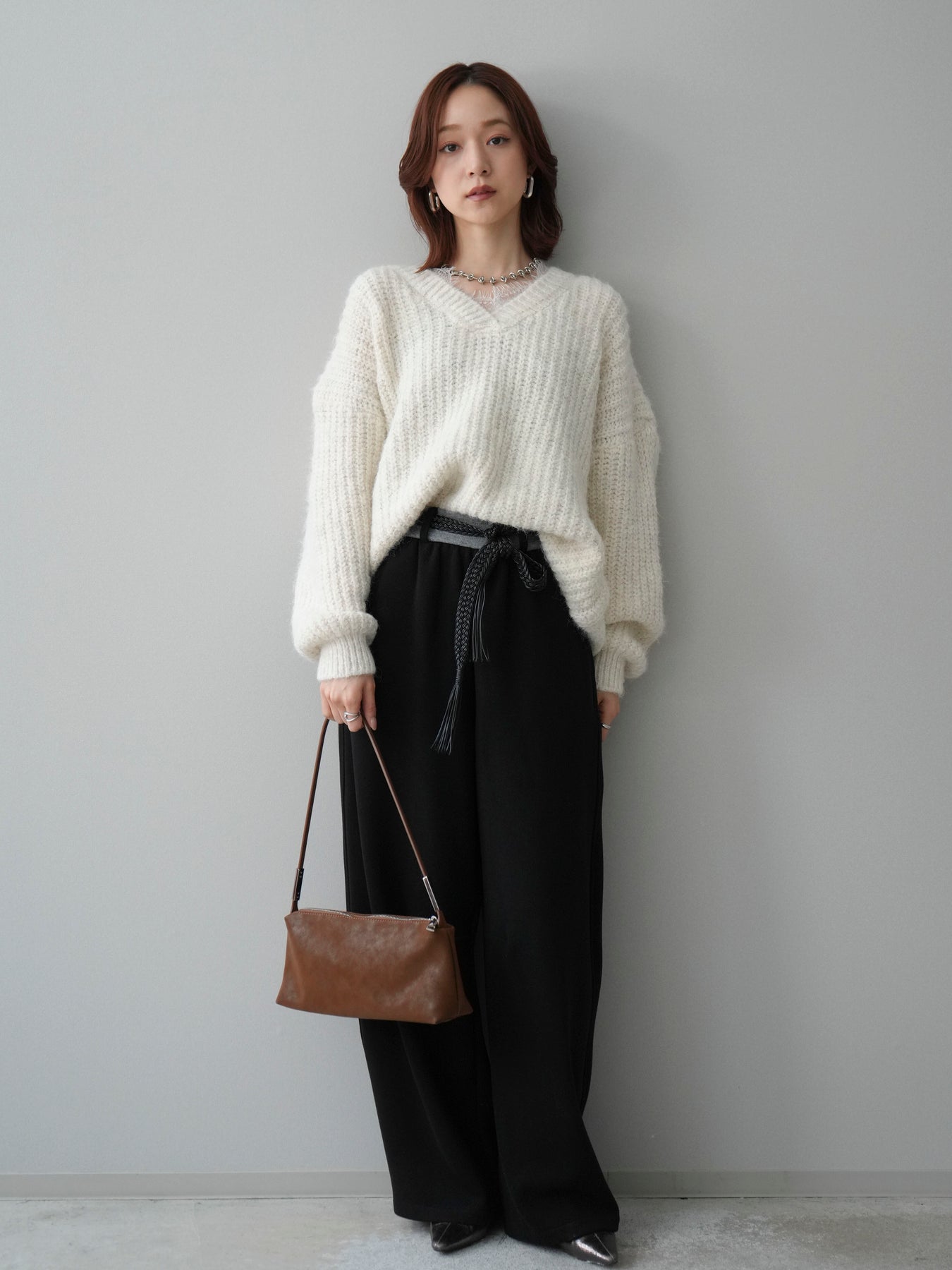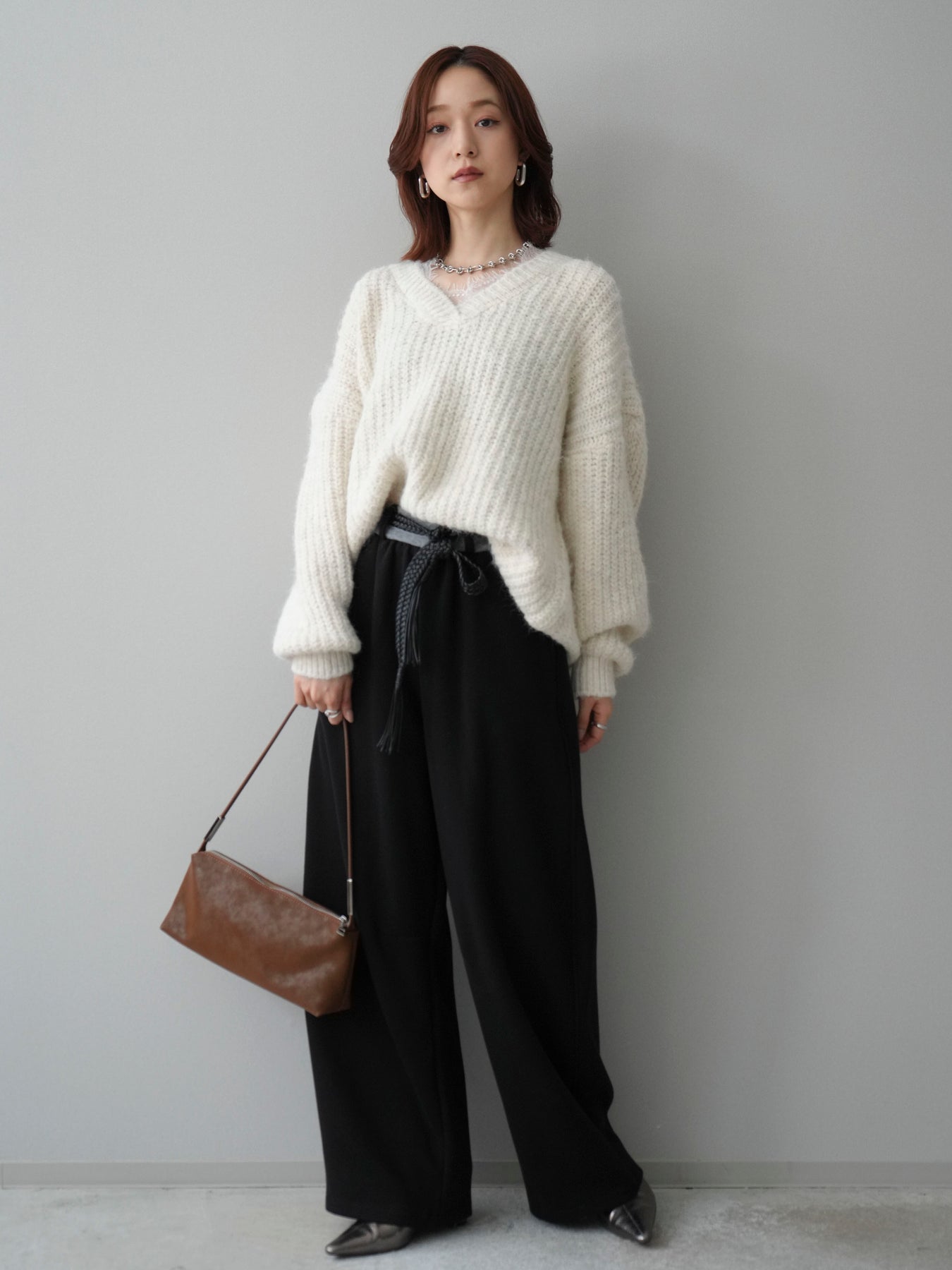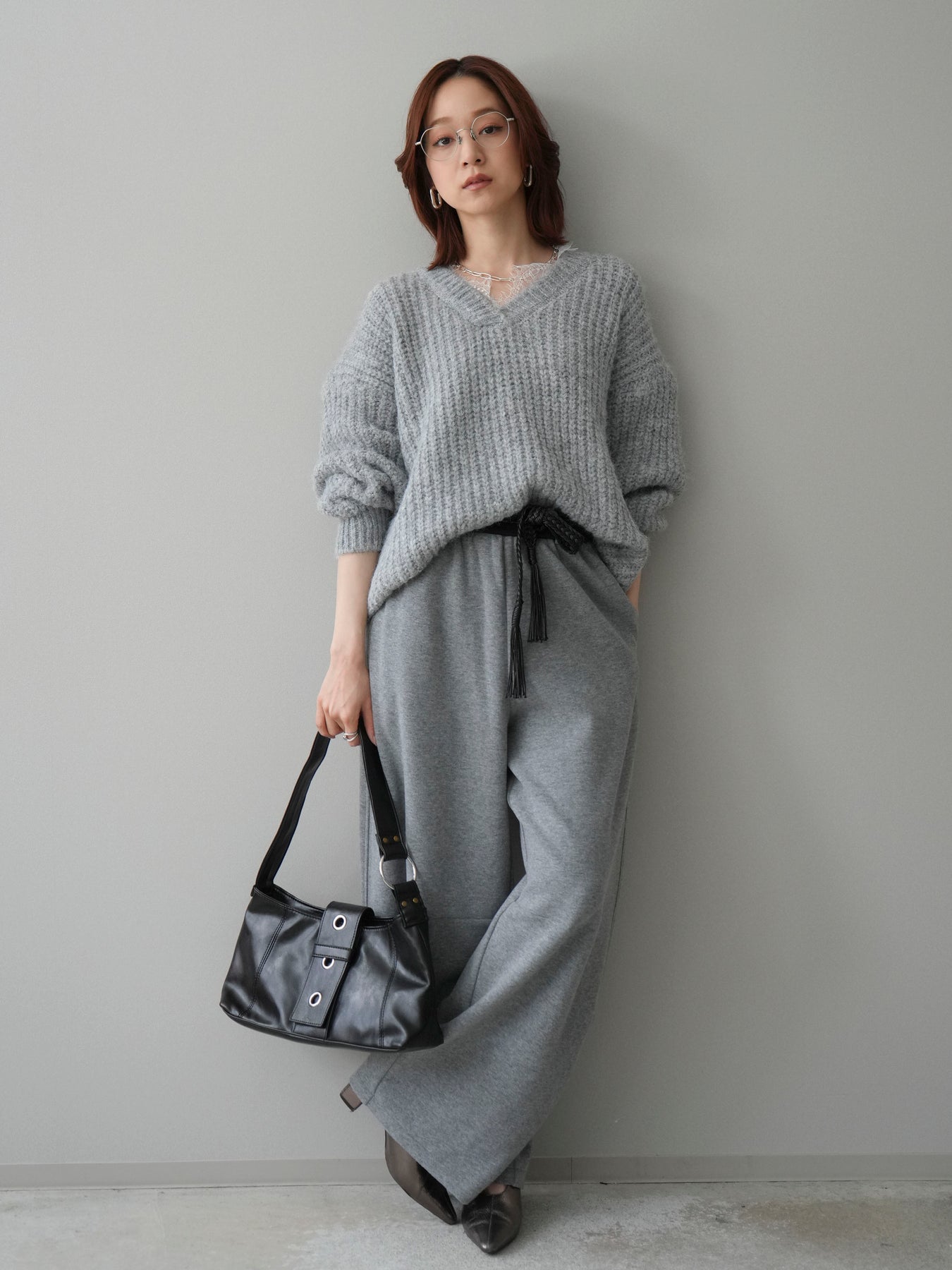 [SET]Vネックレースニットプルオーバー+編み込みベルト付きウエスト配色スエットパンツ(2set)