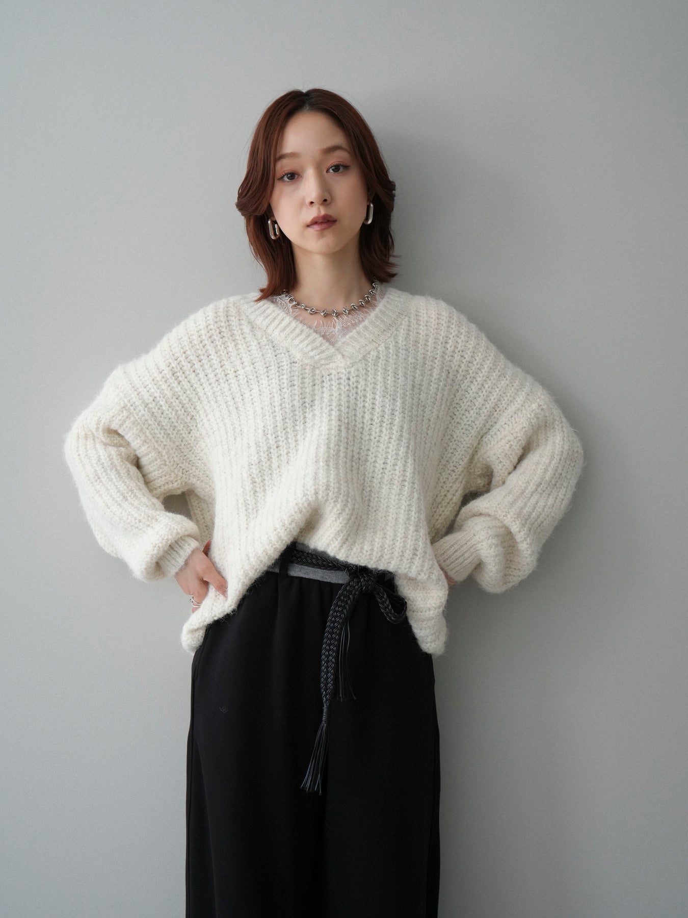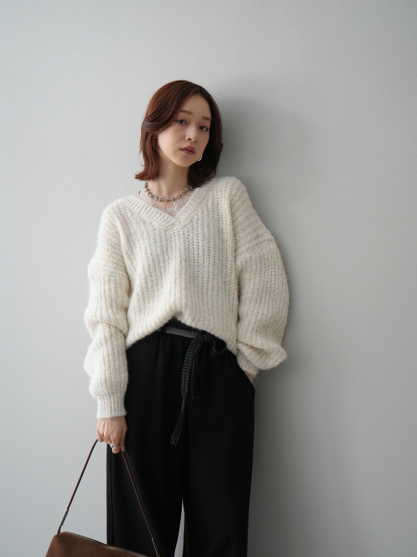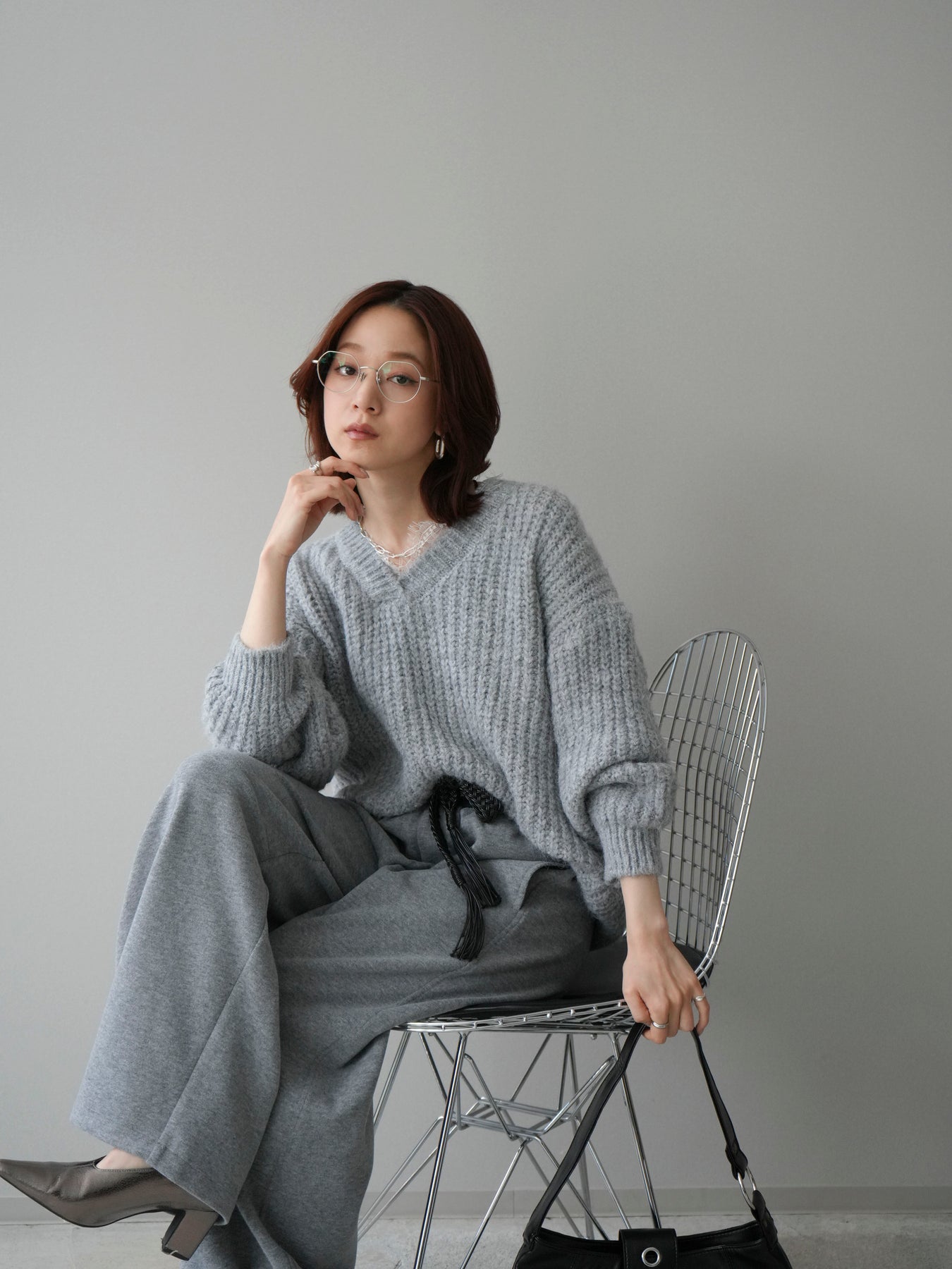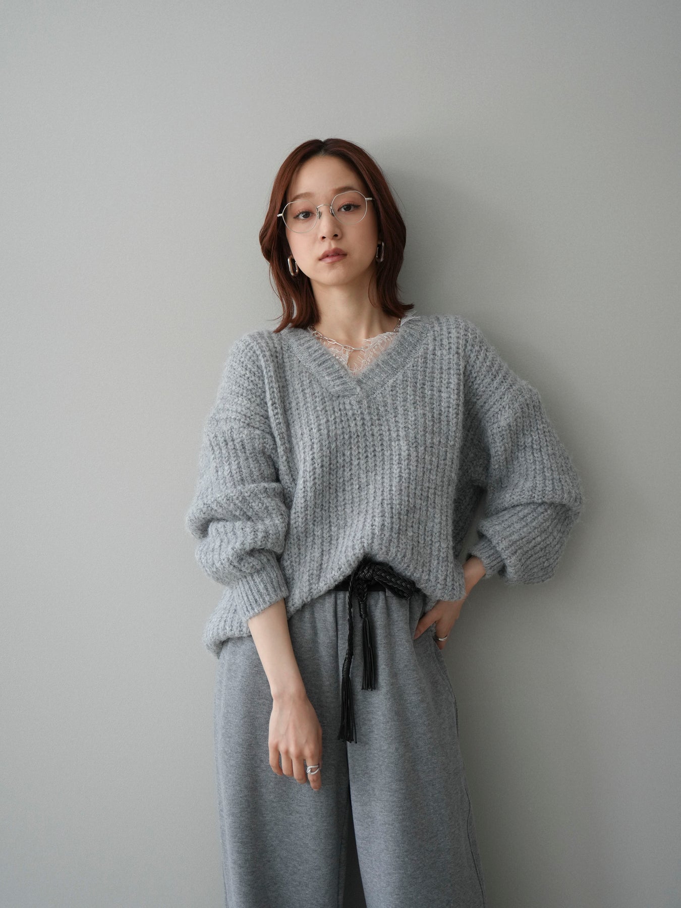 ざっくりとした編み地にレースのアクセントを加えたVネックニットプルオーバー。 ボリュームのある袖やゆとりのあるシルエットが、女性らしい抜け感を演出します。 襟元にあしらったレースがさりげなく華やかさを添え、一枚で着映えするアイテム。 柔らかな素材感で着心地もよく、カジュアルからフェミニンまで幅広いスタイリングにマッチします。 ボトムスを選ばず、デニムやスカートとの相性も抜群。