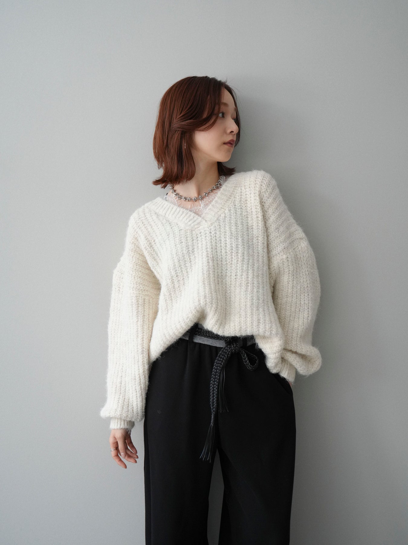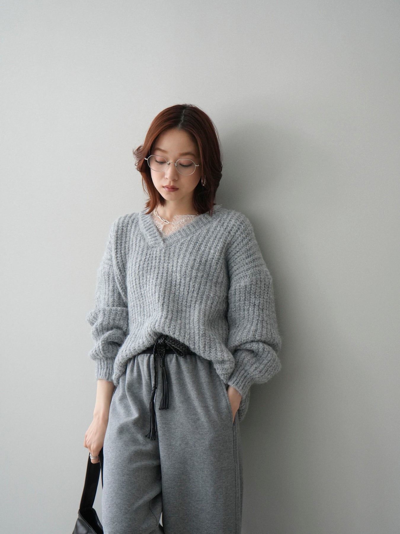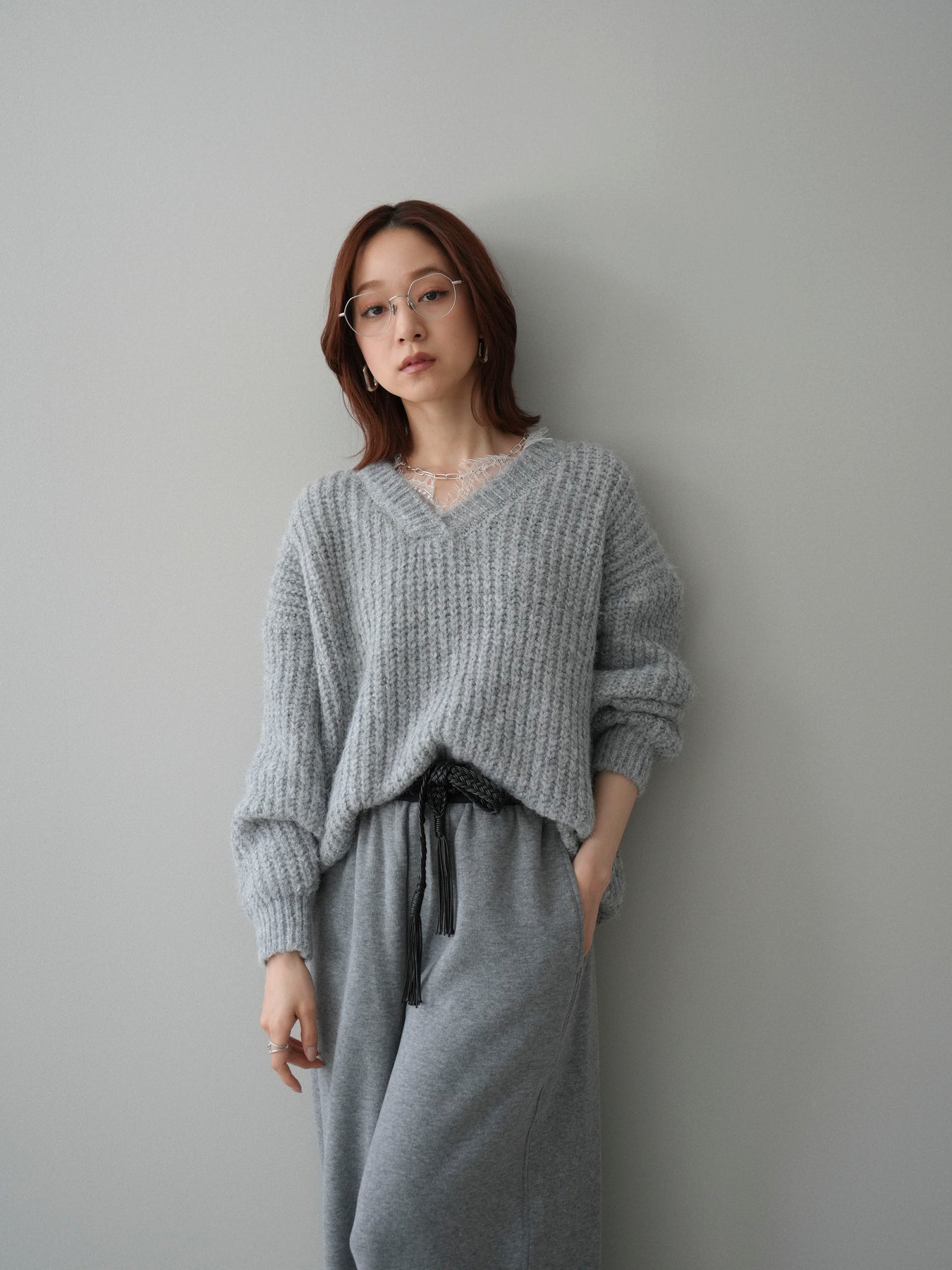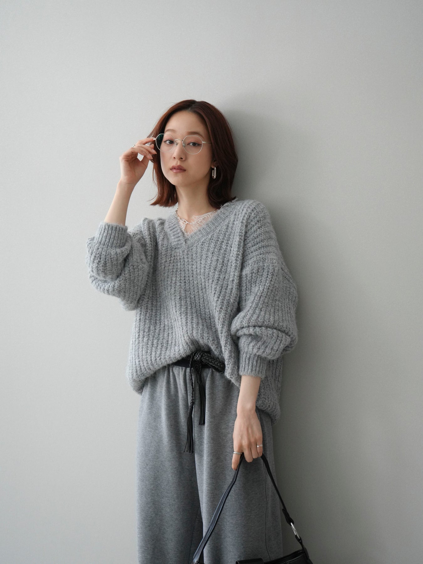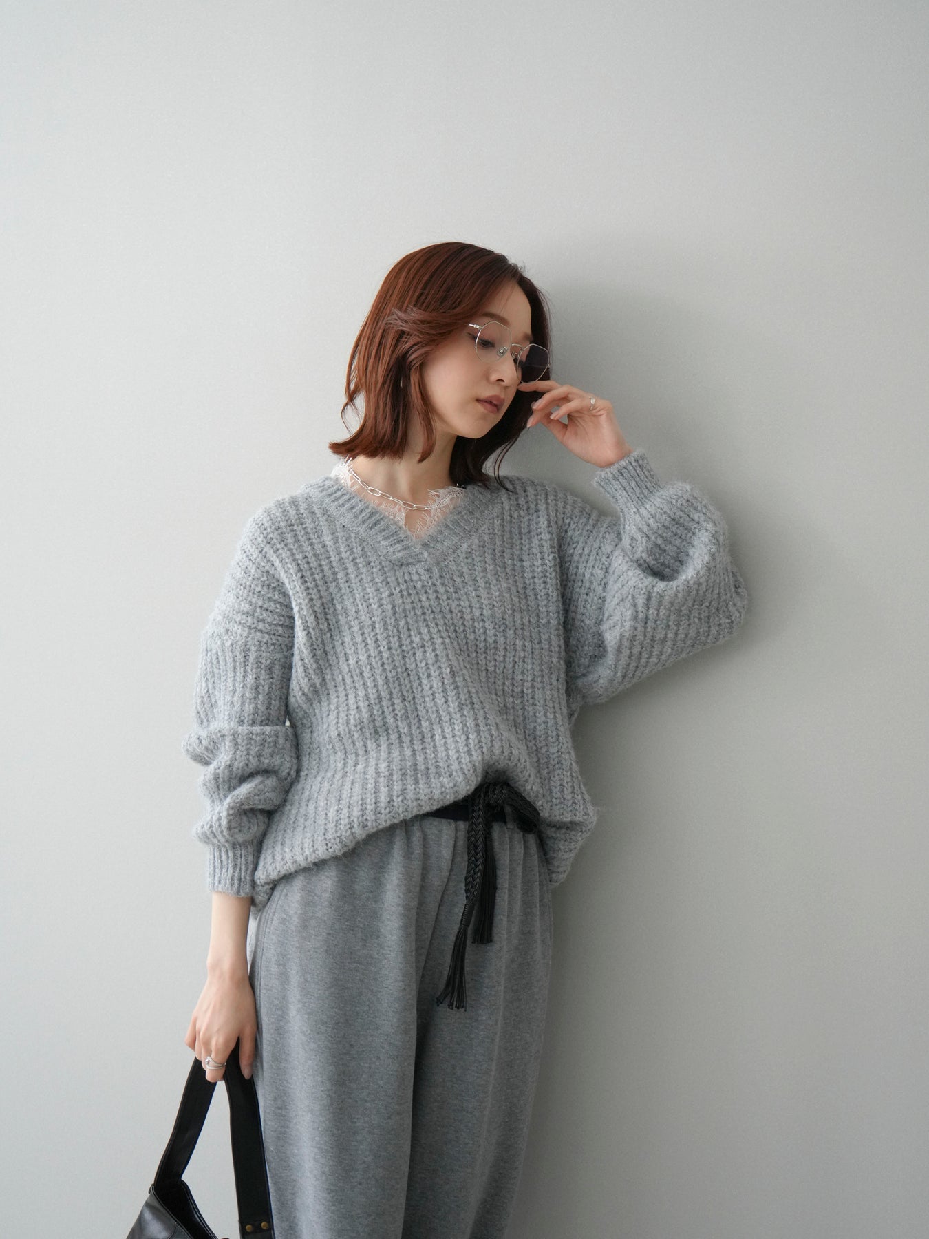 ざっくりとした編み地にレースのアクセントを加えたVネックニットプルオーバー。 ボリュームのある袖やゆとりのあるシルエットが、女性らしい抜け感を演出します。 襟元にあしらったレースがさりげなく華やかさを添え、一枚で着映えするアイテム。 柔らかな素材感で着心地もよく、カジュアルからフェミニンまで幅広いスタイリングにマッチします。 ボトムスを選ばず、デニムやスカートとの相性も抜群。