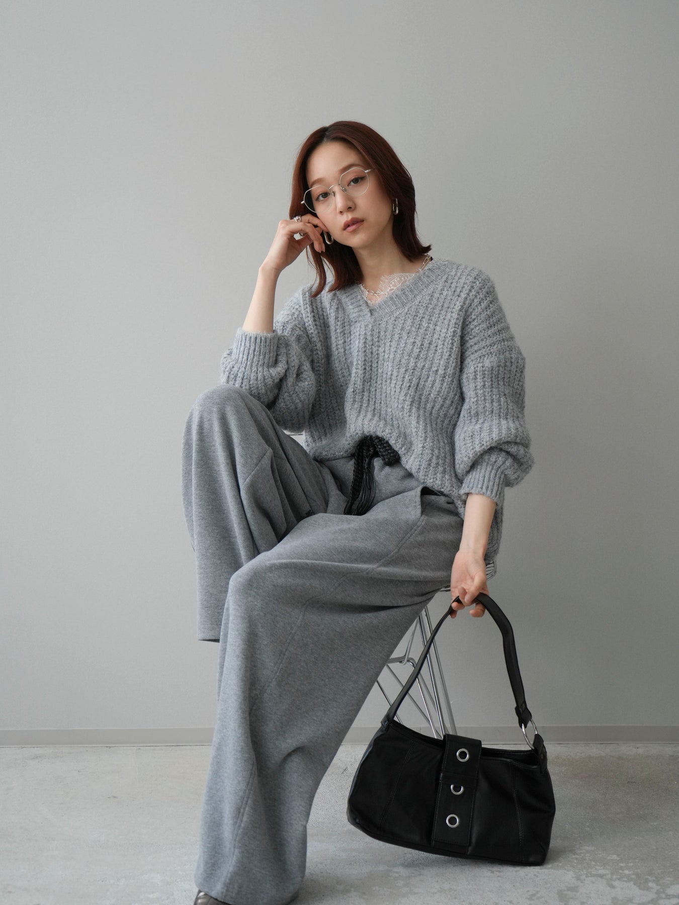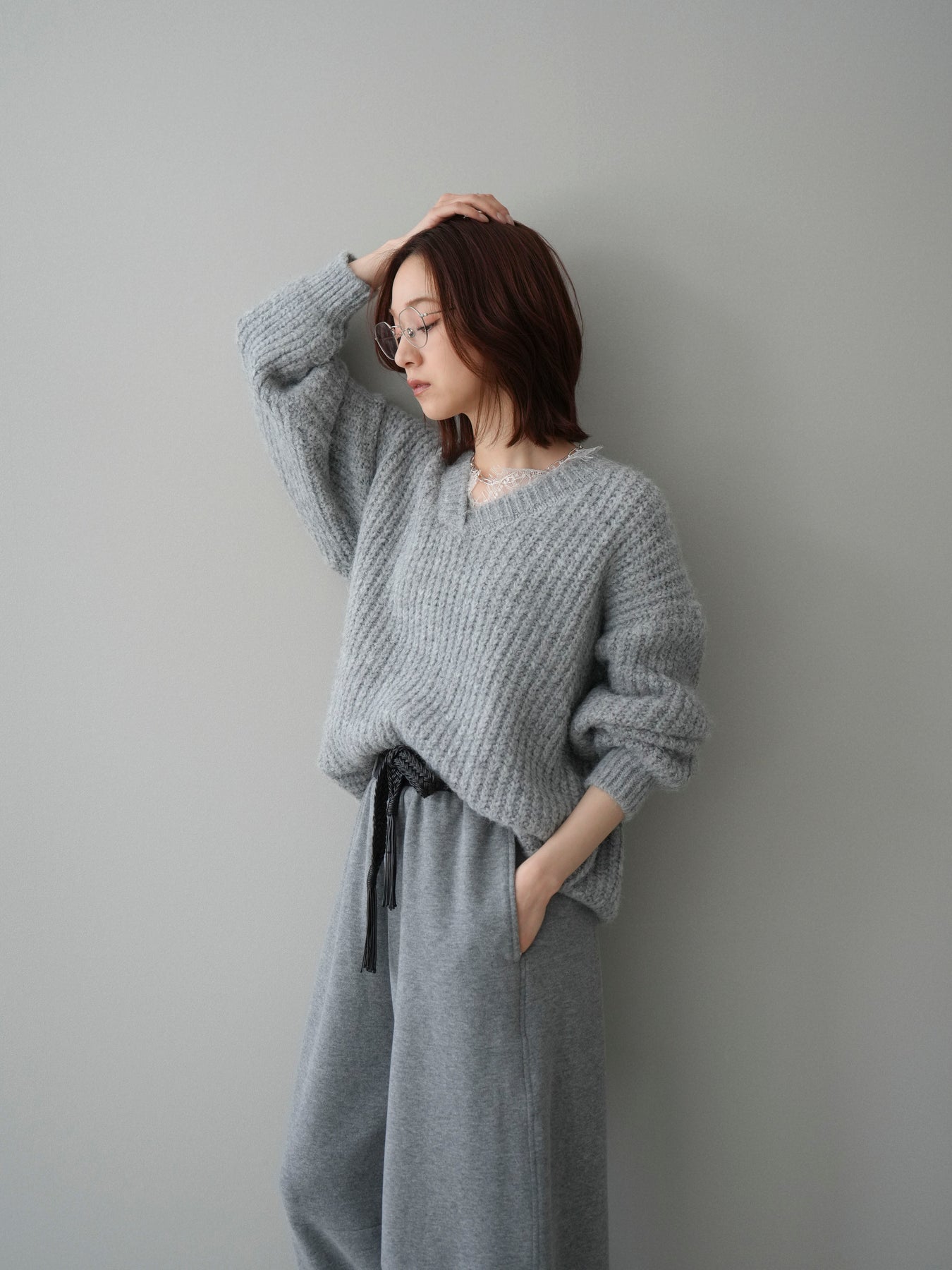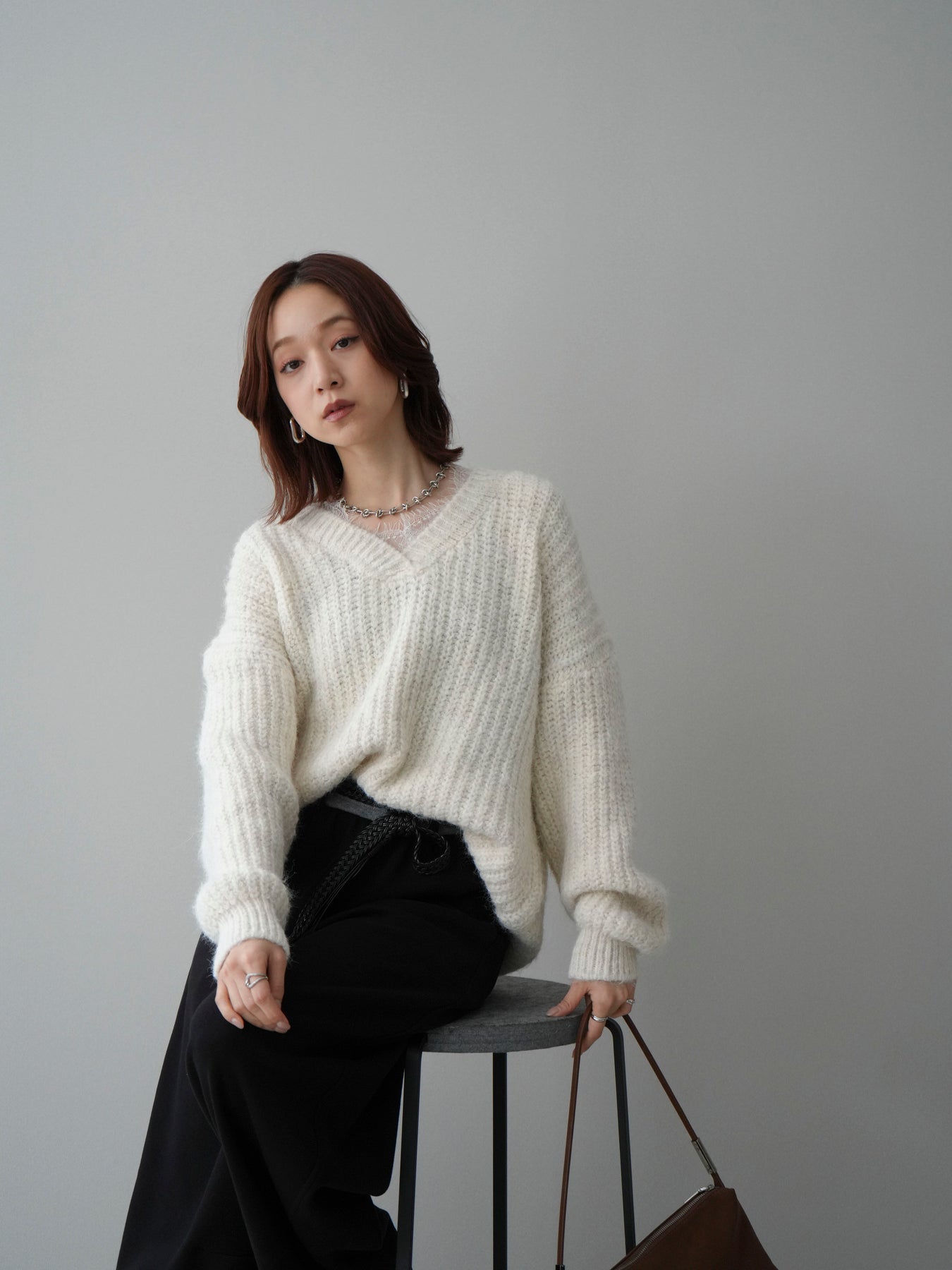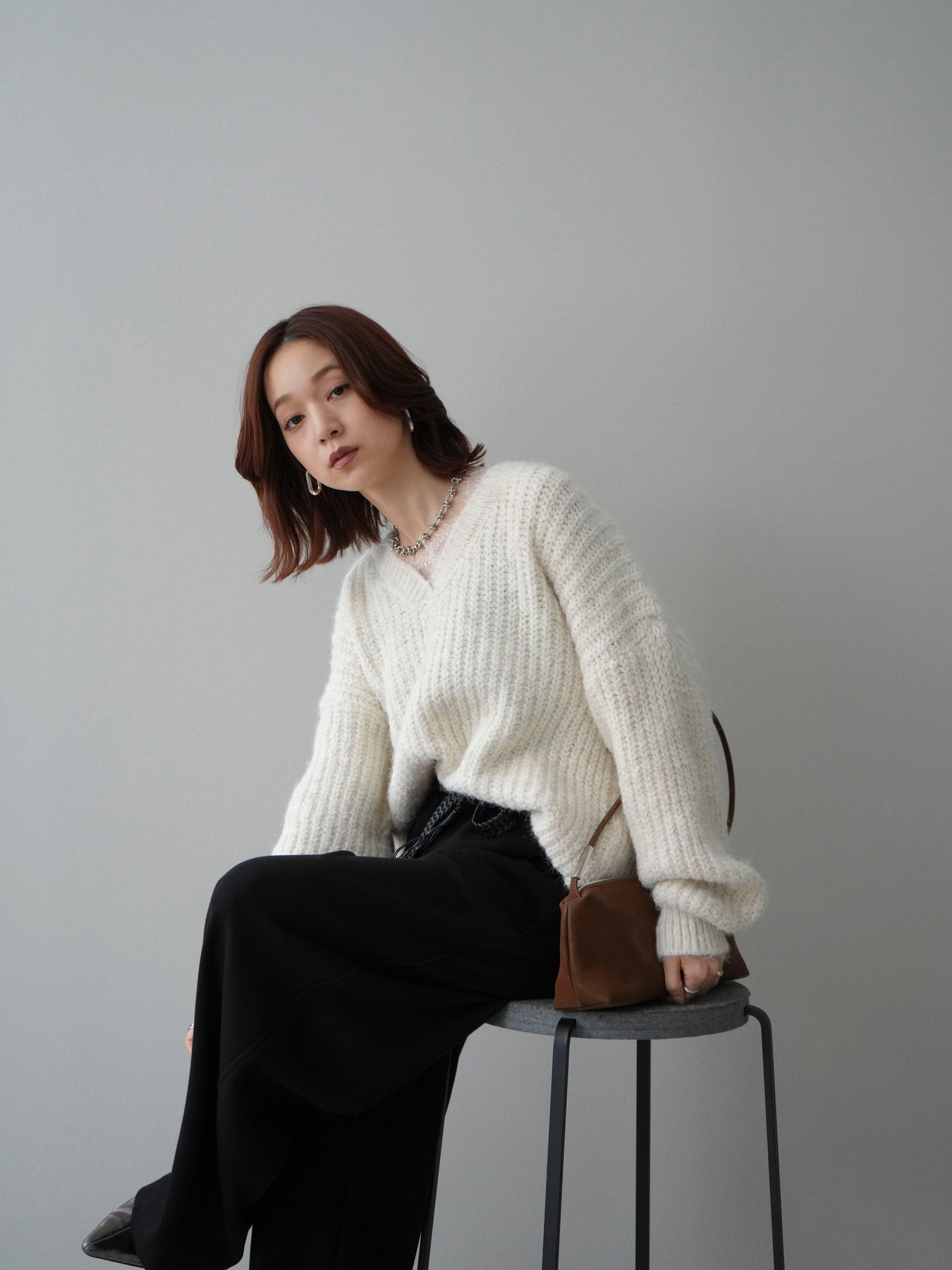 ざっくりとした編み地にレースのアクセントを加えたVネックニットプルオーバー。 ボリュームのある袖やゆとりのあるシルエットが、女性らしい抜け感を演出します。 襟元にあしらったレースがさりげなく華やかさを添え、一枚で着映えするアイテム。 柔らかな素材感で着心地もよく、カジュアルからフェミニンまで幅広いスタイリングにマッチします。 ボトムスを選ばず、デニムやスカートとの相性も抜群。