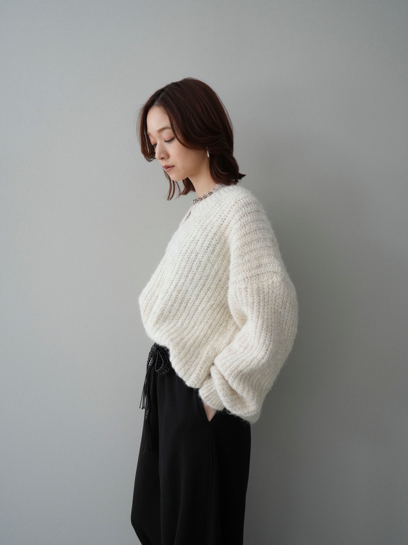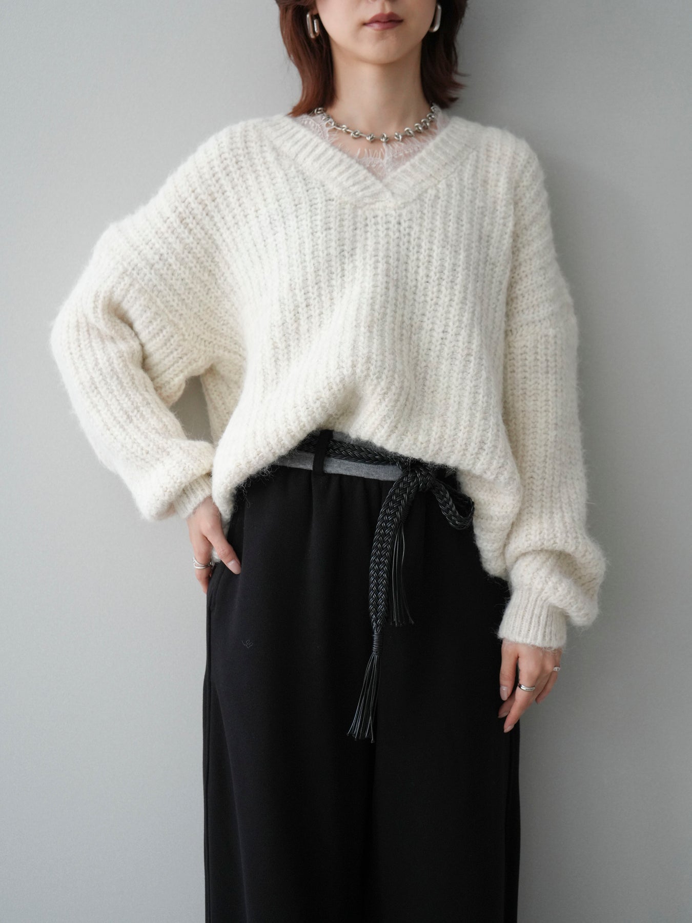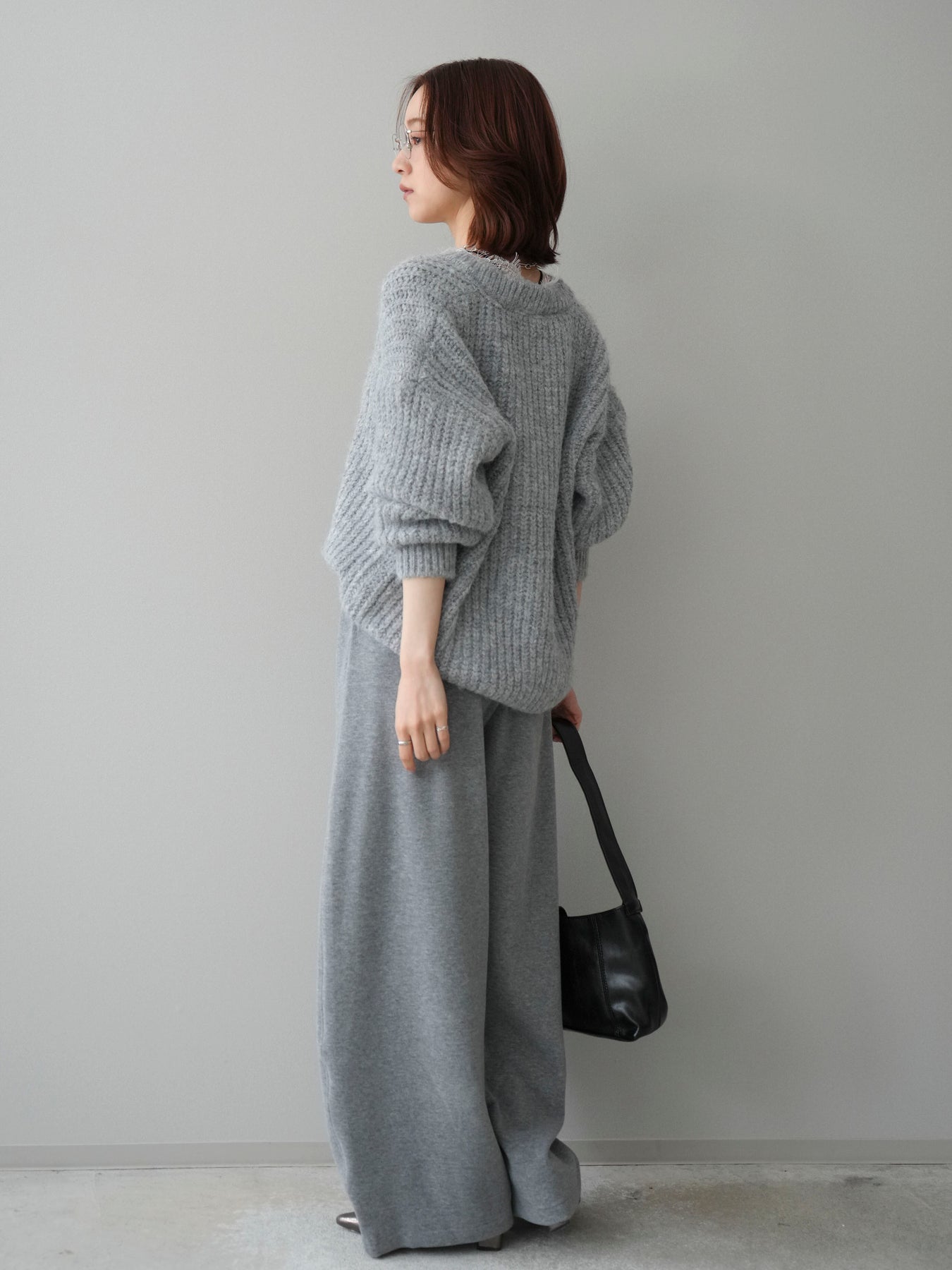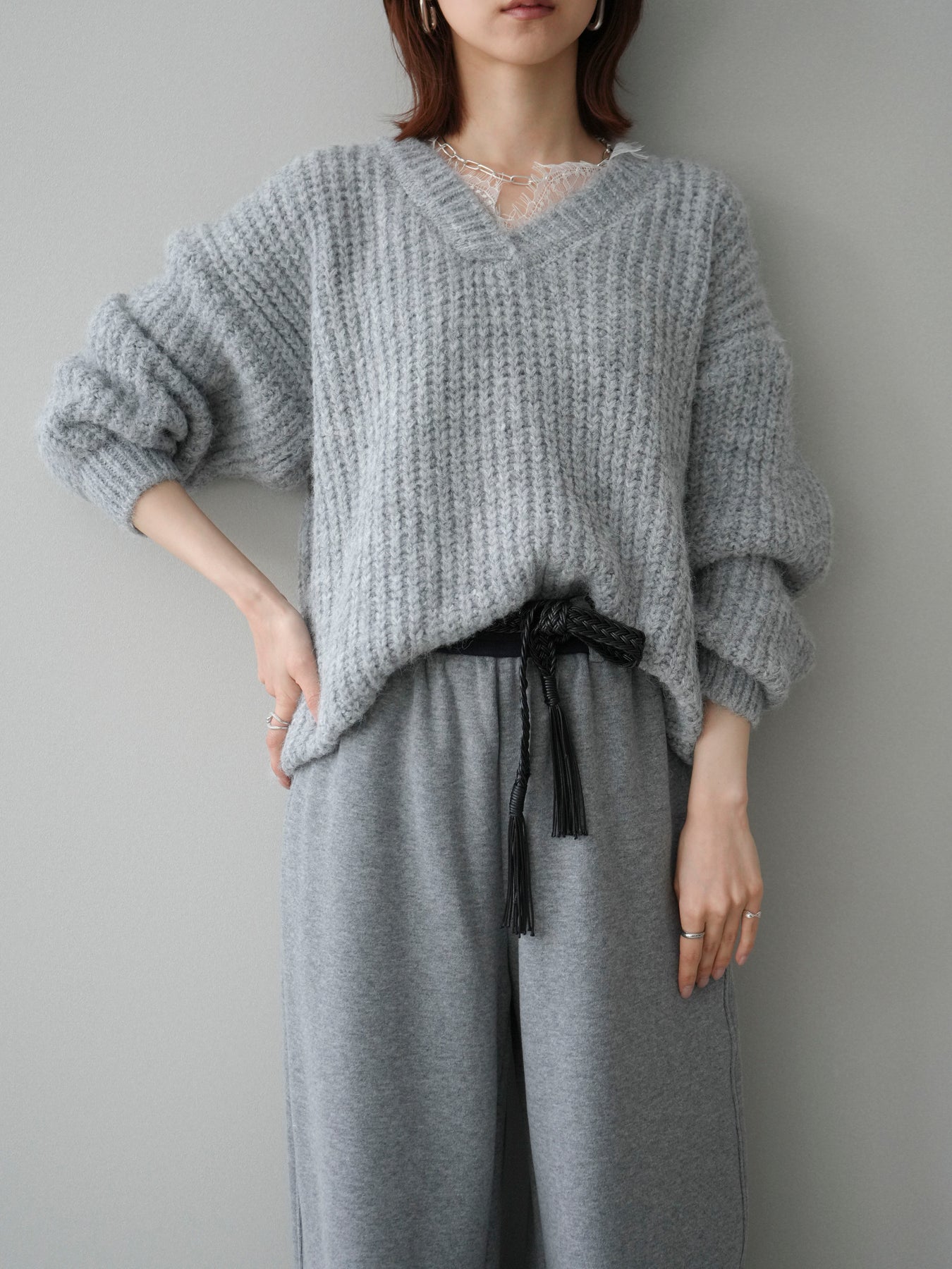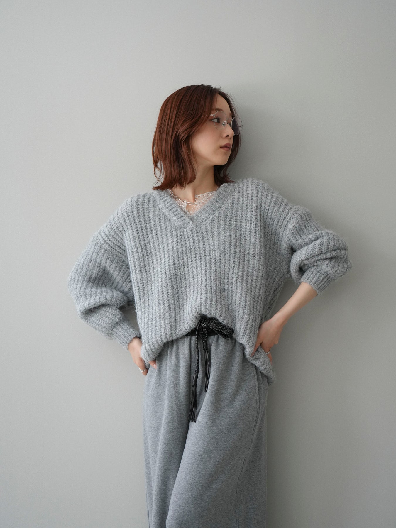 ざっくりとした編み地にレースのアクセントを加えたVネックニットプルオーバー。 ボリュームのある袖やゆとりのあるシルエットが、女性らしい抜け感を演出します。 襟元にあしらったレースがさりげなく華やかさを添え、一枚で着映えするアイテム。 柔らかな素材感で着心地もよく、カジュアルからフェミニンまで幅広いスタイリングにマッチします。 ボトムスを選ばず、デニムやスカートとの相性も抜群。