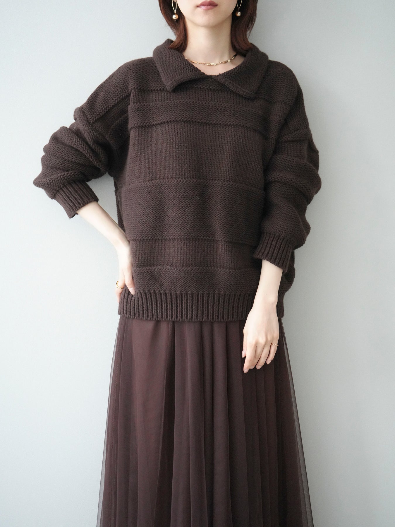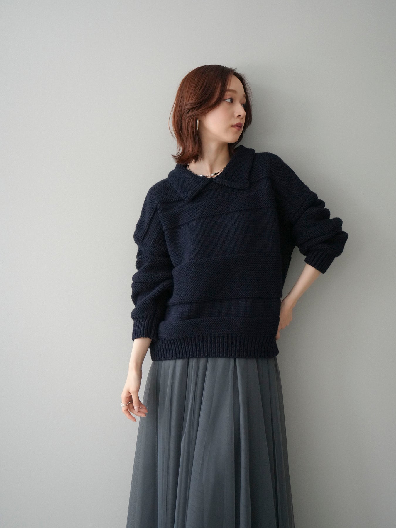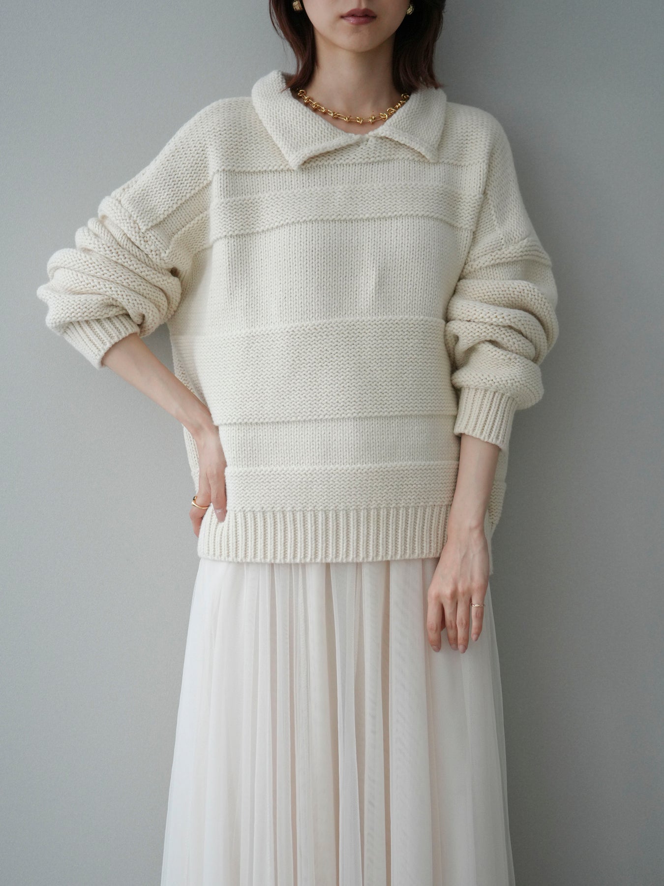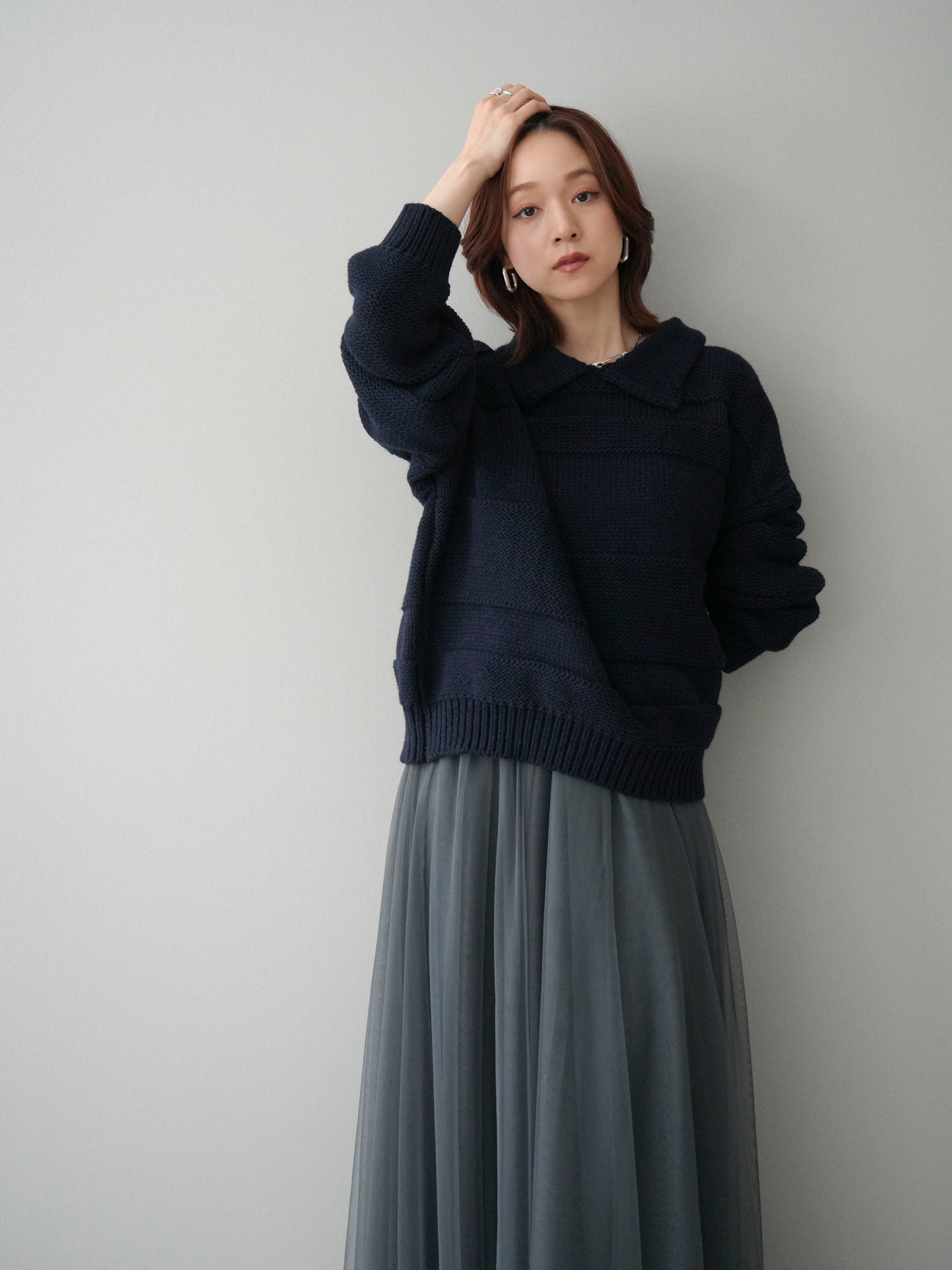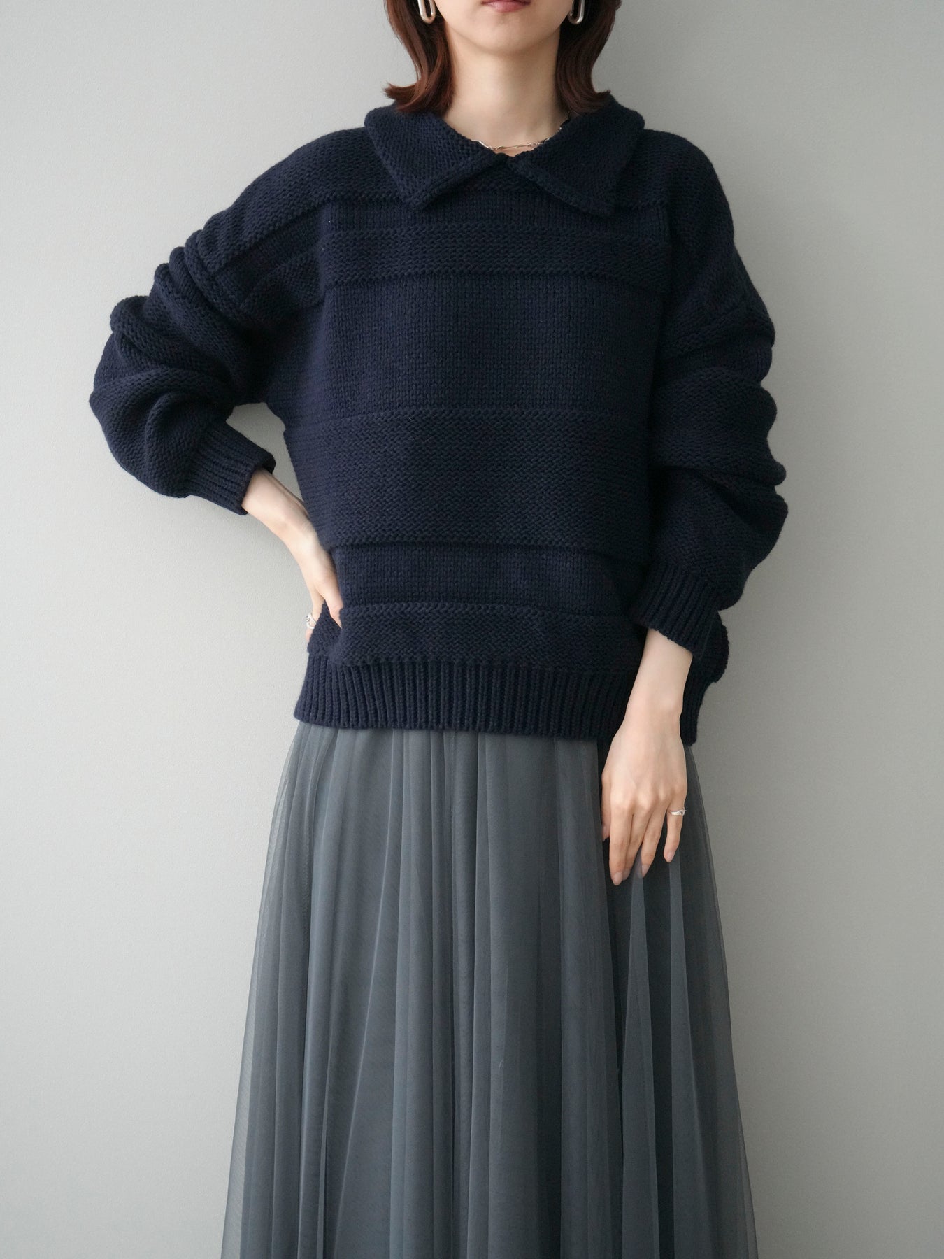 [SET]襟付きボーダー編みニットプルオーバー+チュールボリュームスカート(2set)